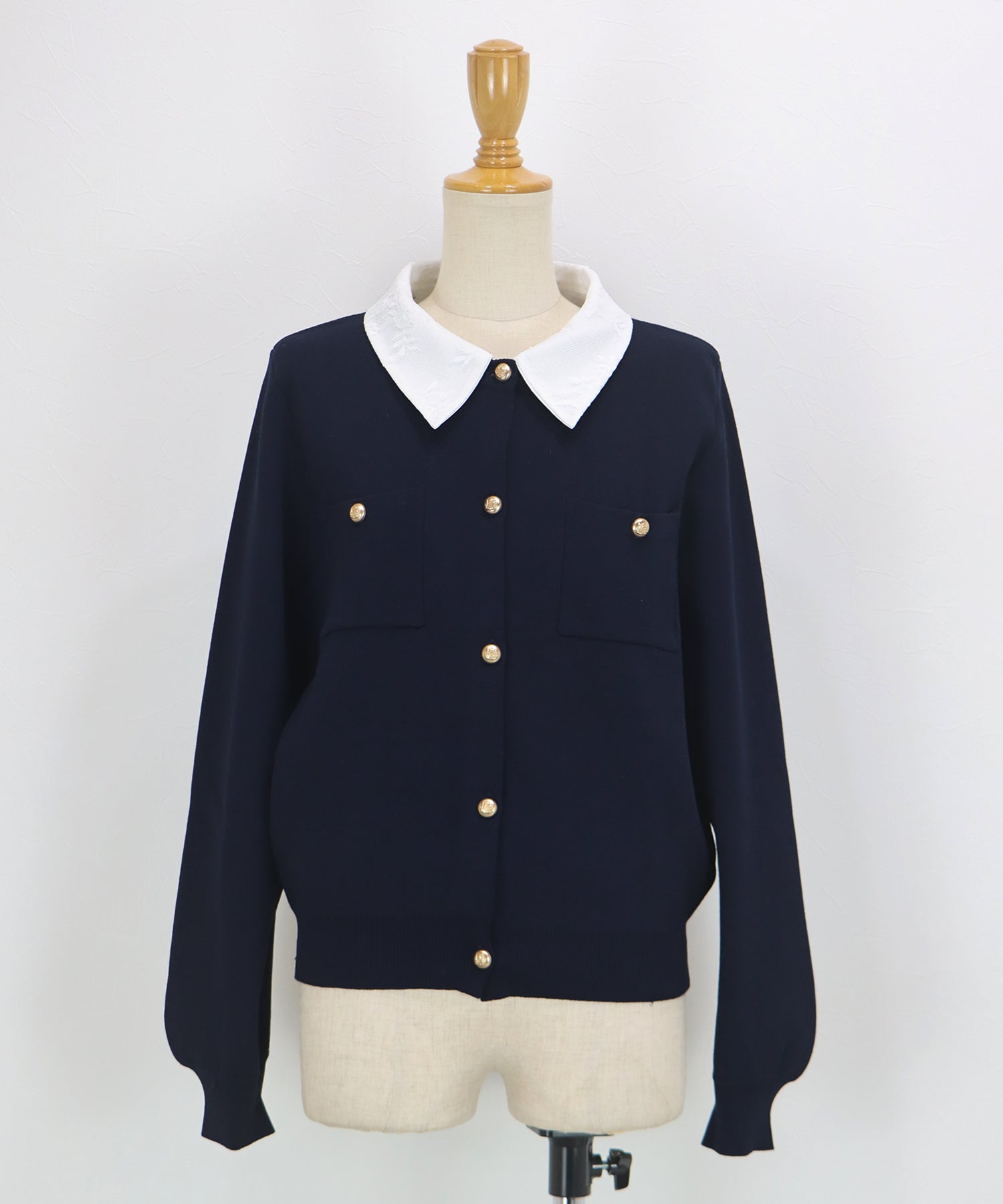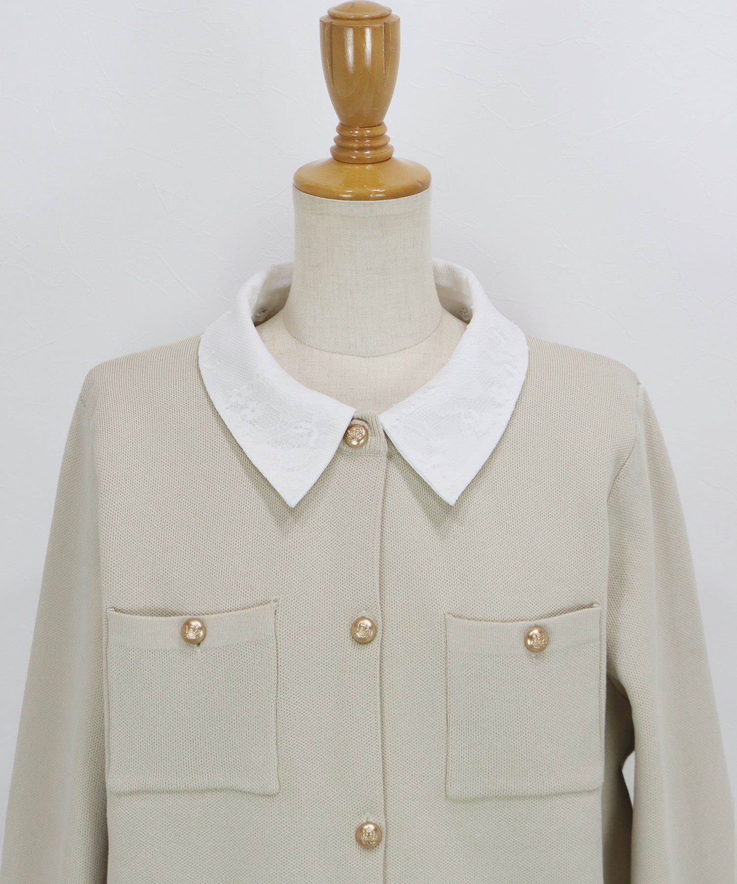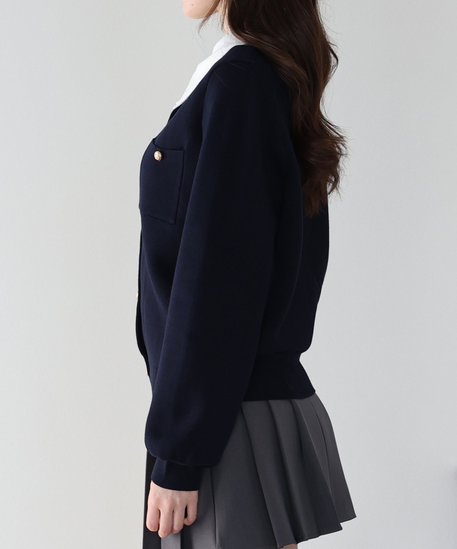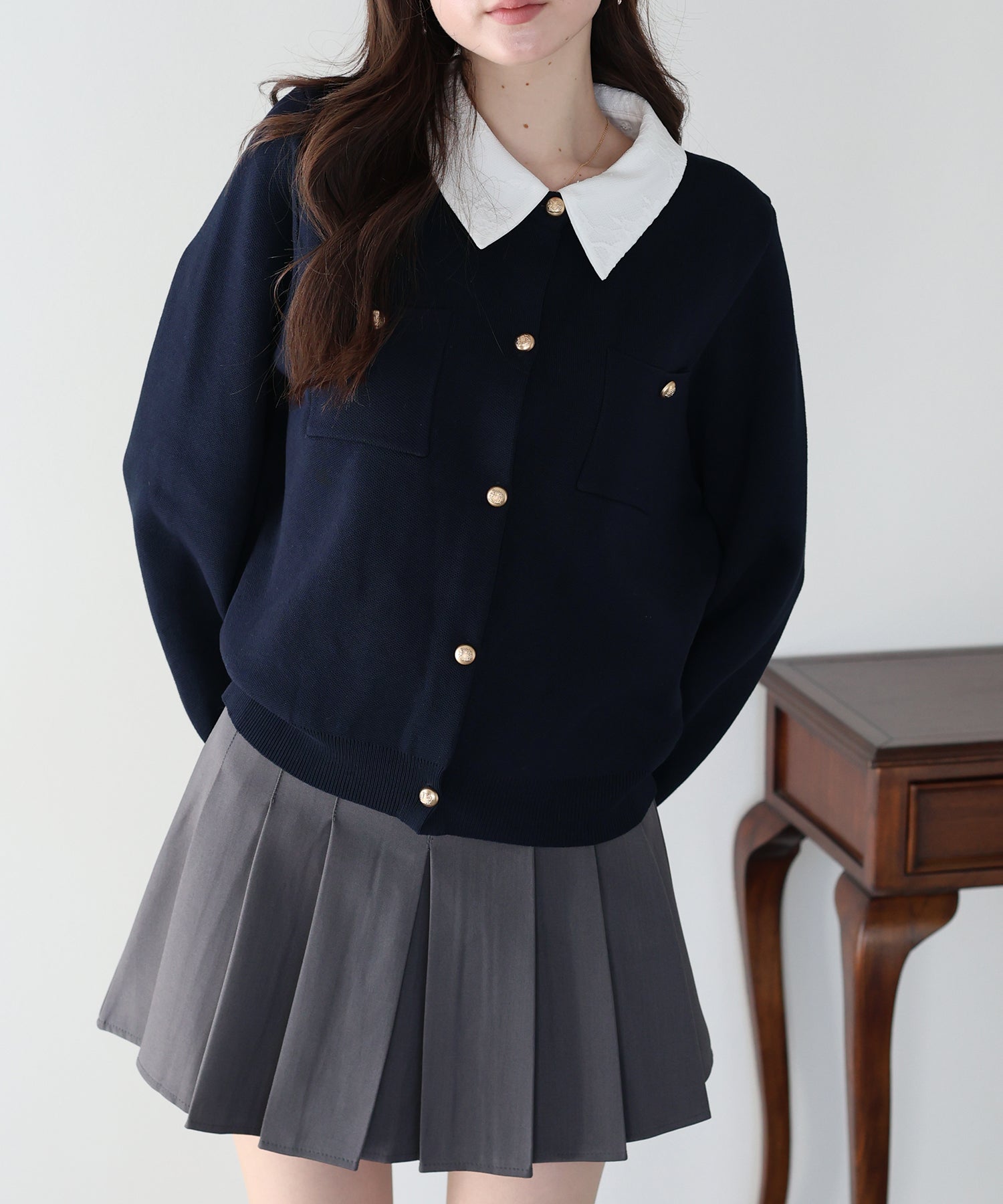 クラシカルな金ボタンがアクセントのニットカーディガンに、繊細なレースを重ねた襟をプラスした気品溢れる一着。