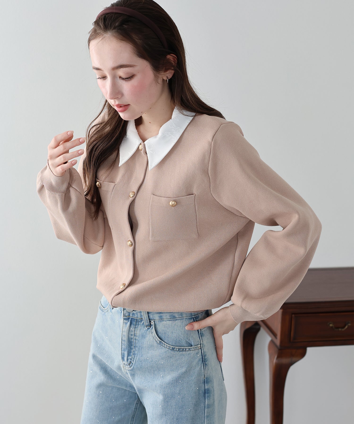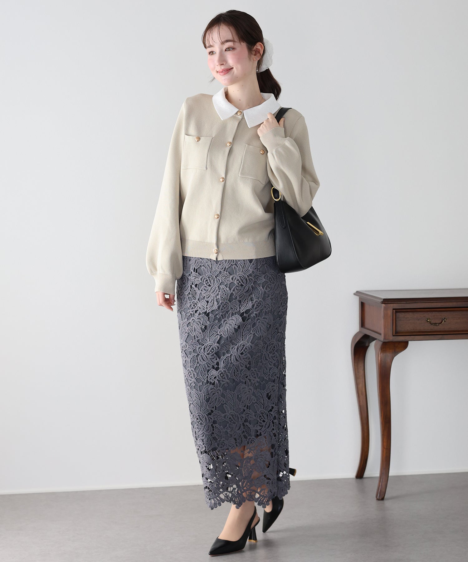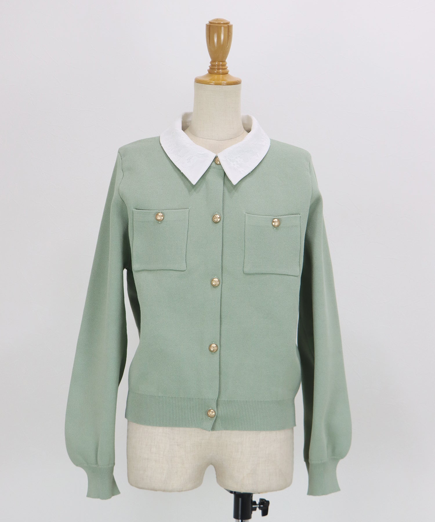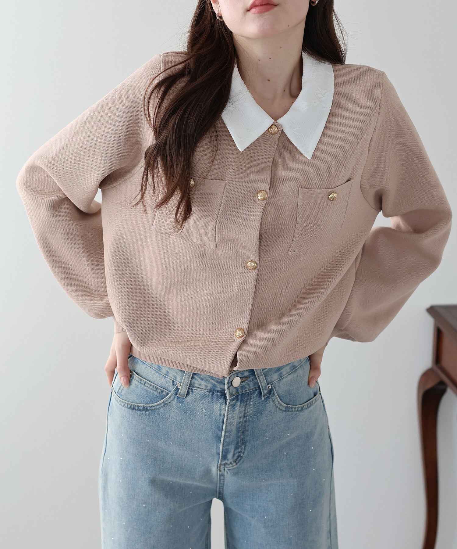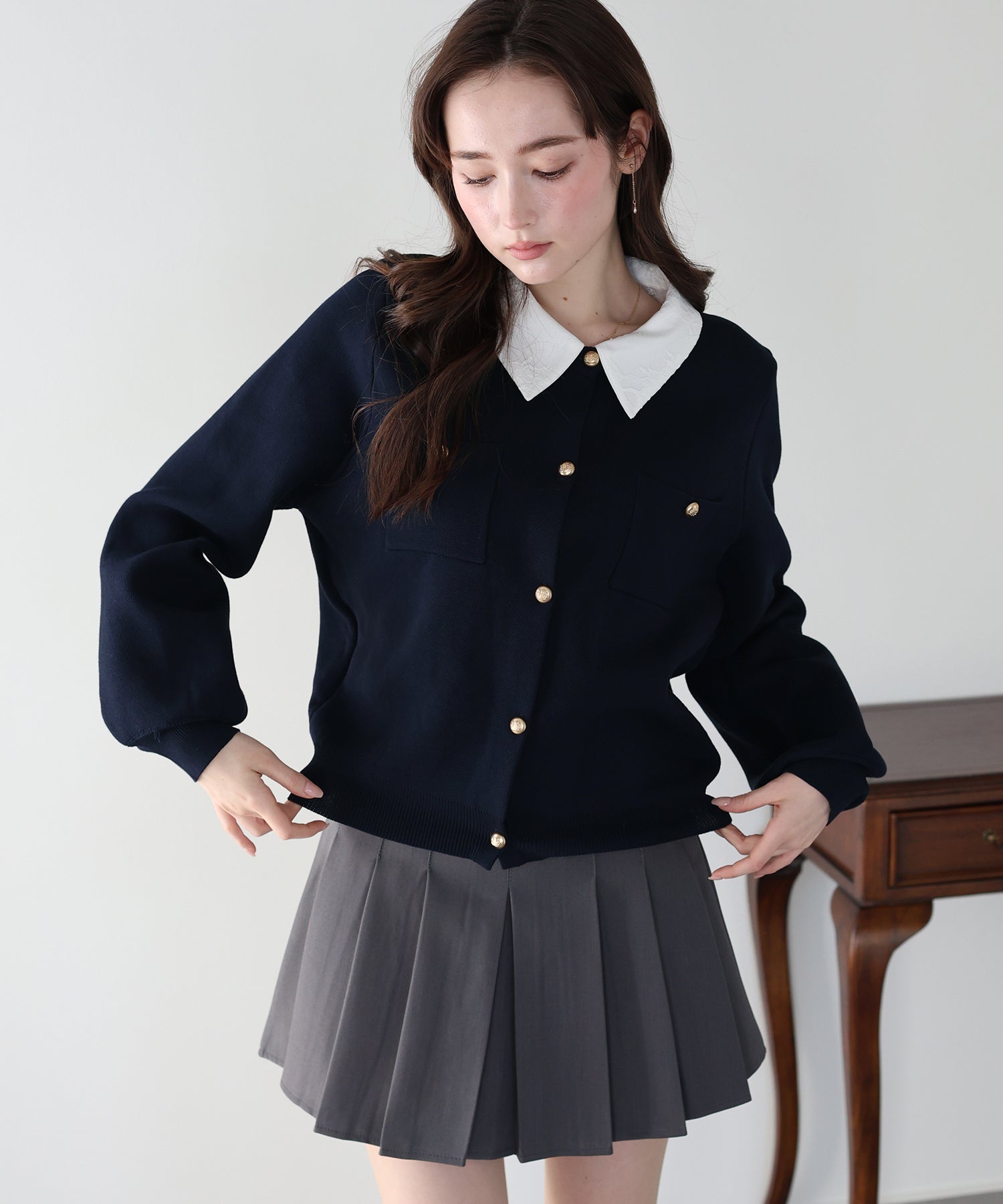 クラシカルな金ボタンがアクセントのニットカーディガンに、繊細なレースを重ねた襟をプラスした気品溢れる一着。