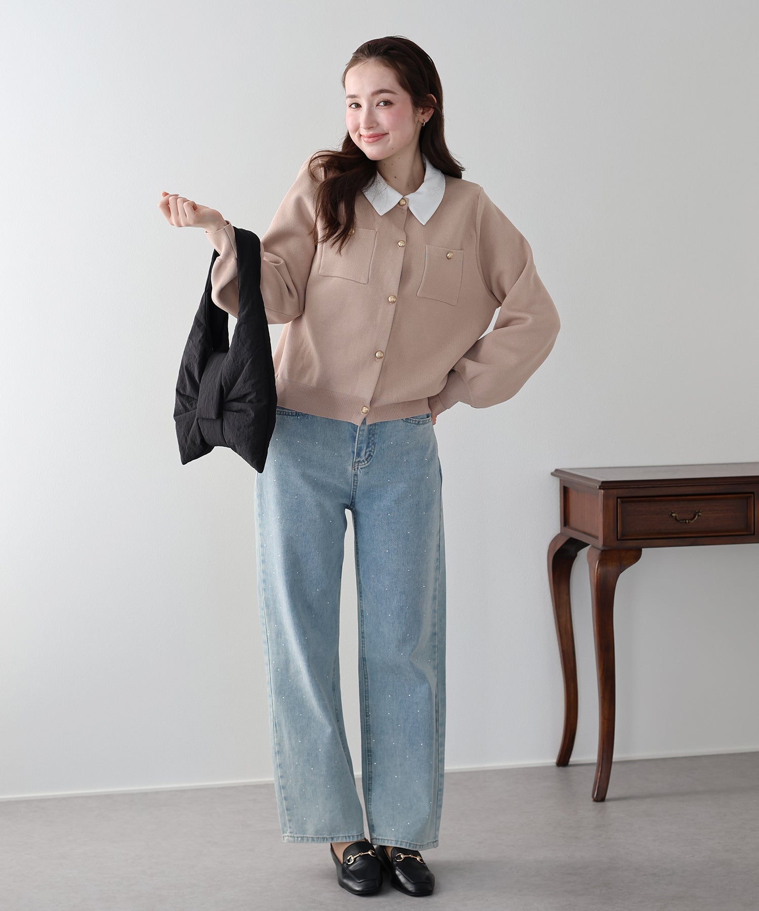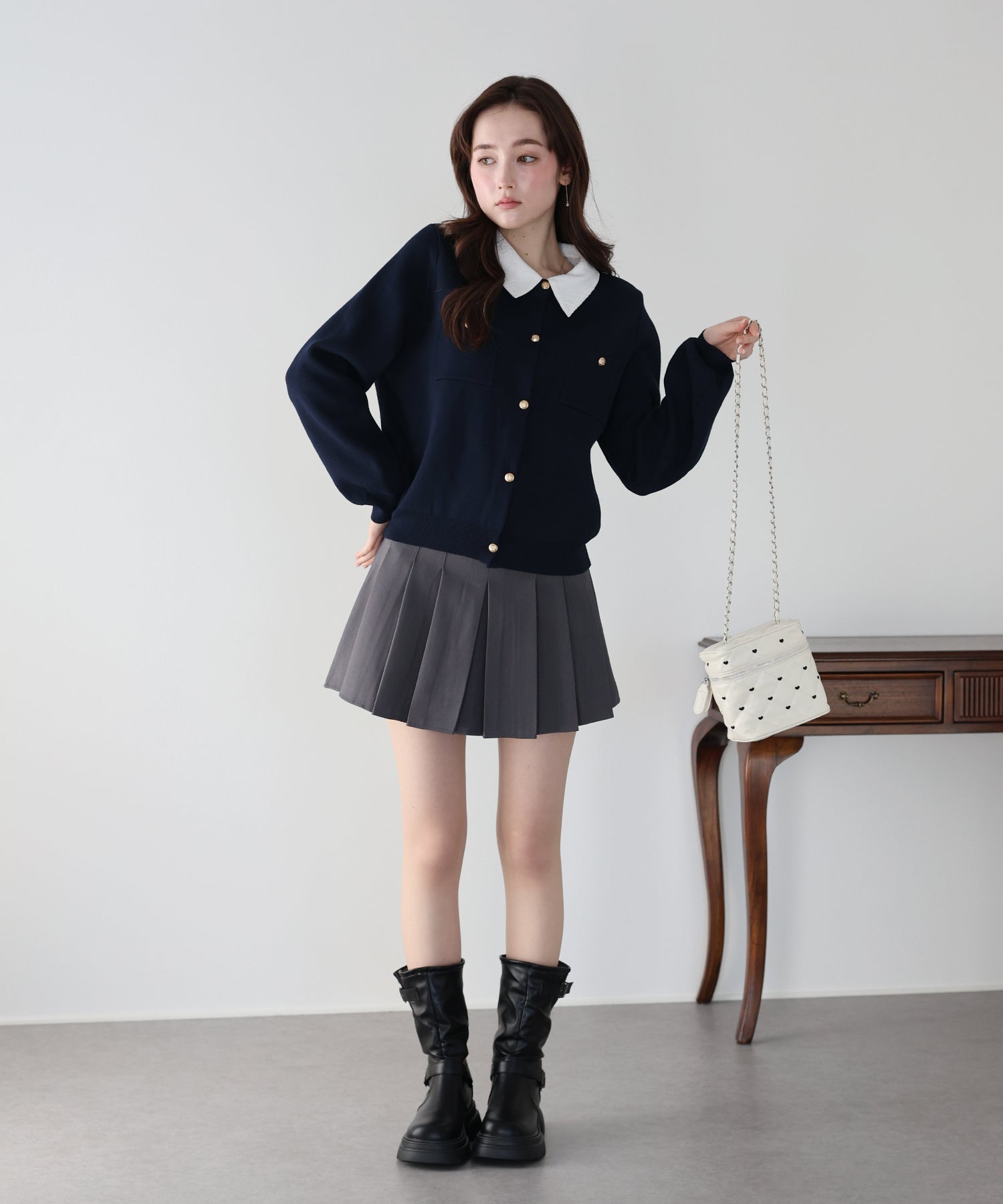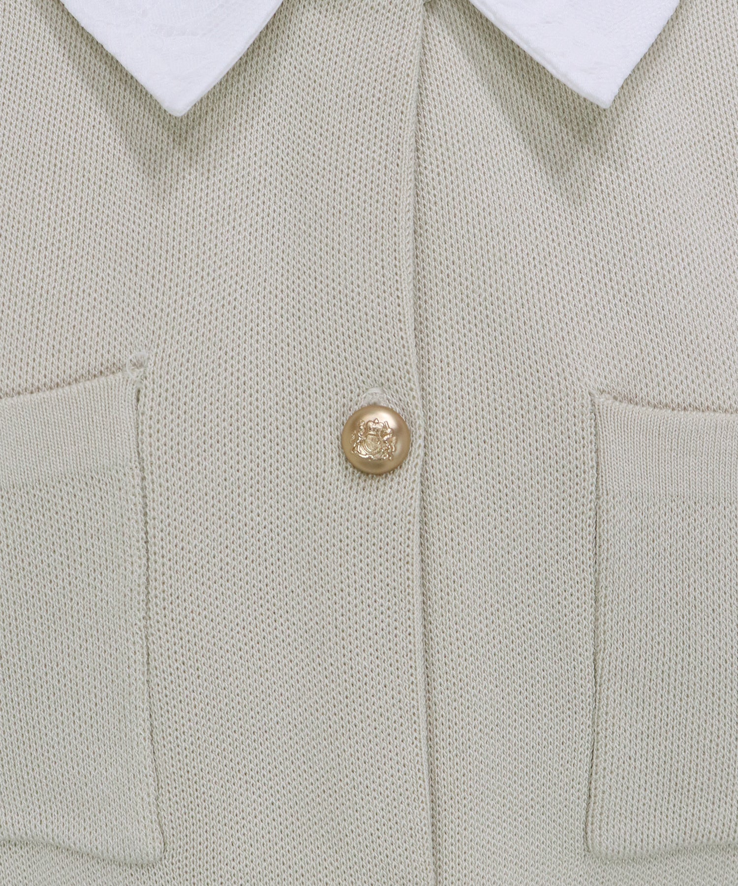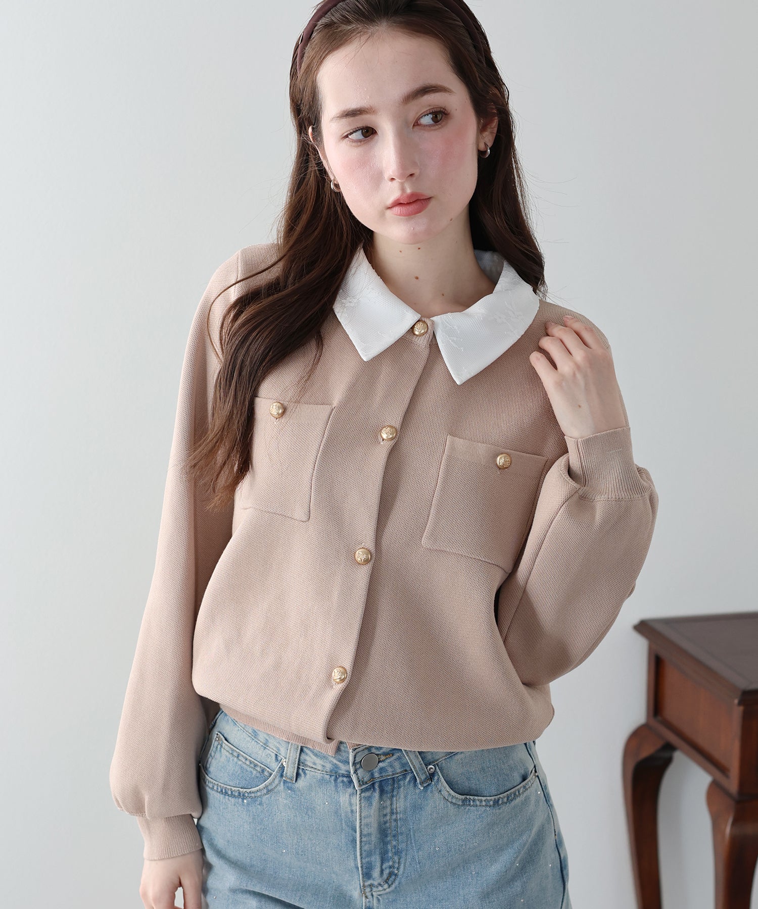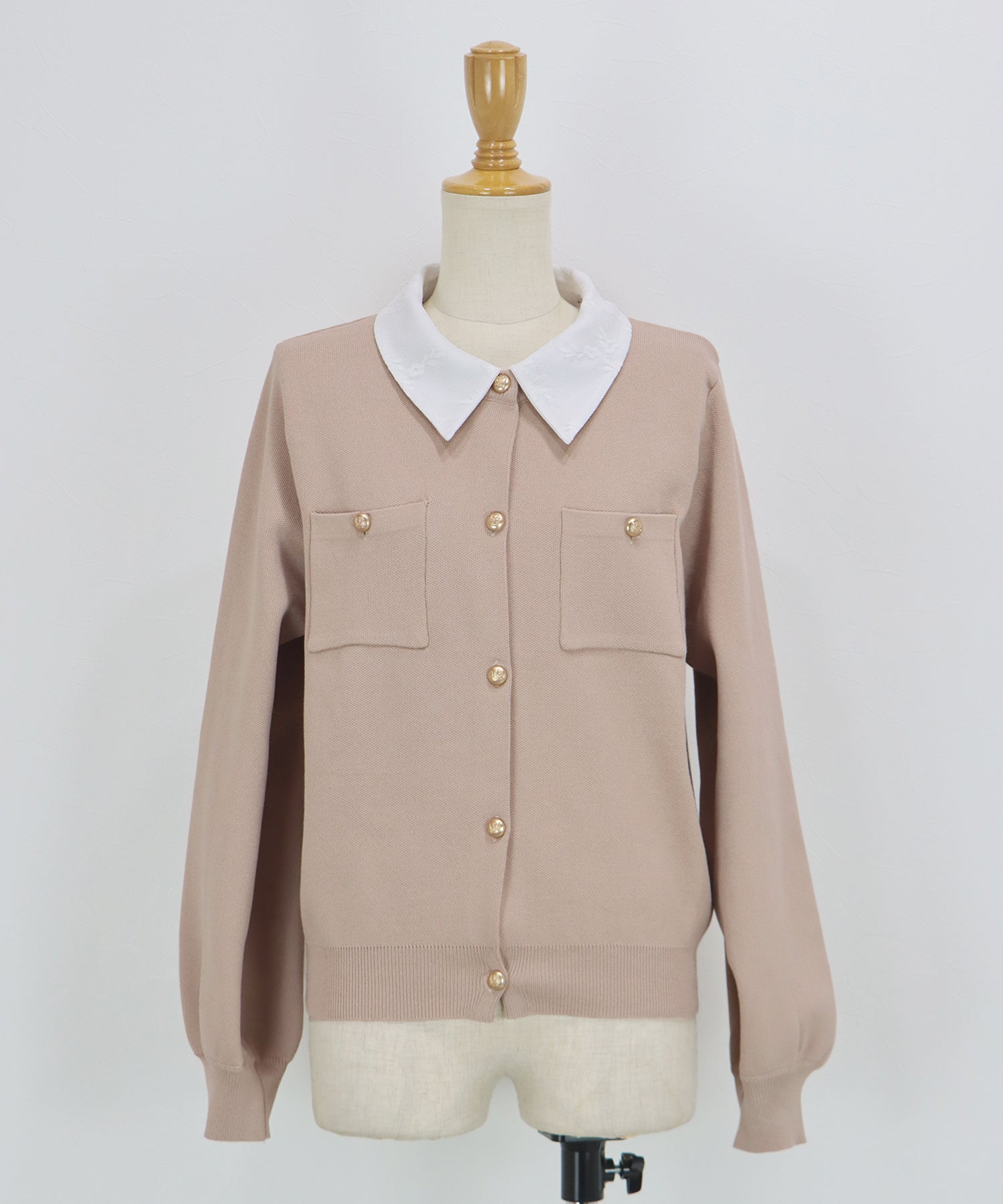 クラシカルな金ボタンがアクセントのニットカーディガンに、繊細なレースを重ねた襟をプラスした気品溢れる一着。