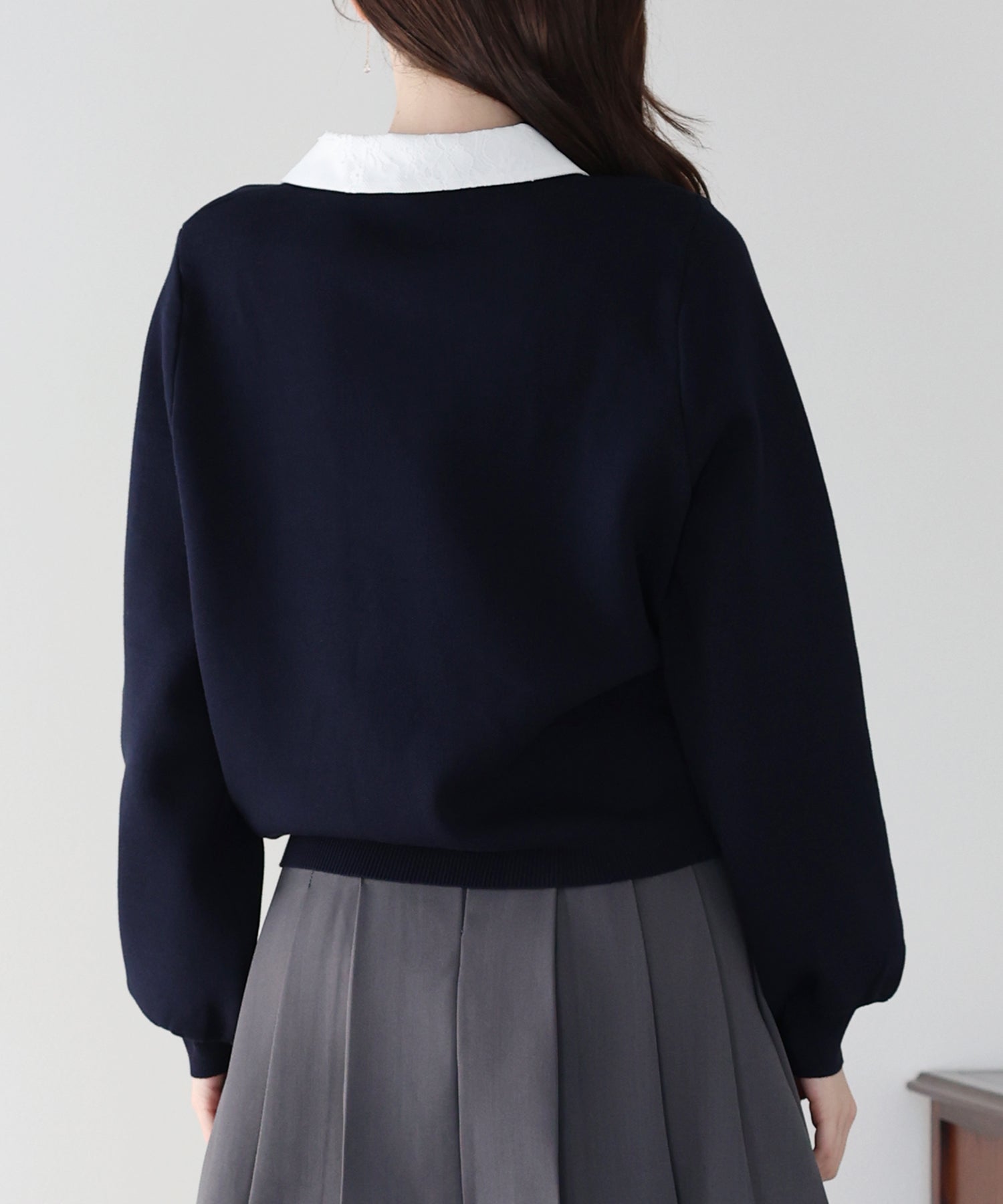 レース襟がきれいめなデザインなので、スラックスやきれいめなスカートに合わせてオフィススタイルにも。