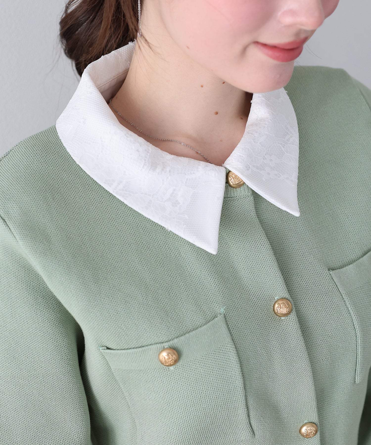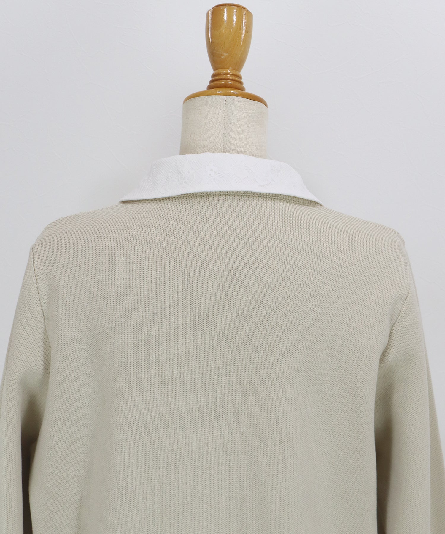 レース重ねのシャツ襟は取り外し可能で、お好みに合わせて取り外して着用していただけます。
