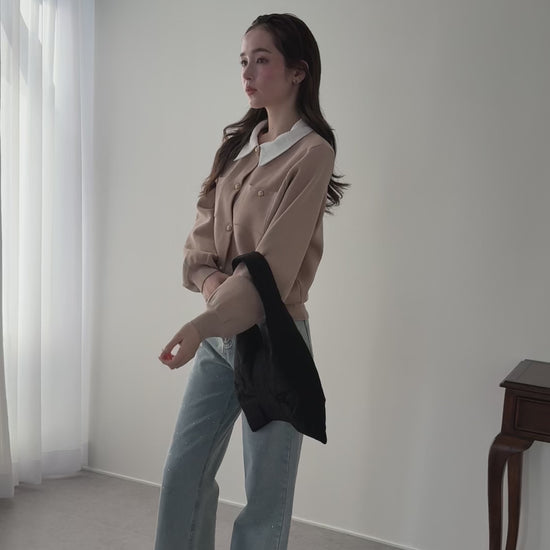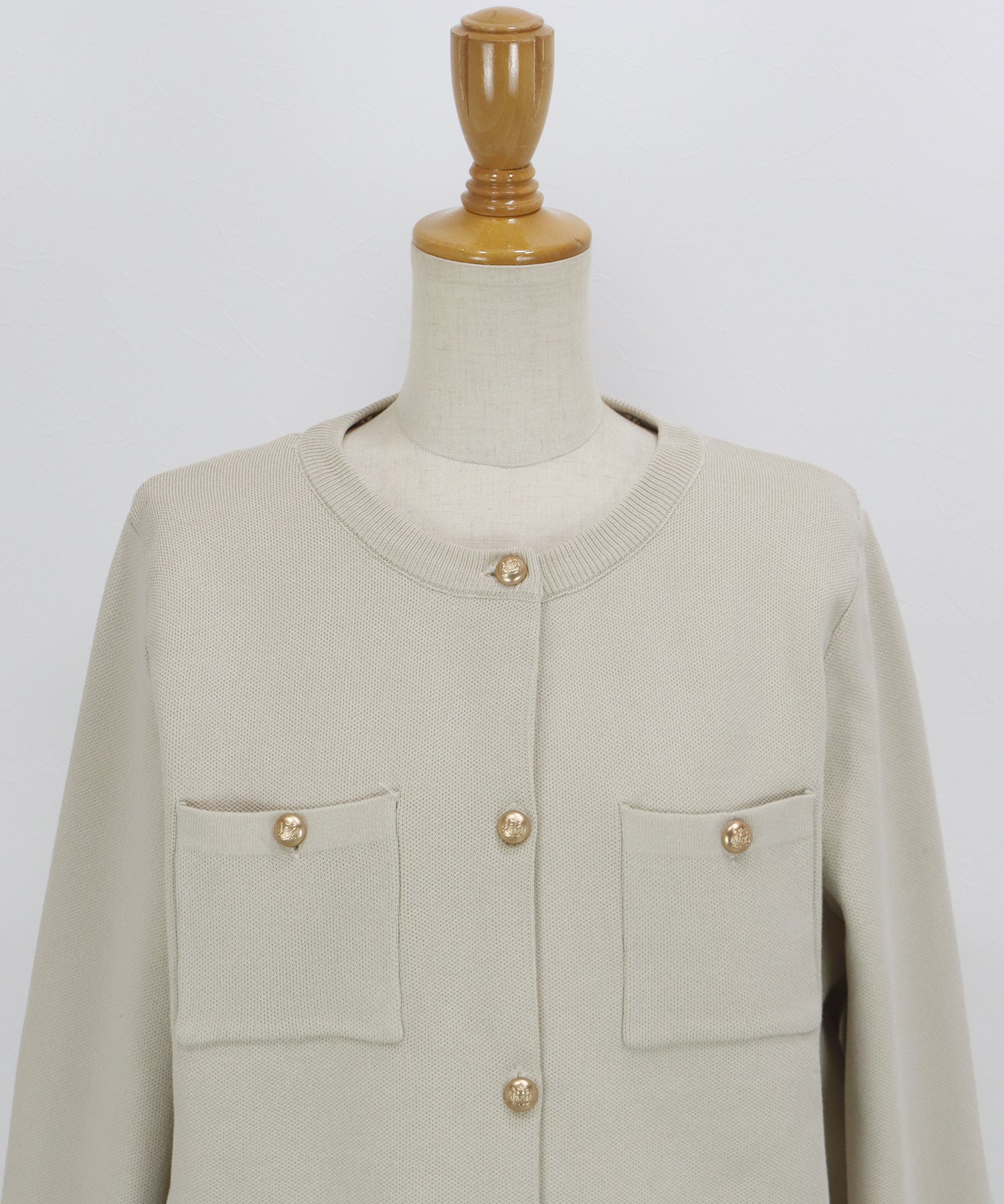 金ボタンノーカラーニットジャケット