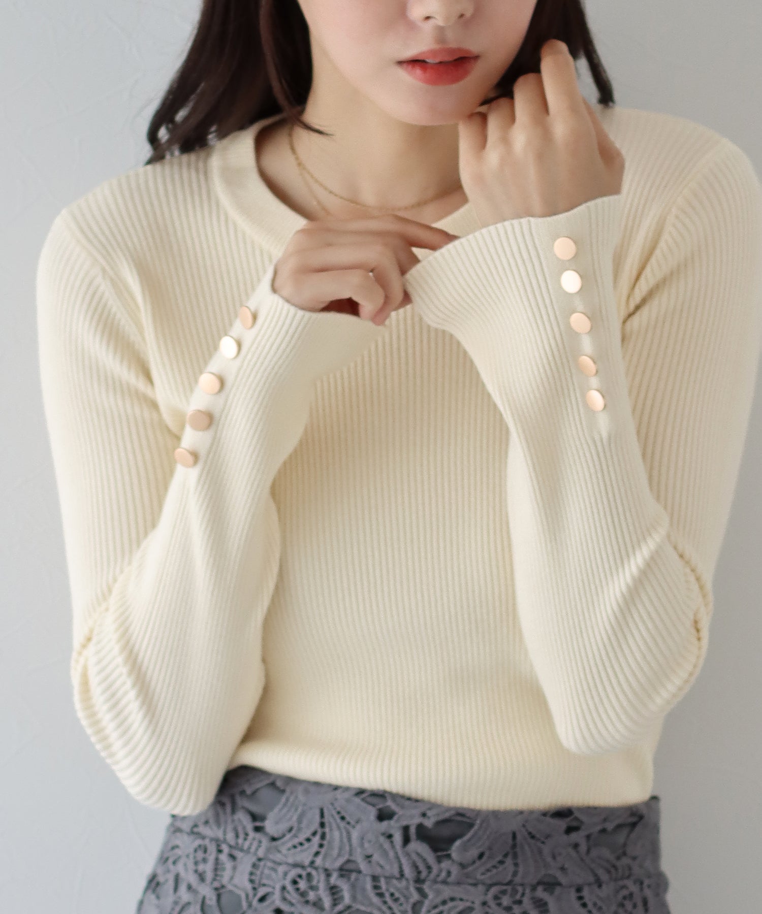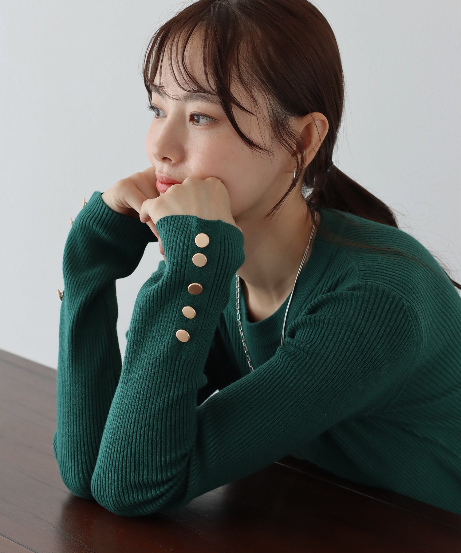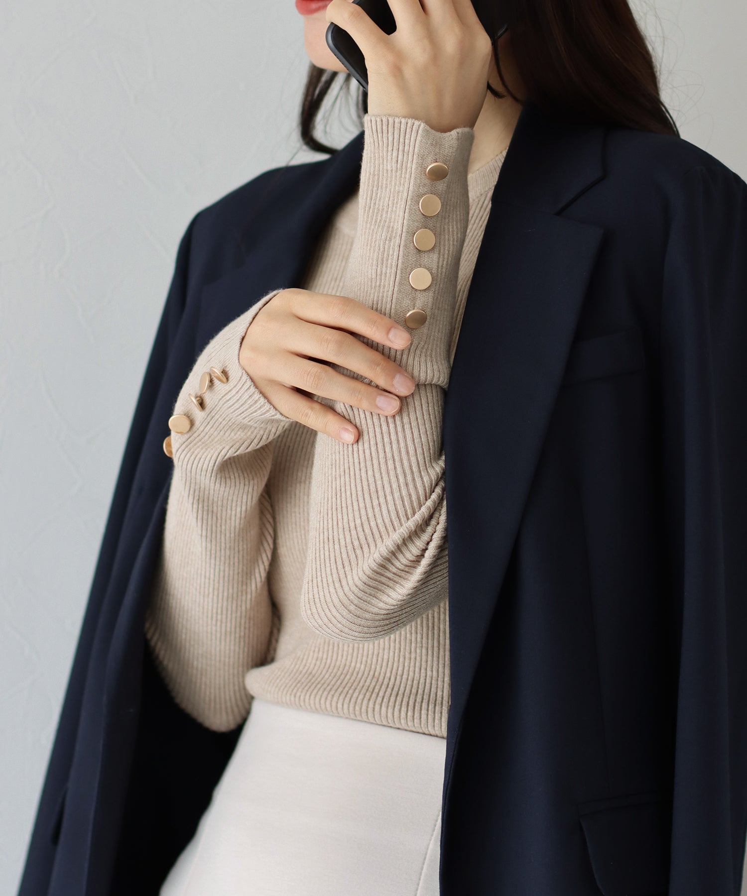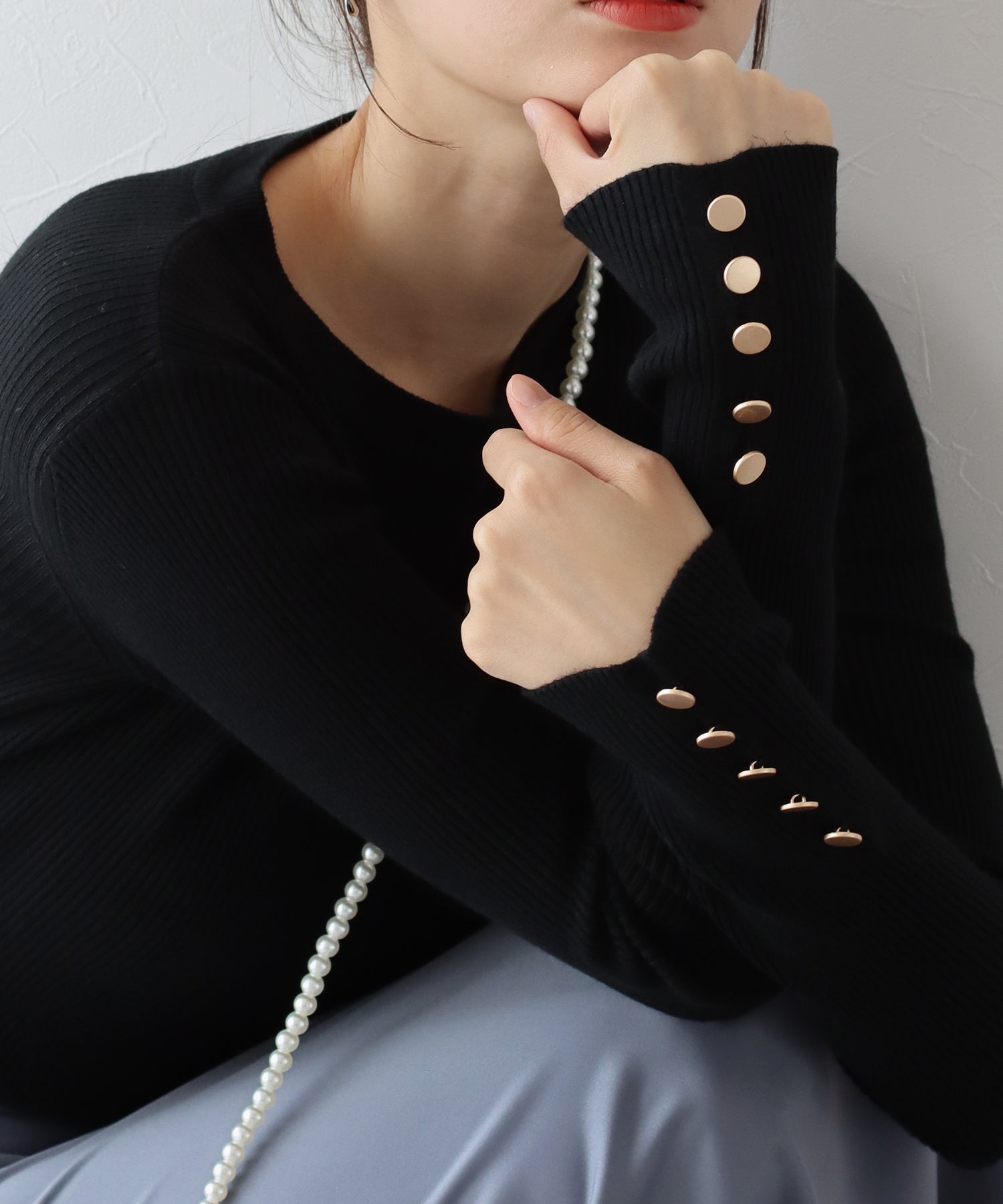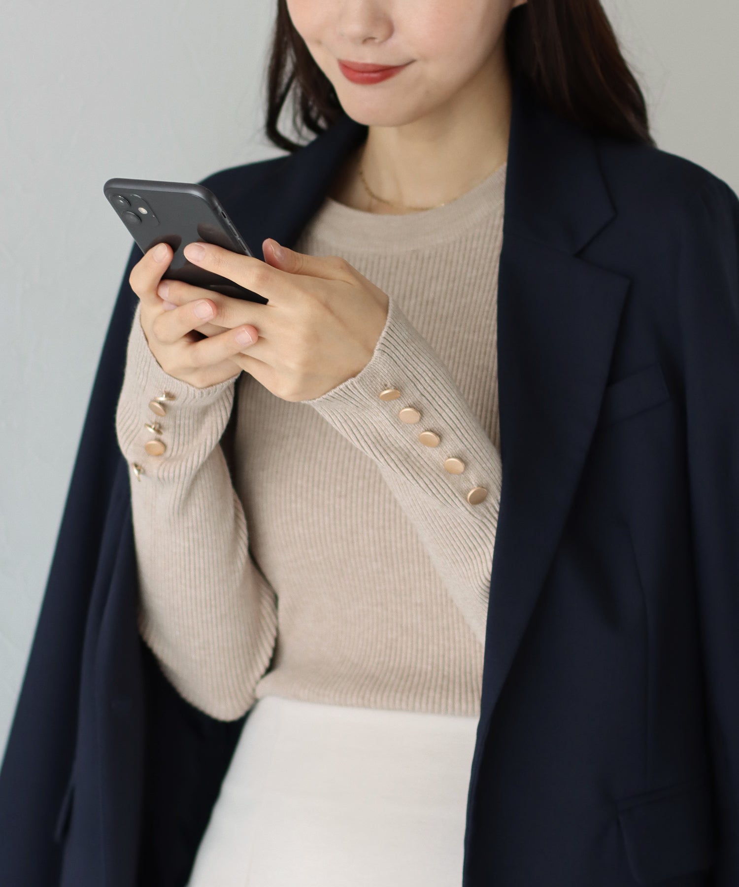 上品なクルーネックのシンプルニットに袖口に付いた金ボタンがさり気ないアクセントになっています。