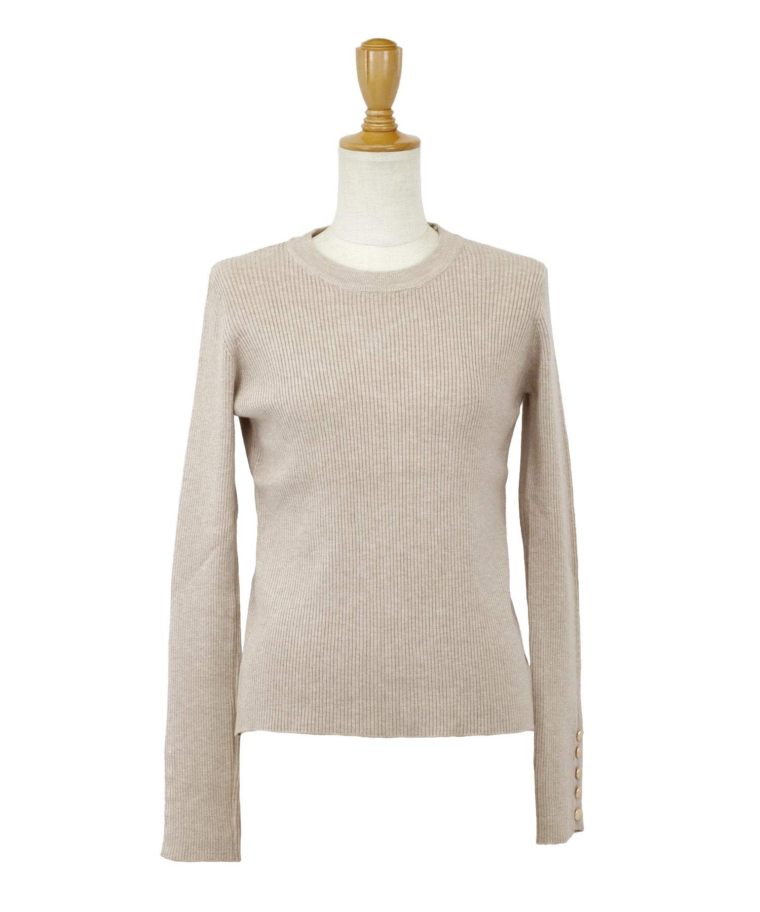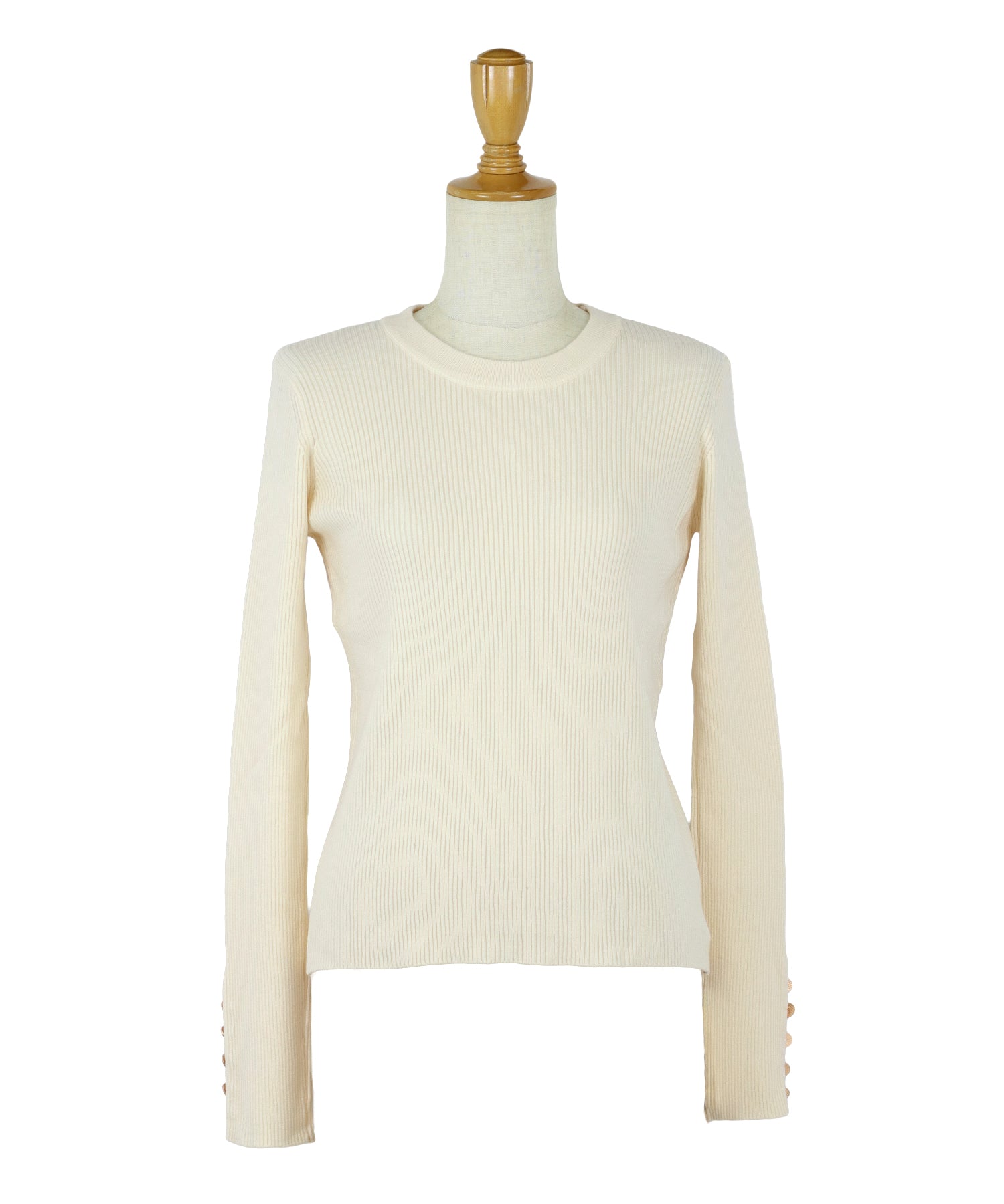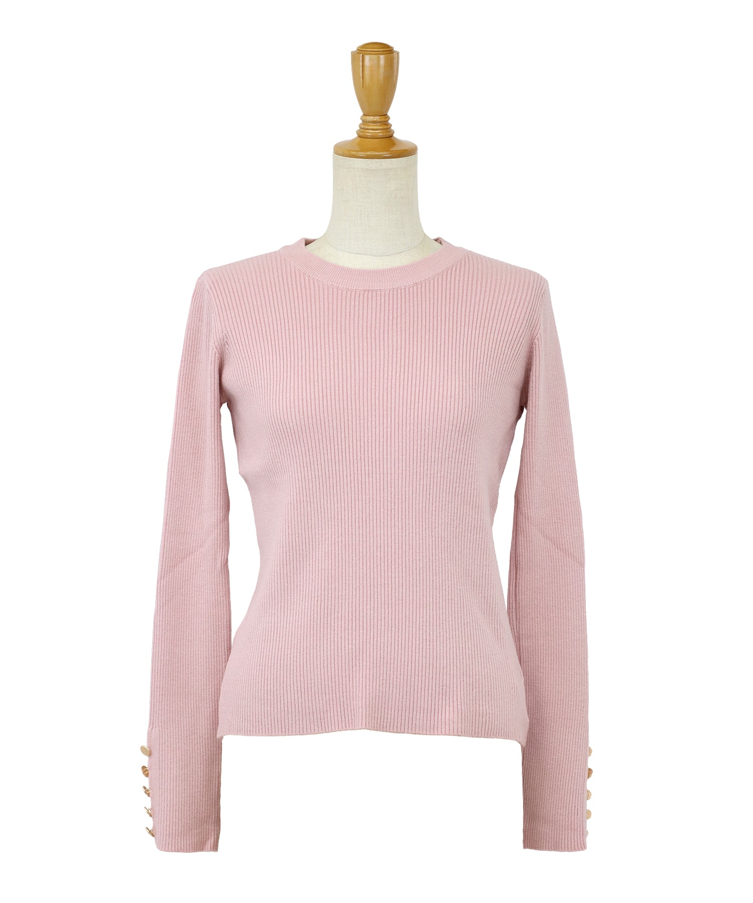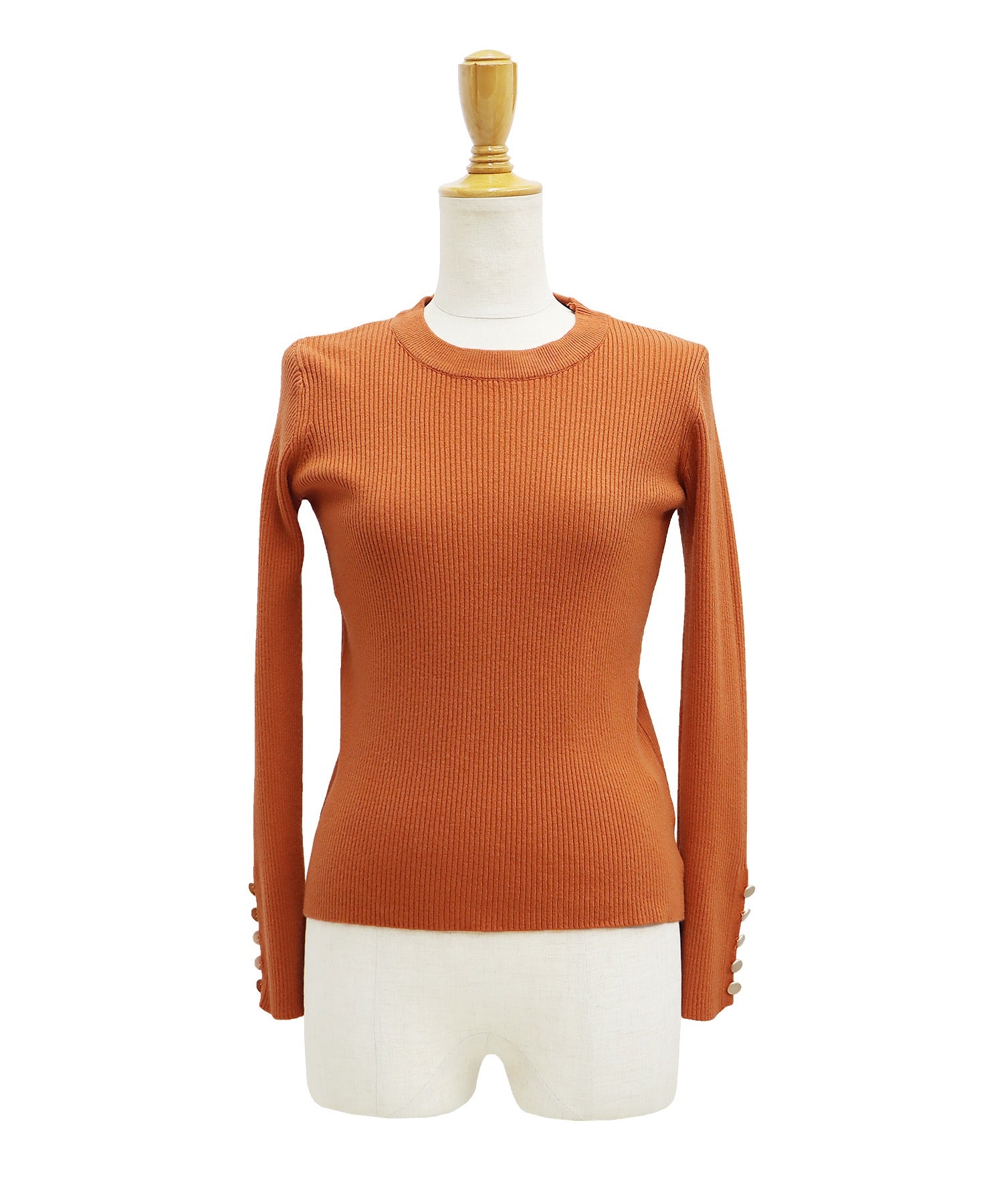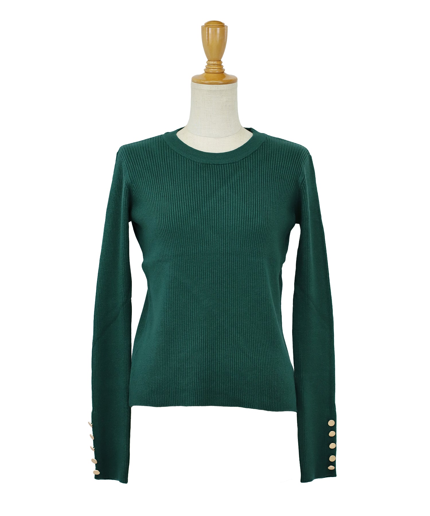 上品なクルーネックのシンプルニットに袖口に付いた金ボタンがさり気ないアクセントになっています。