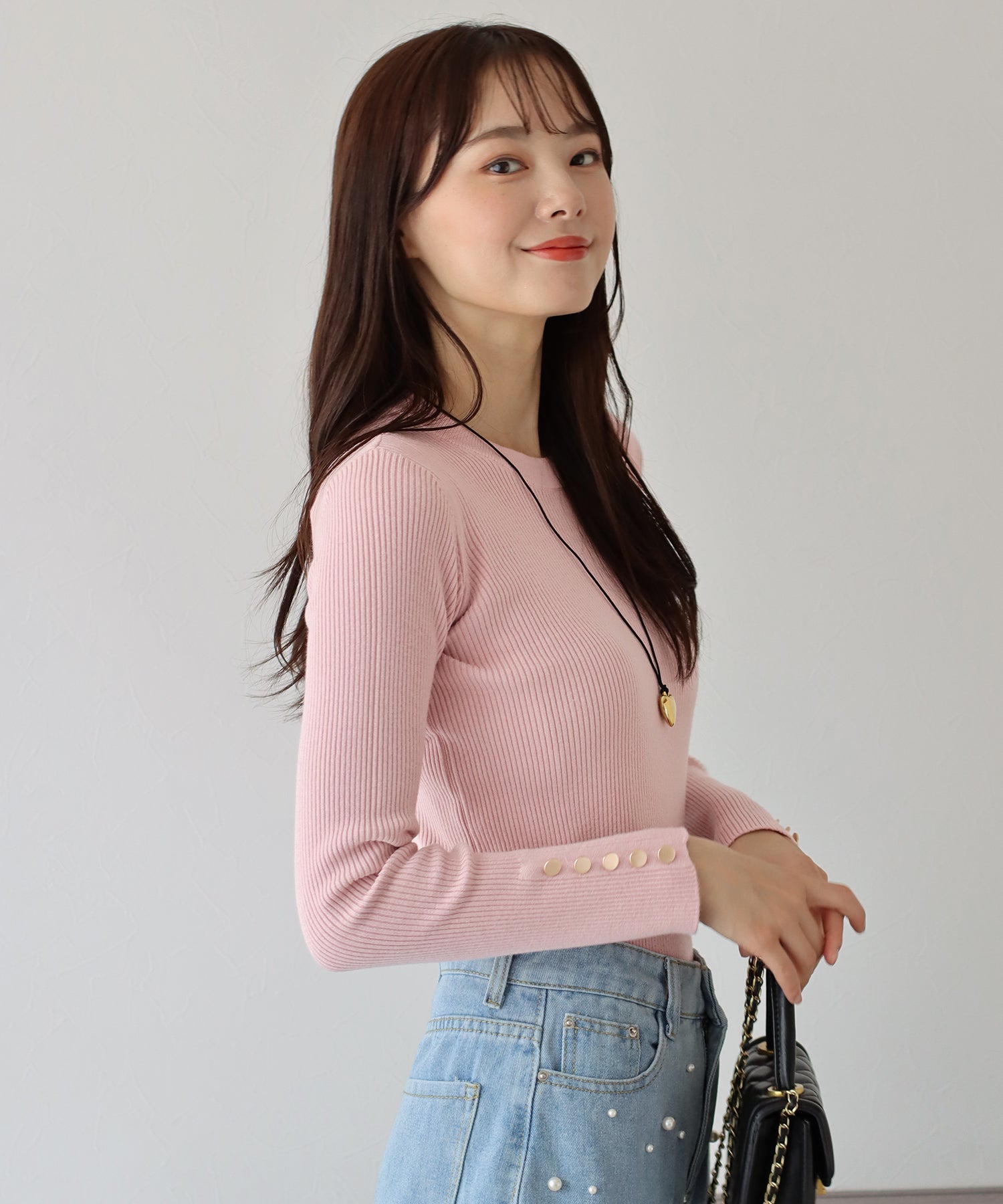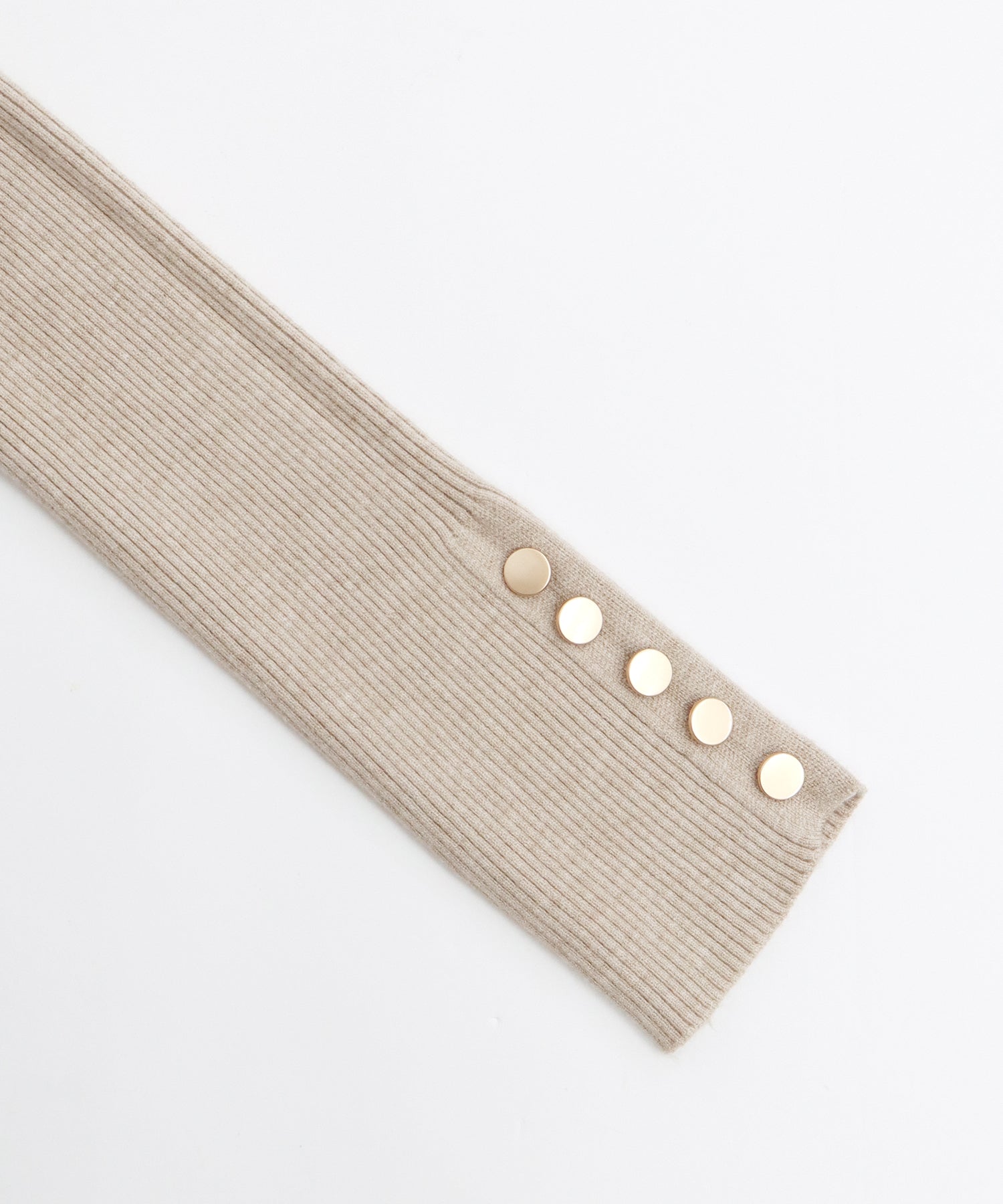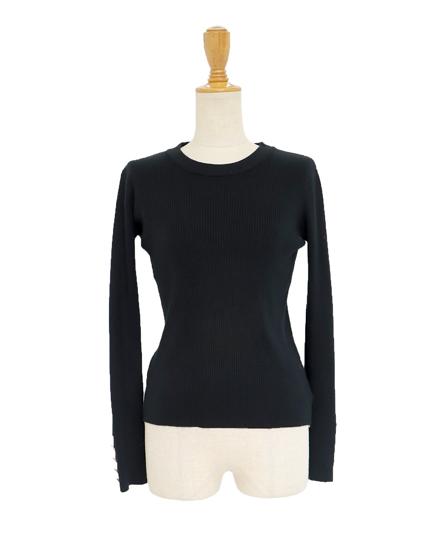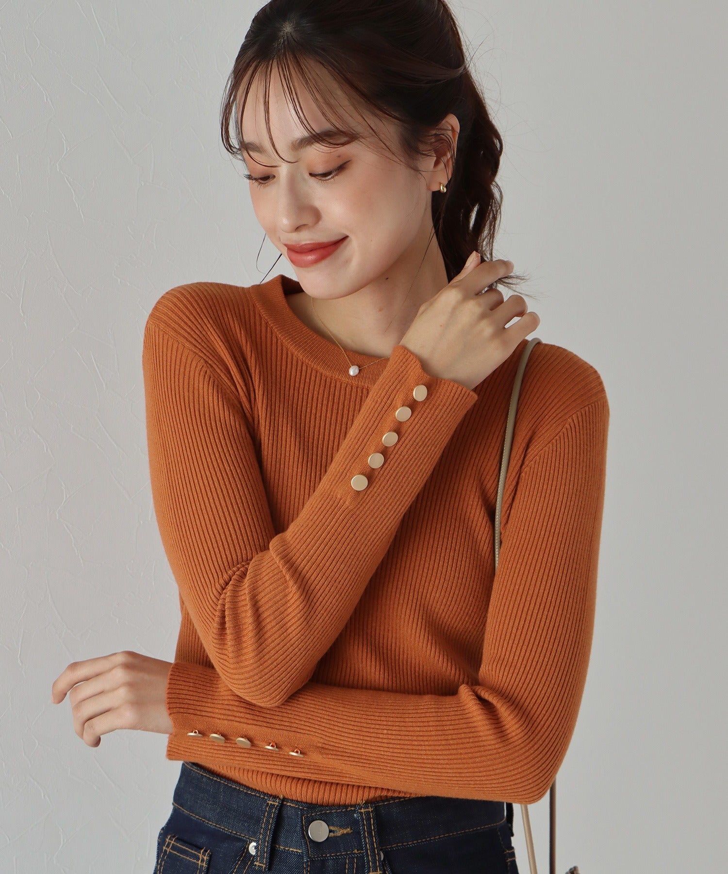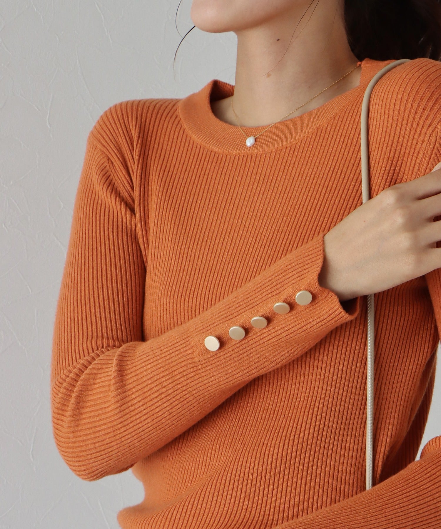 上品なクルーネックのシンプルニットに袖口に付いた金ボタンがさり気ないアクセントになっています。