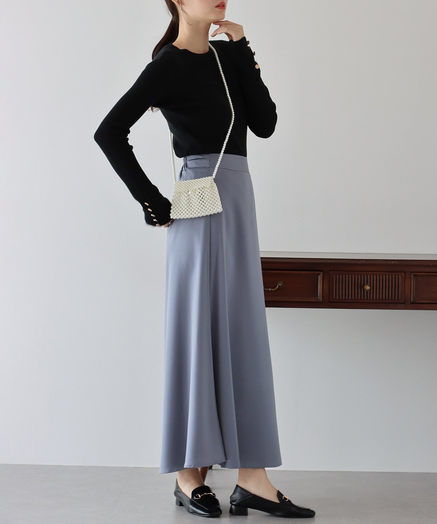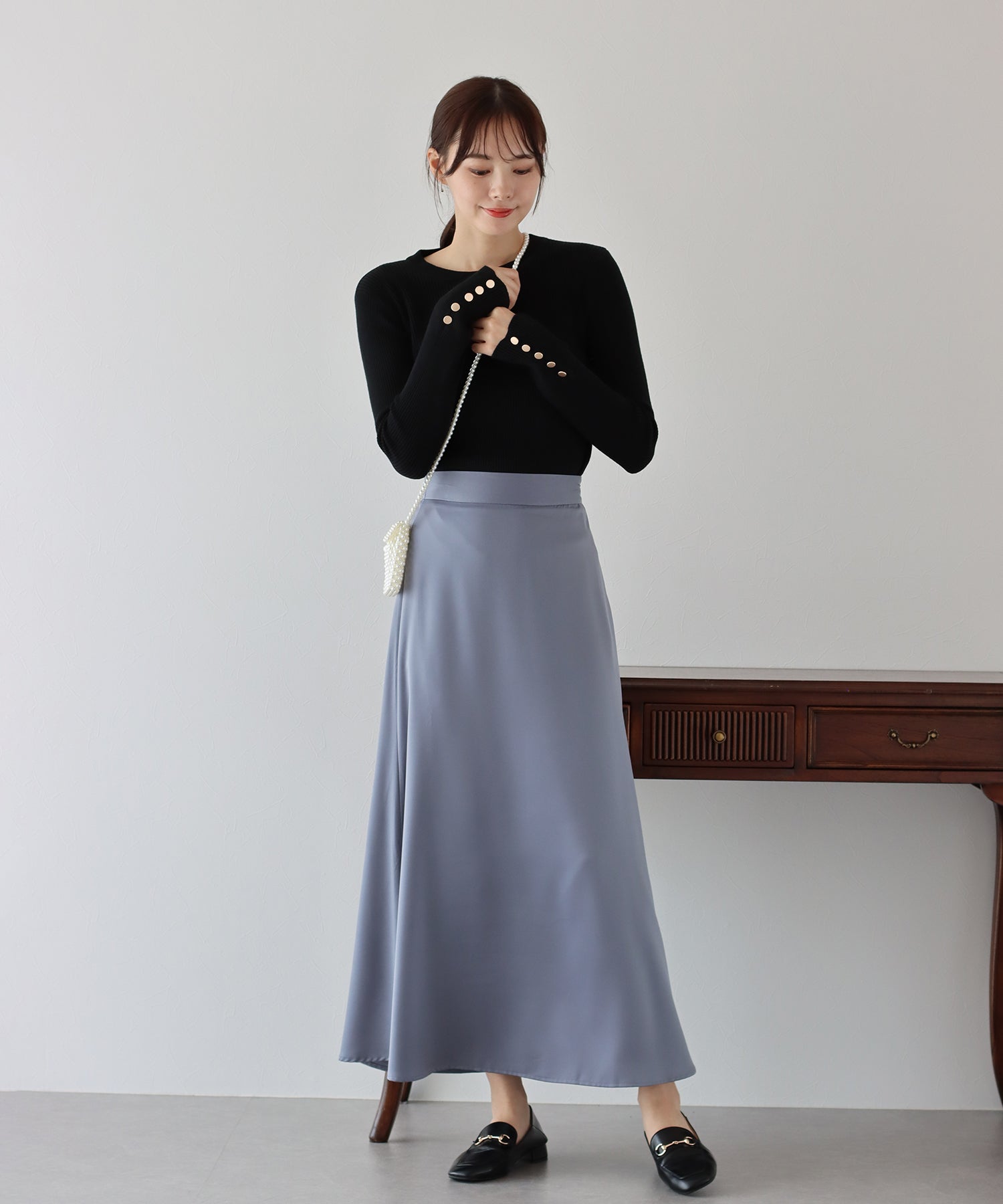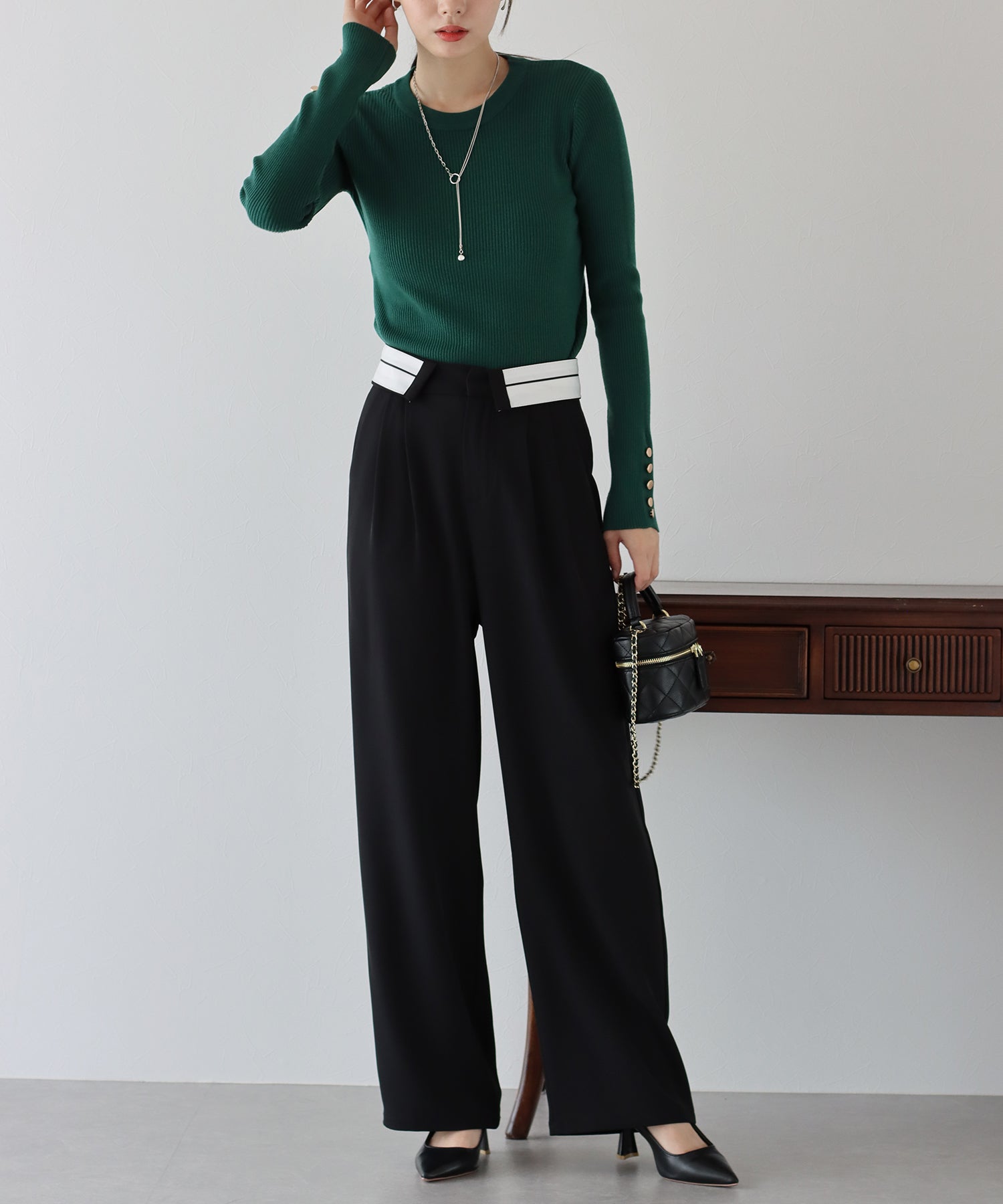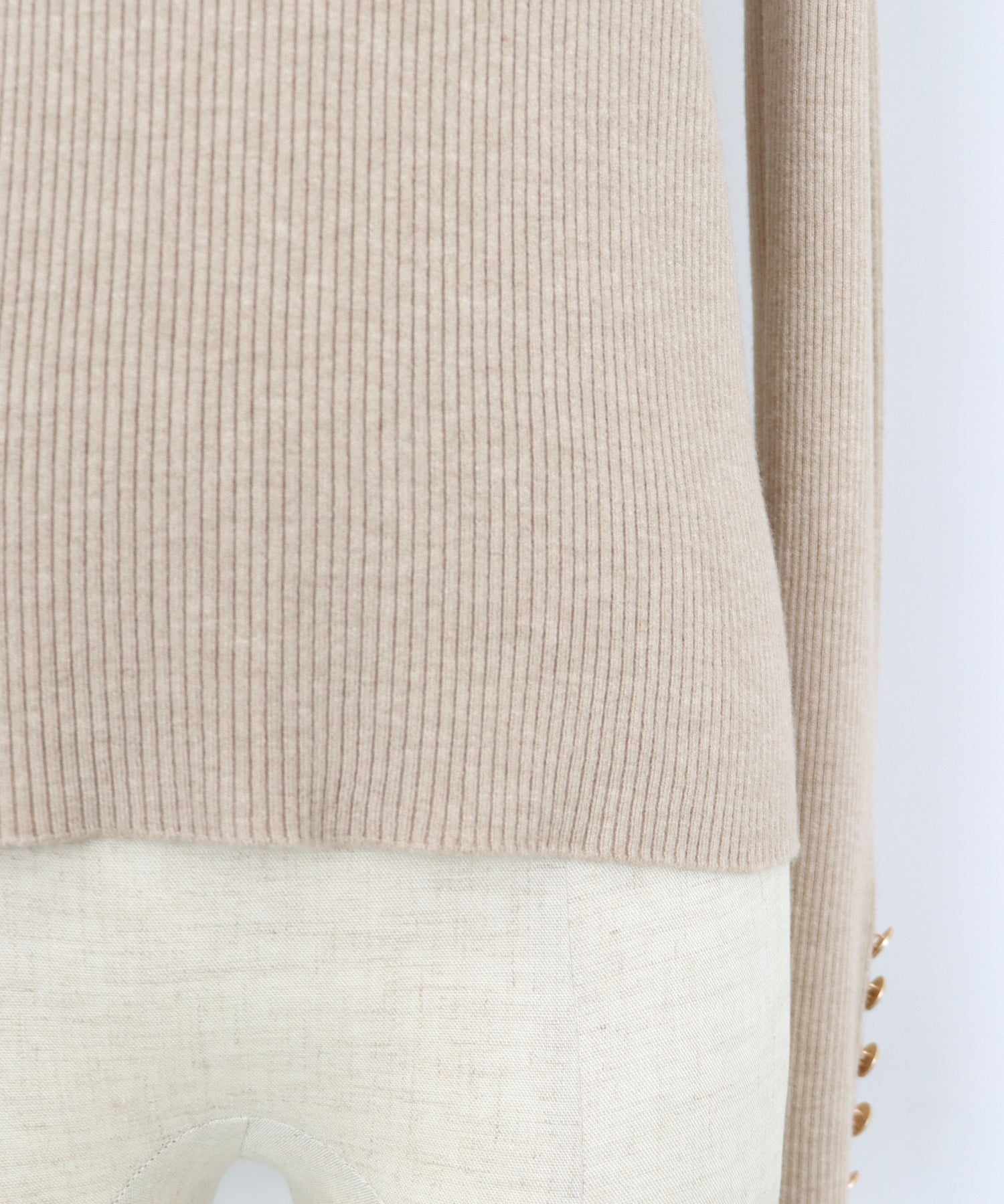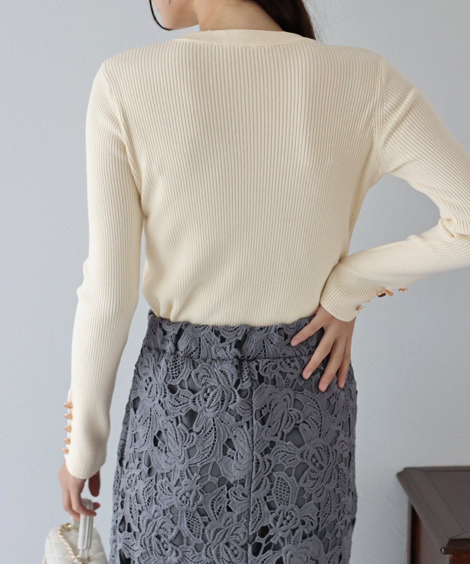 上品なクルーネックのシンプルニットに袖口に付いた金ボタンがさり気ないアクセントになっています。
