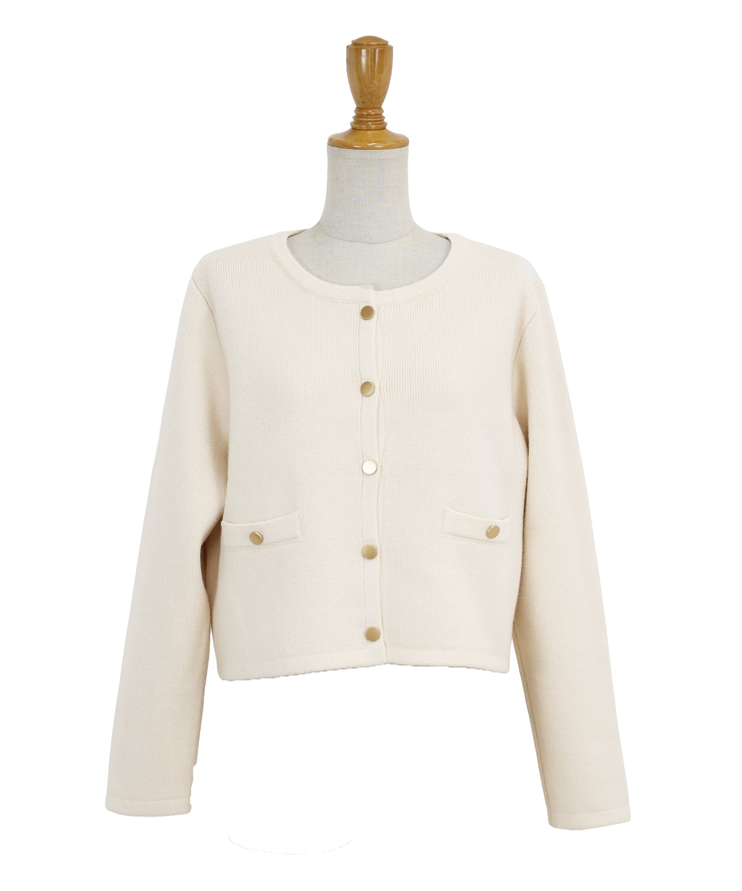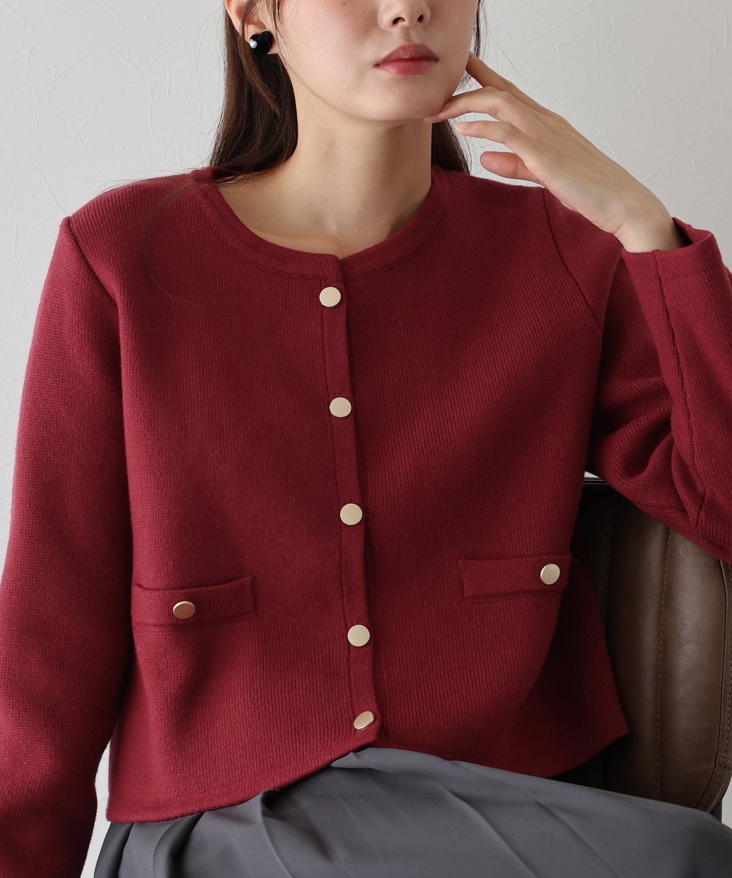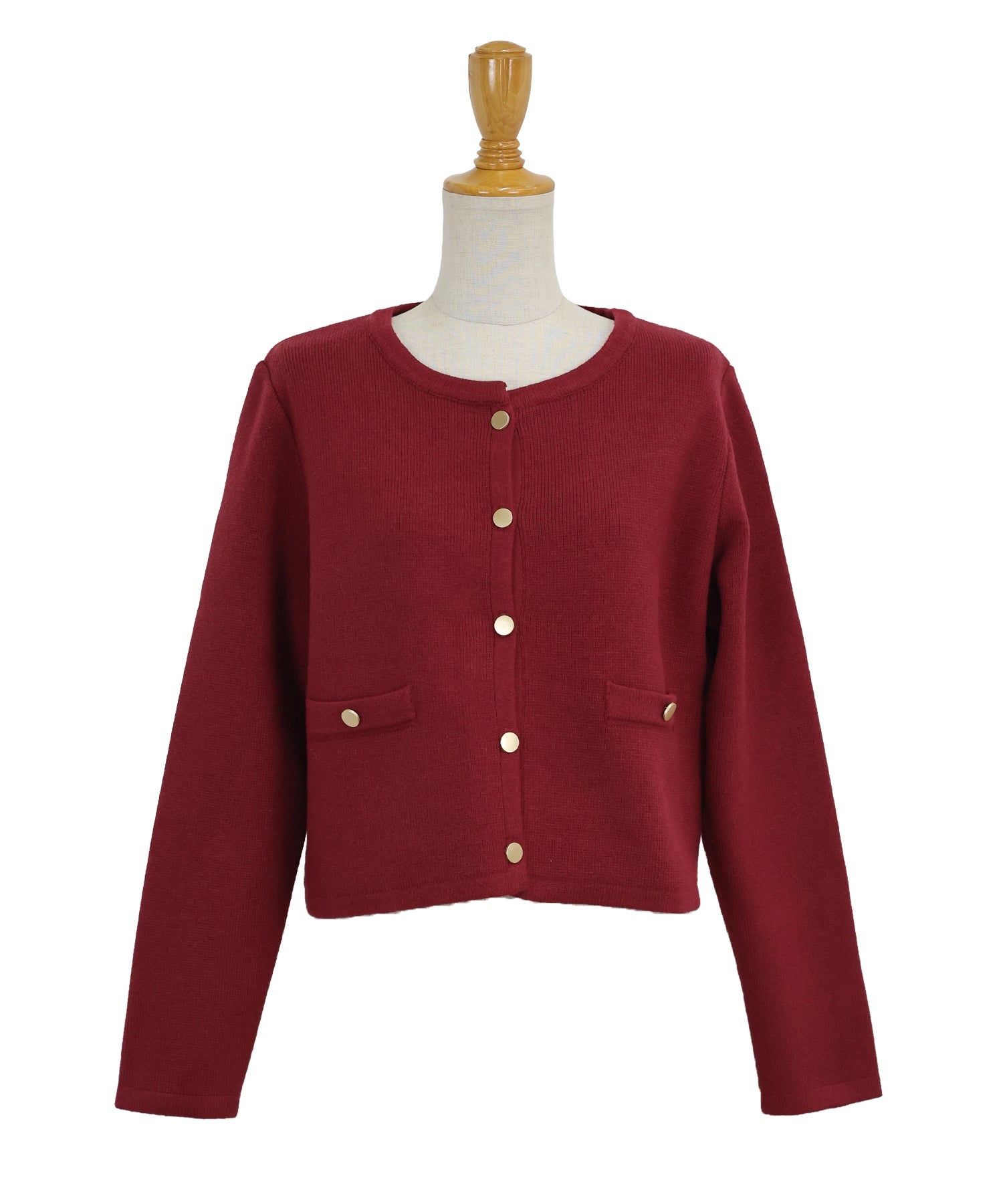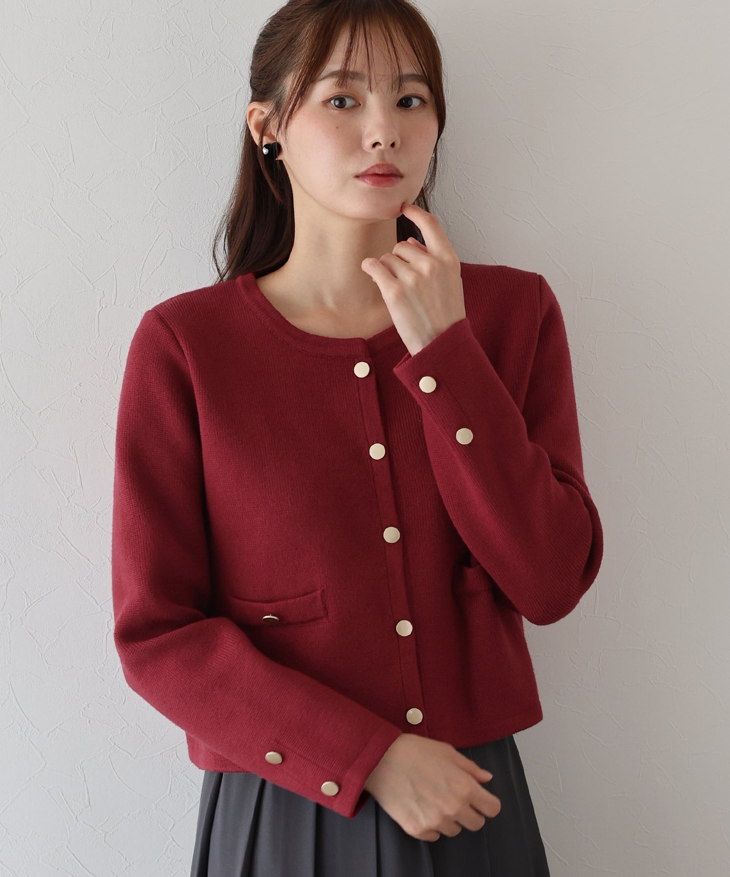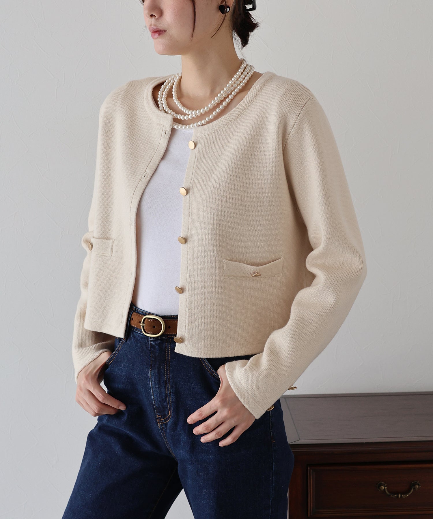 配色に金釦がアクセントになったクルーネックニットカーディガン。