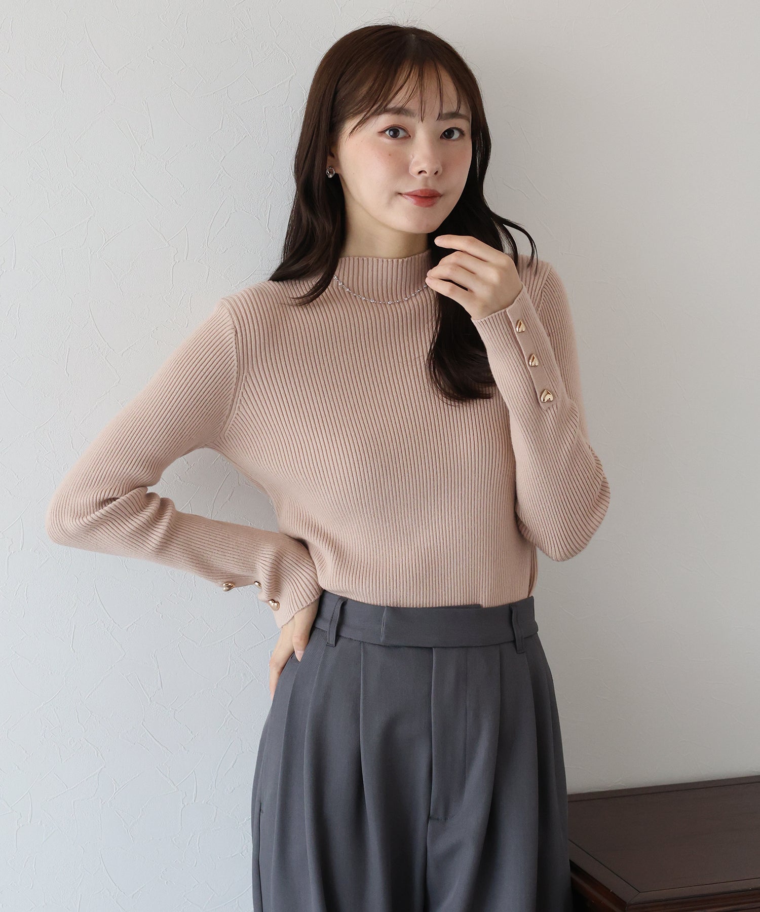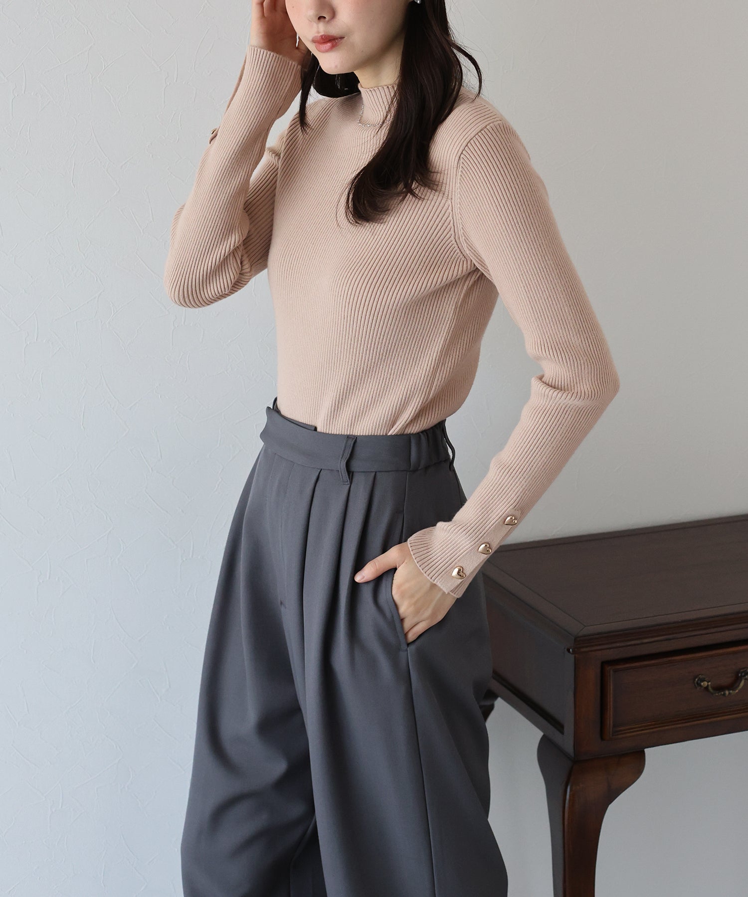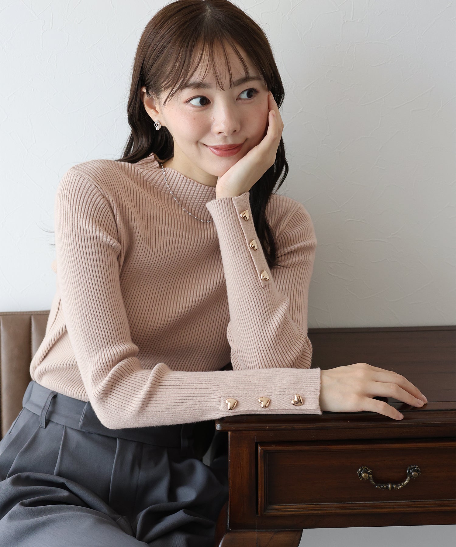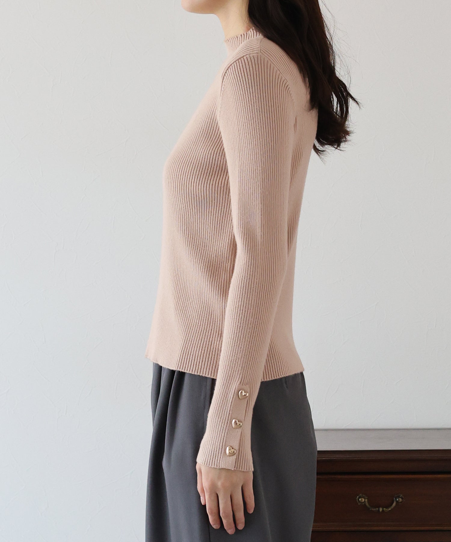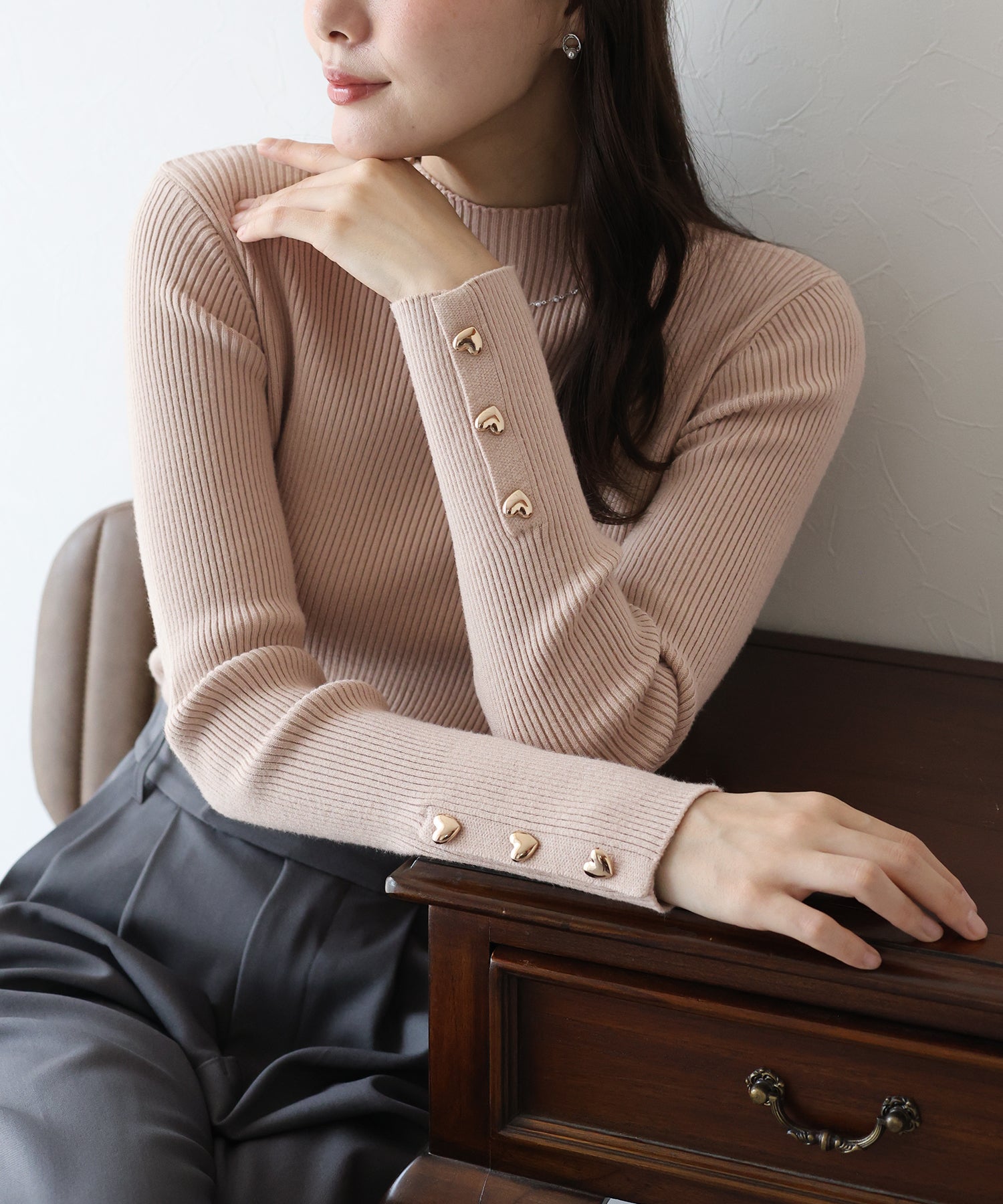 袖口のハート型のゴールドボタンでキュートなアクセントを加えたハイネックニットトップス。