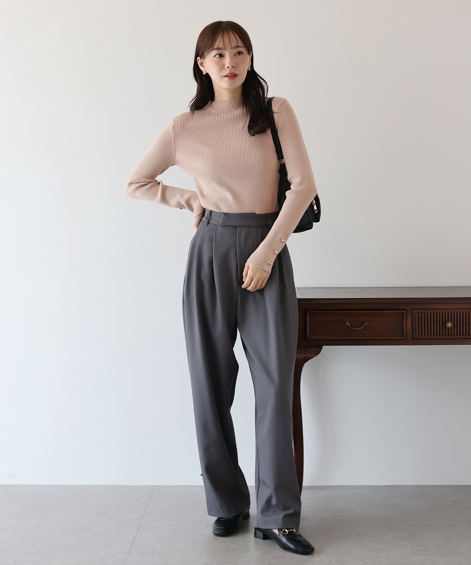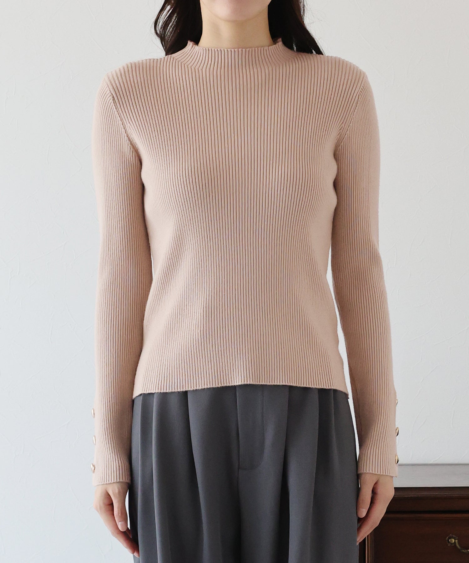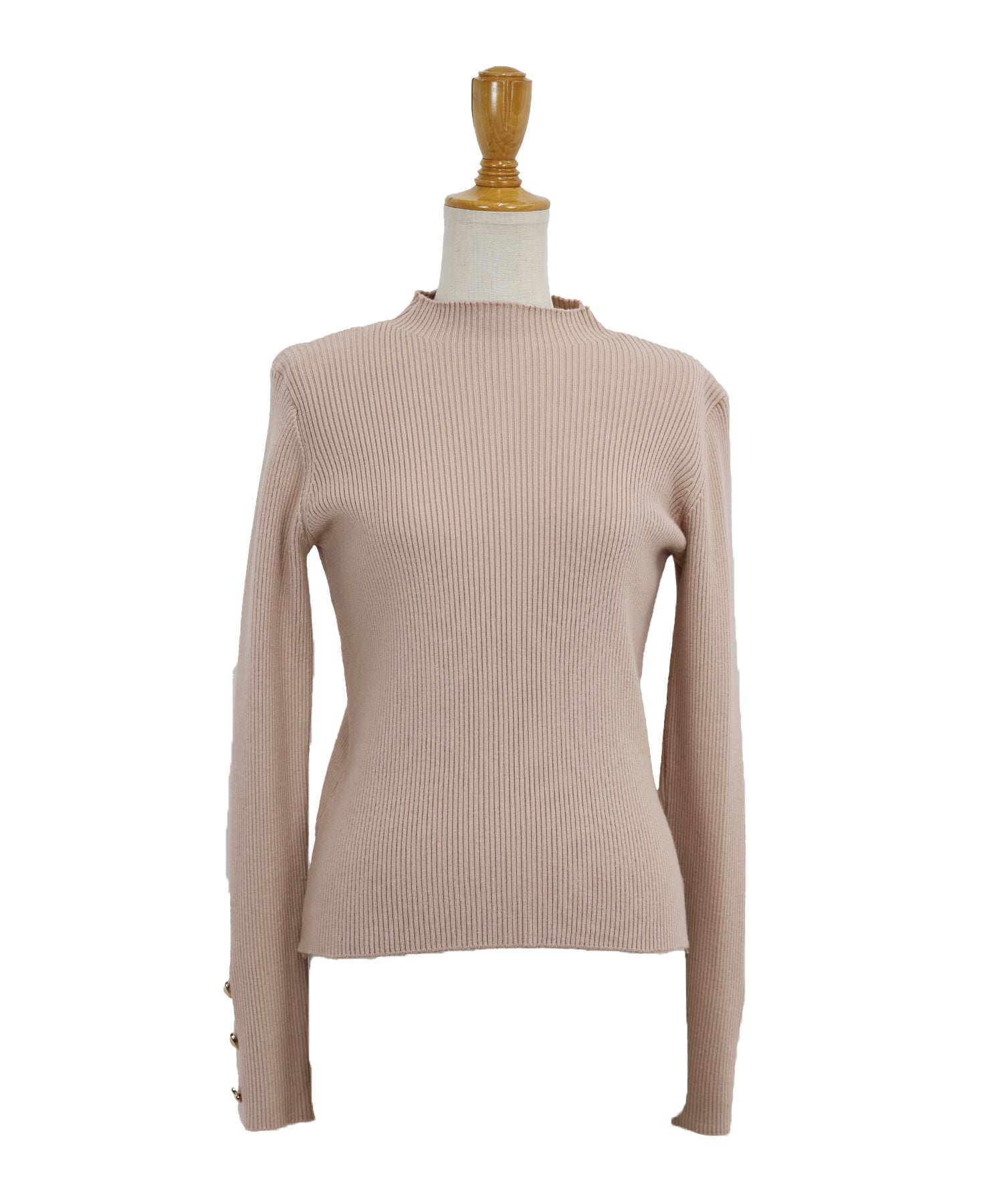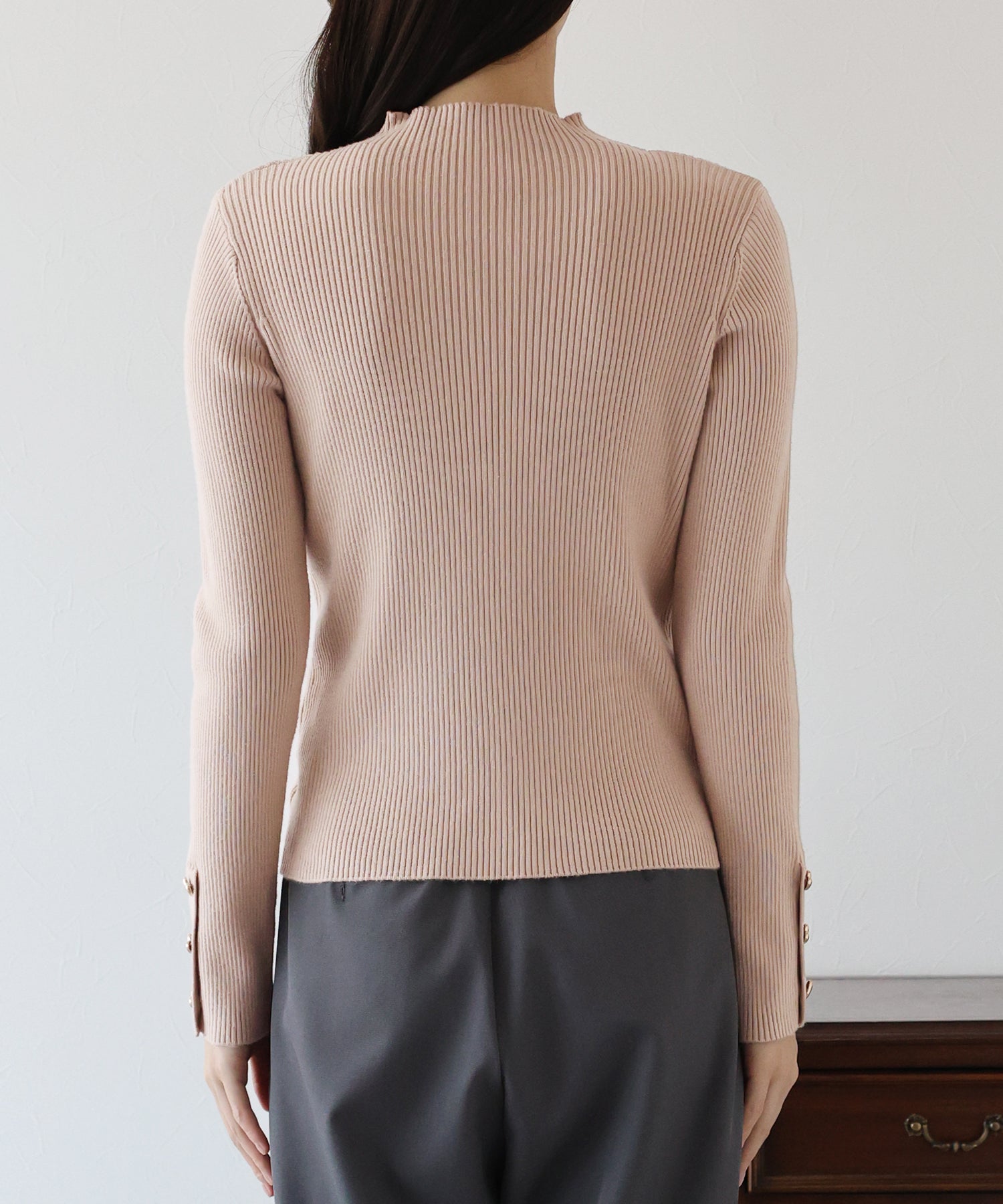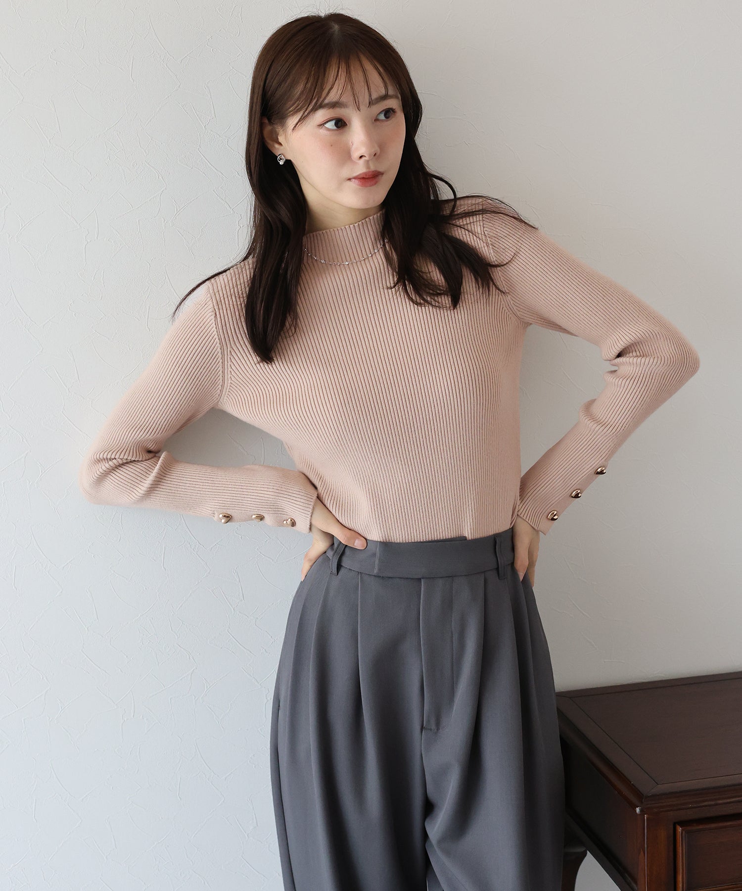 袖口のハート型のゴールドボタンでキュートなアクセントを加えたハイネックニットトップス。