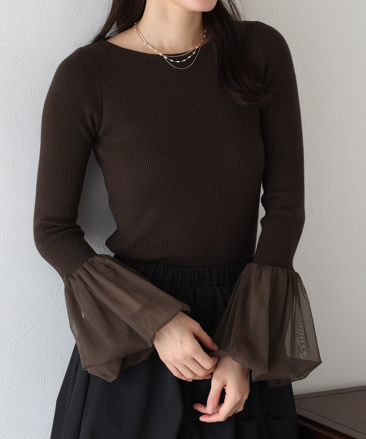 ぽわんとしたチュールスリーブが視線を引きつけるリブニット