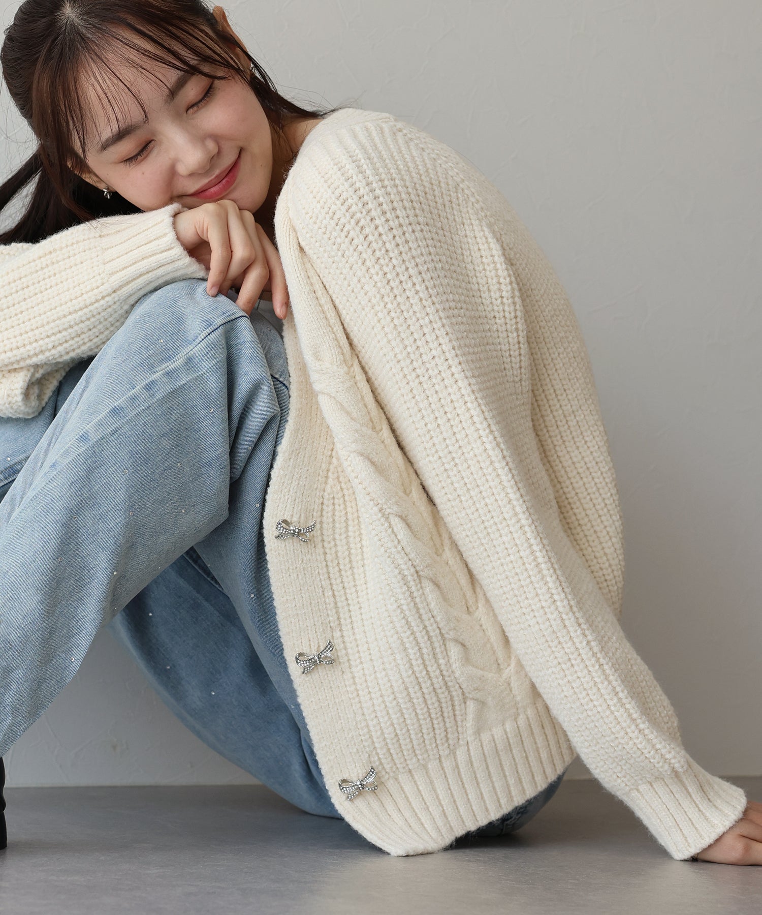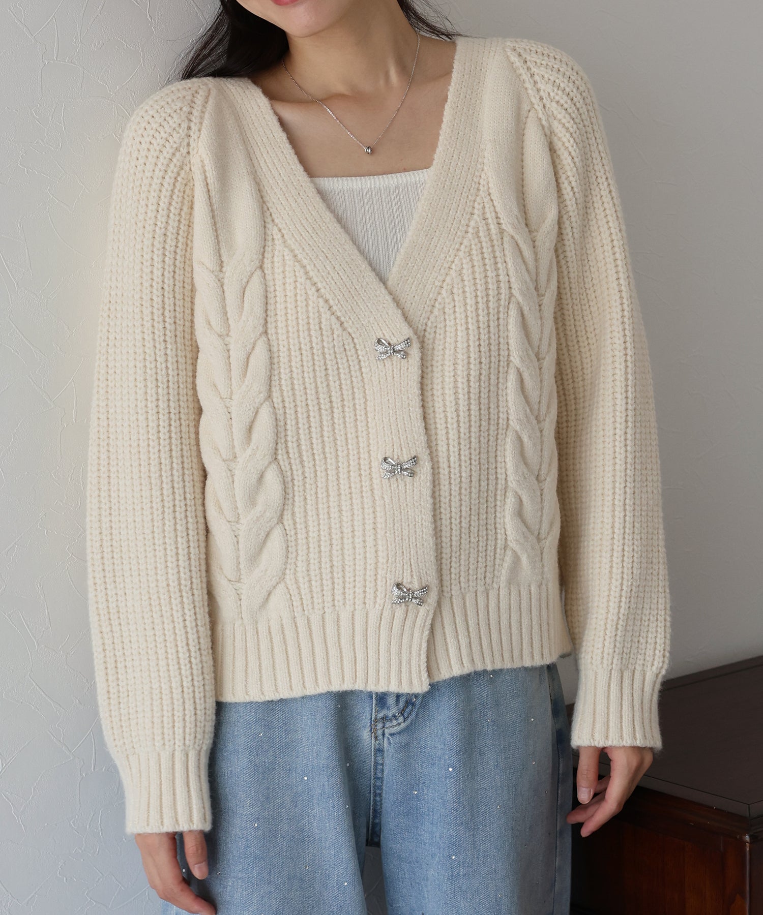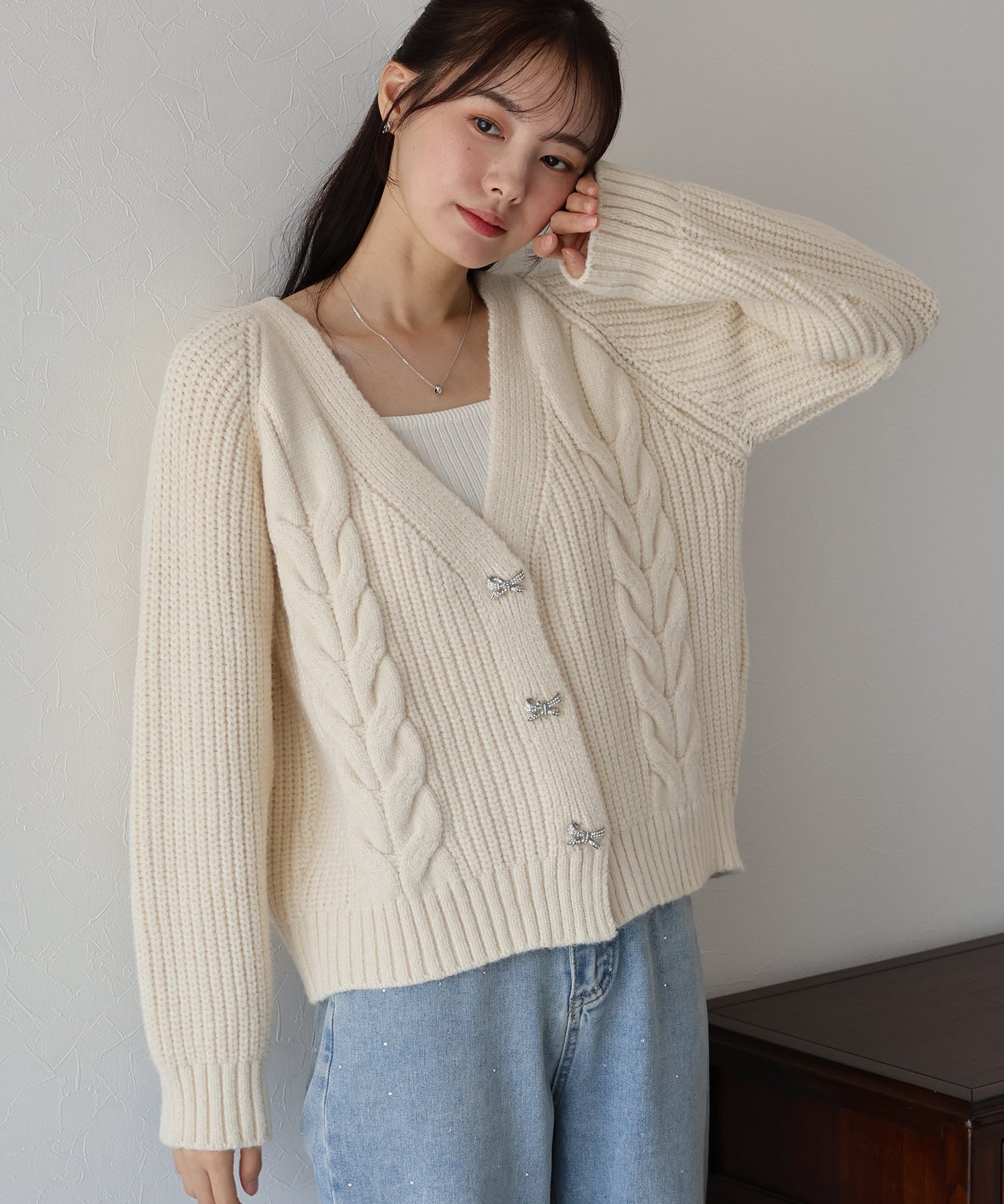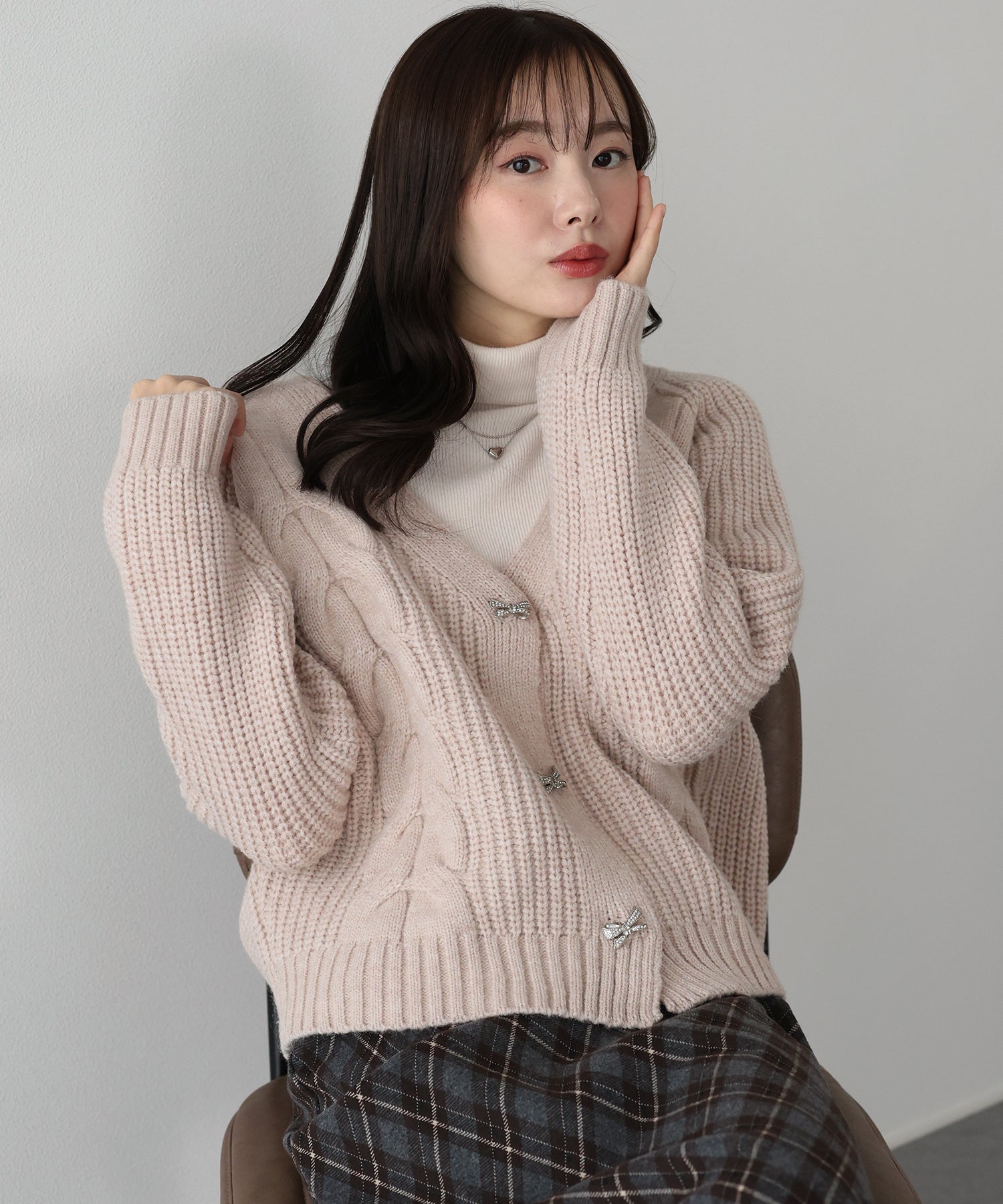 ビジューリボンボタンが今年らしいケーブルカーディガン