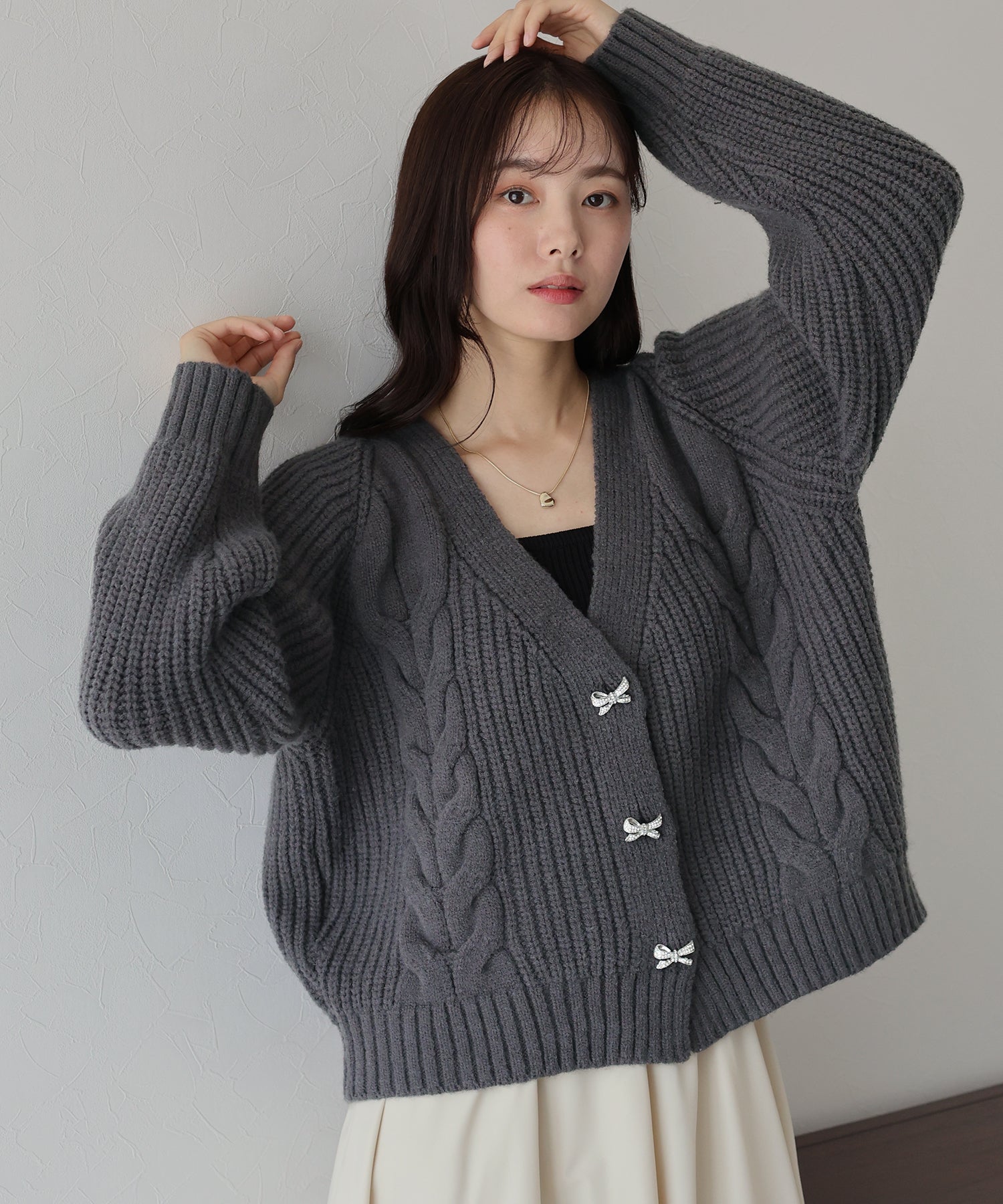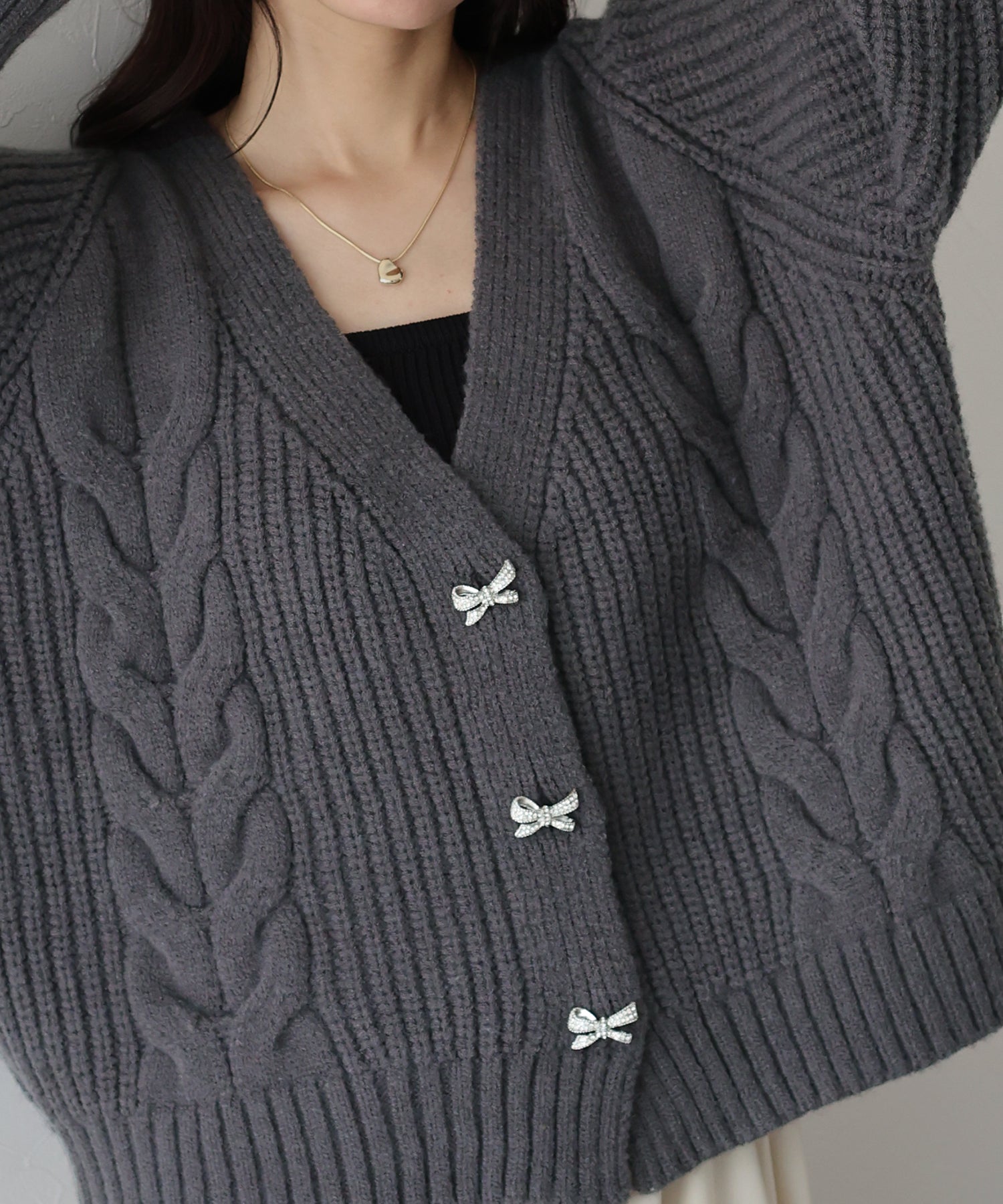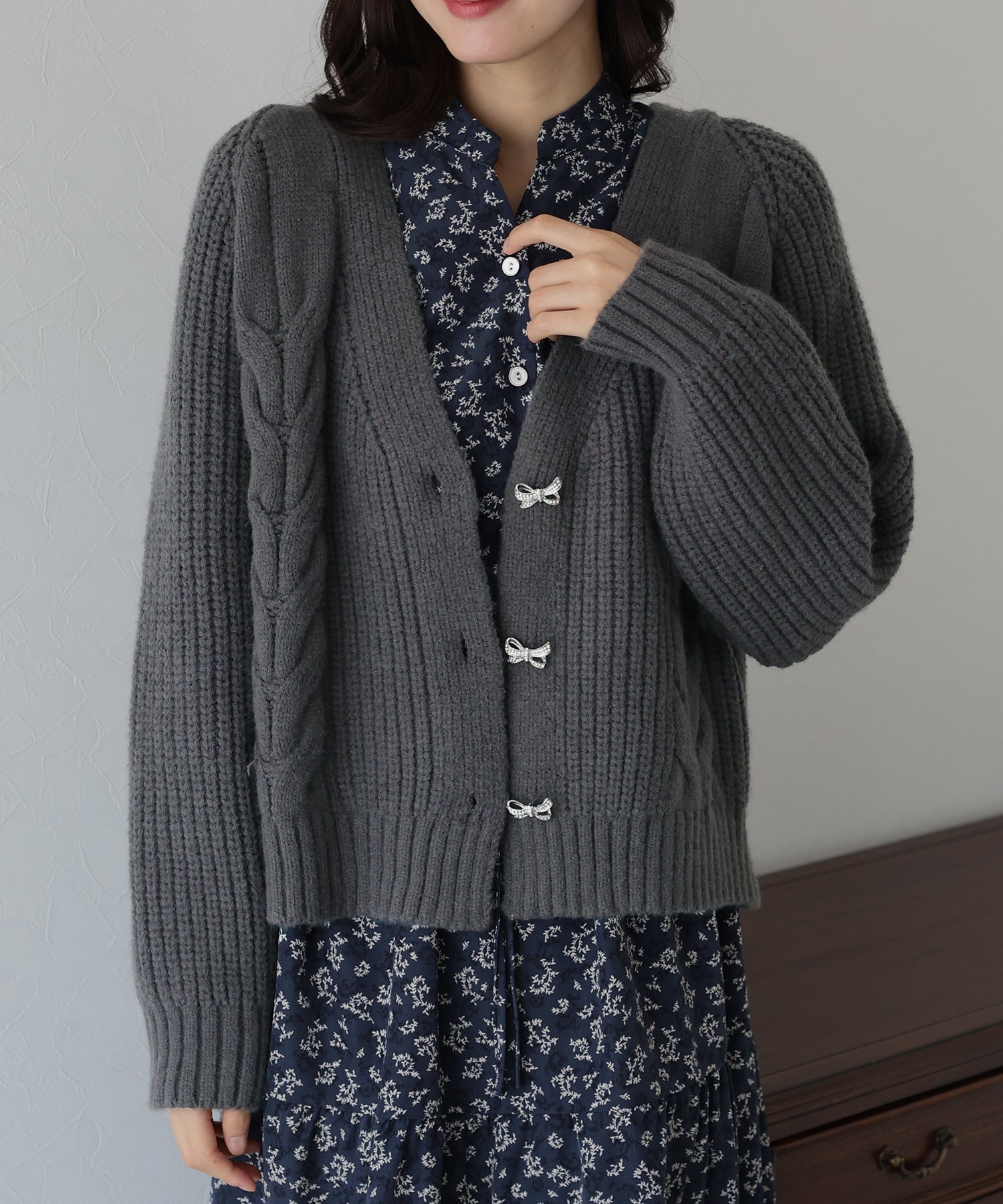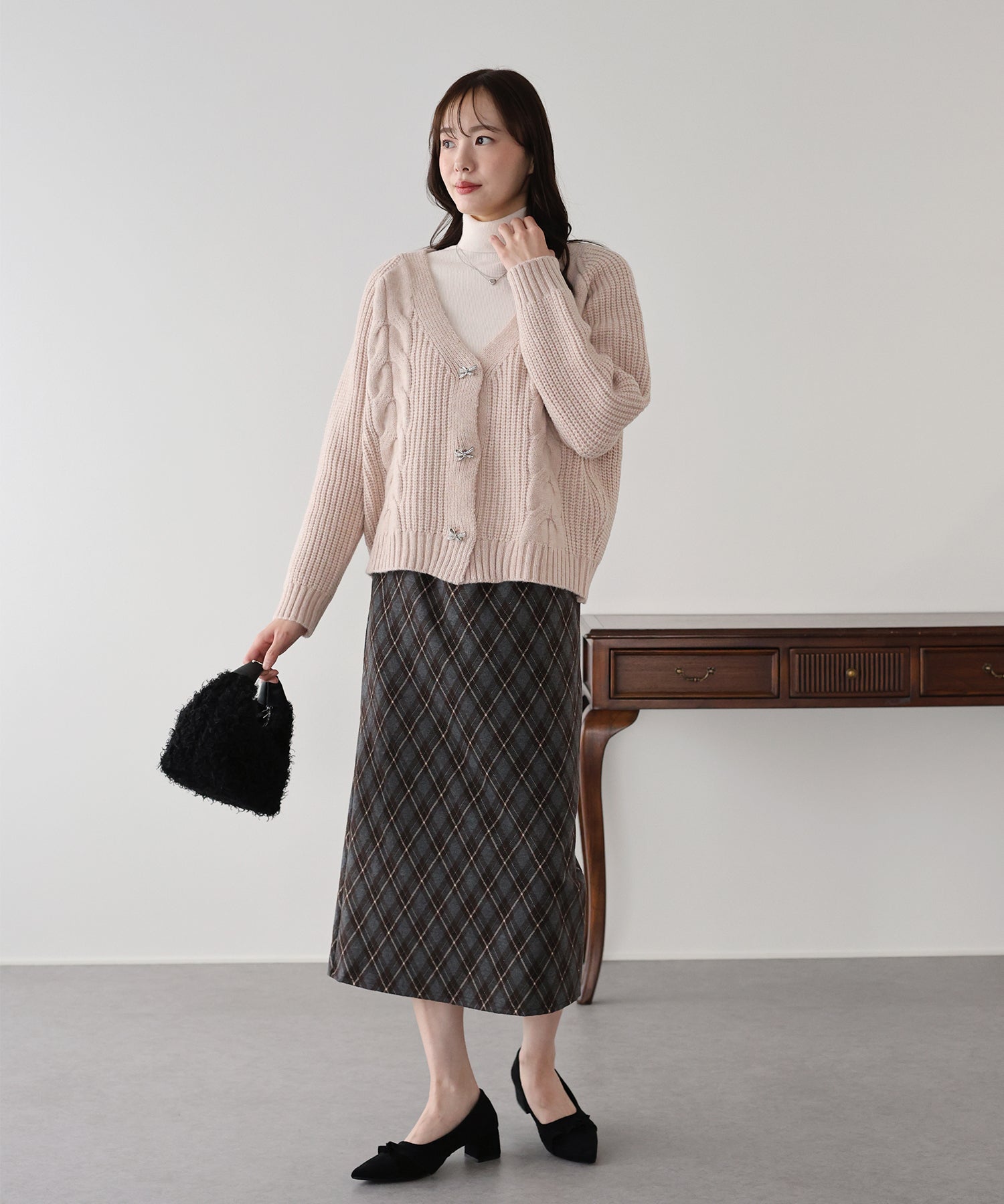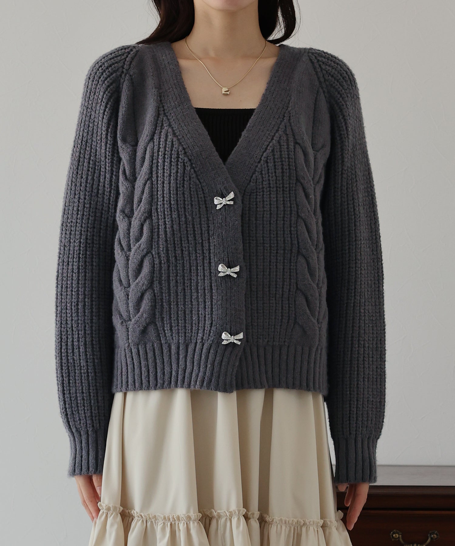 ビジューリボンボタンが今年らしいケーブルカーディガン