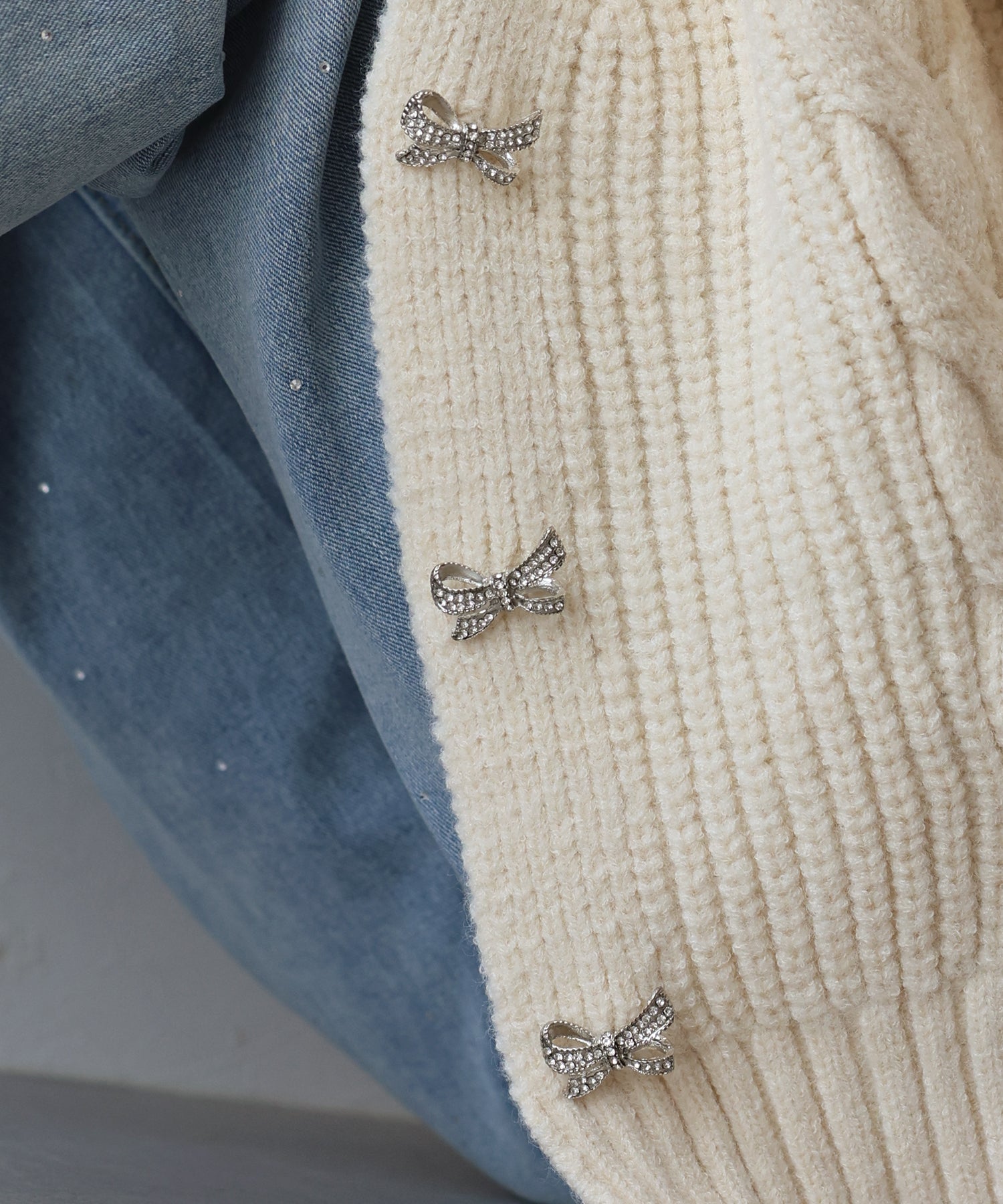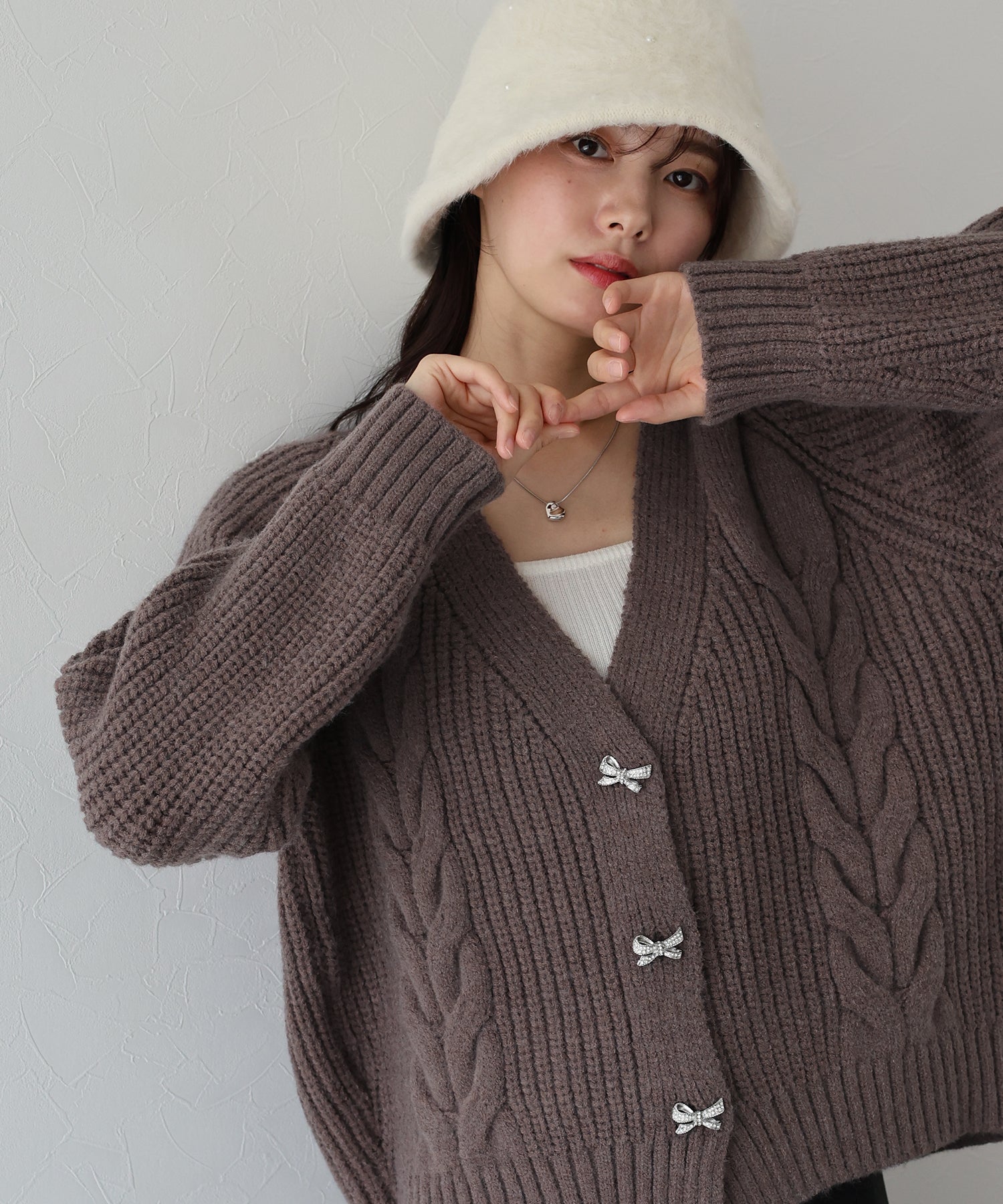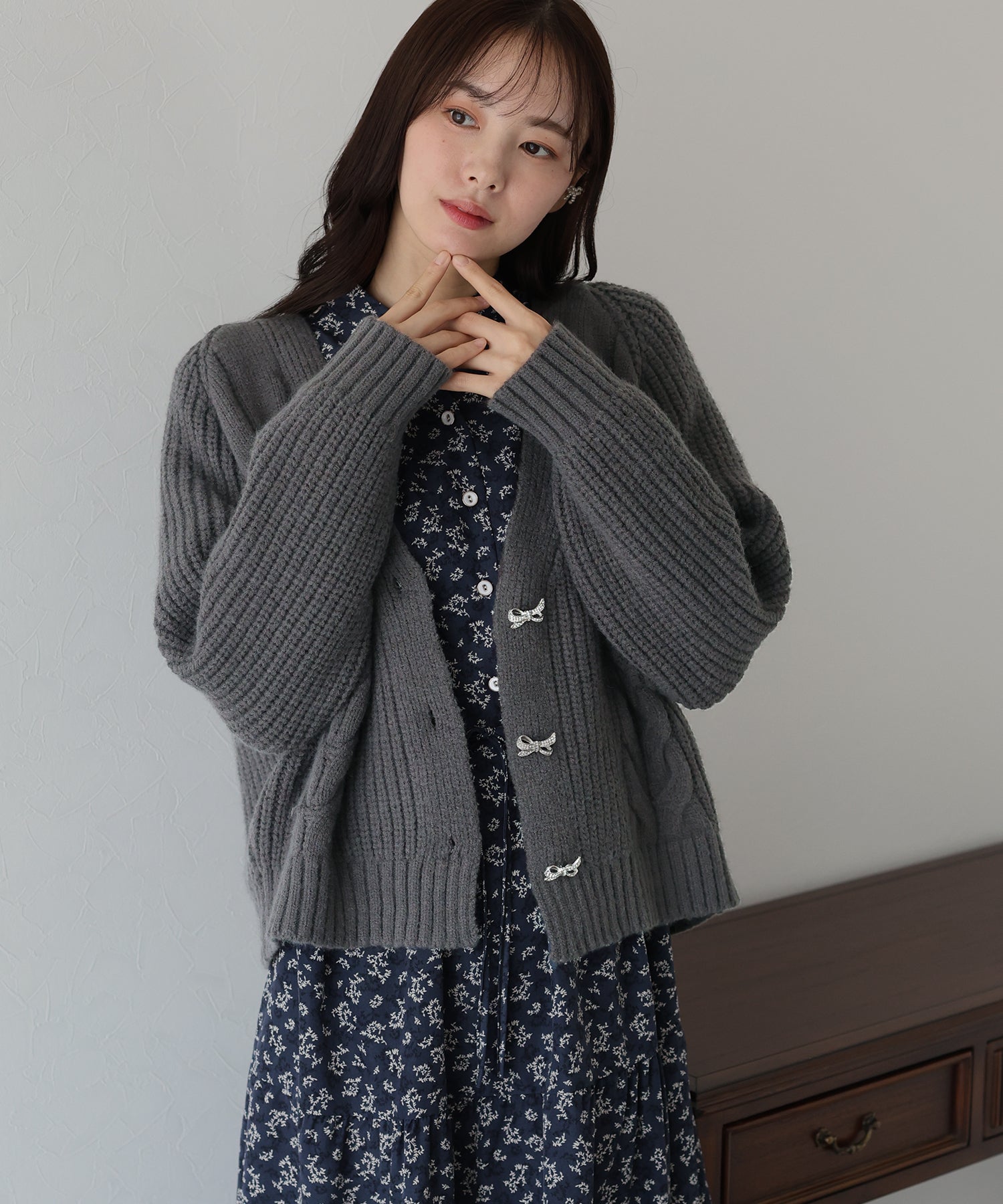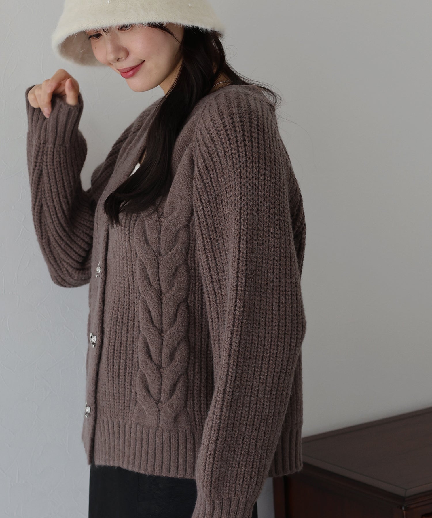 ビジューリボンボタンが今年らしいケーブルカーディガン