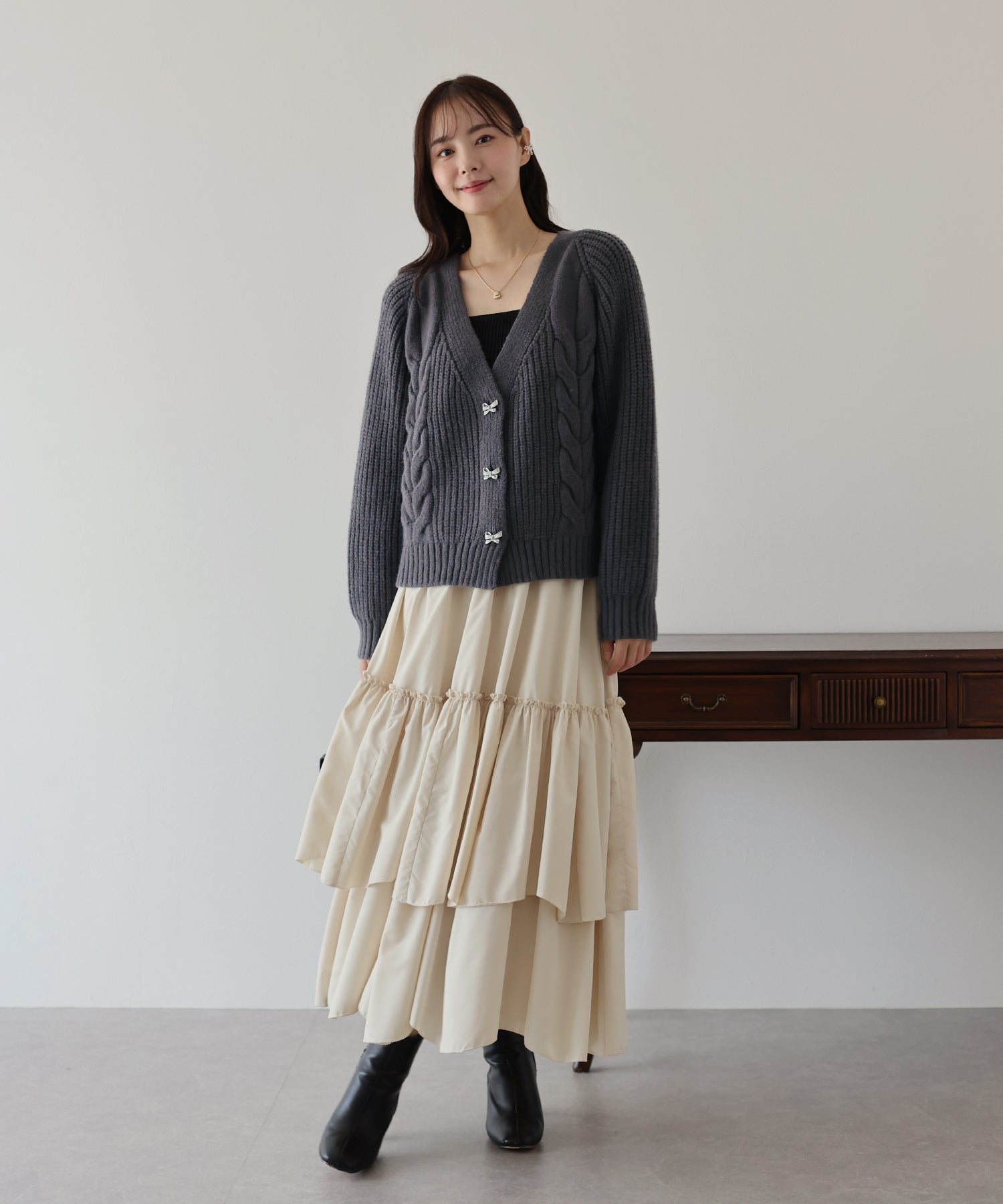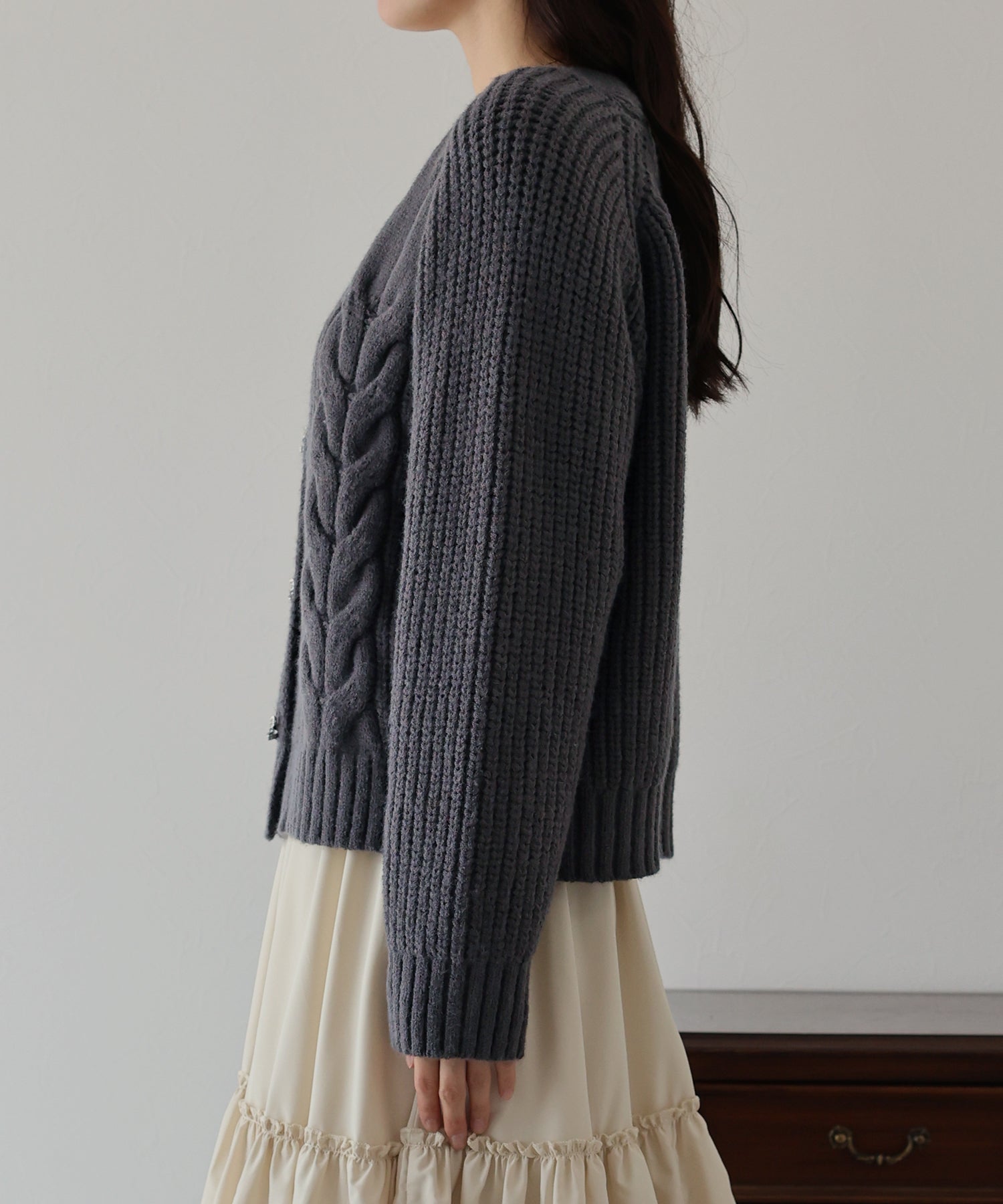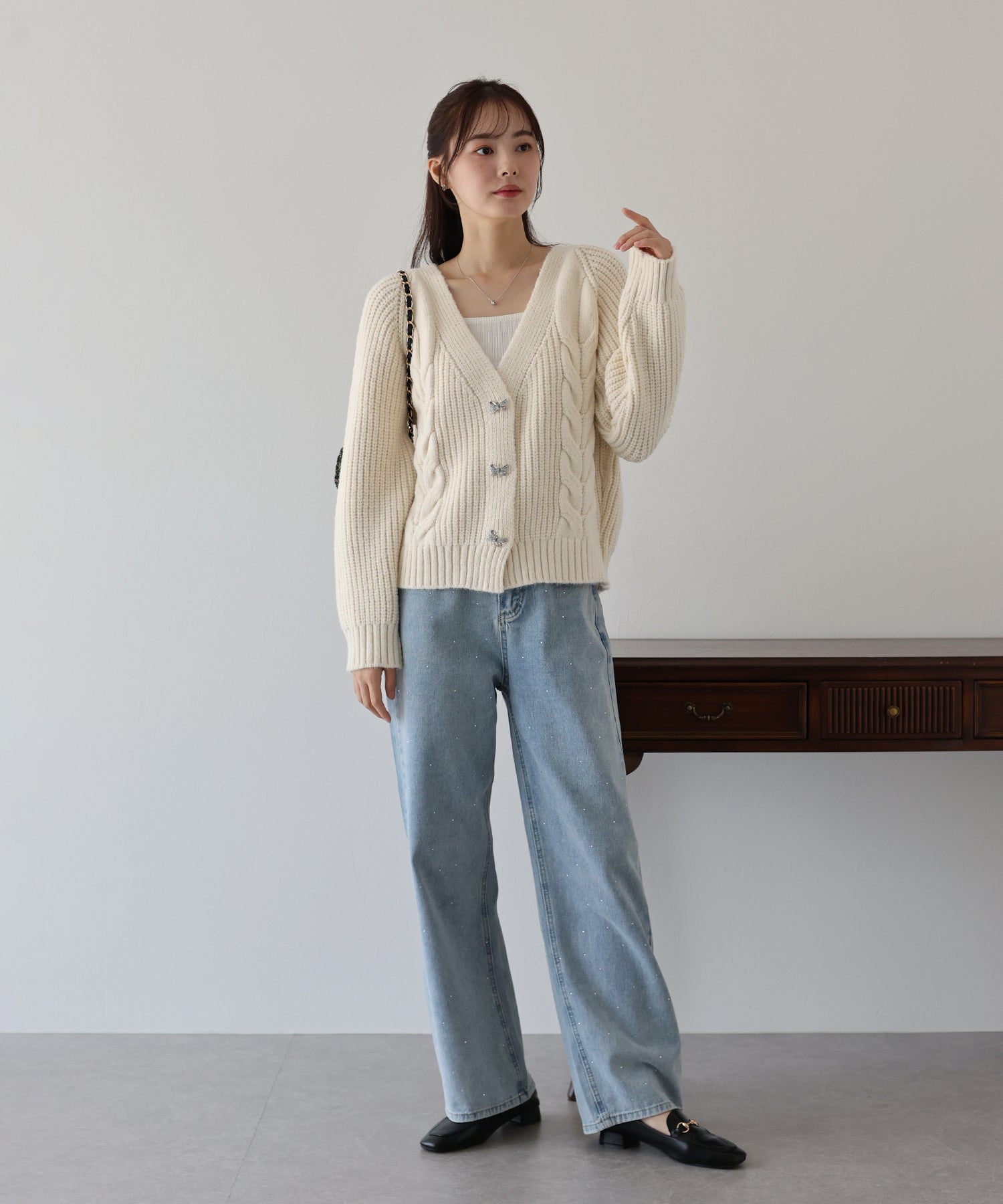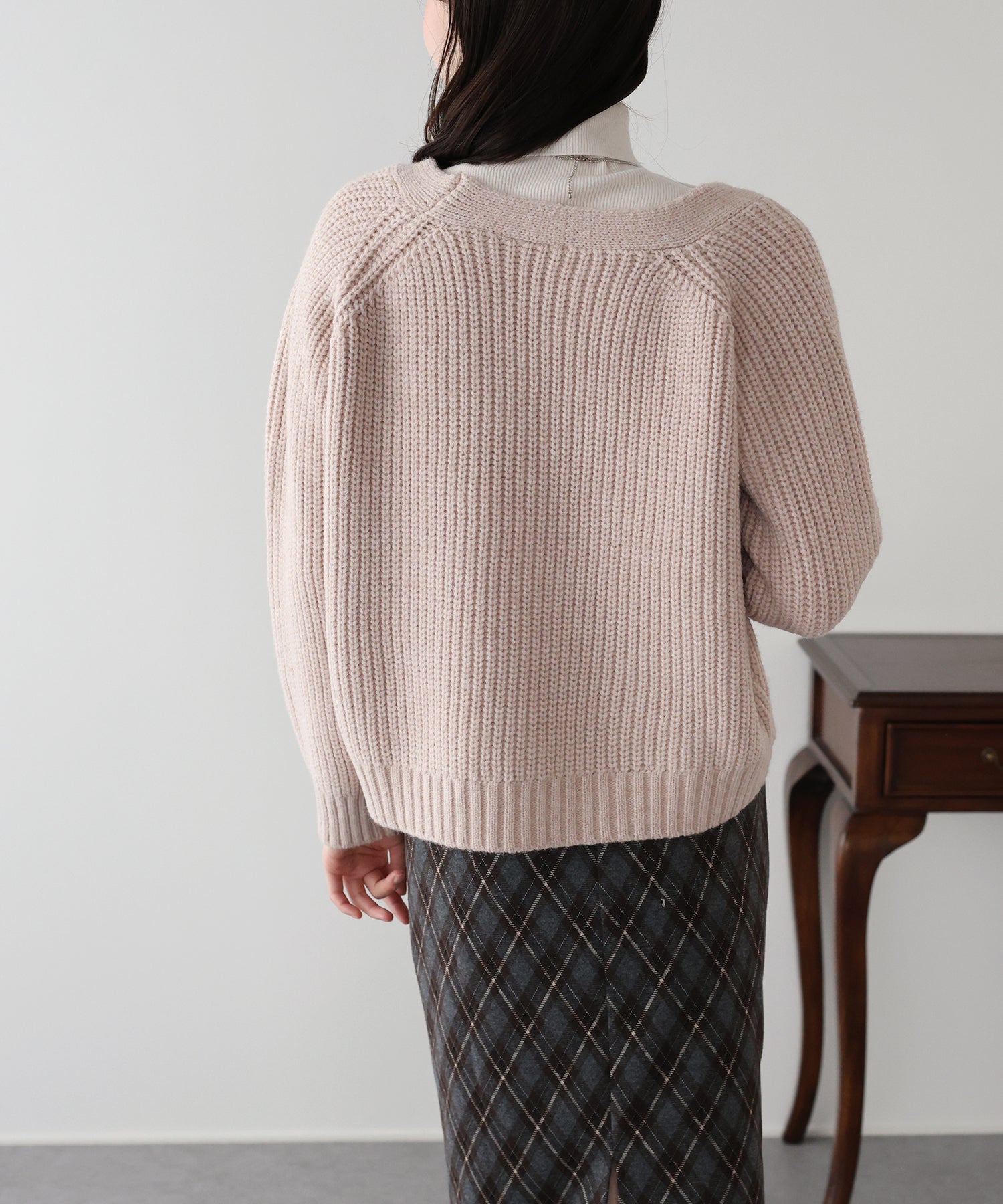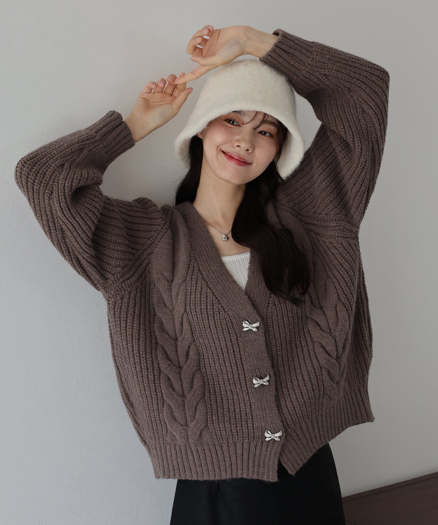 ビジューリボンボタンが今年らしいケーブルカーディガン