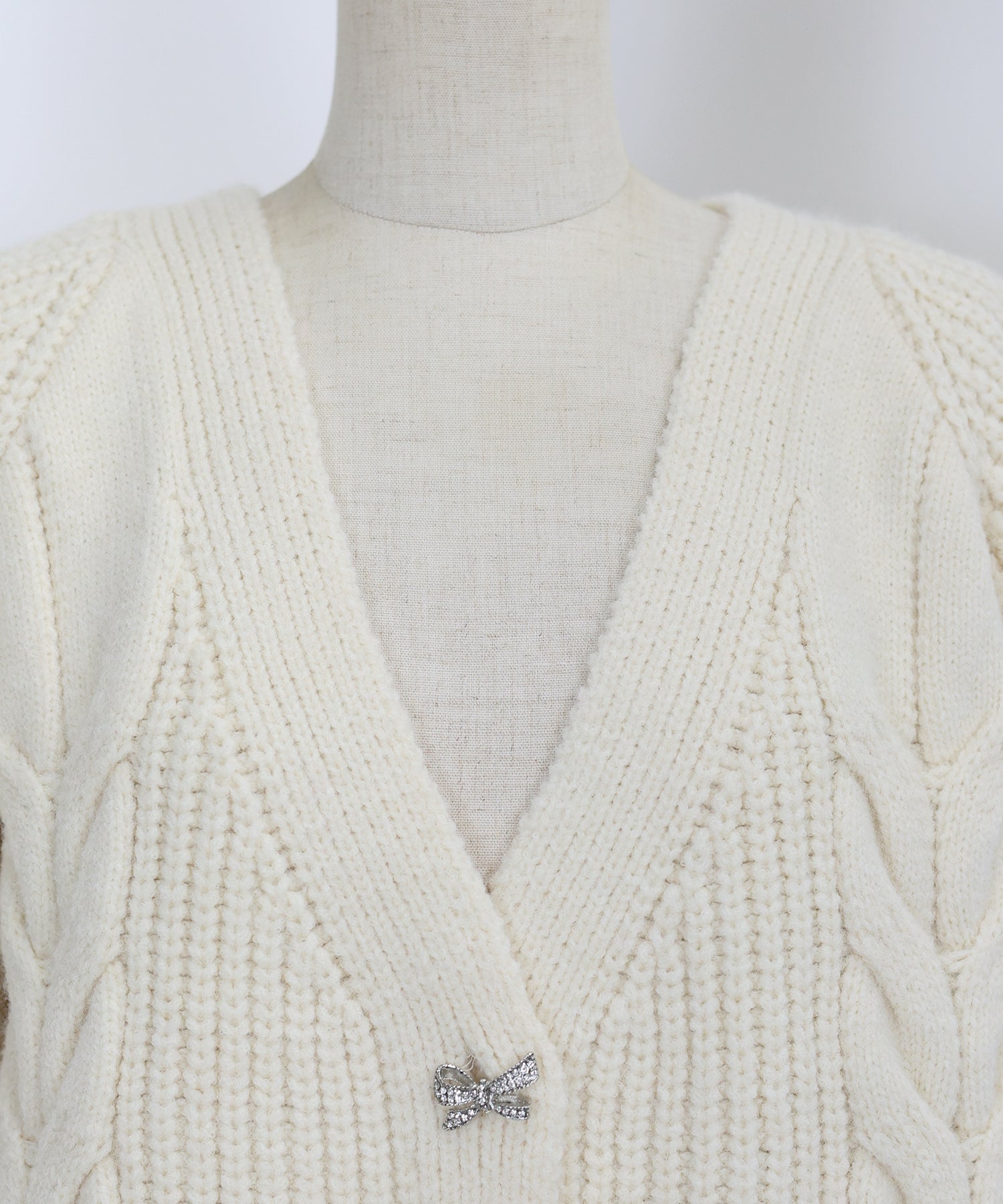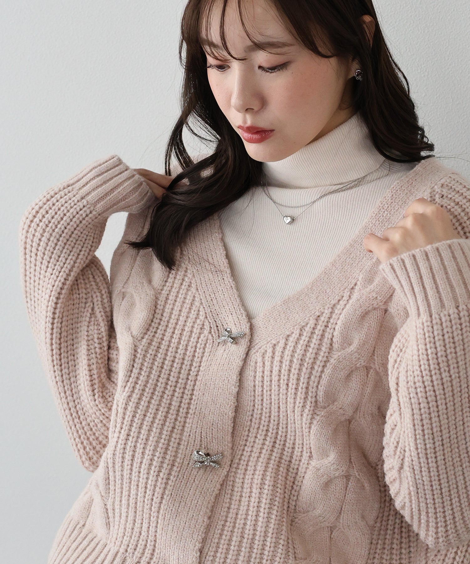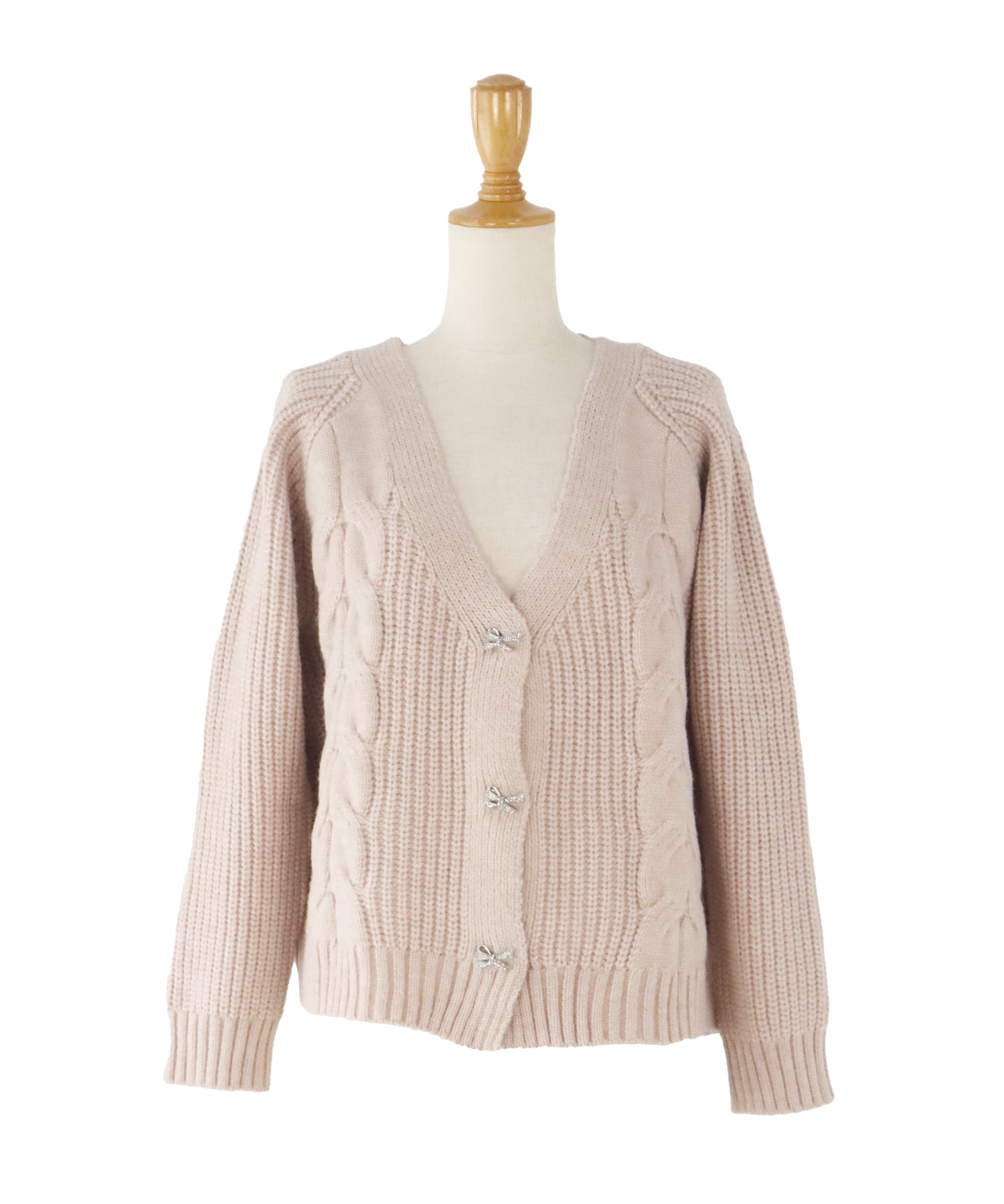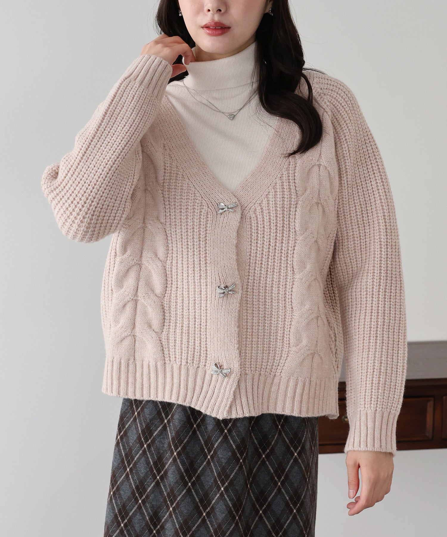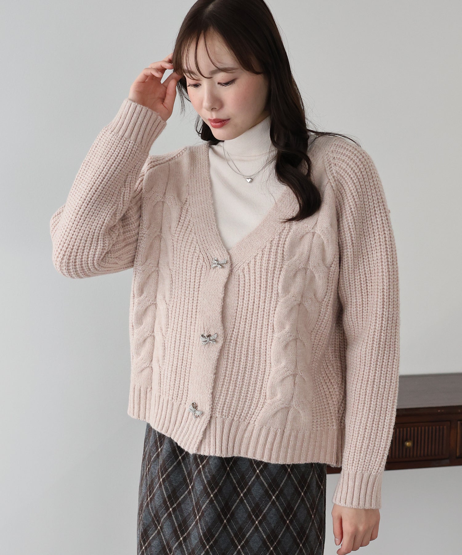 立体的なケーブル編みとビジューのリボンボタンがキュートなニットカーディガン。
