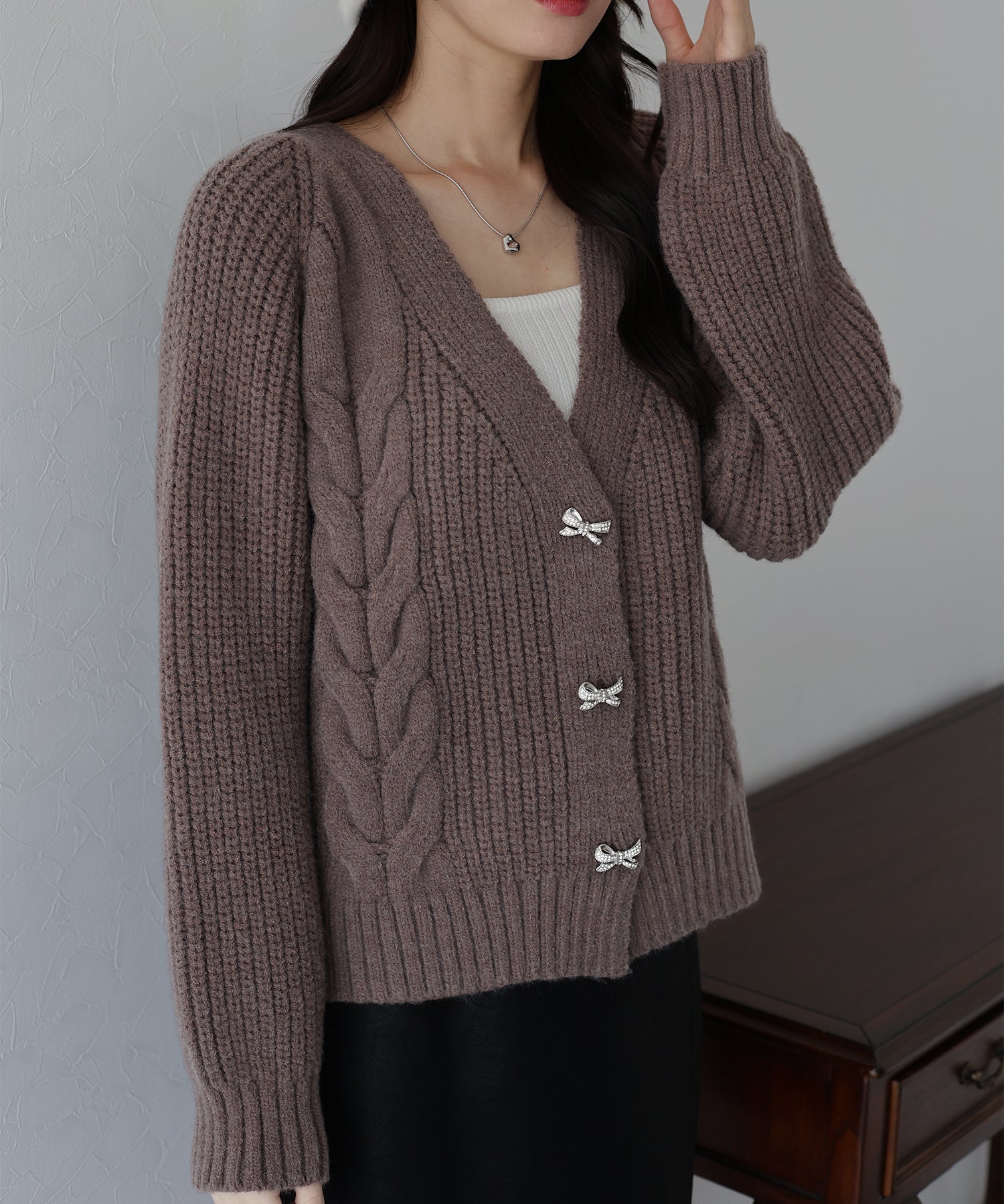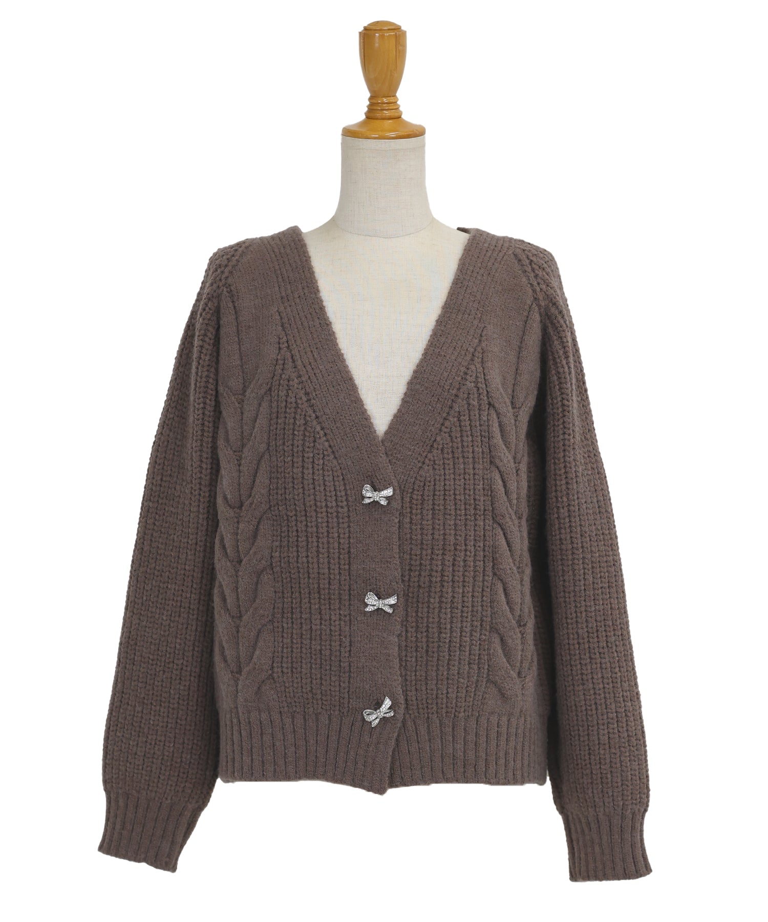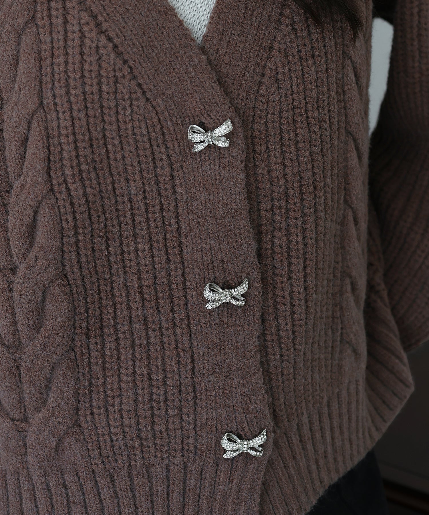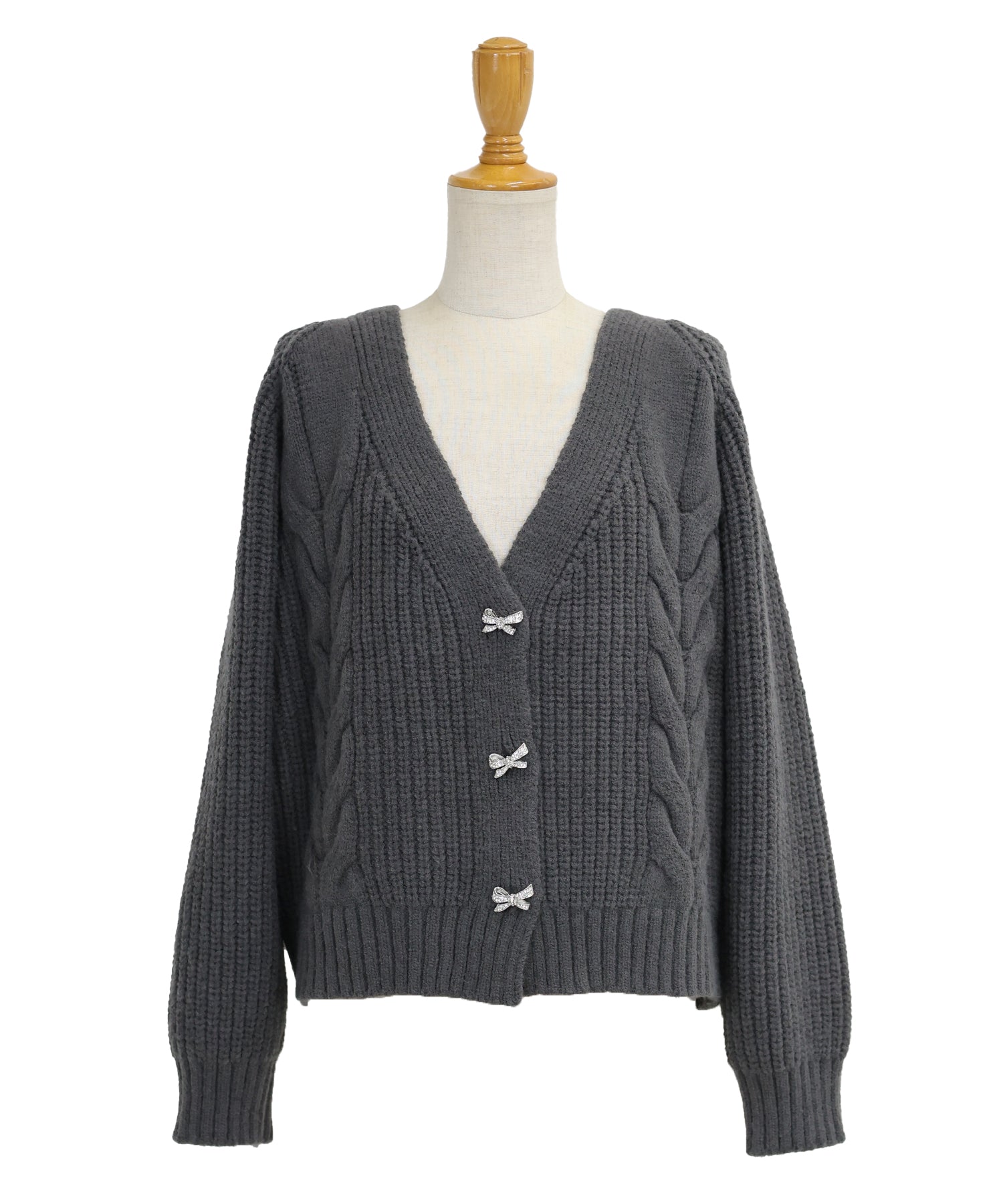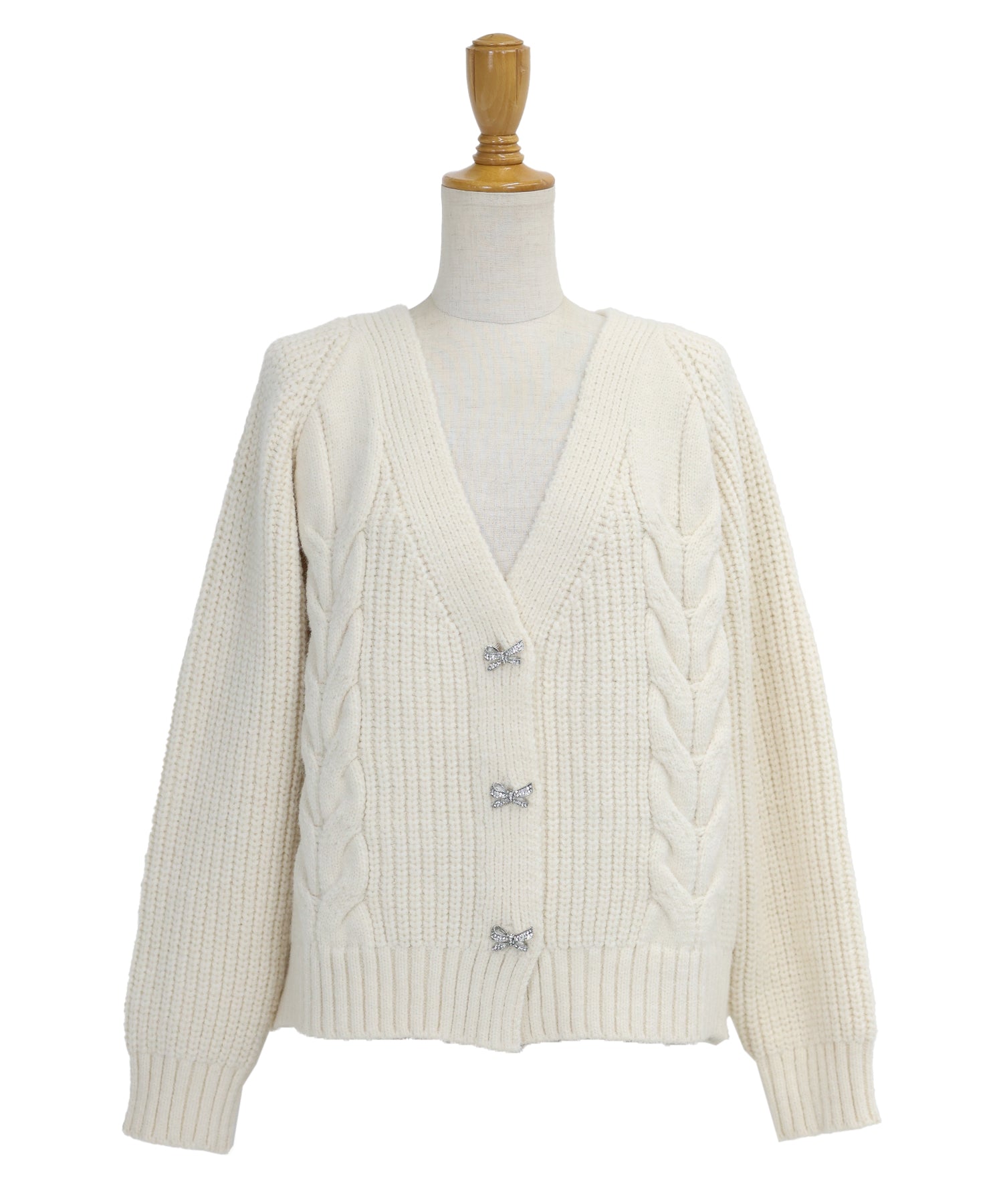 立体的なケーブル編みとビジューのリボンボタンがキュートなニットカーディガン。