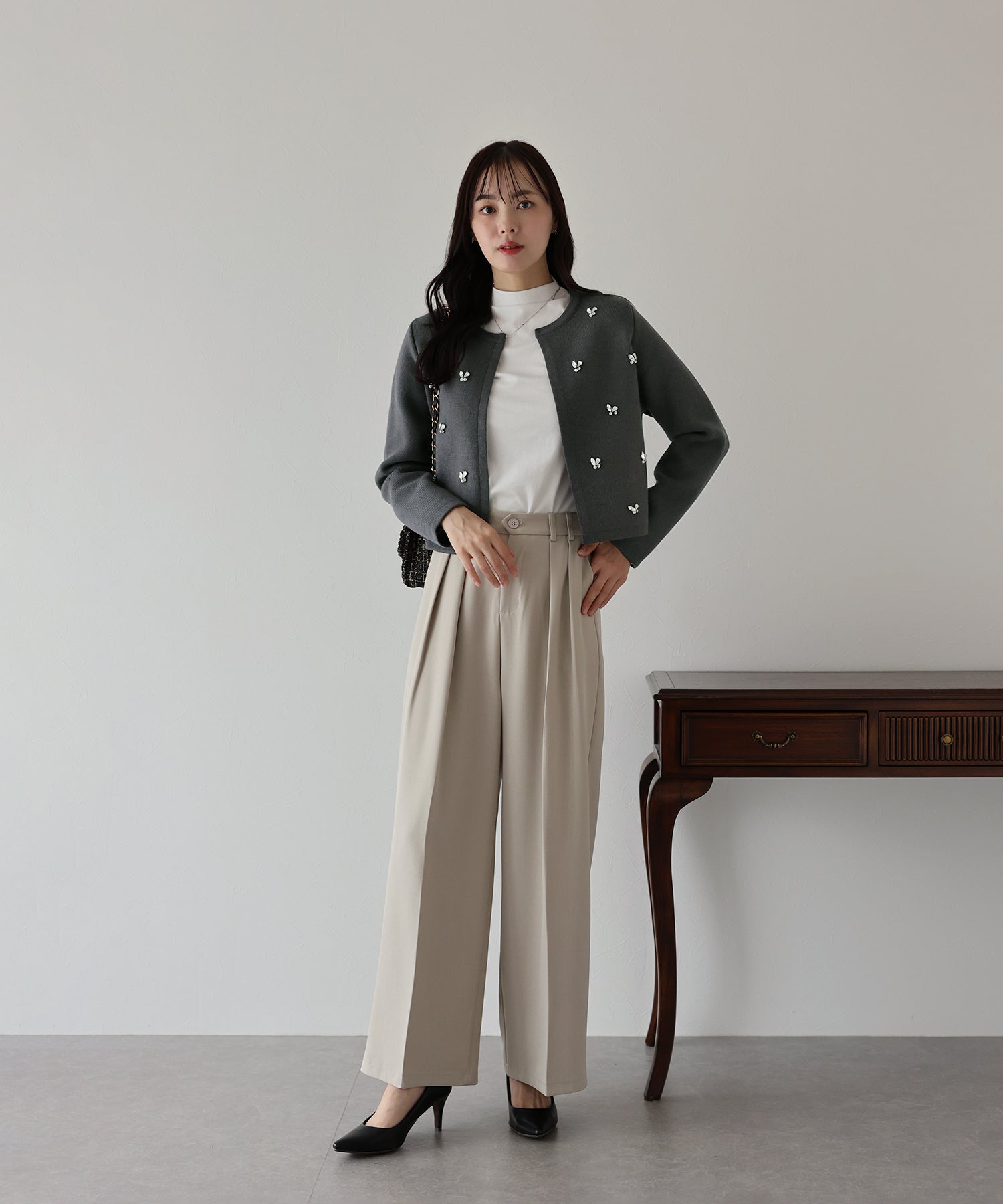 ワンピースの羽織りはもちろん、ハイウエストのデニムやパンツと合わせてカジュアルにも、