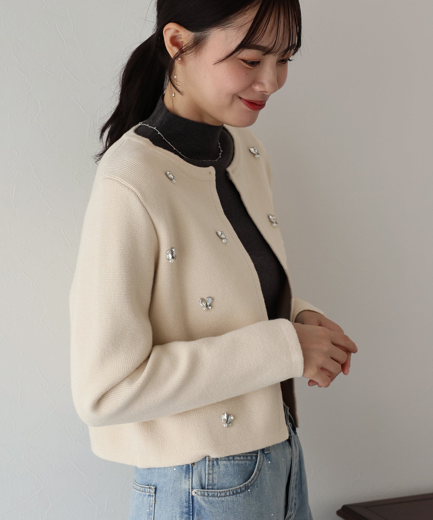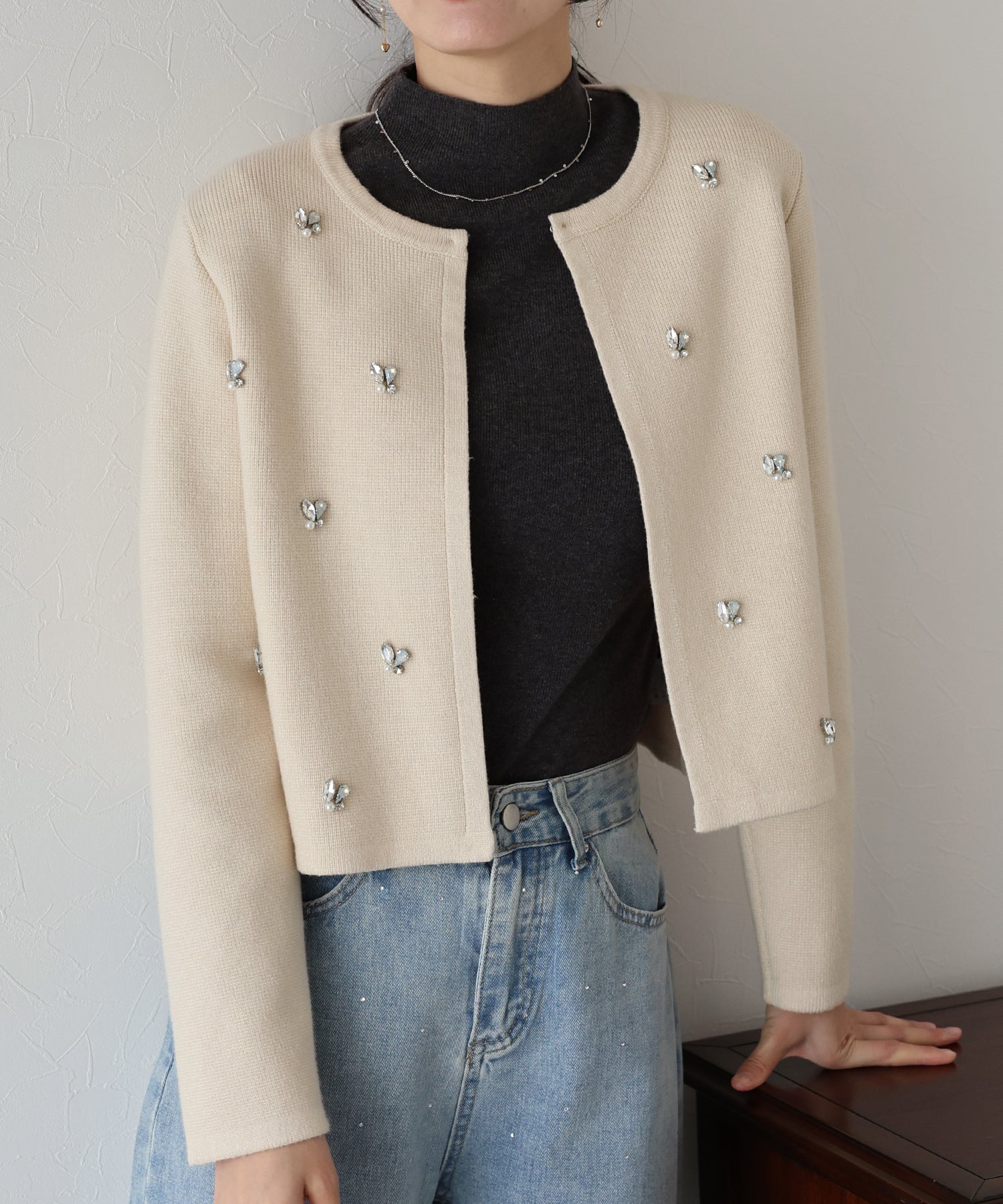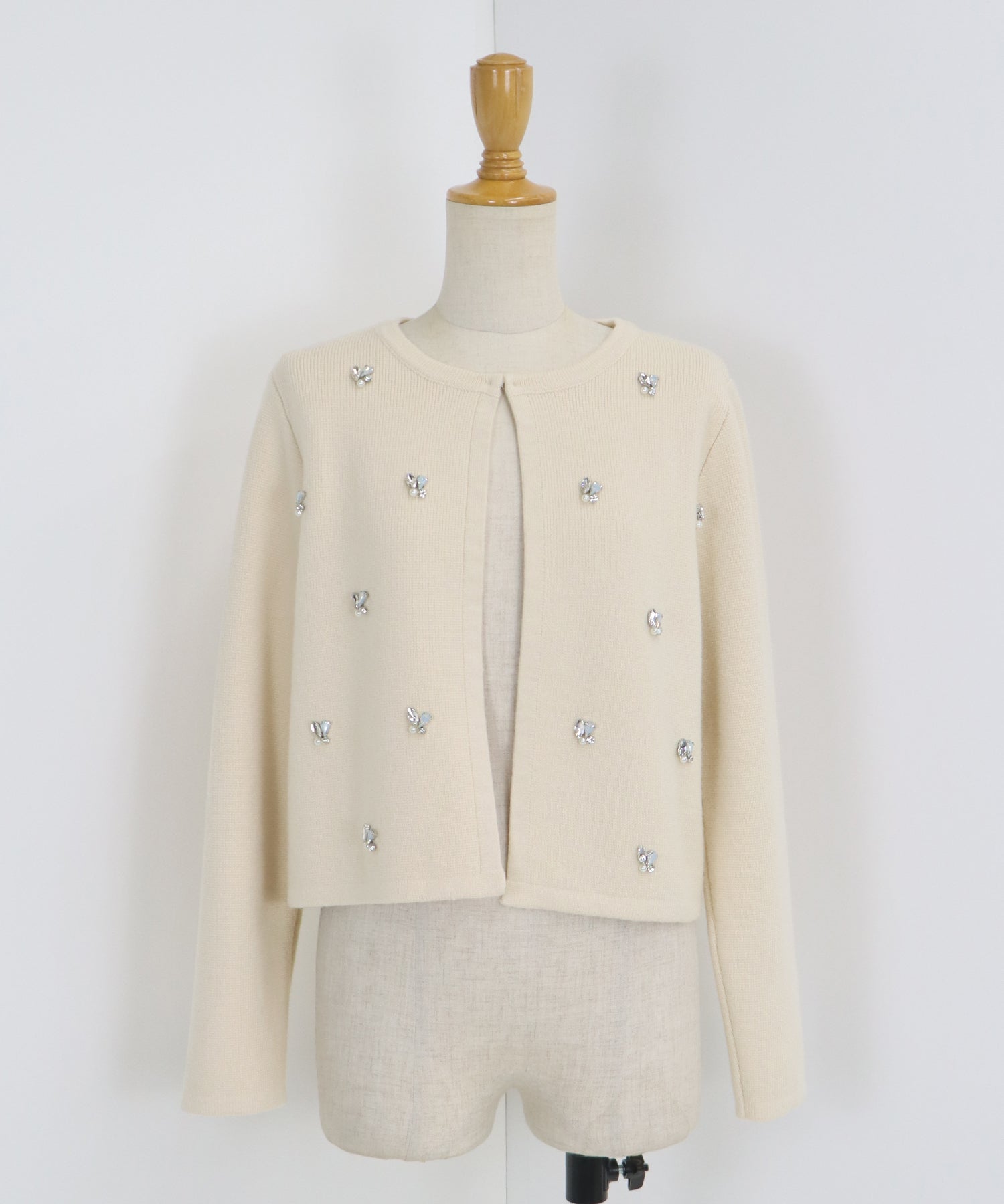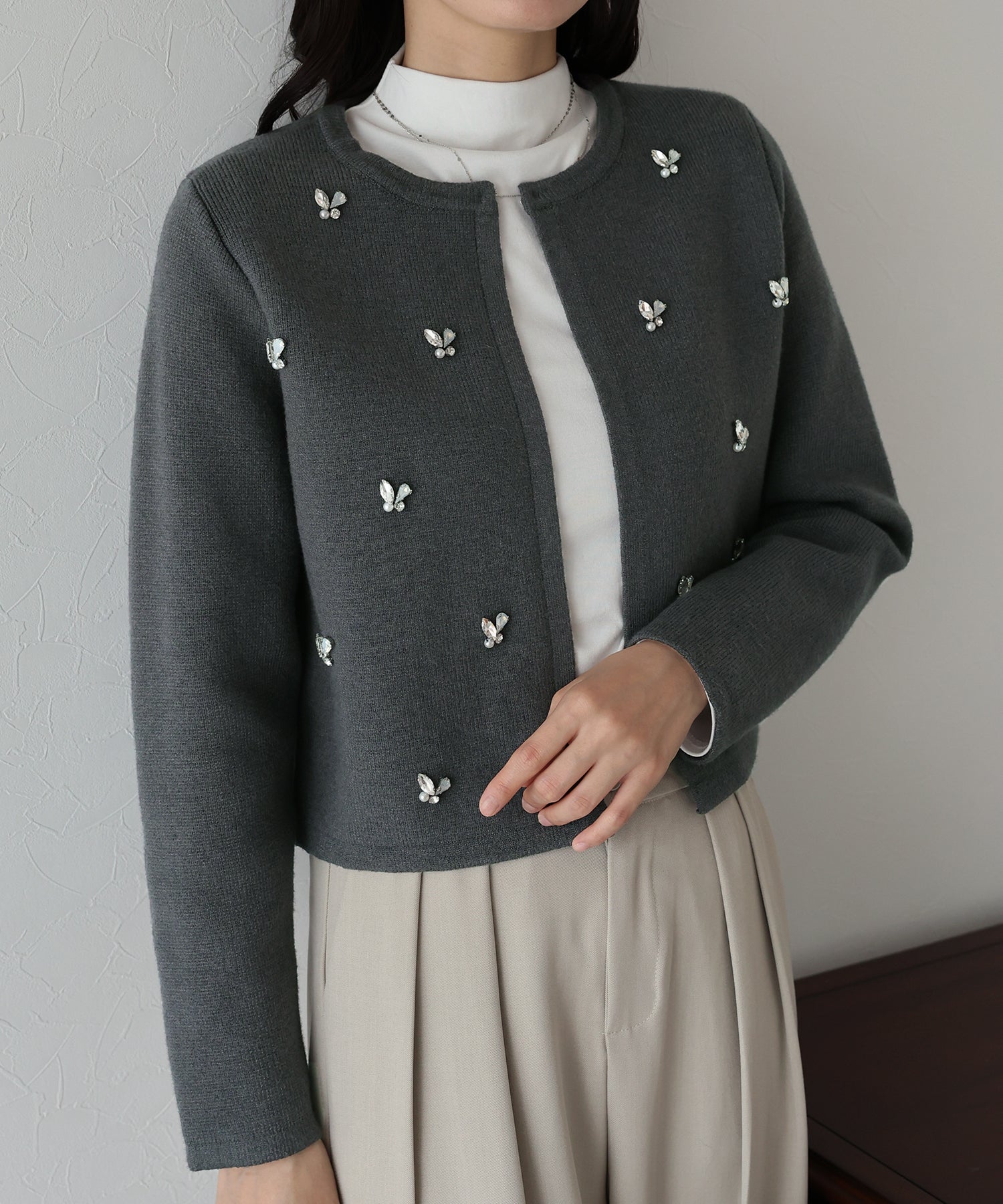 ビジューノーカラーニットジャケット