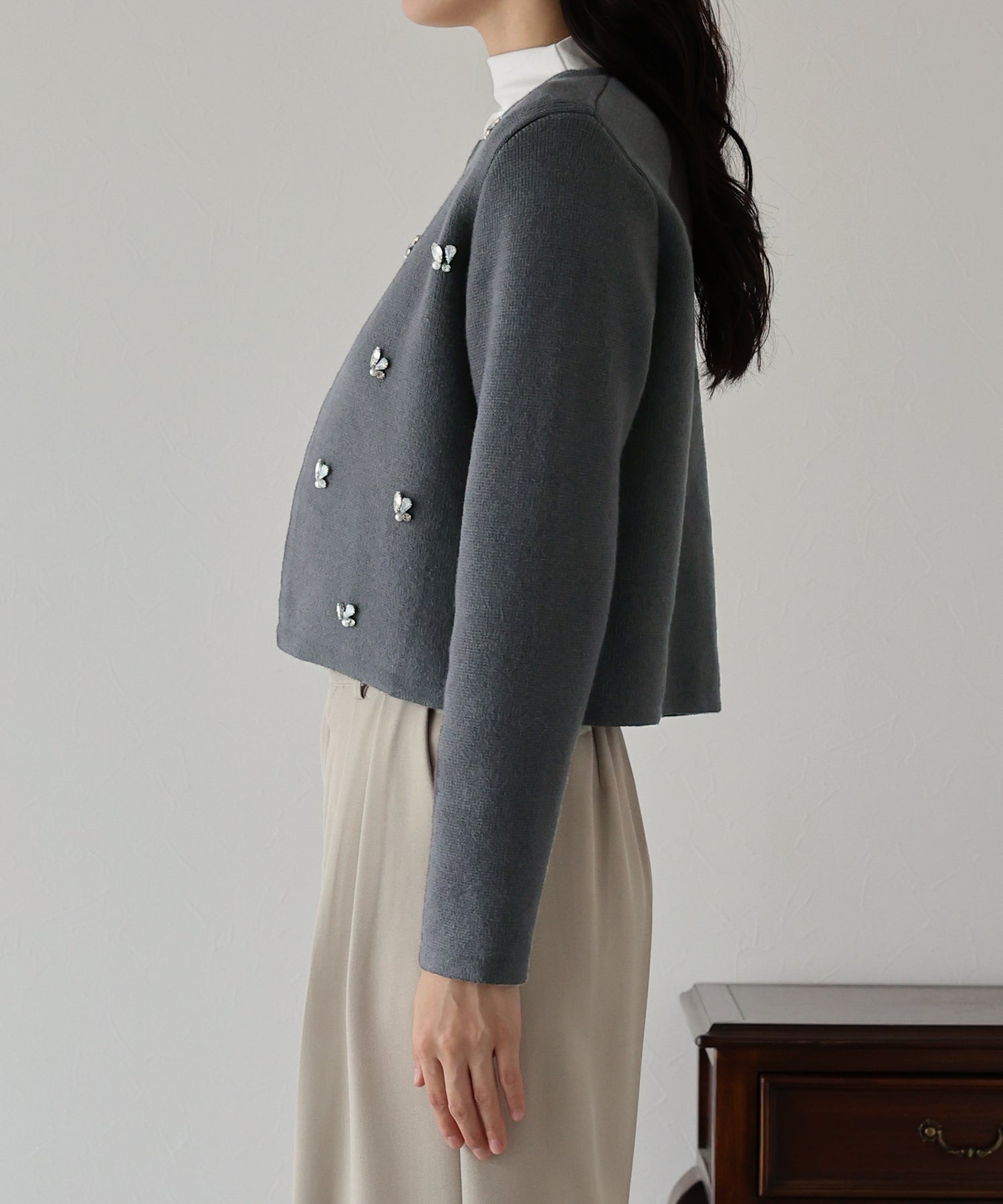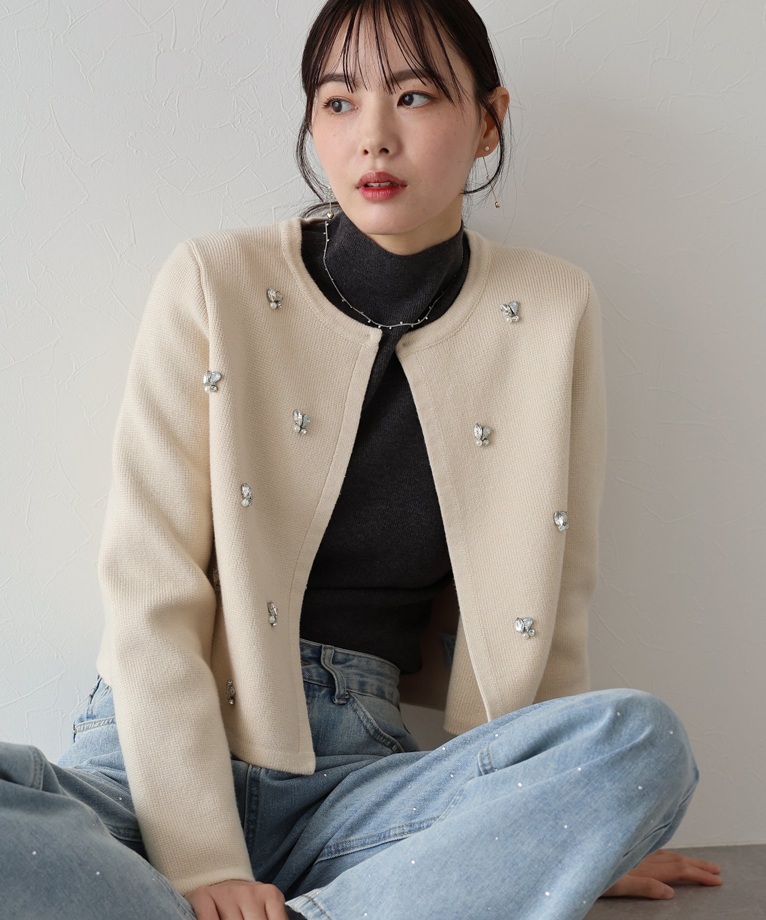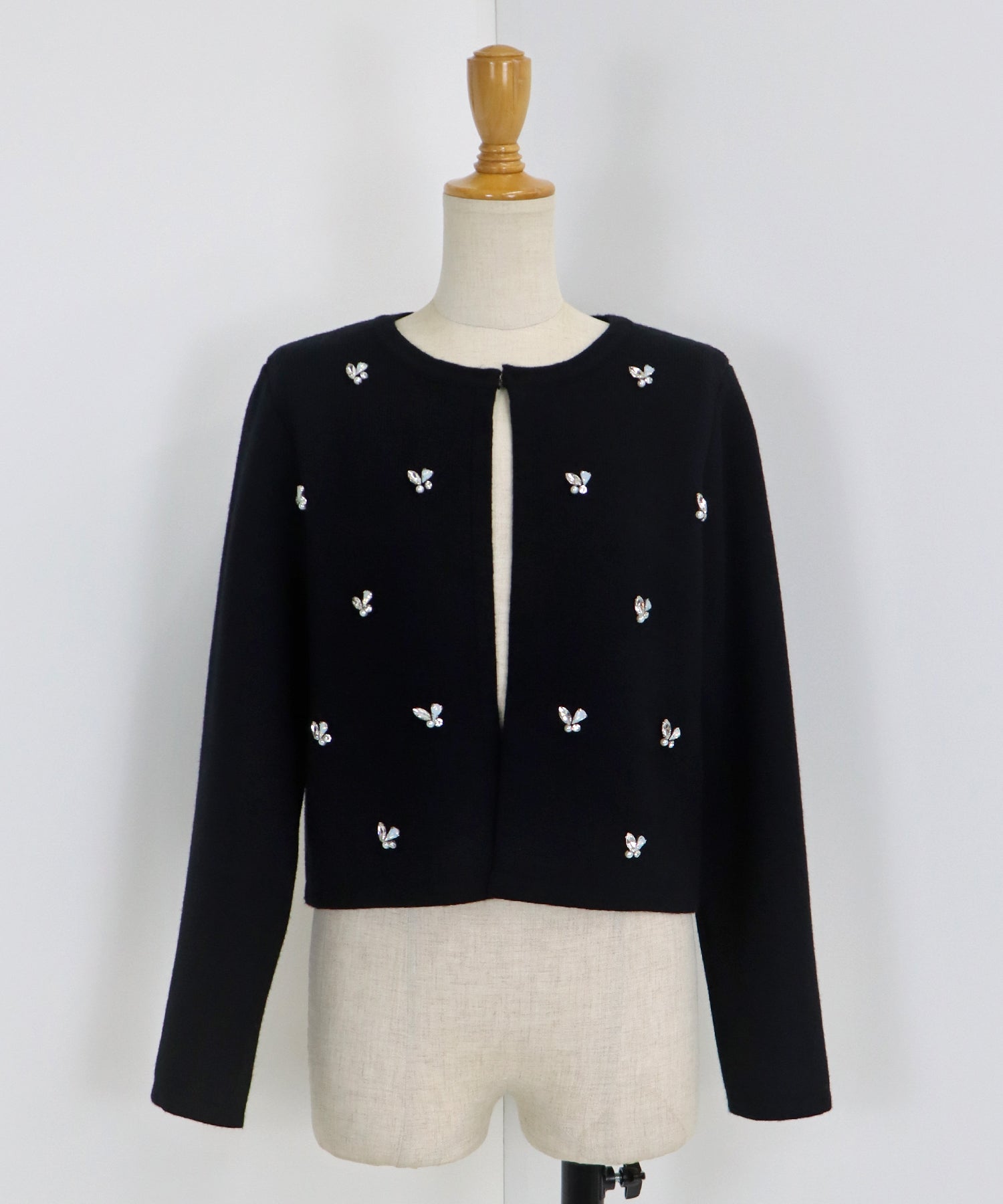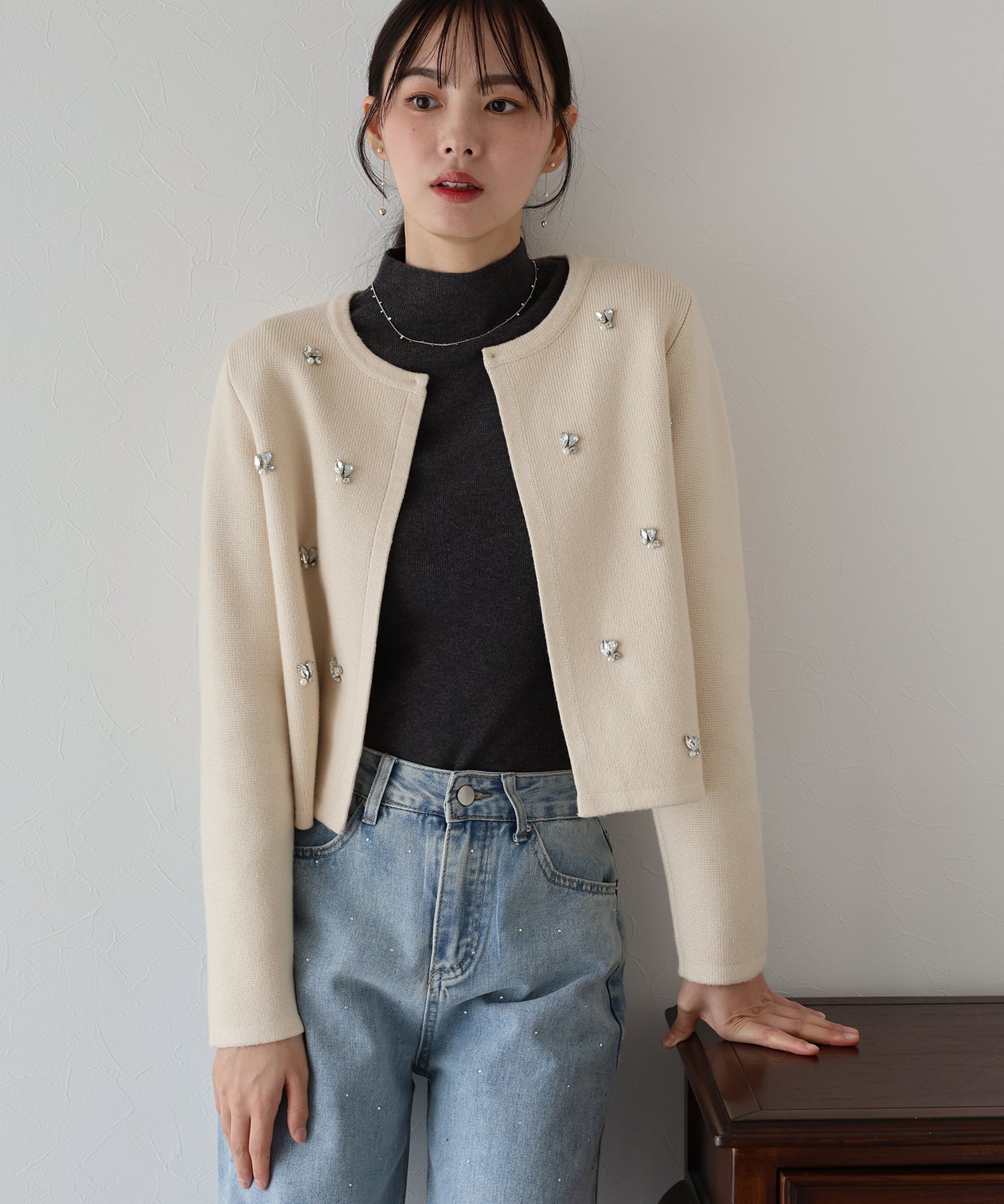 ビジューノーカラーニットジャケット