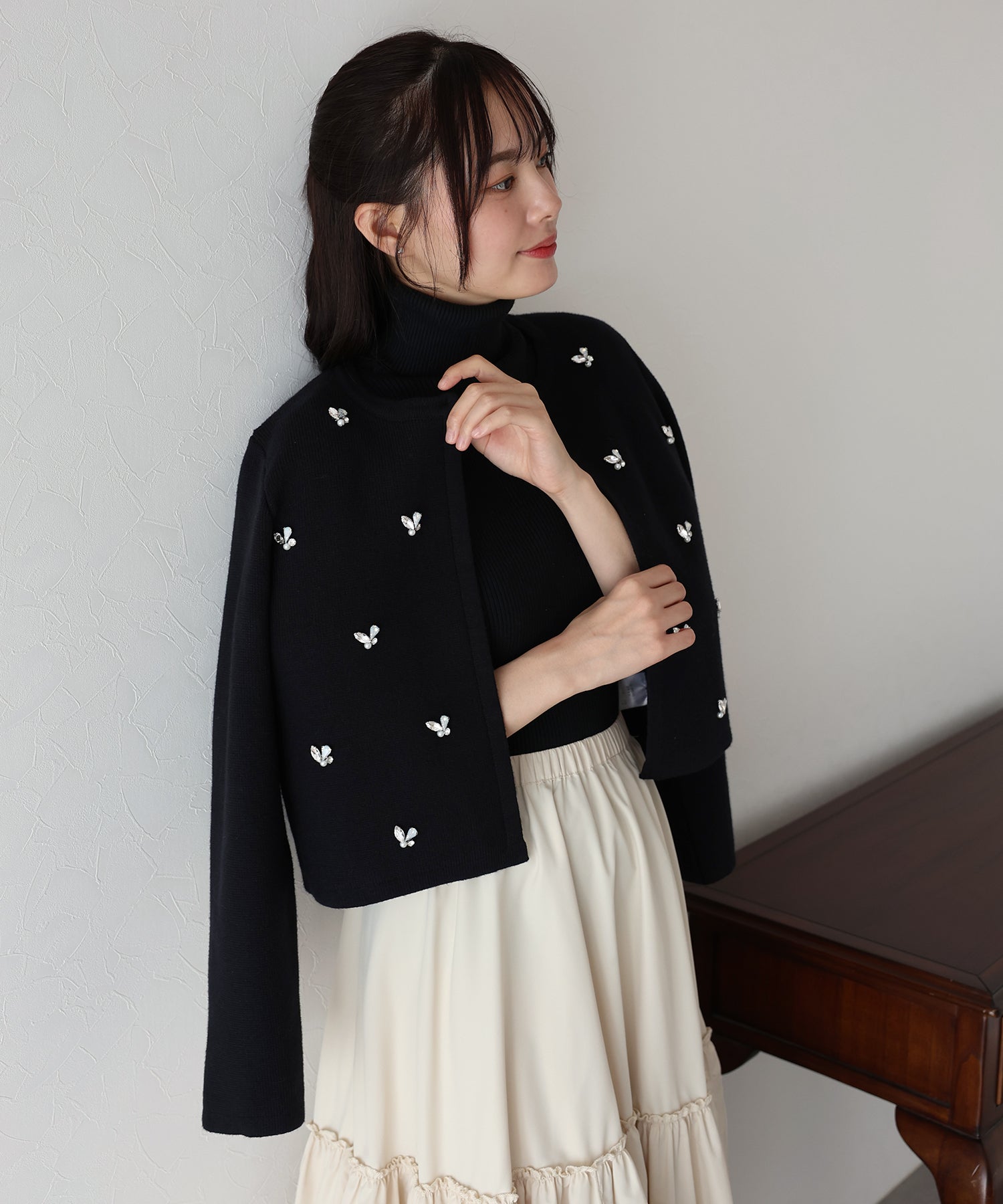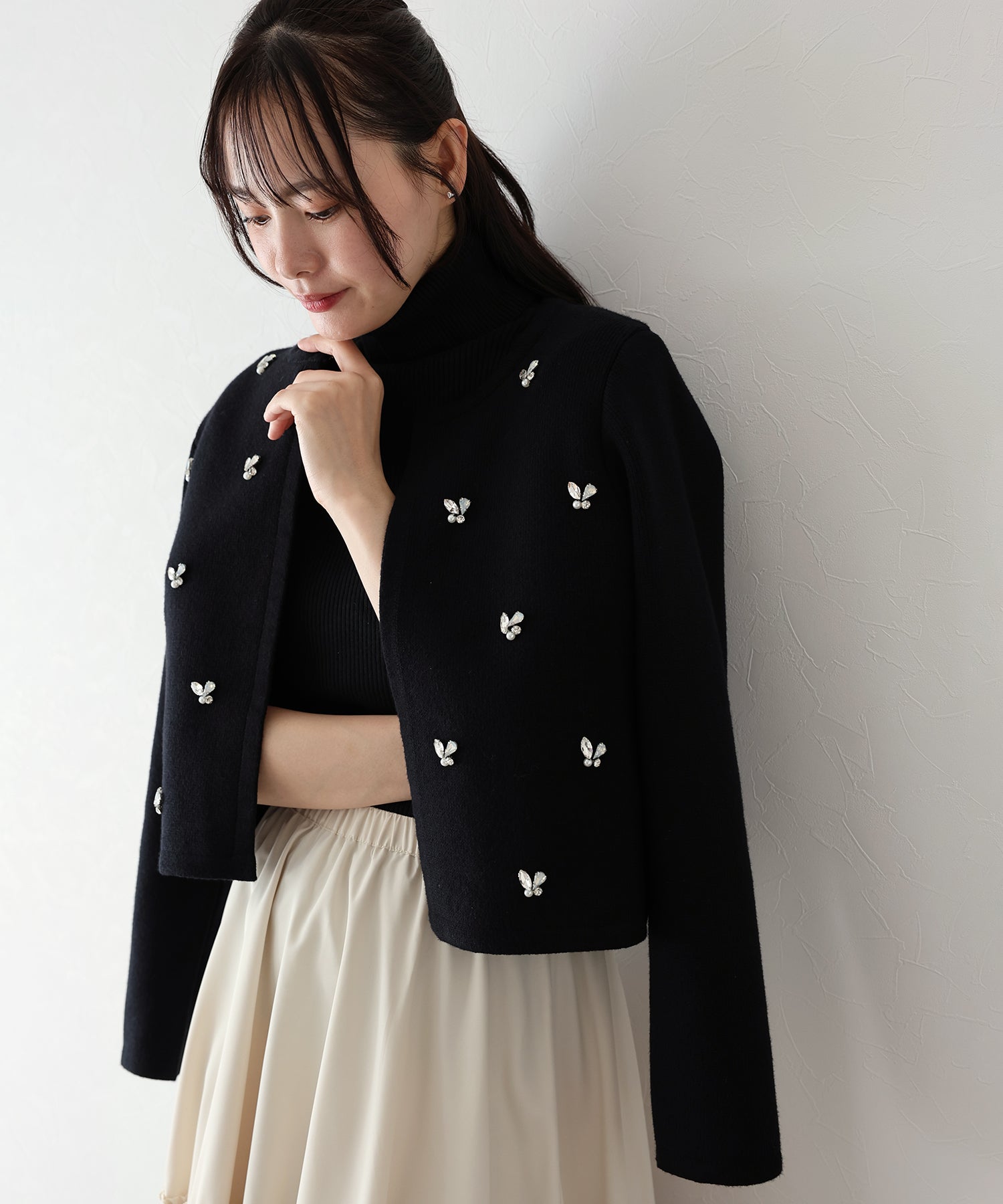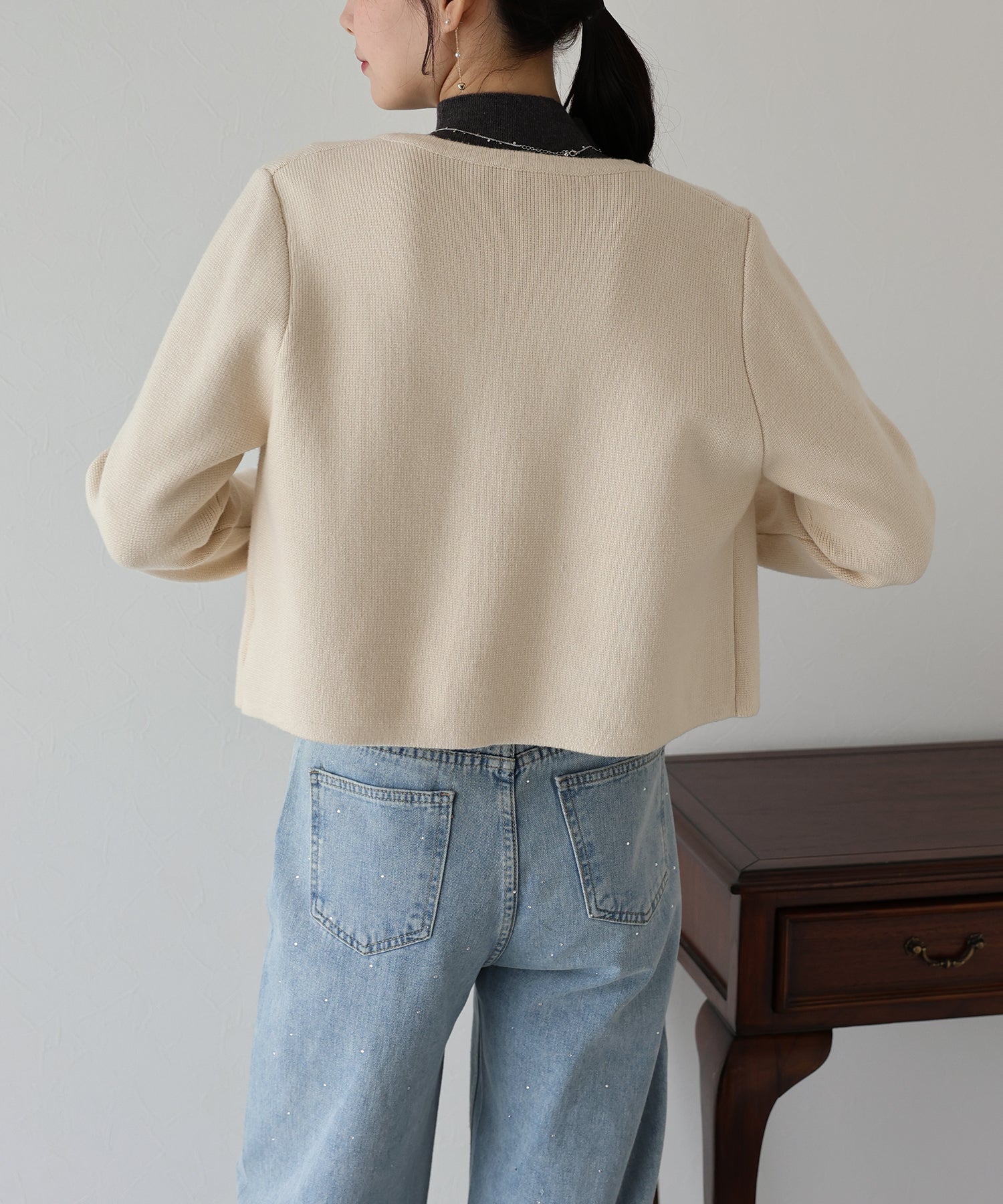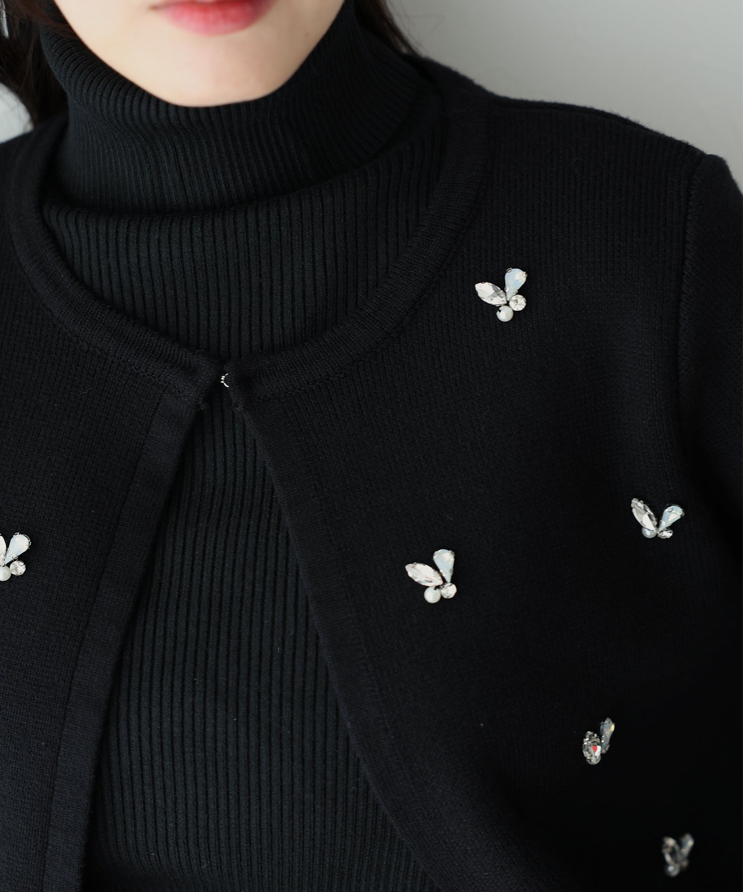 ビジューノーカラーニットジャケット