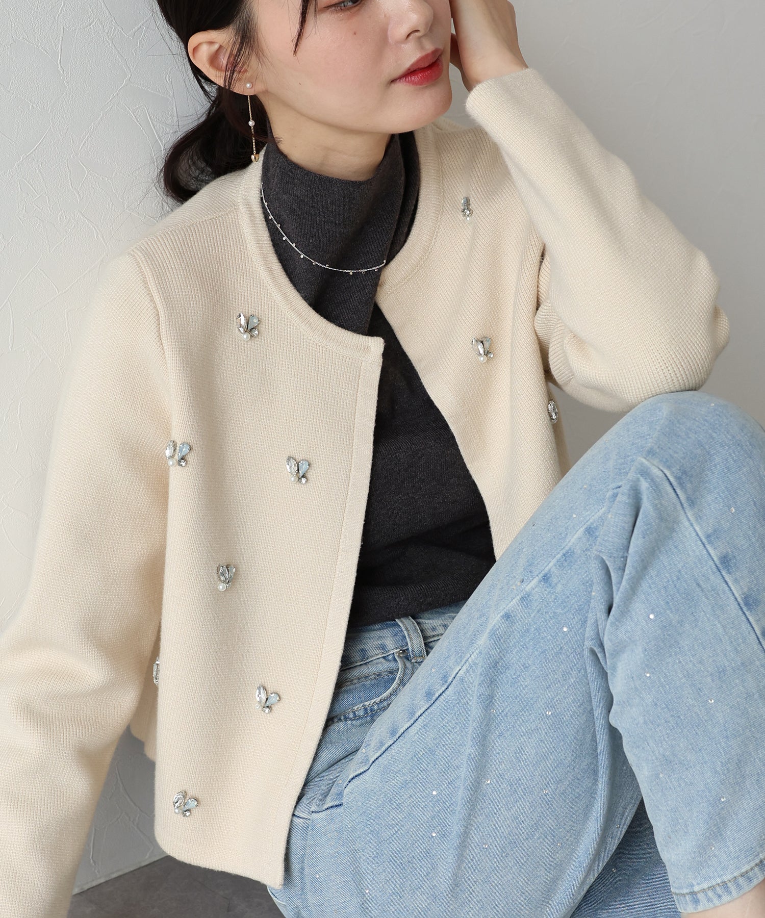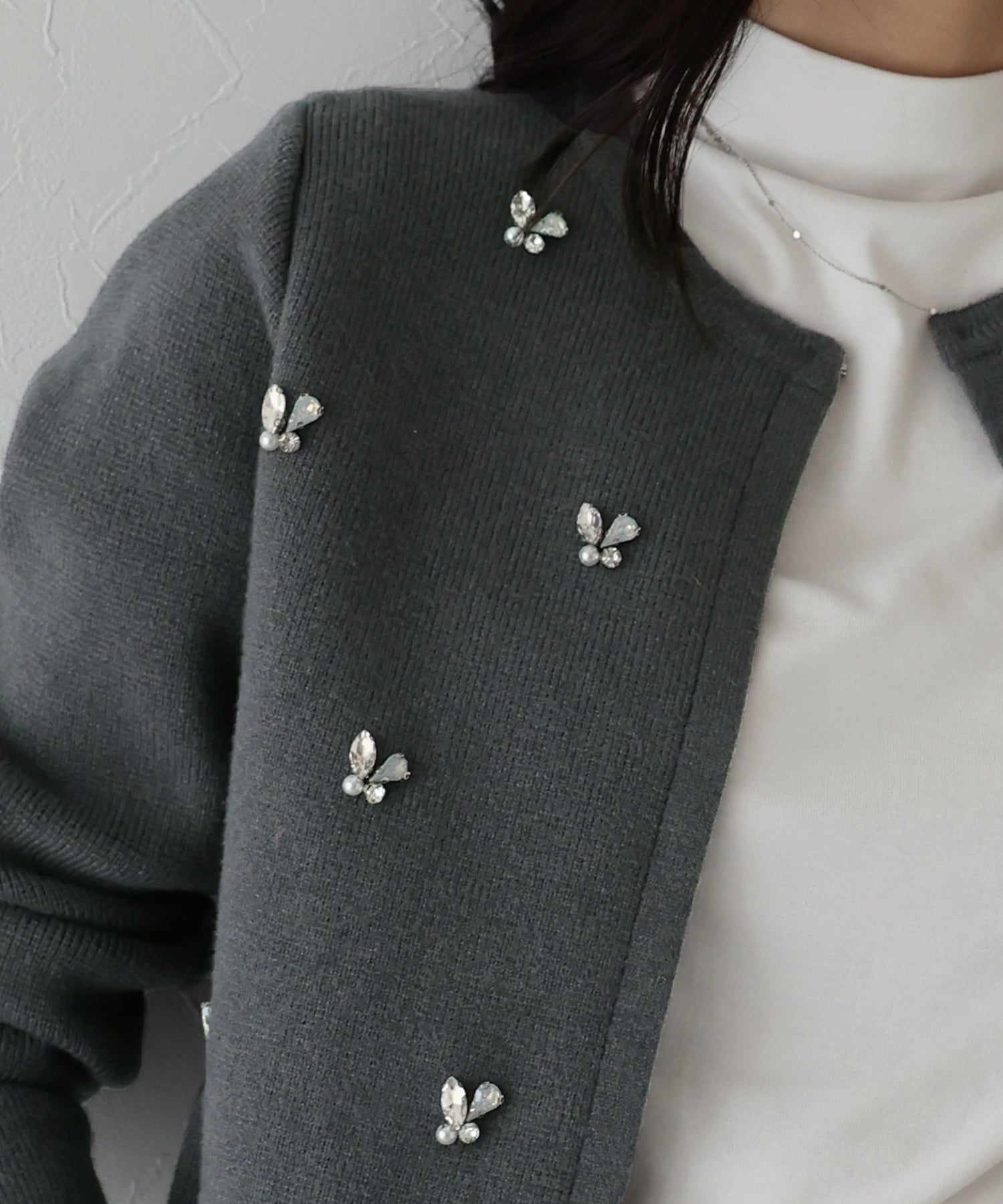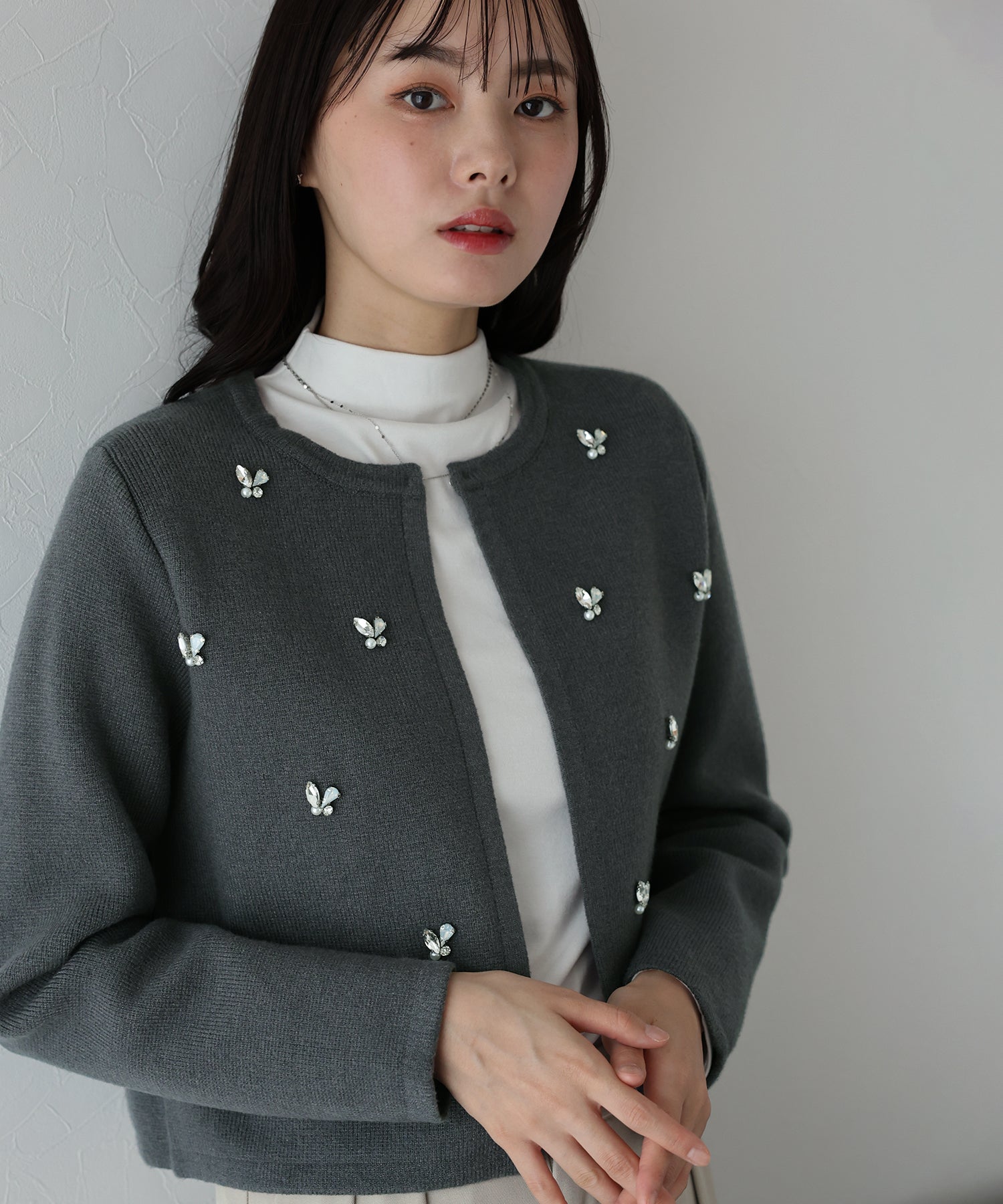 きらっと輝くビジューがアクセントになったクルーネックニットカーディガン。