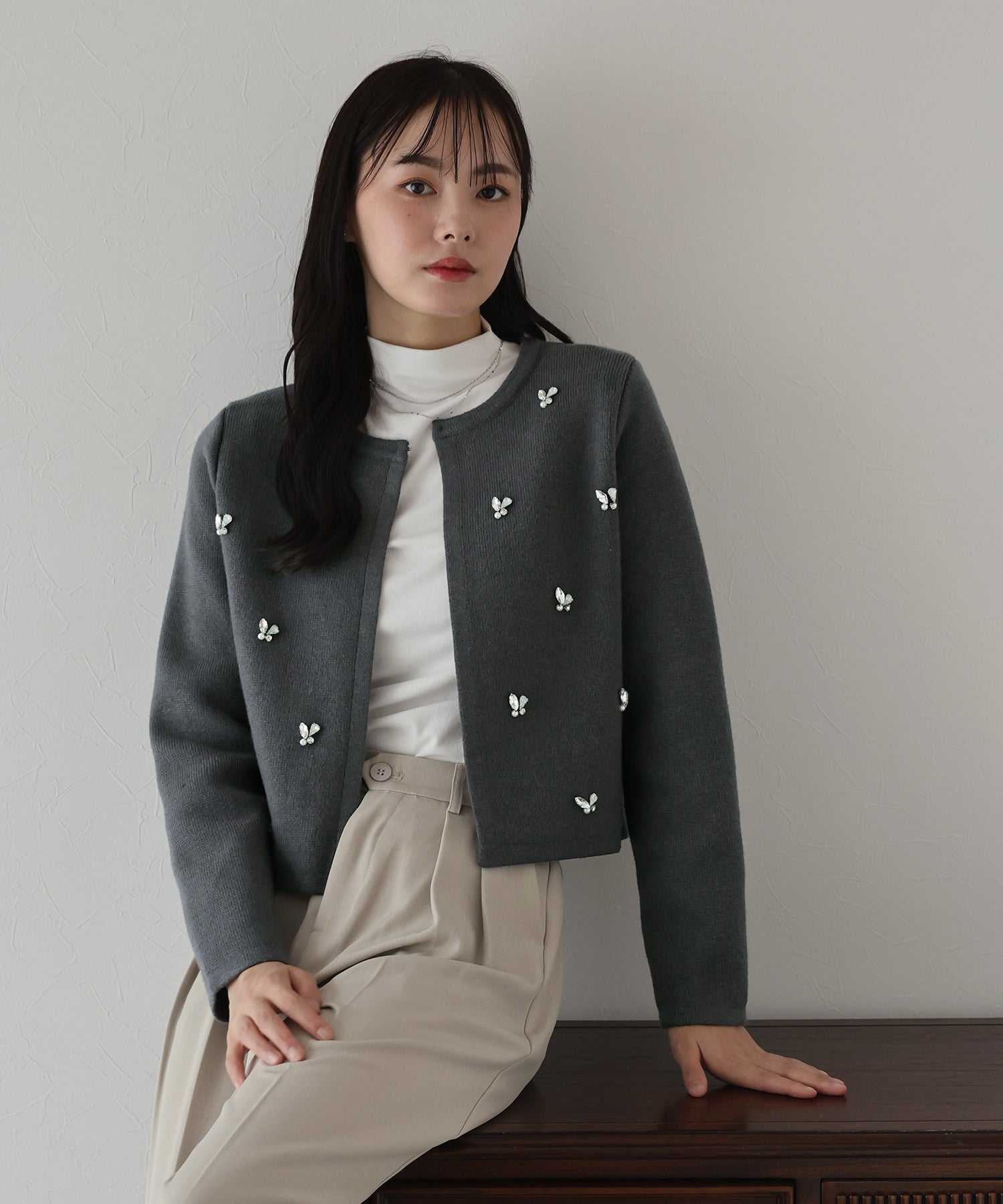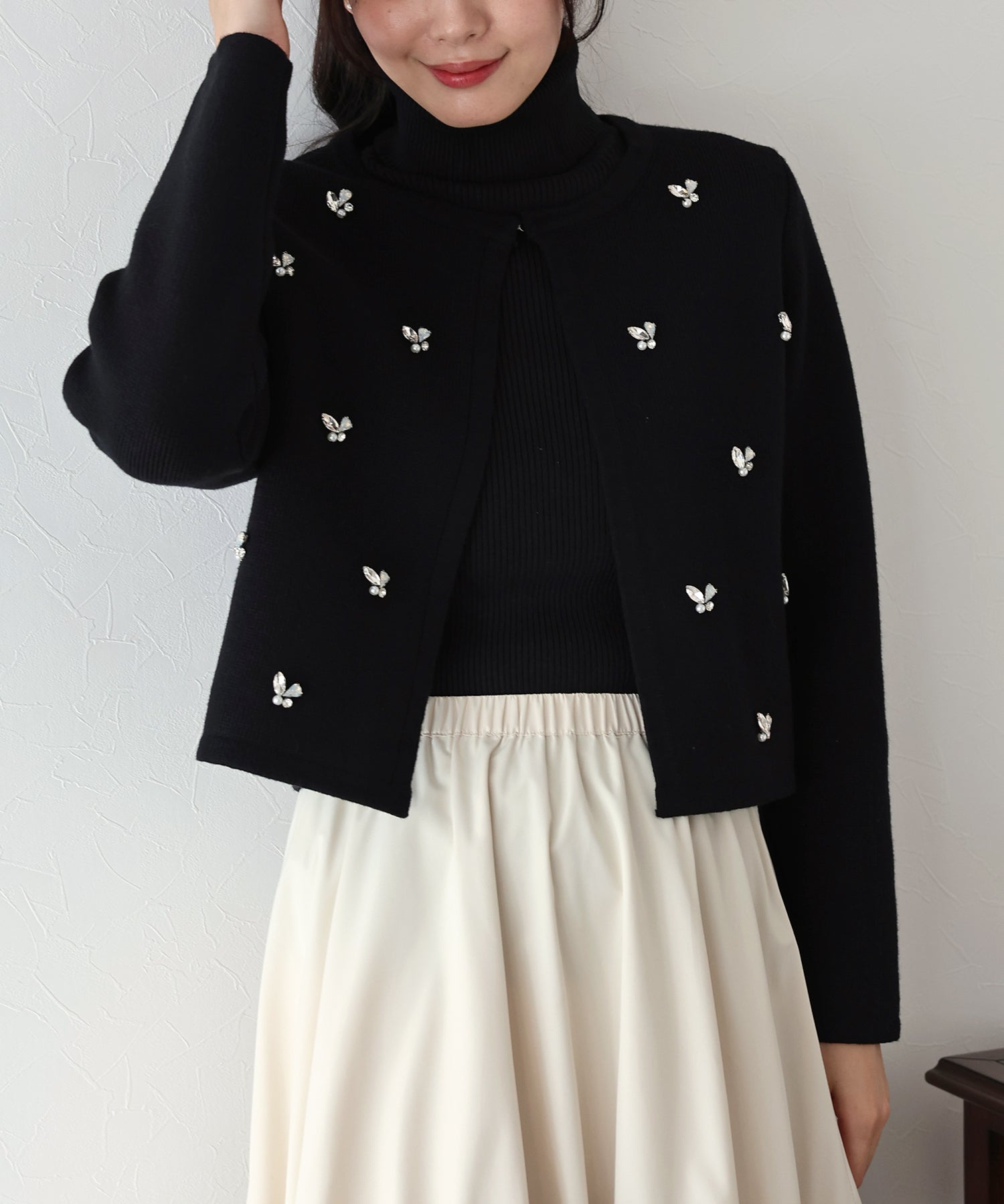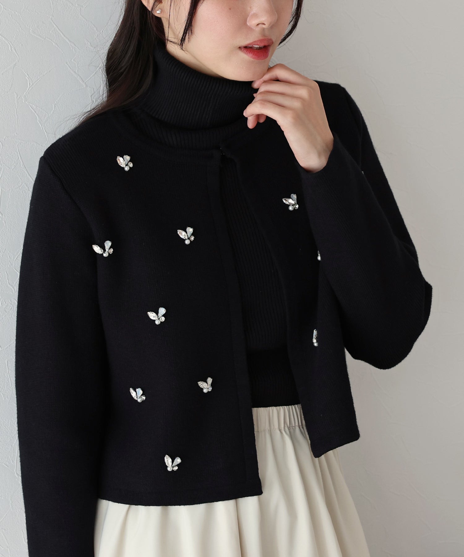 きらっと輝くビジューがアクセントになったクルーネックニットカーディガン。