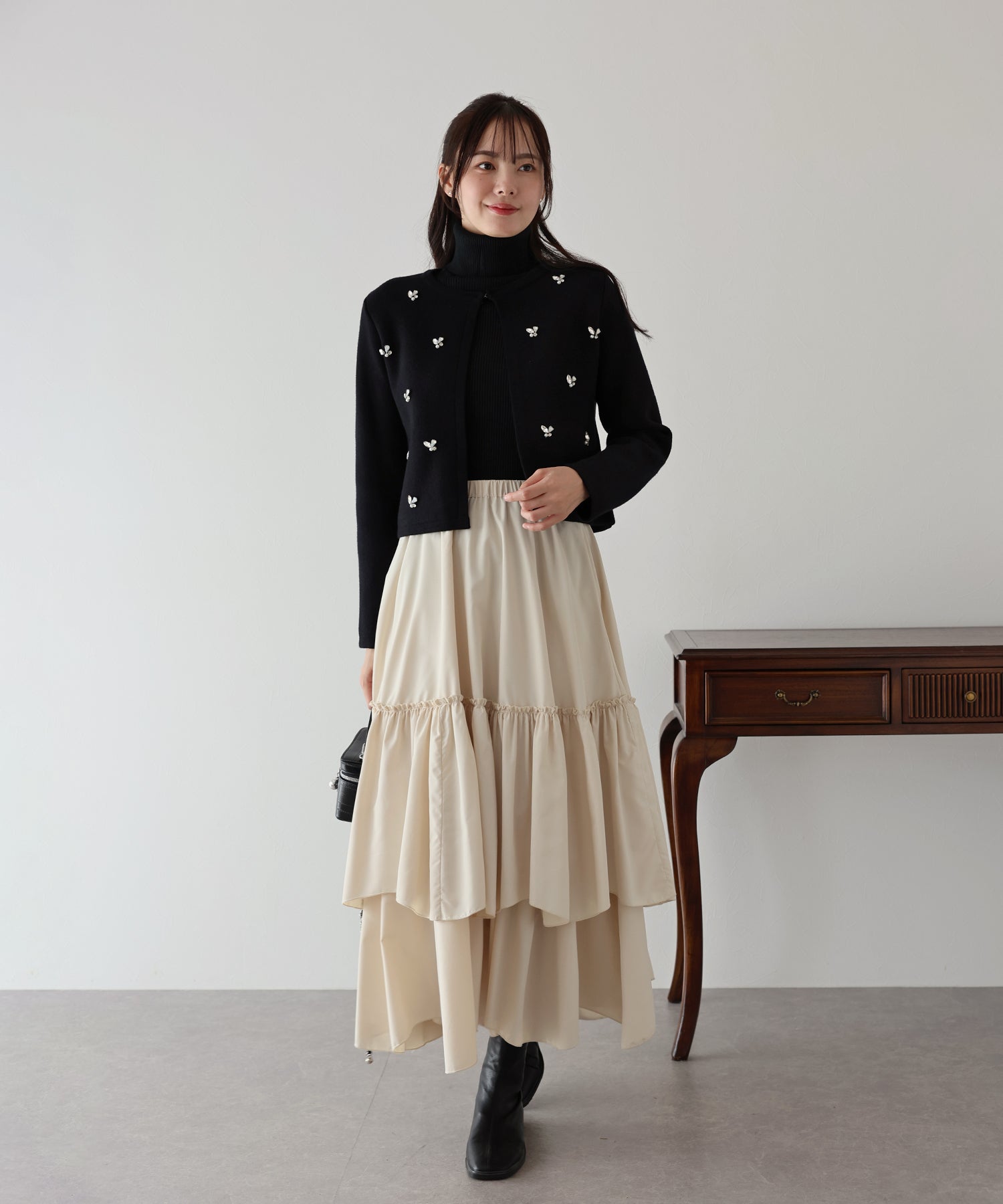 カーディガンとコートの間の羽織としてタートルネックニットをインしてもクラシカルに決まります。