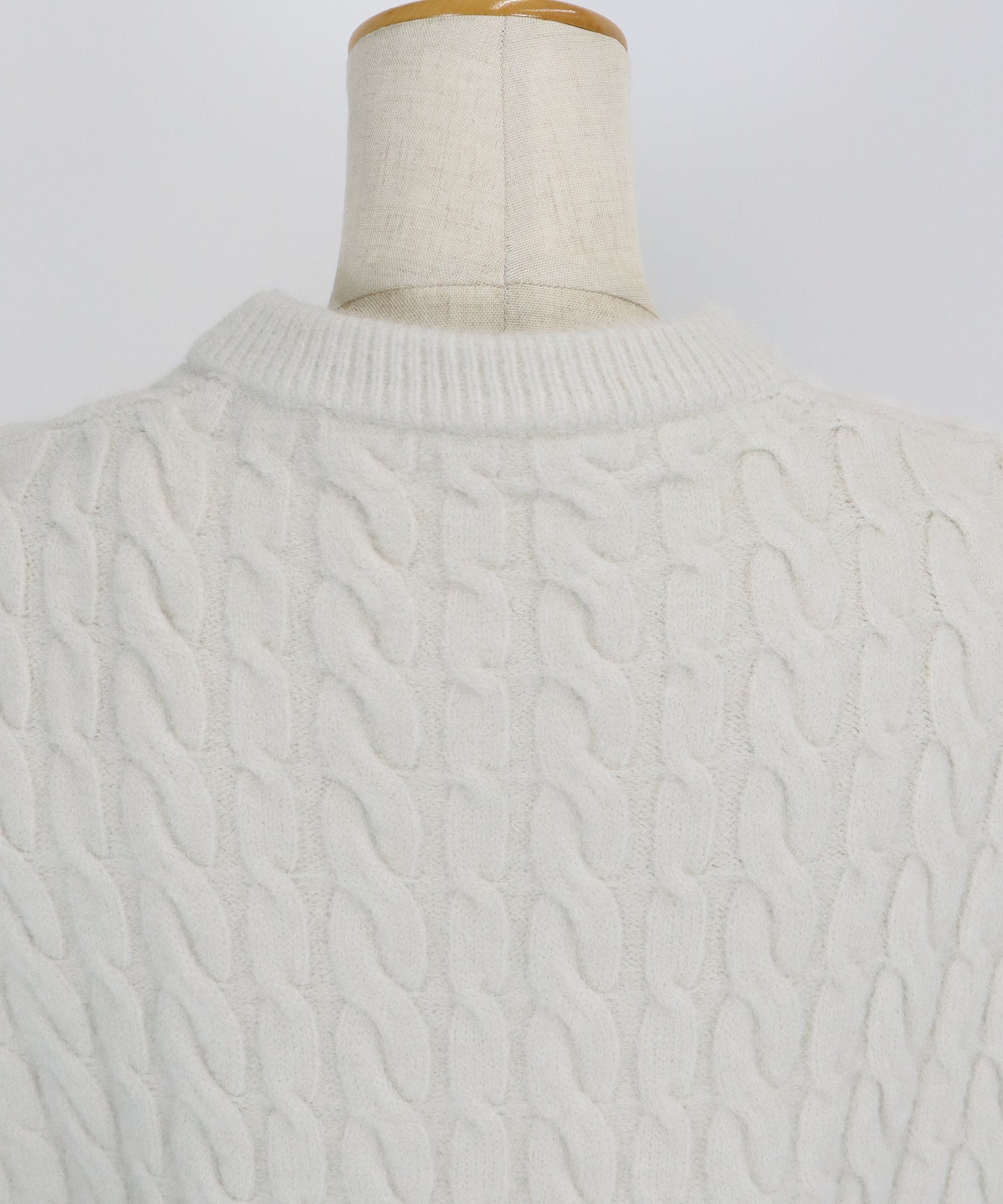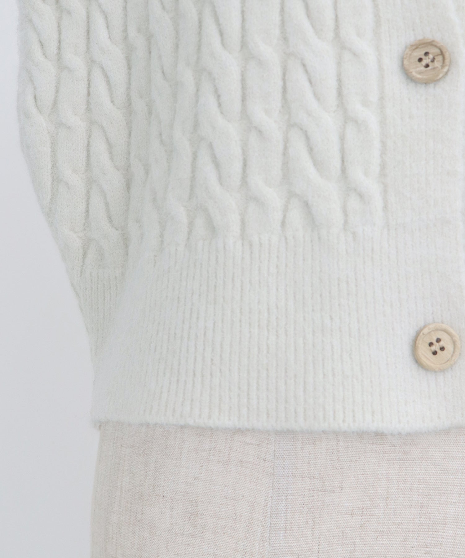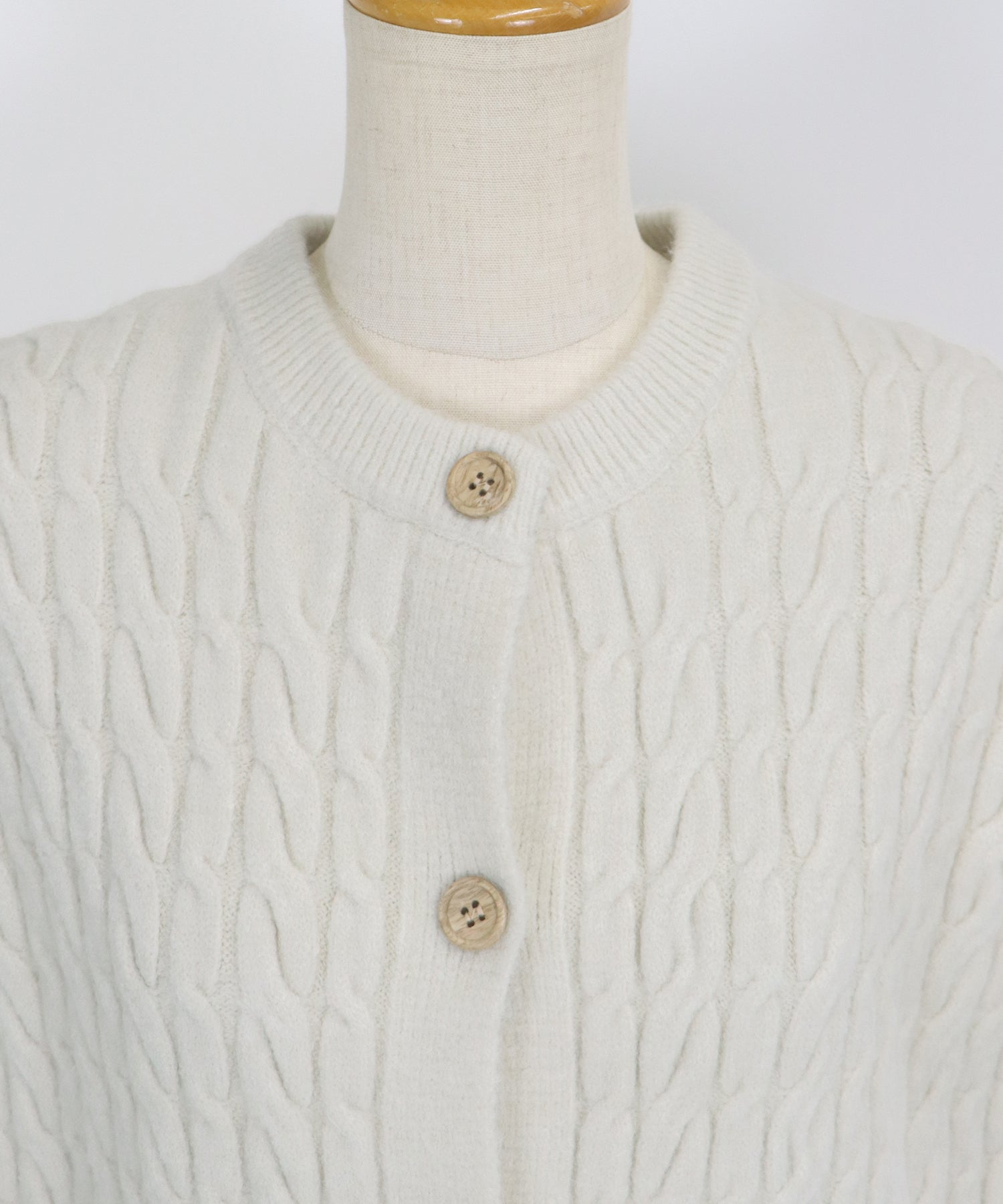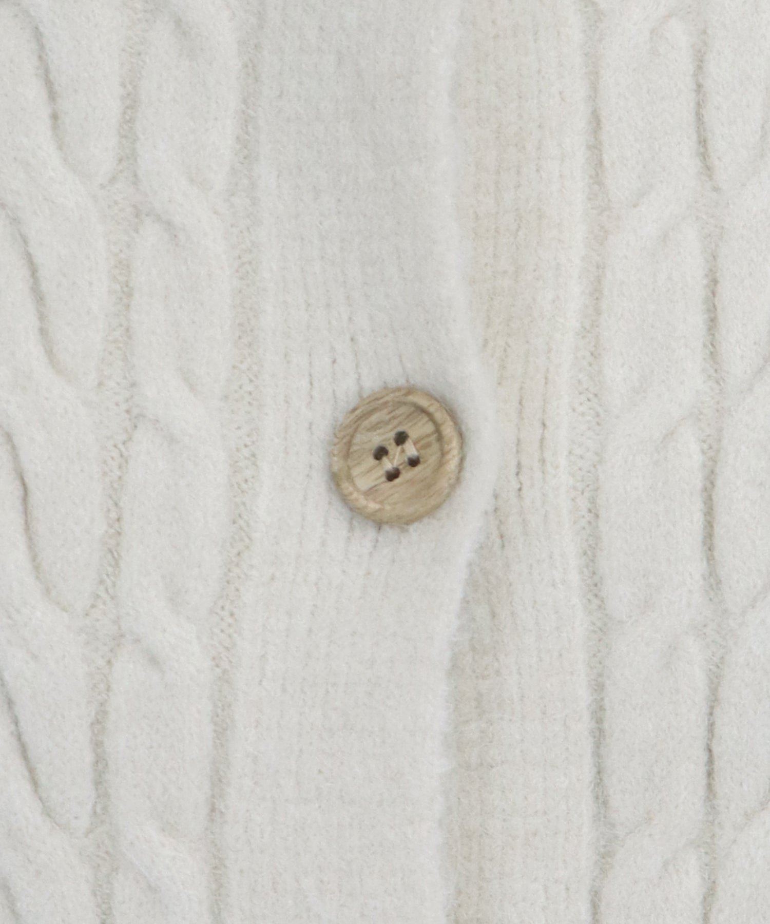 ウッドボタンと温かみのあるケーブル編みで季節感を演出し、