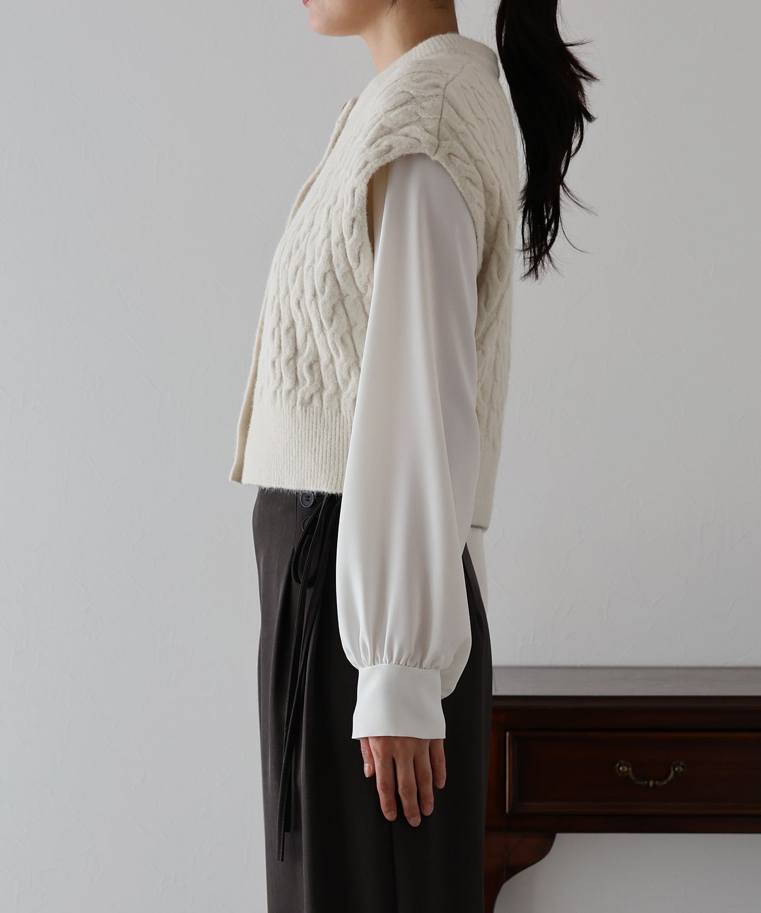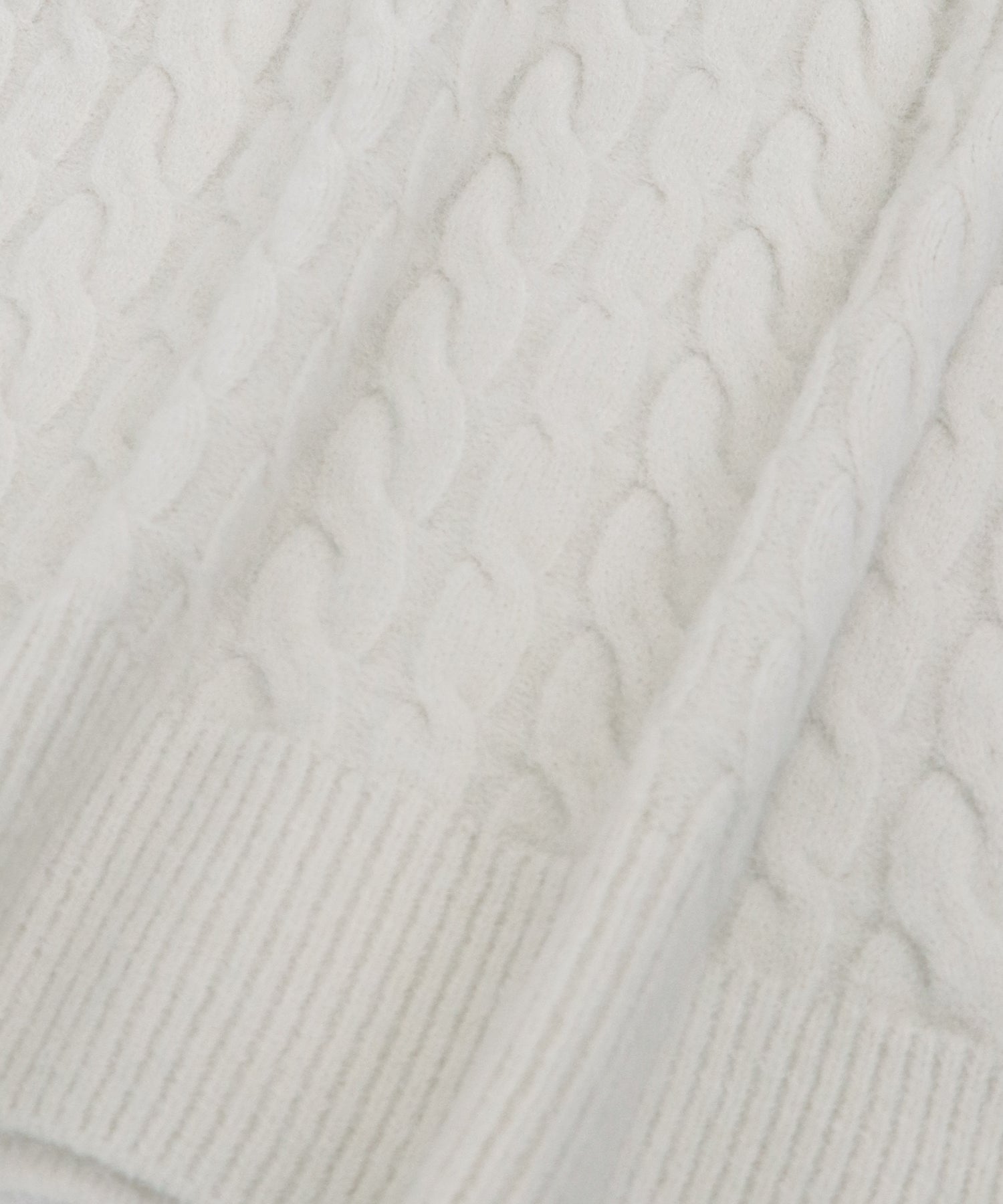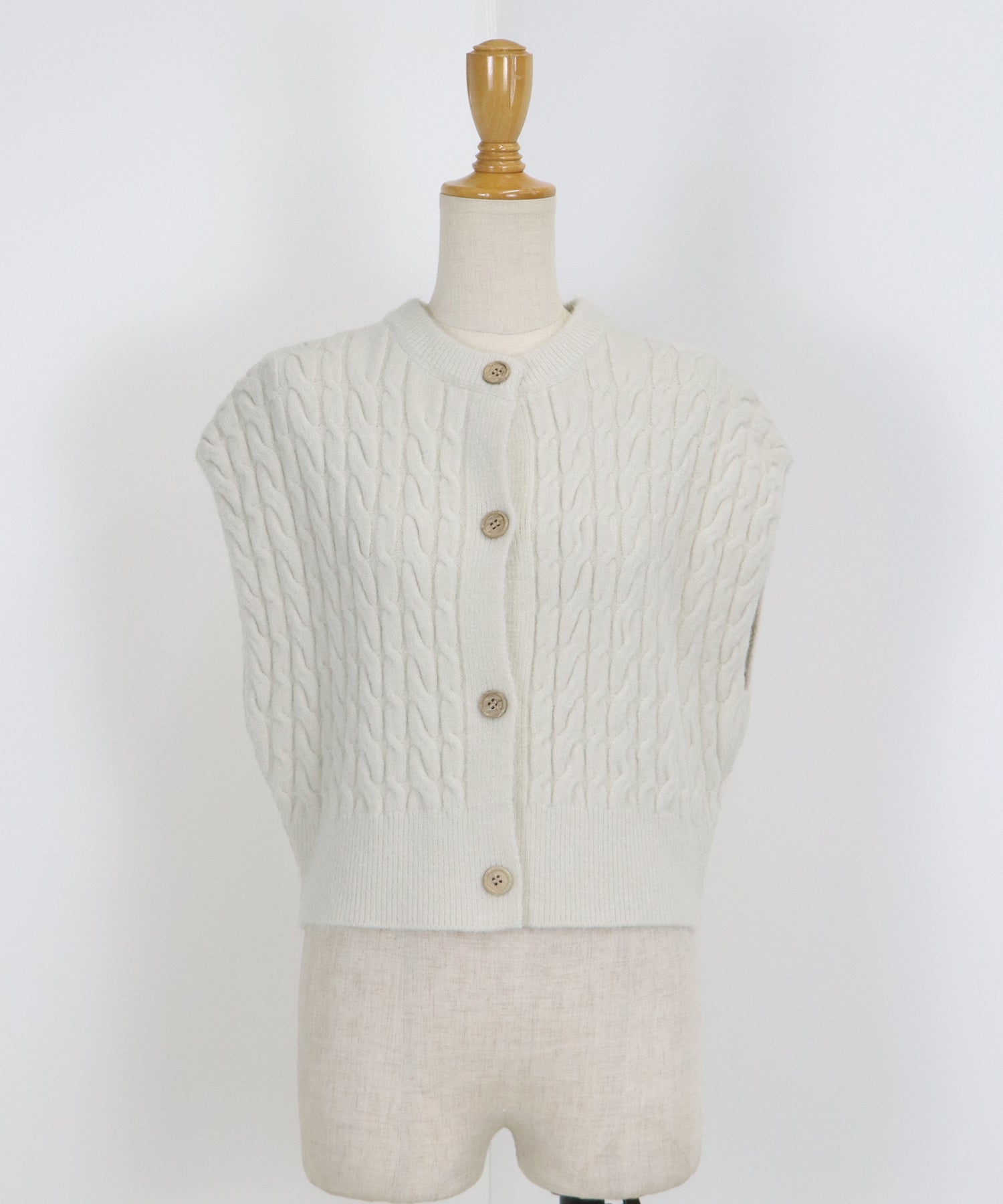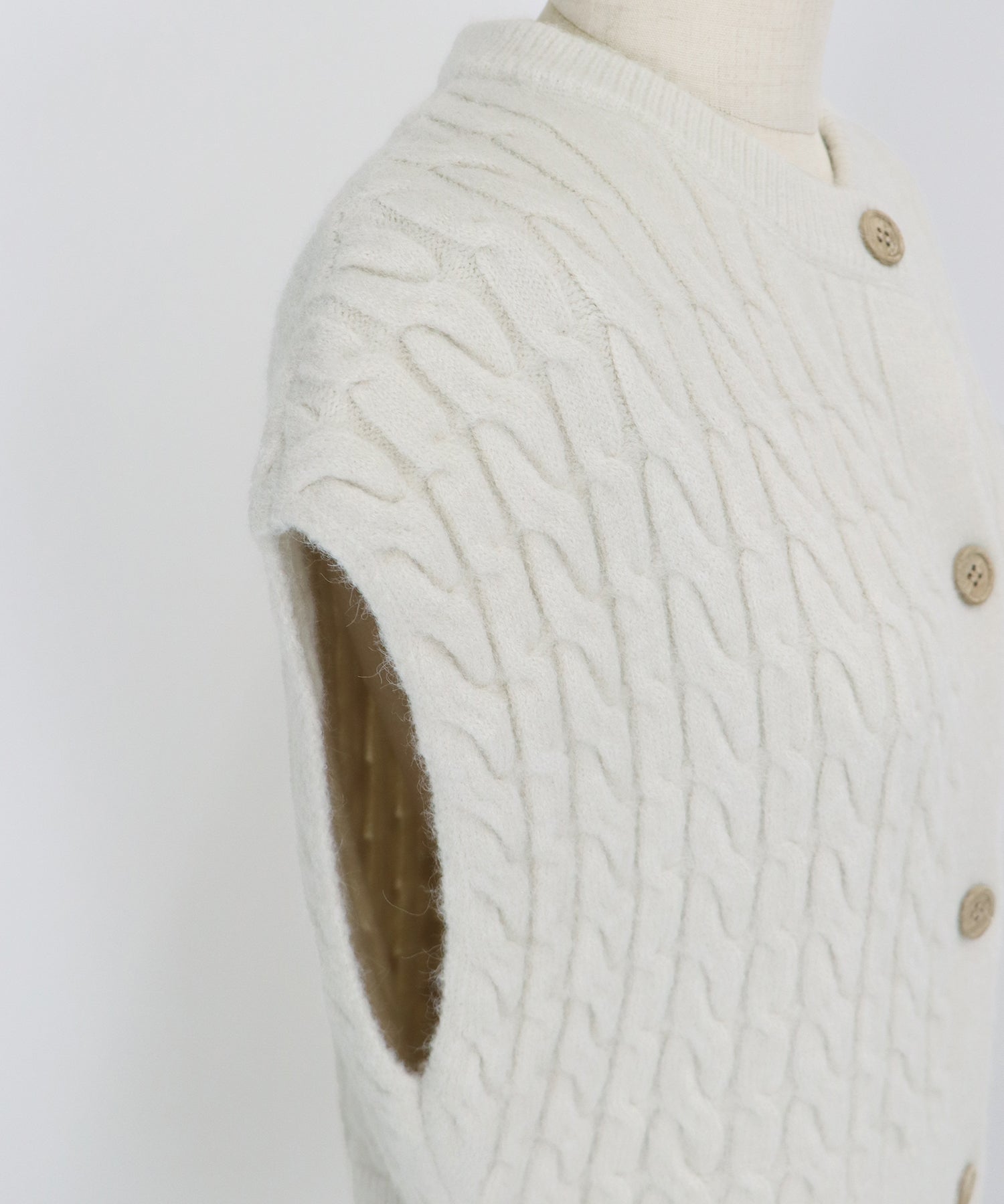 ウッドボタンと温かみのあるケーブル編みで季節感を演出し、
