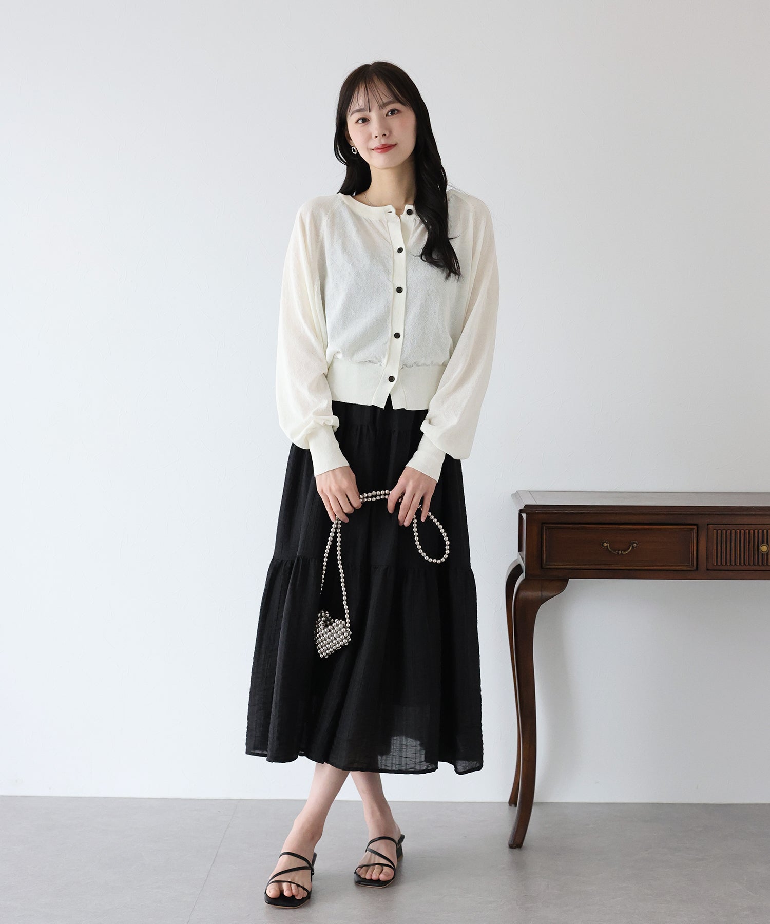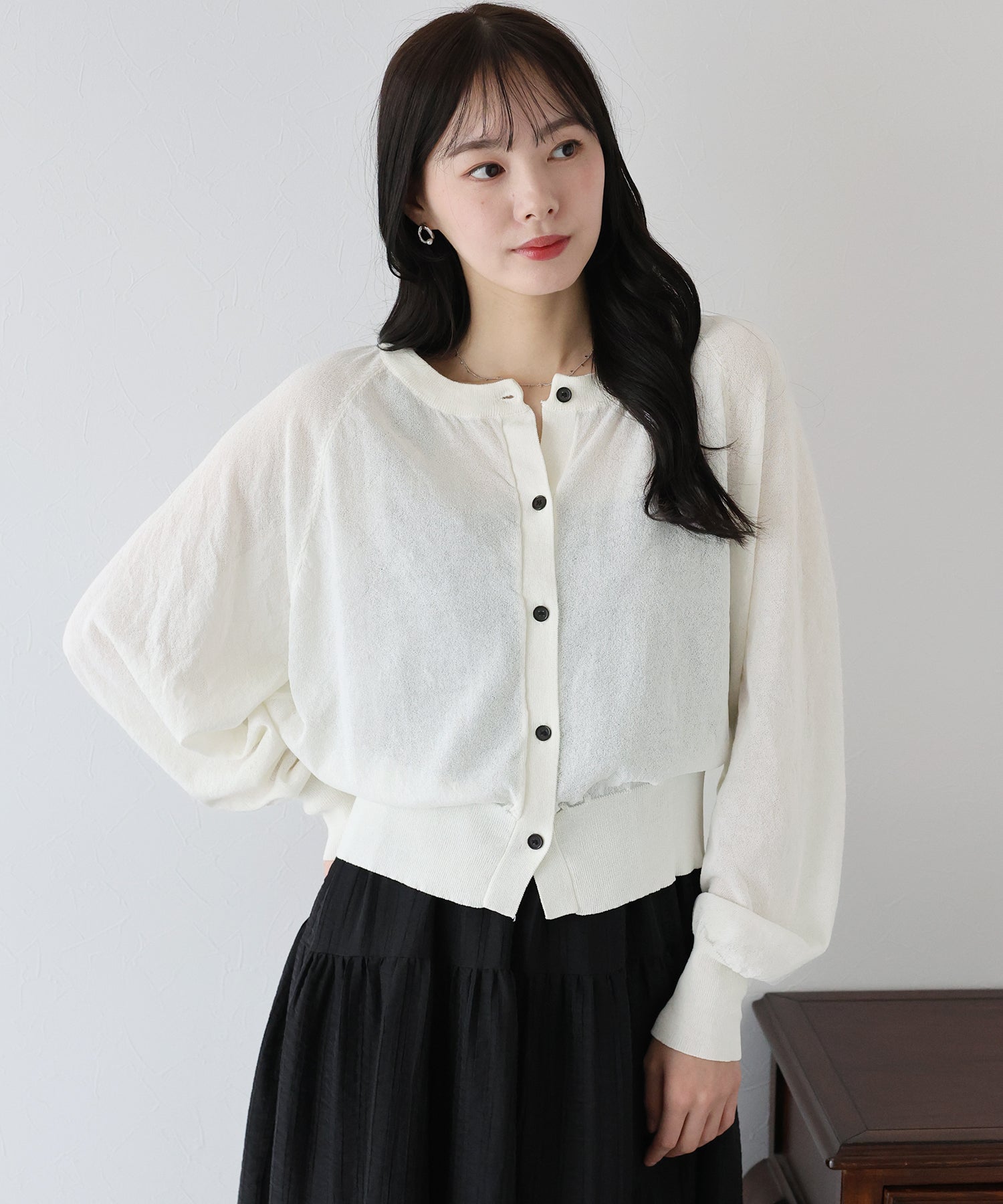 ベーシックなシルエットに黒ボタンでポイントを加え、透け感のある素材感で抜け感をプラス。