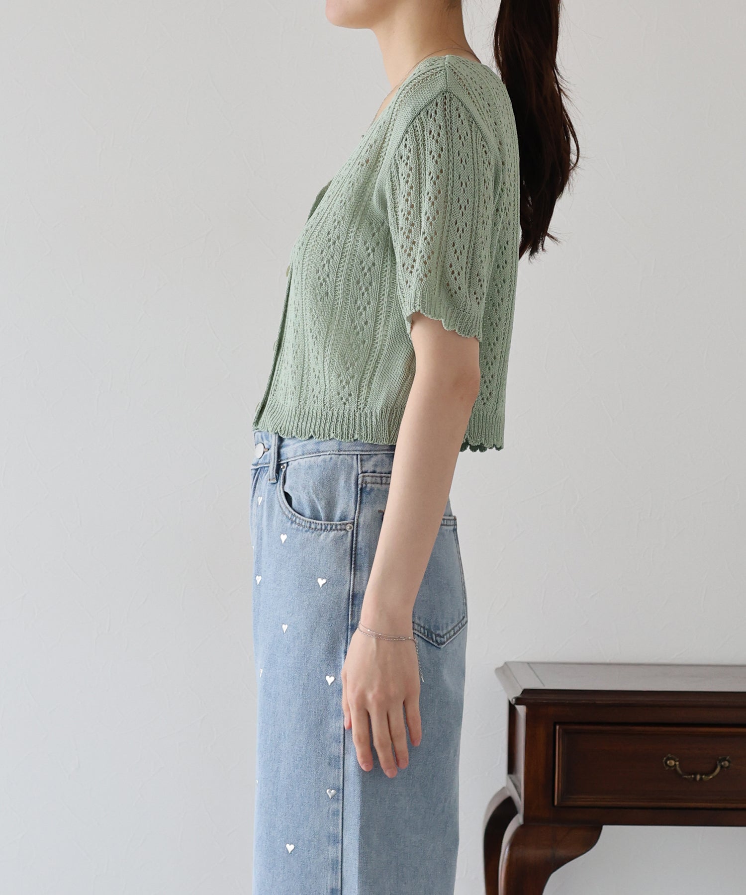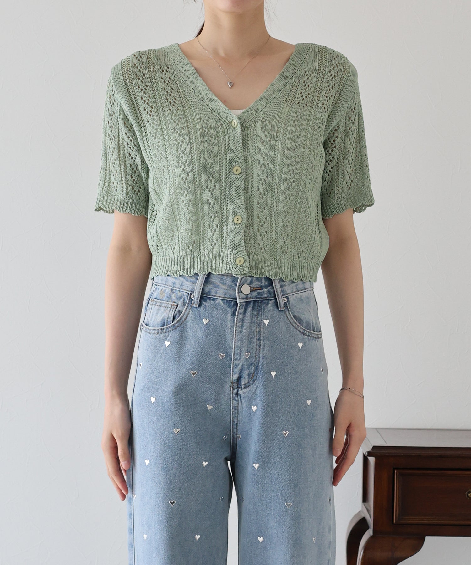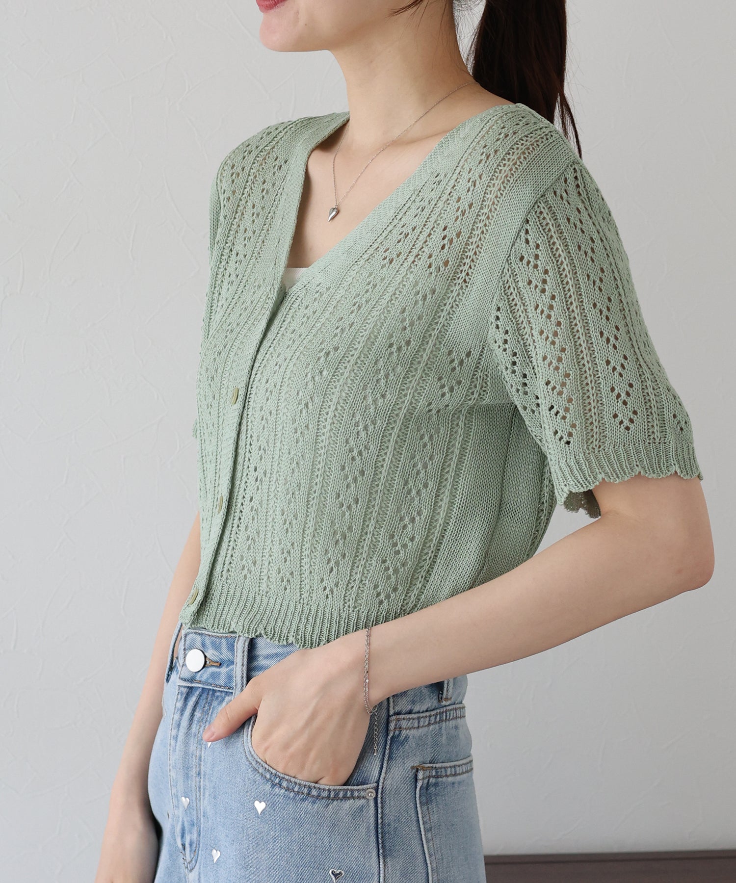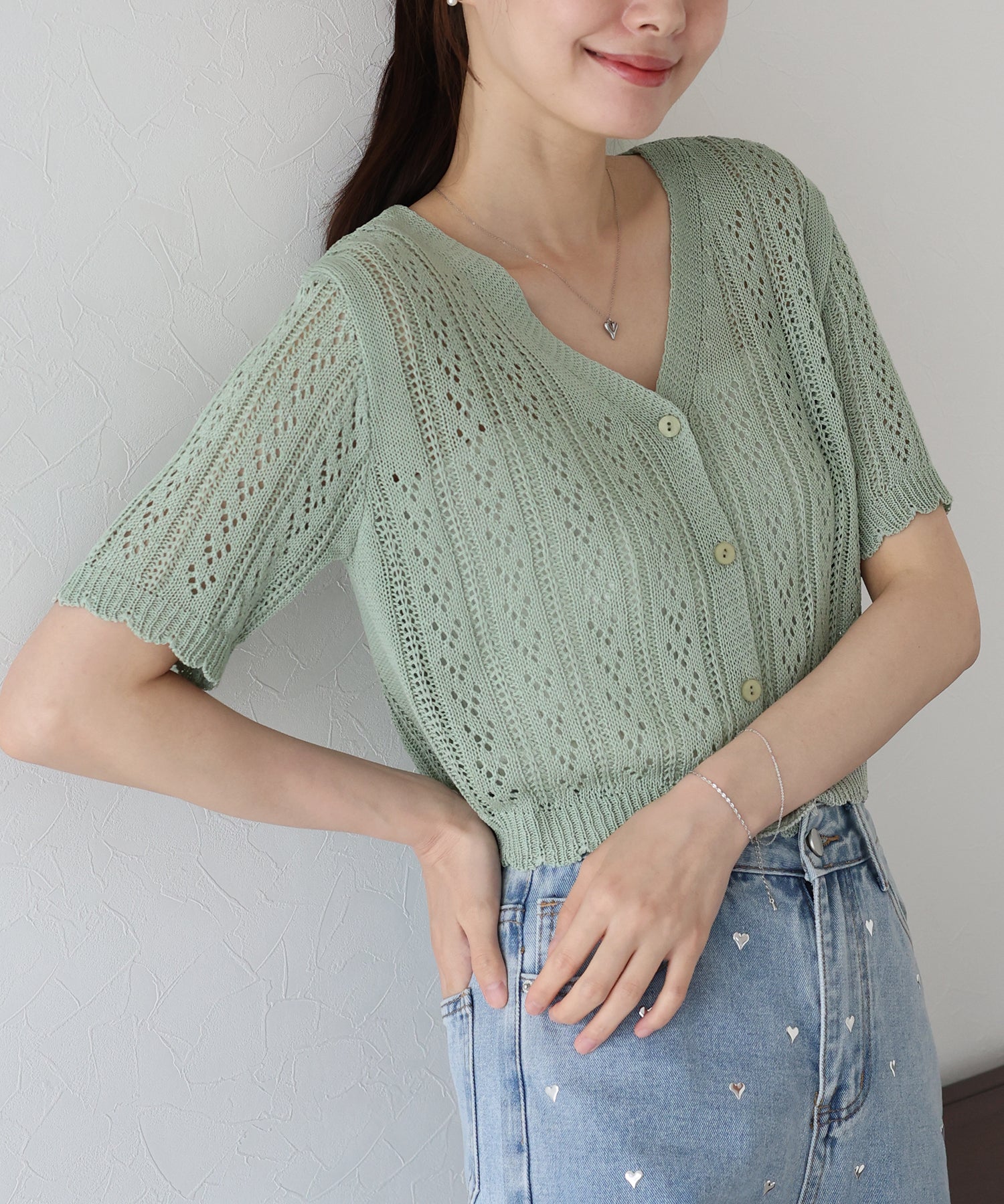 【TIME SALE】透かし編みVネック半袖カーディガン