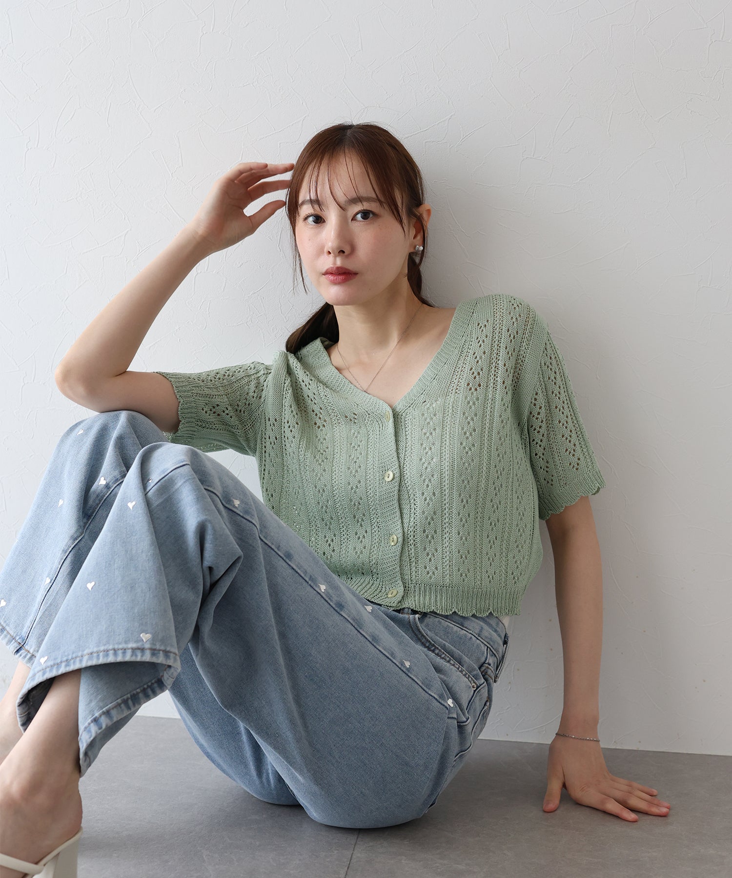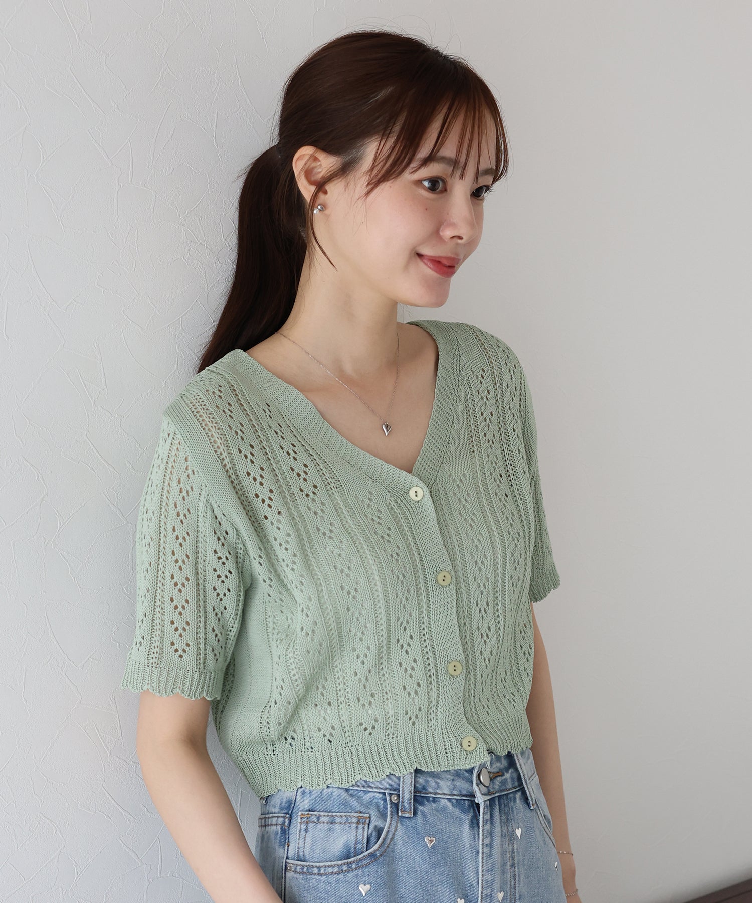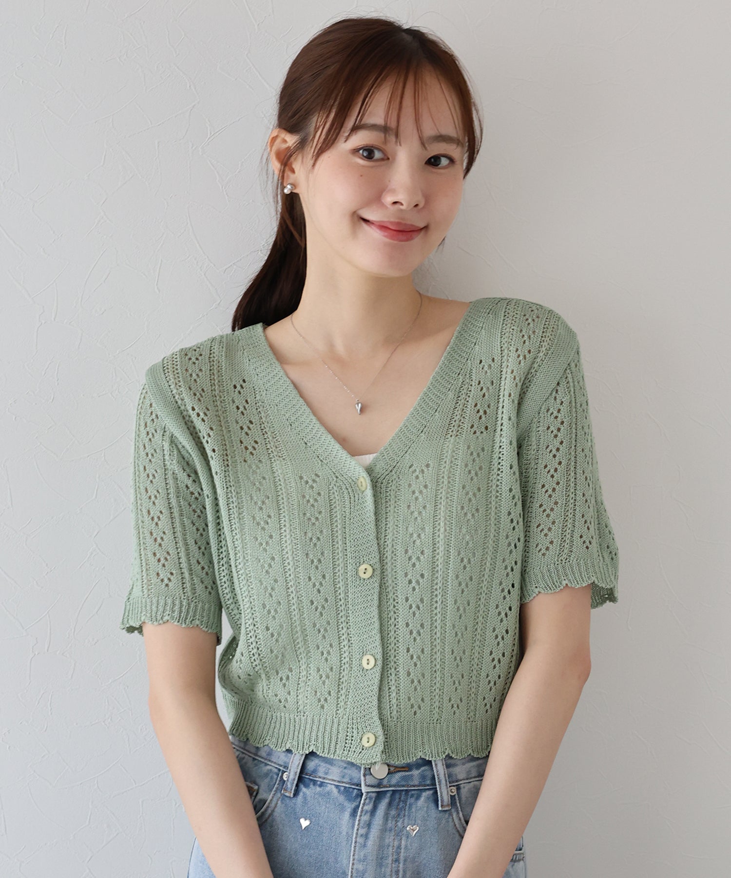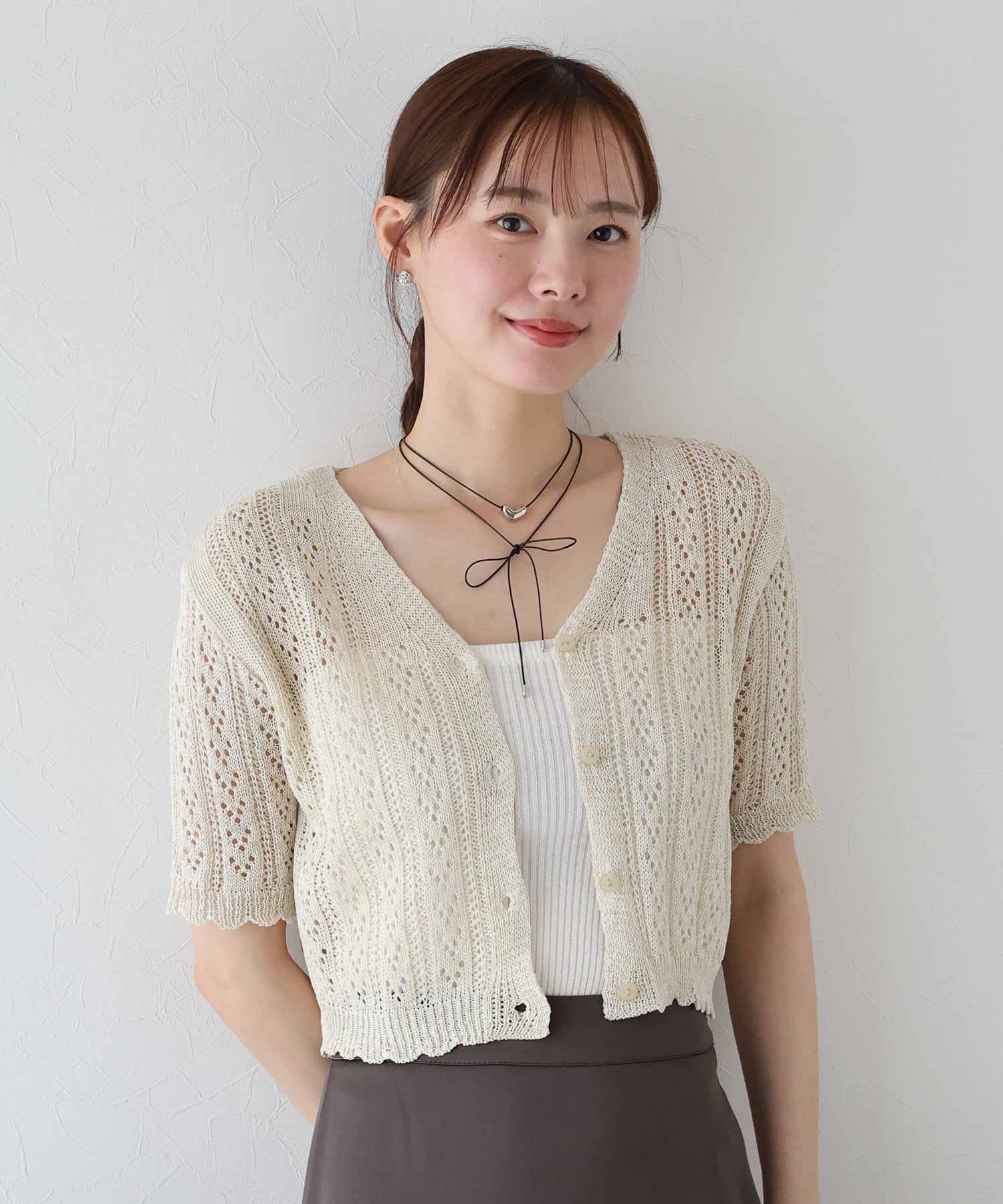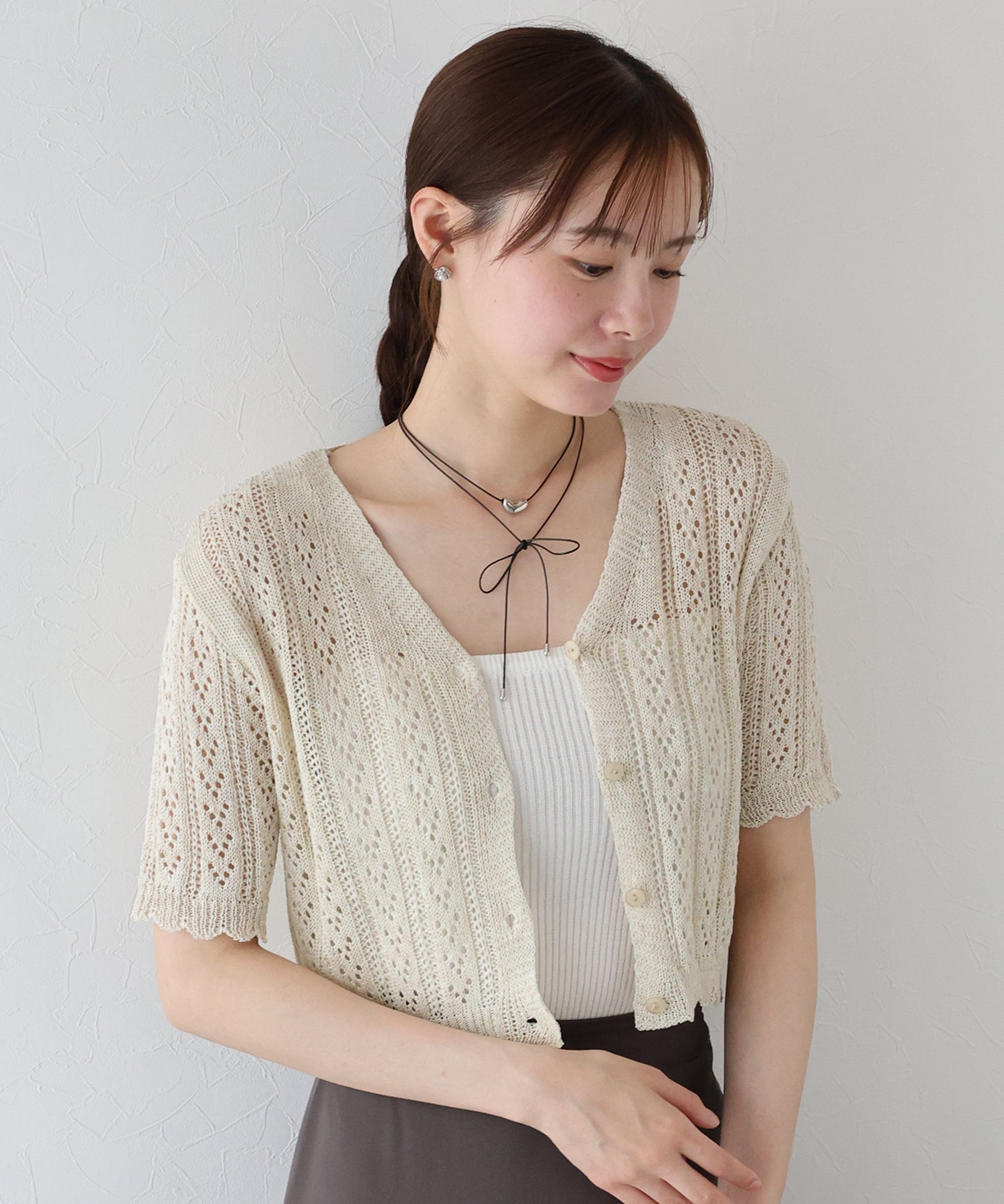カジュアル&女性らしいムードを兼ね備えたアイレットニットカーディガン