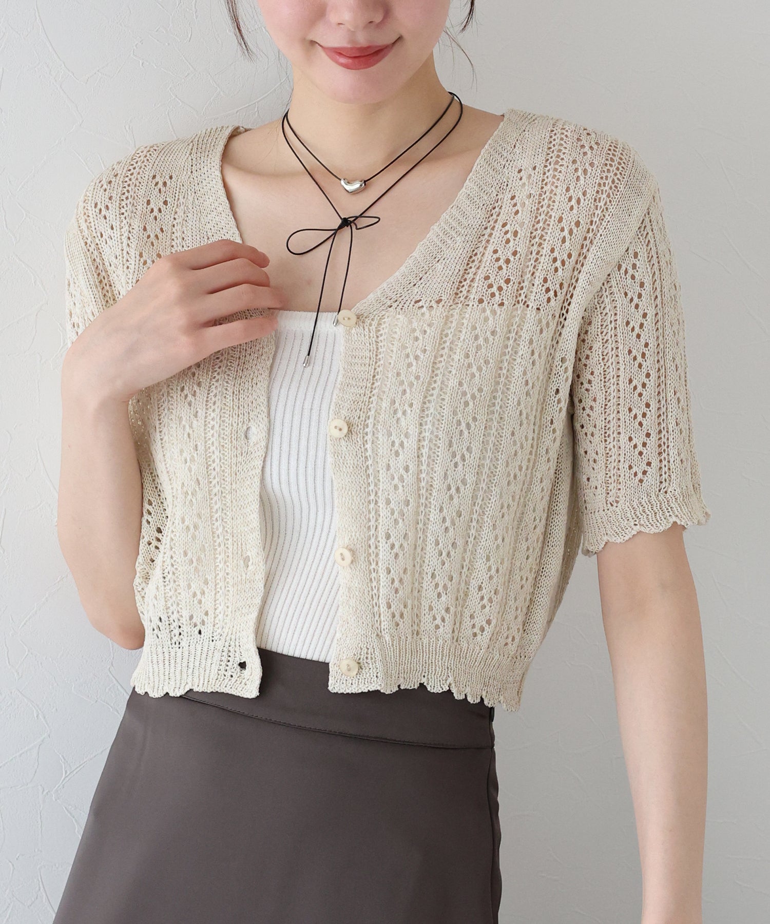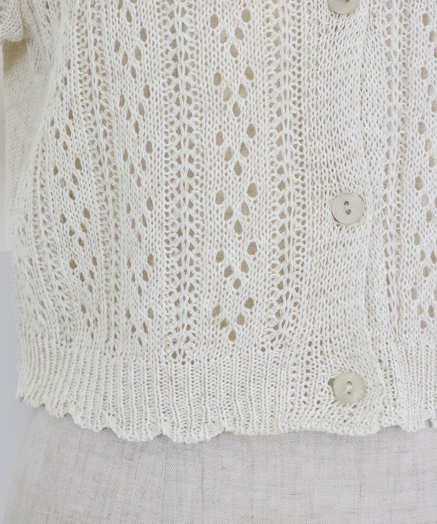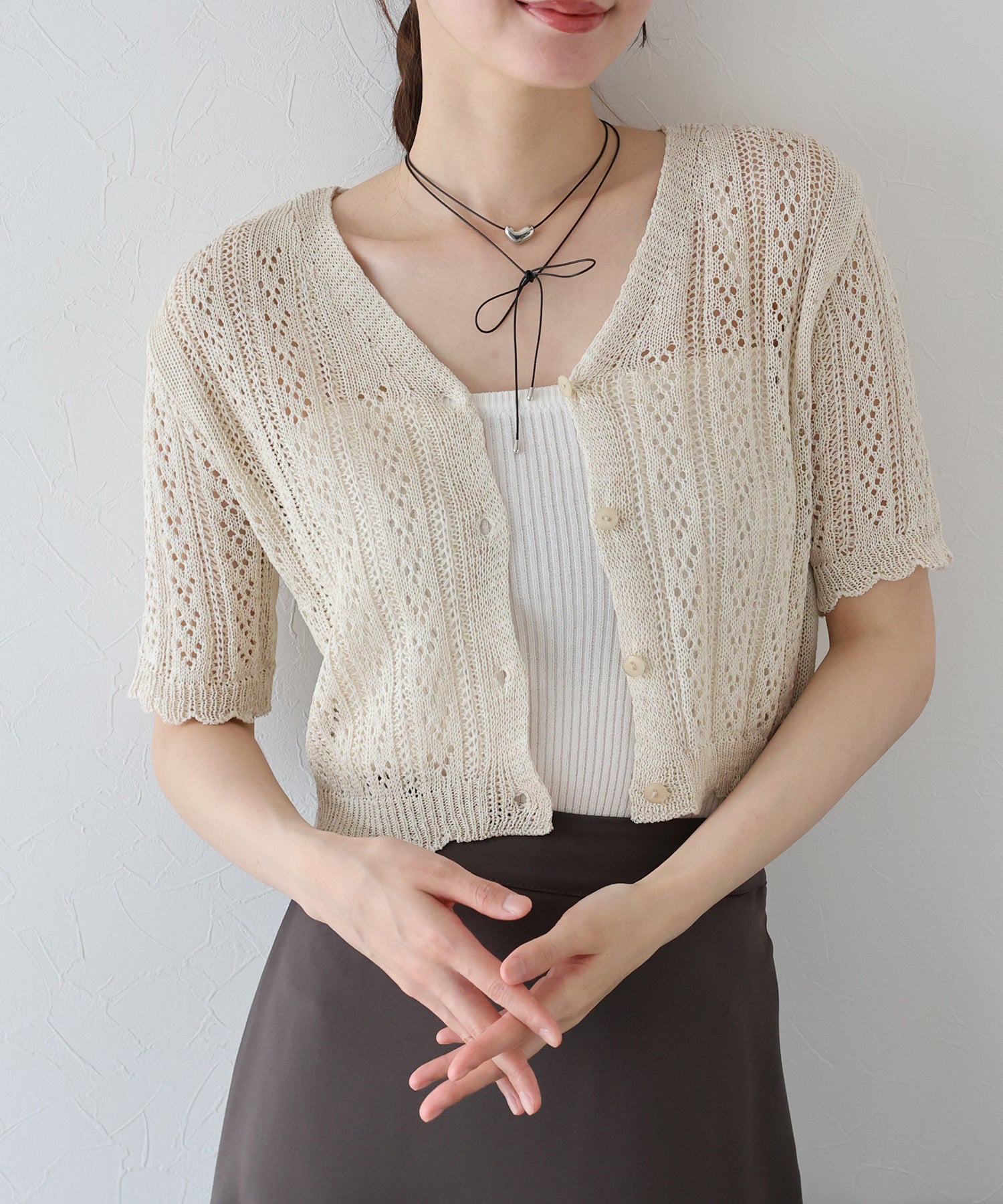 ナチュラルな風合いの透かし編みが夏らしい抜け感をプラスしてくれるカーディガン。