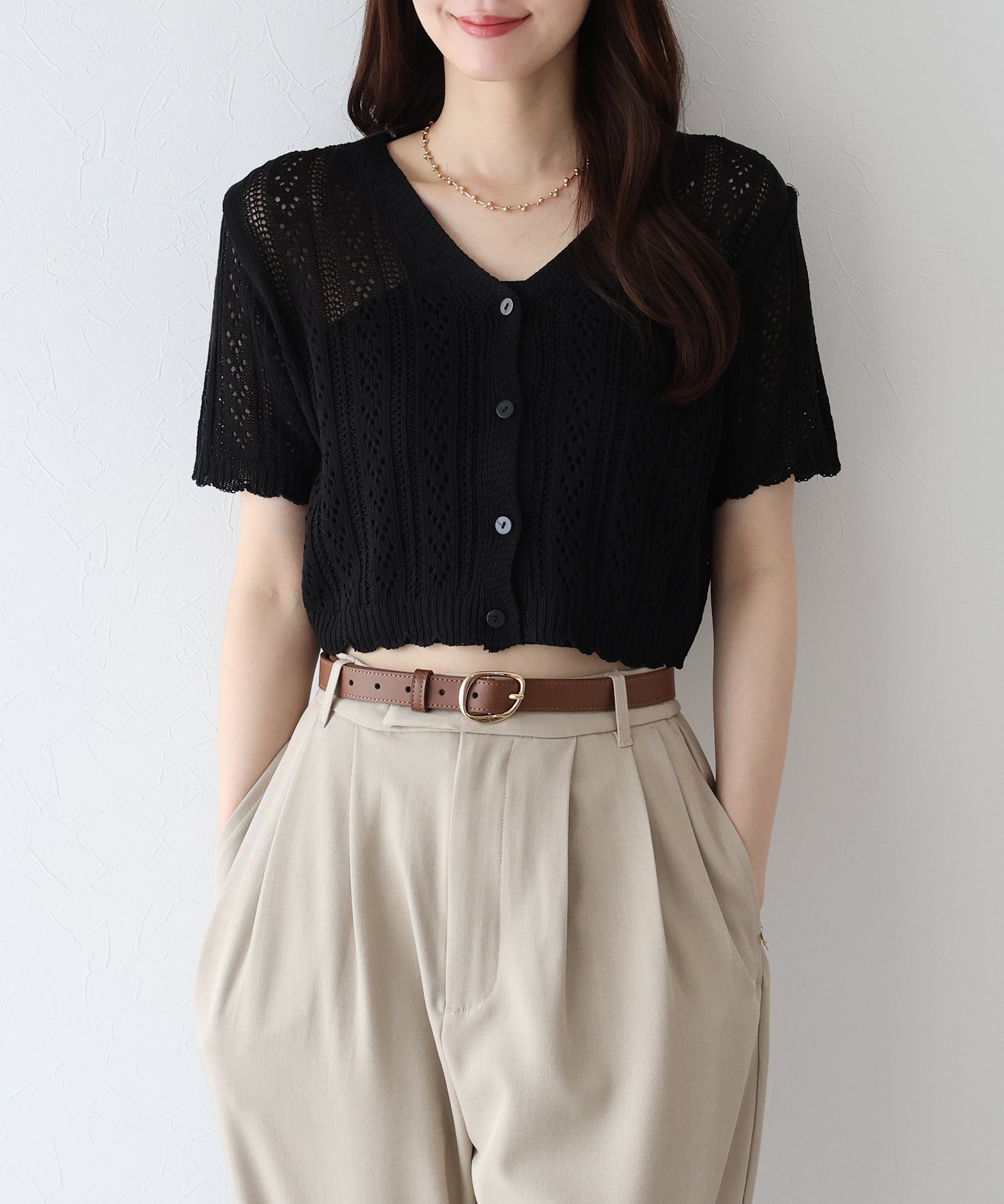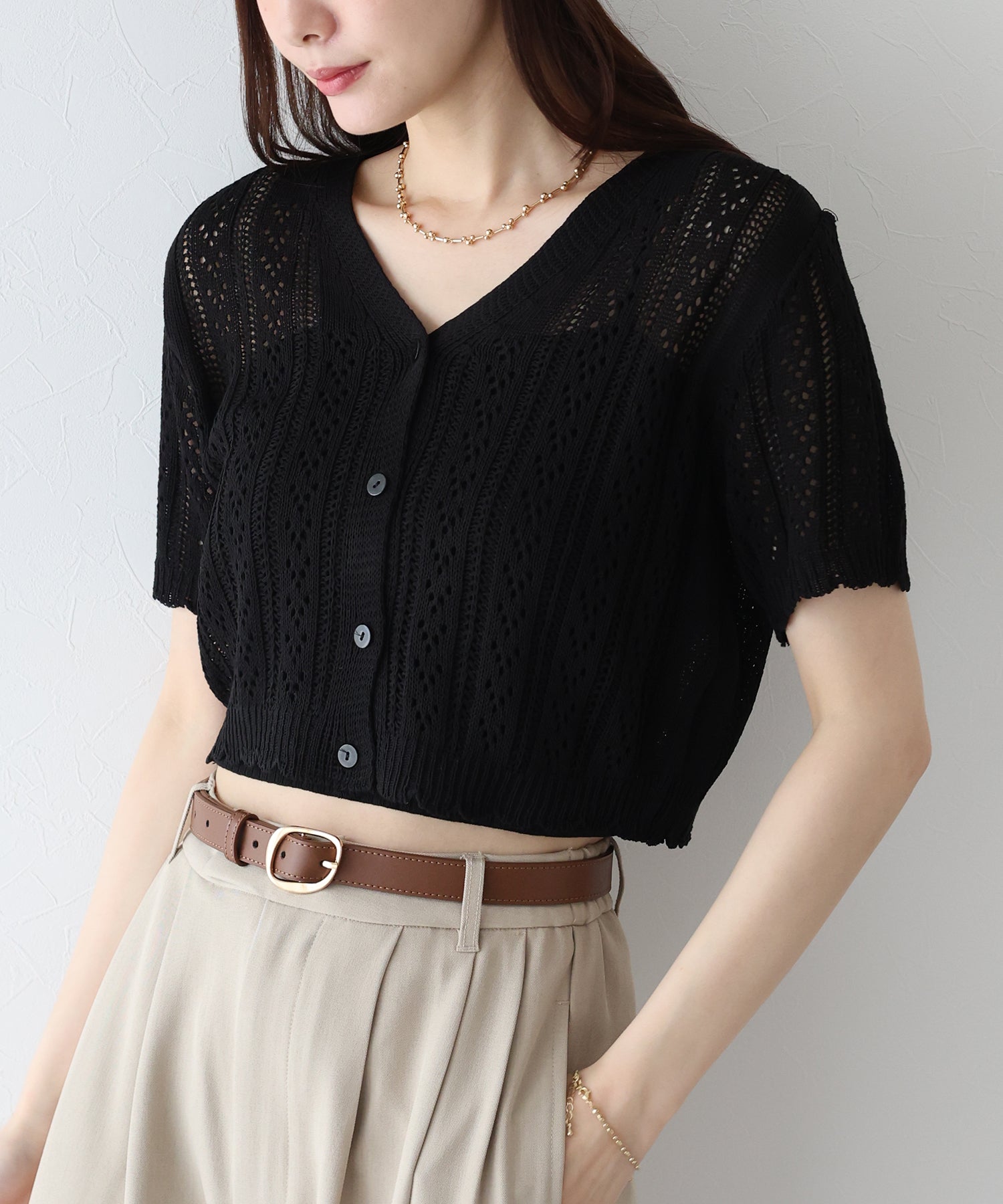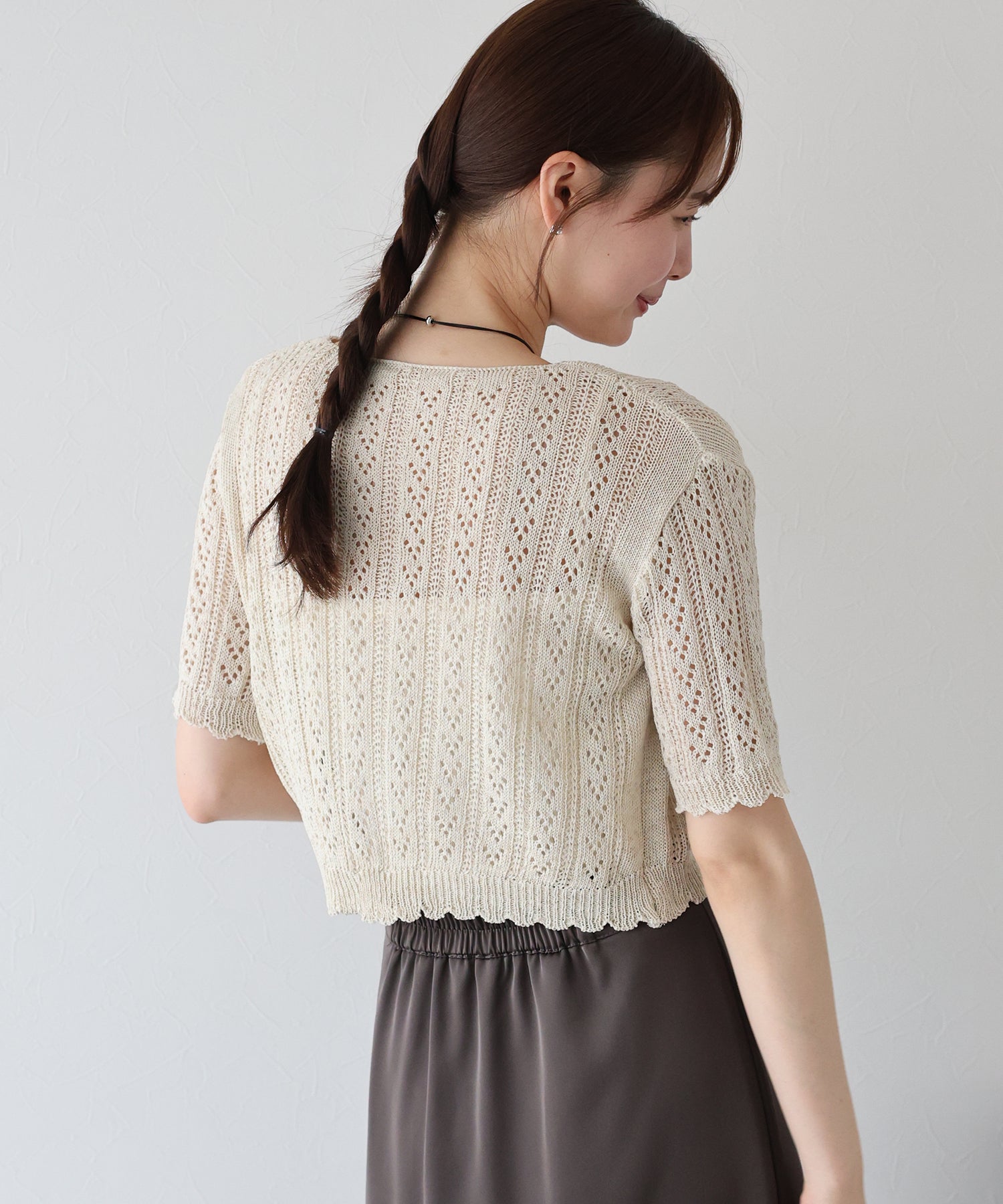 ナチュラルな風合いの透かし編みが夏らしい抜け感をプラスしてくれるカーディガン。