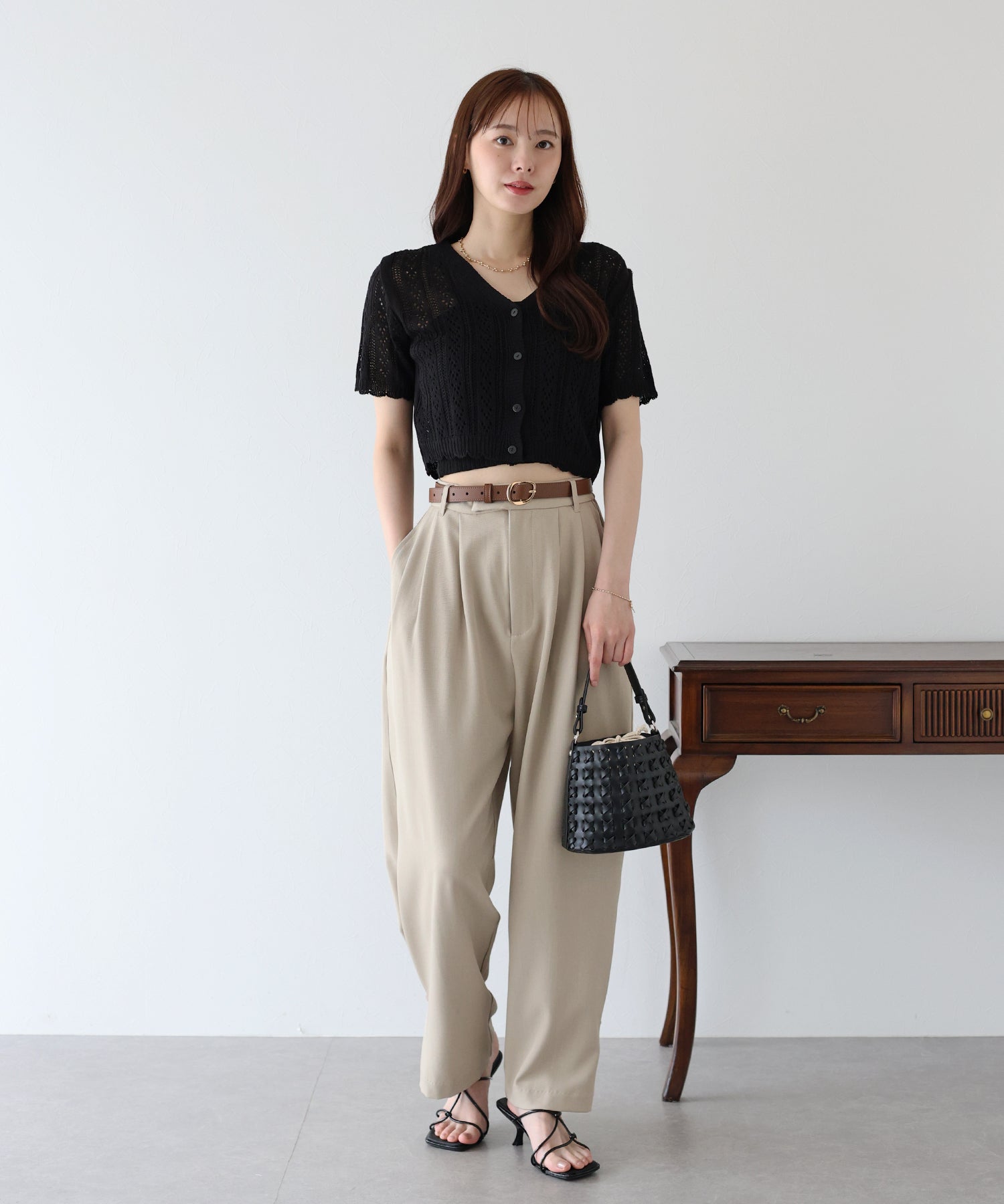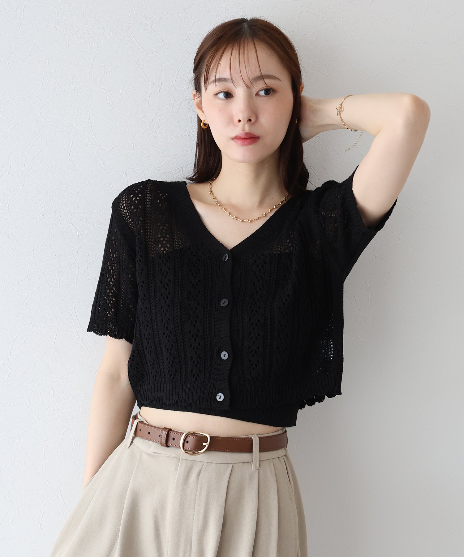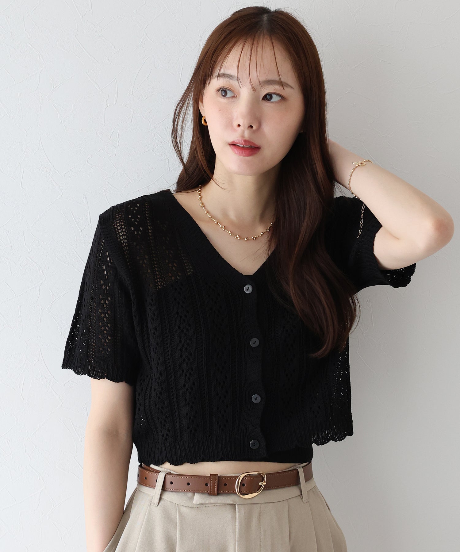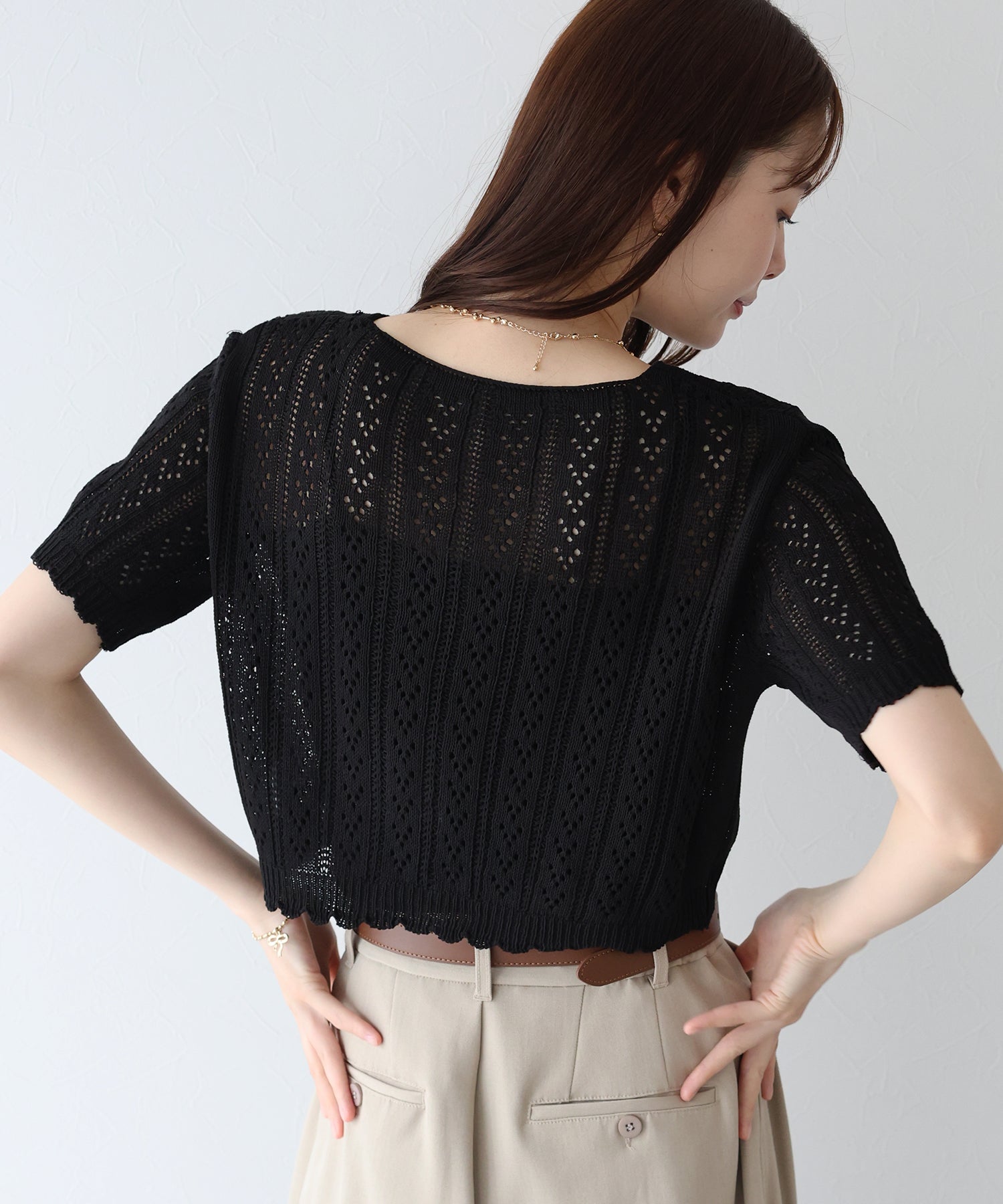 透かし編みなので、キャミやタンクなどインナーのカラー次第で雰囲気を変えられます。