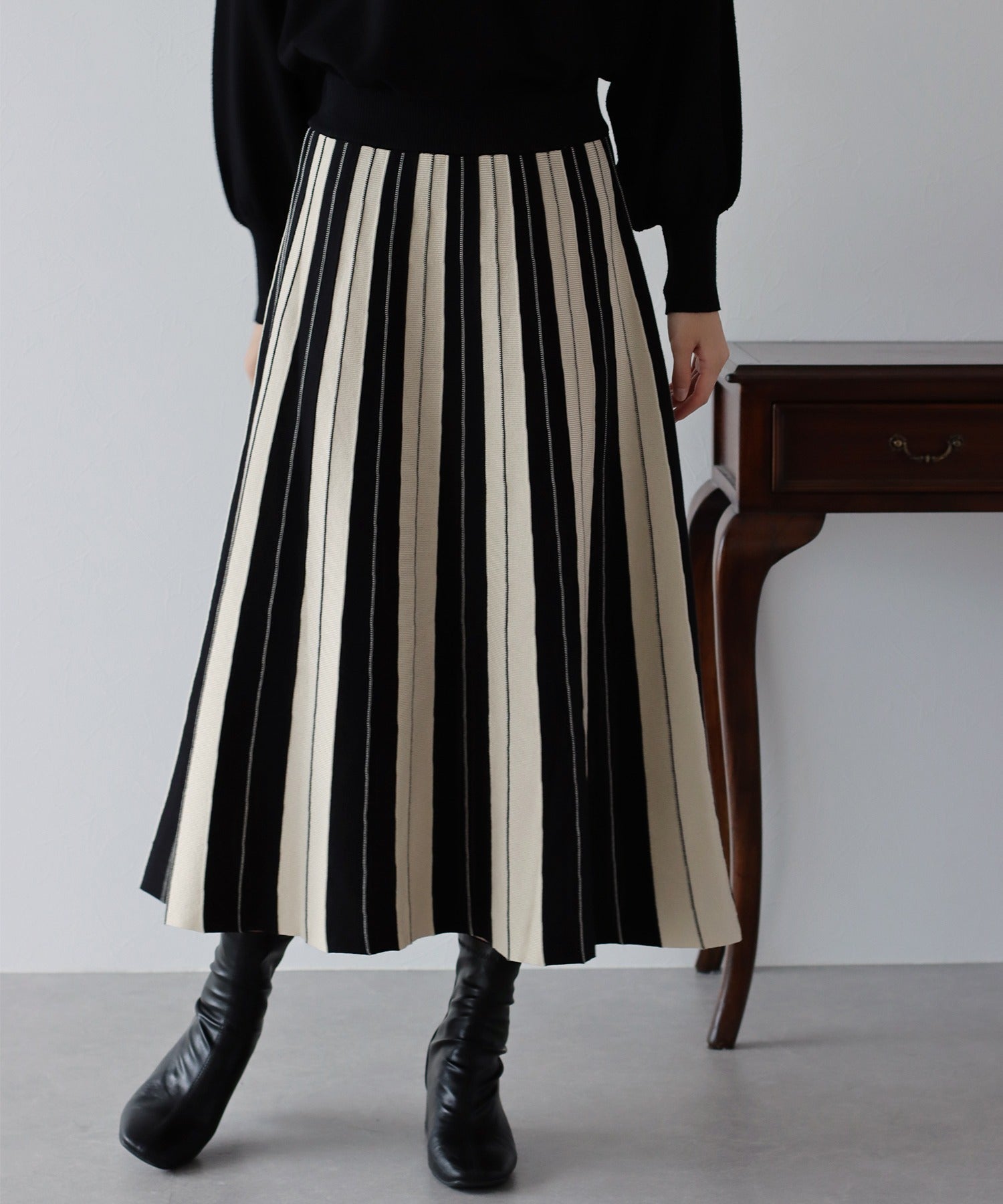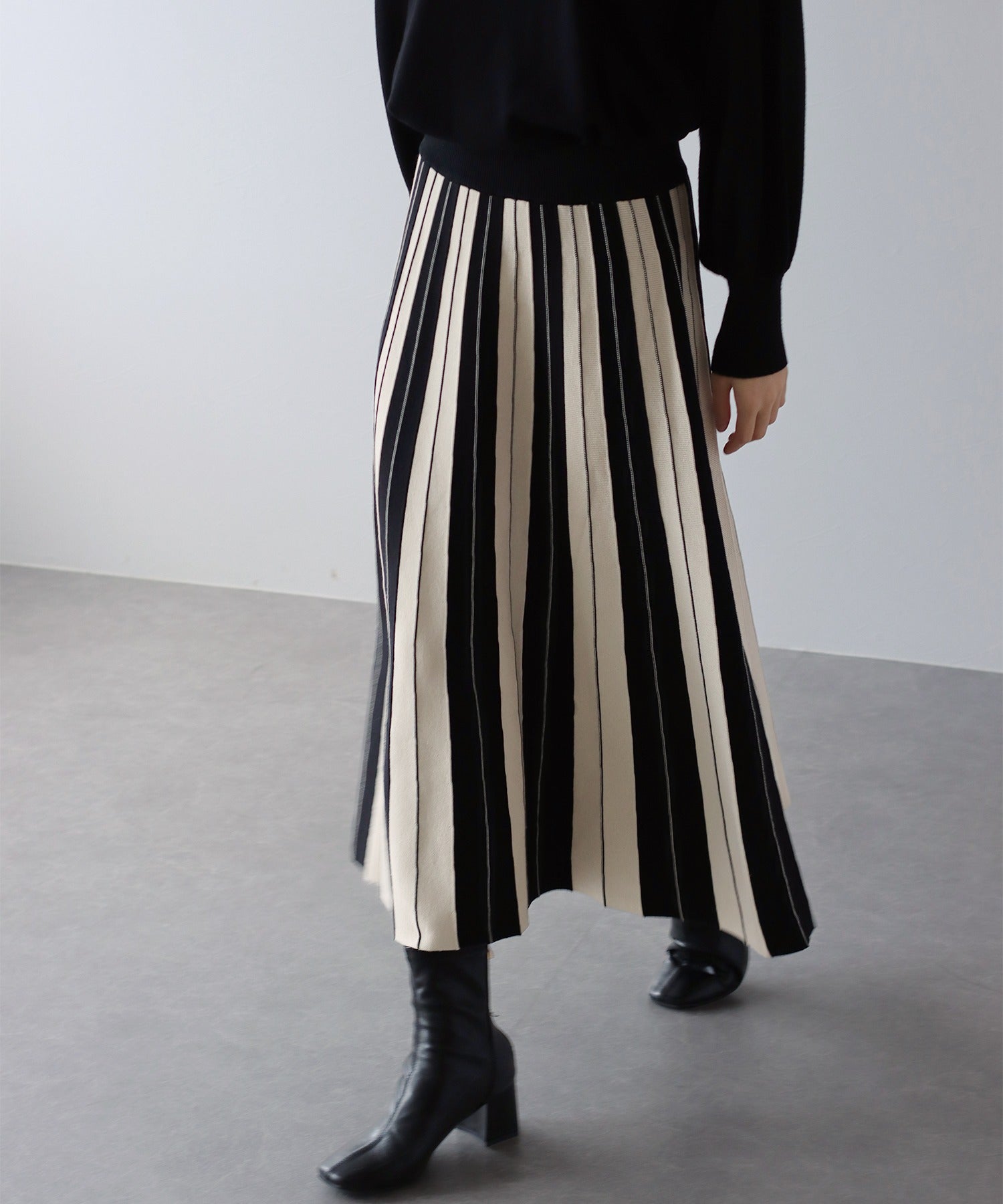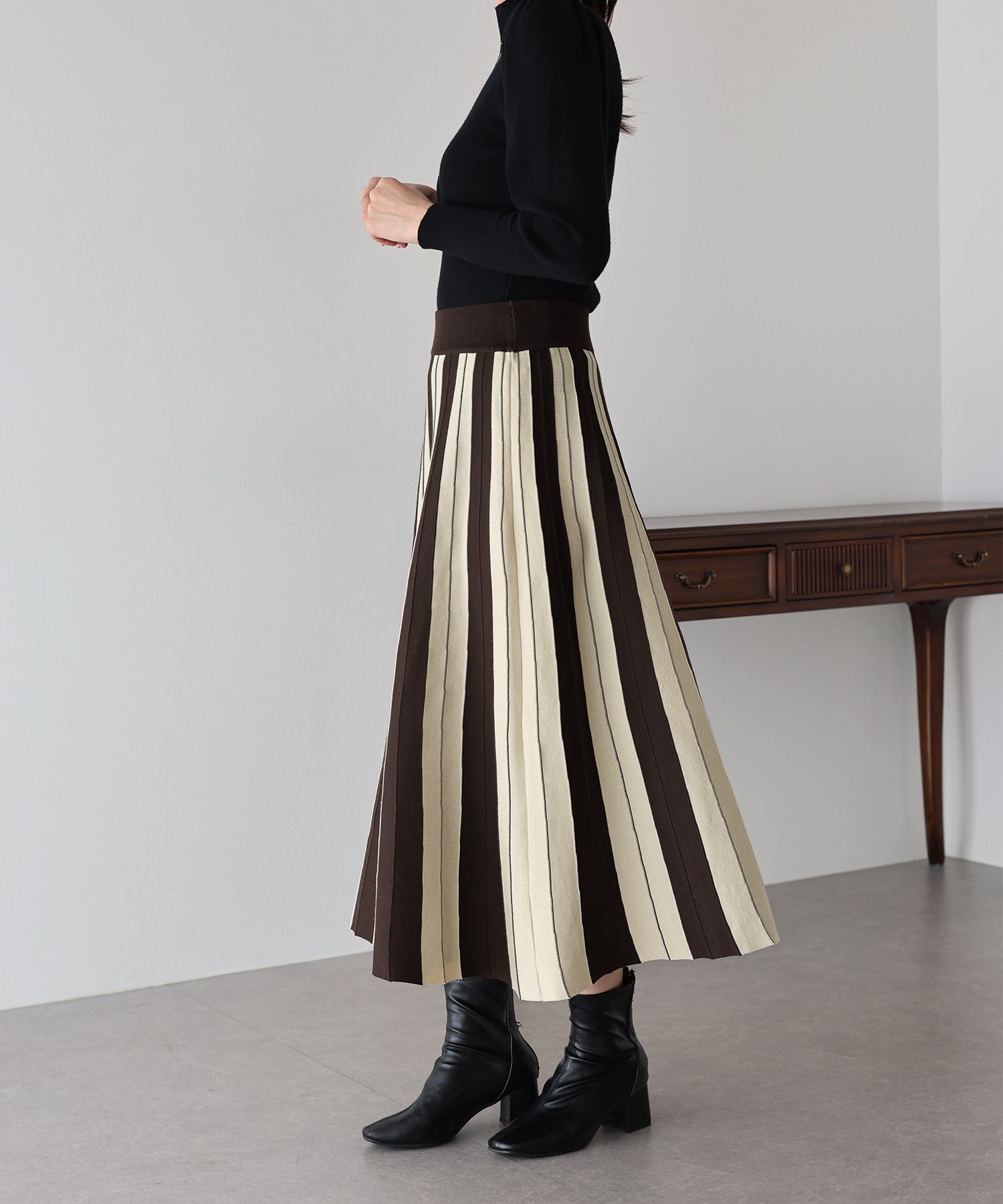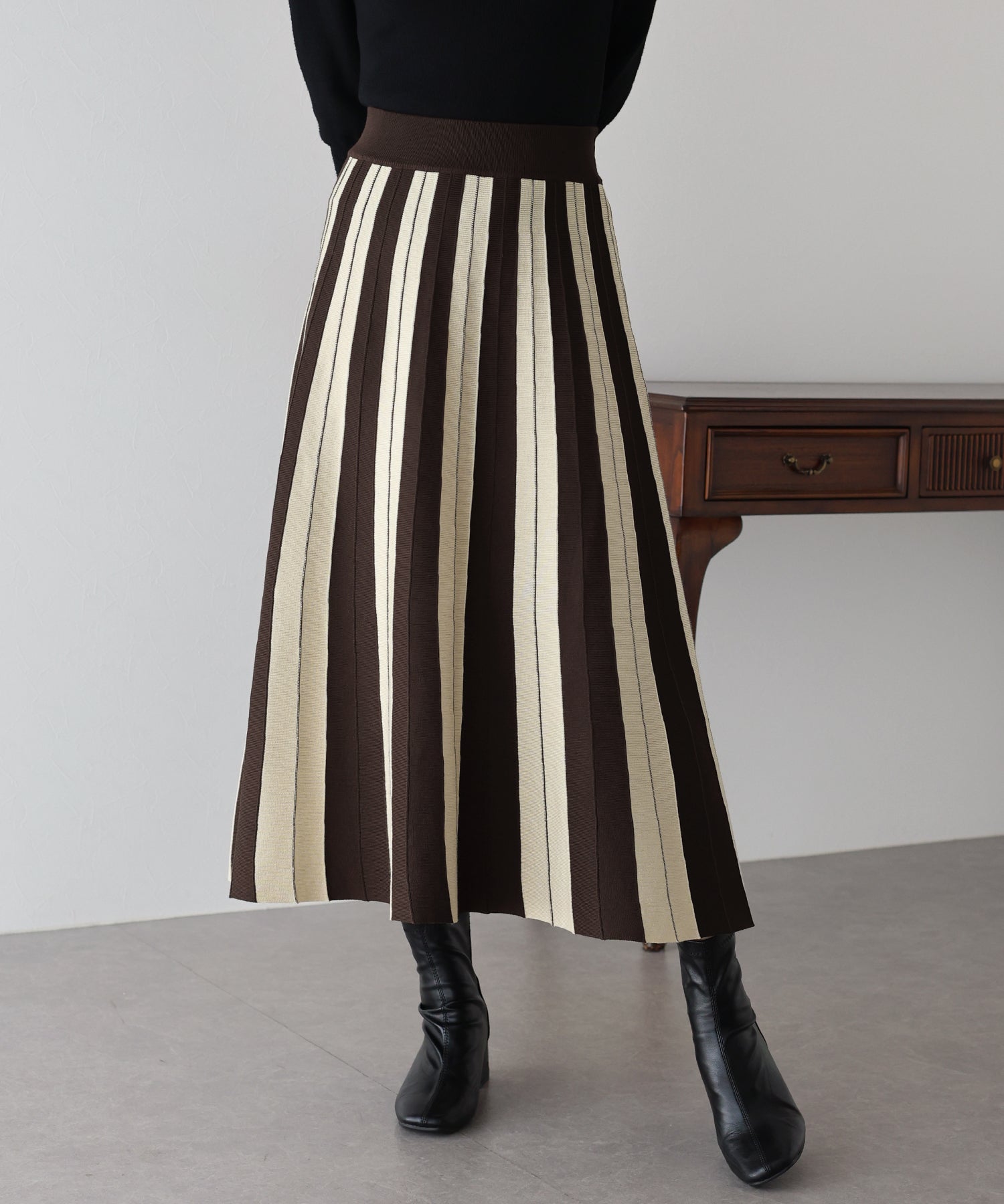 멀티 컬러의 스트라이프 무늬를 배색 한 세련된 보이는 니트 스커트.