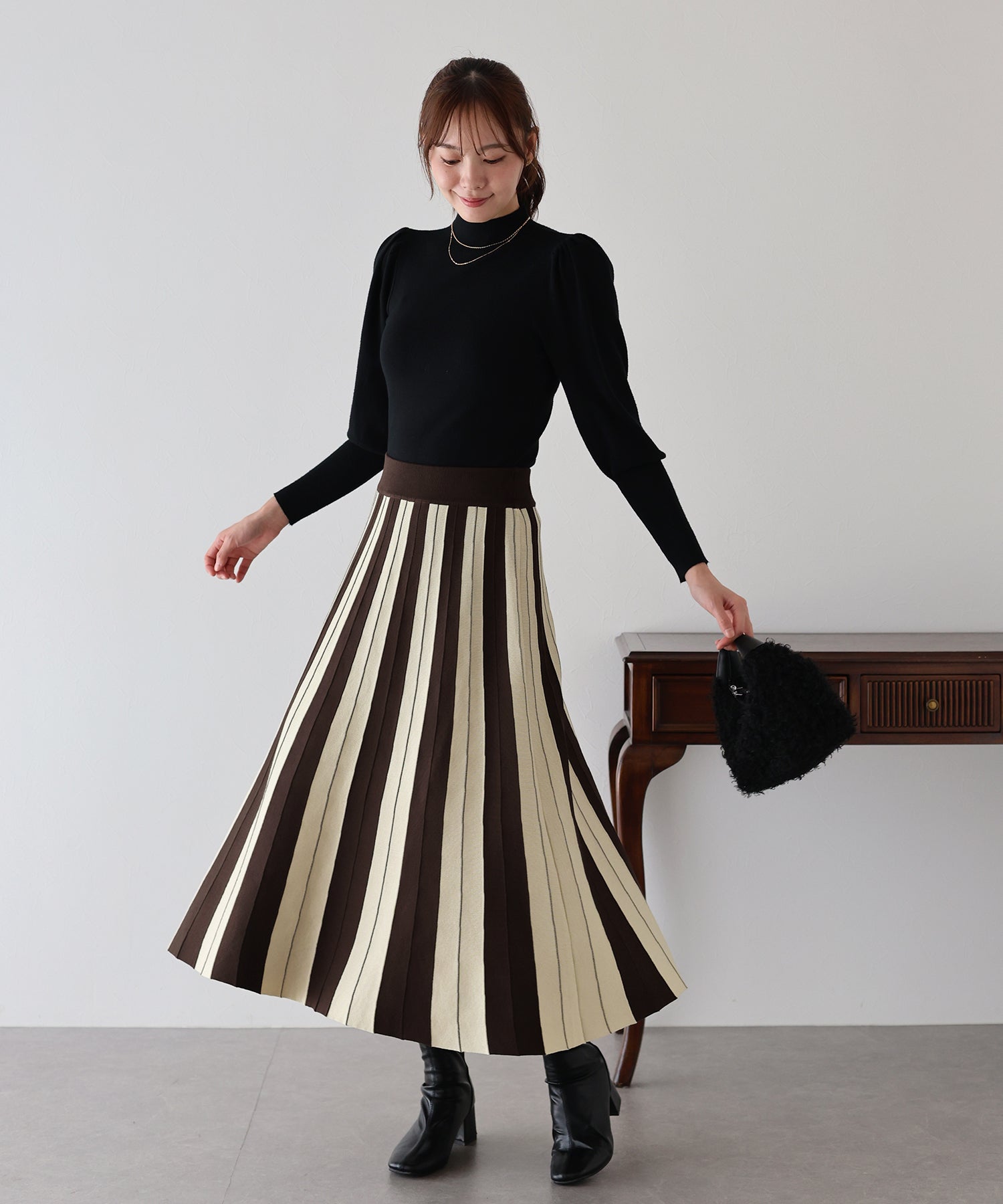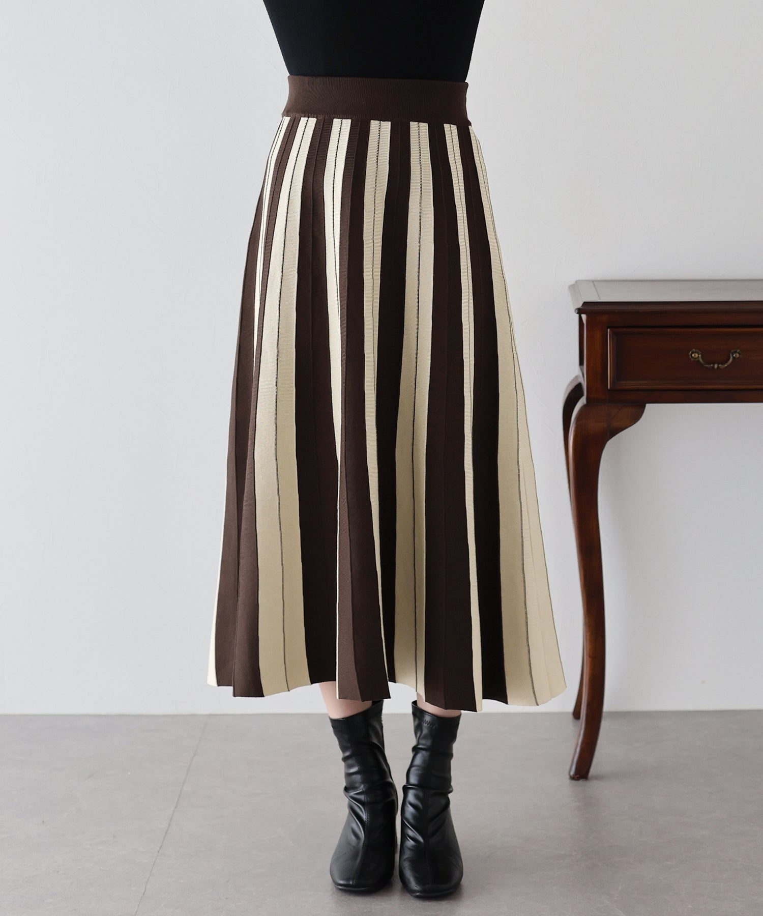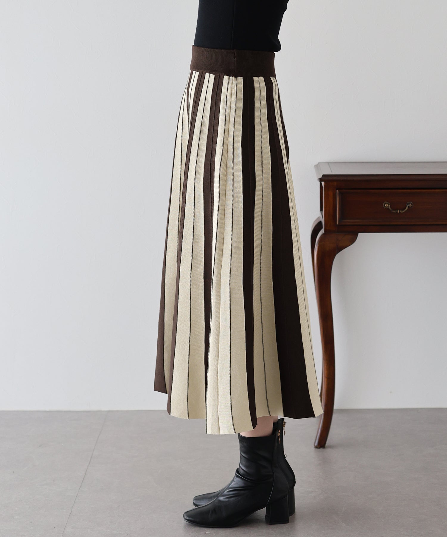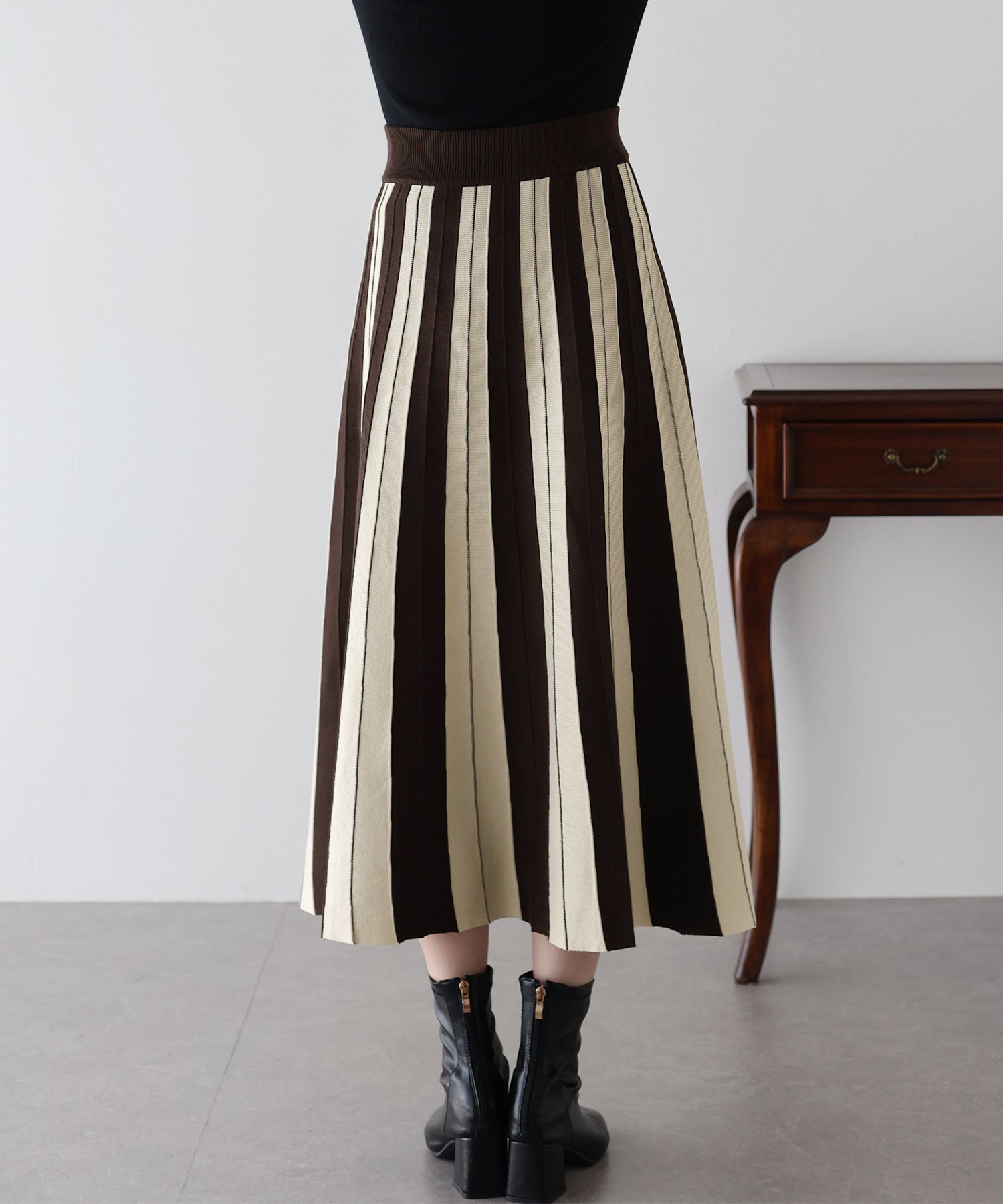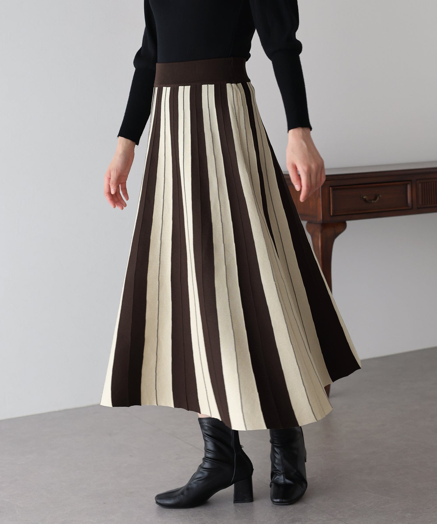 멀티 컬러의 스트라이프 무늬를 배색 한 세련된 보이는 니트 스커트.