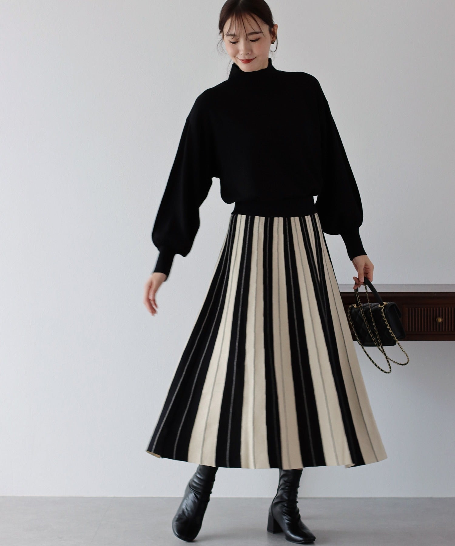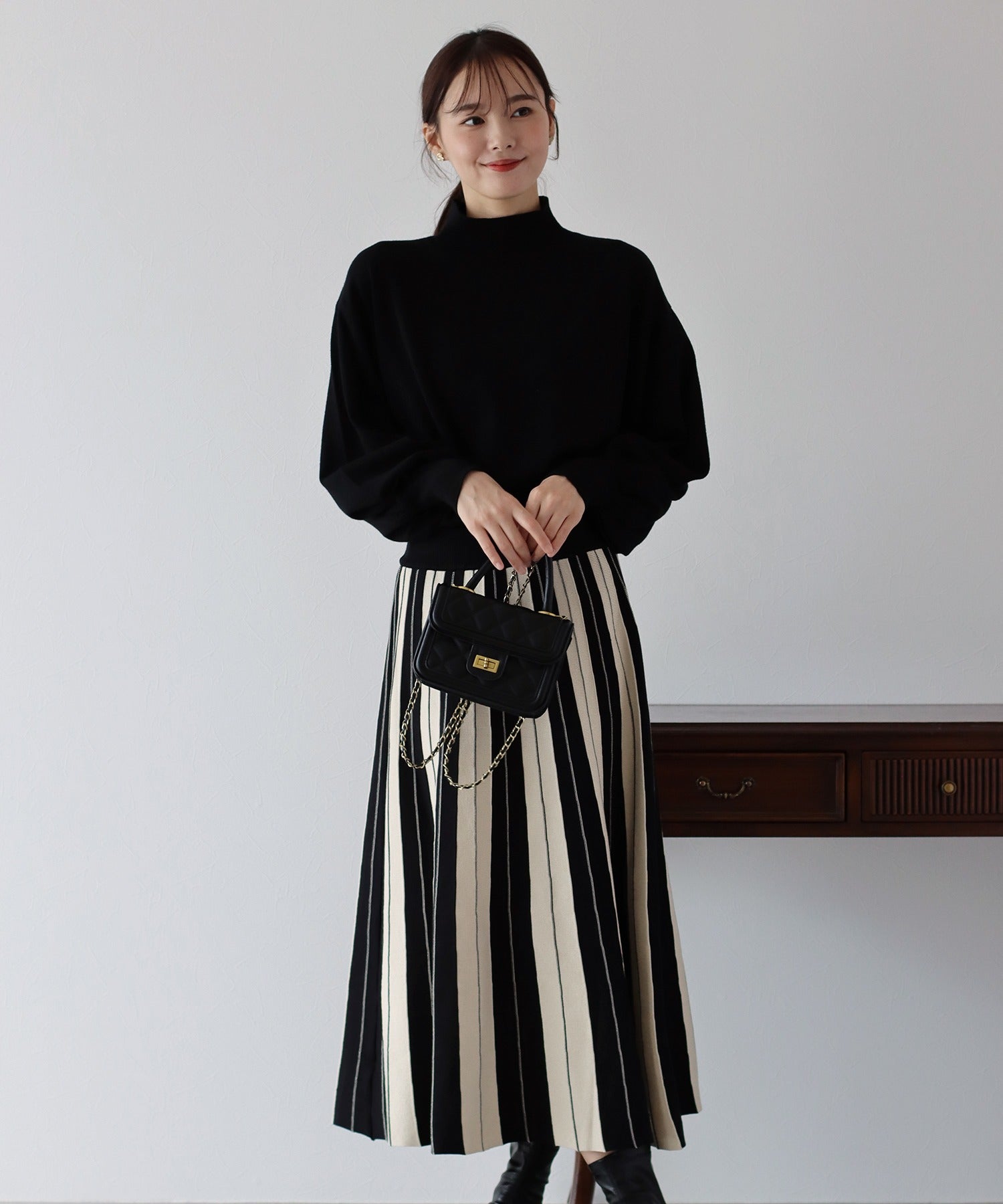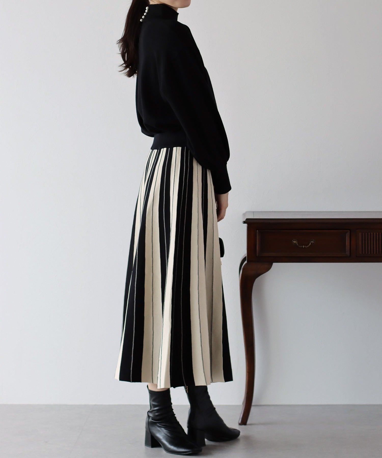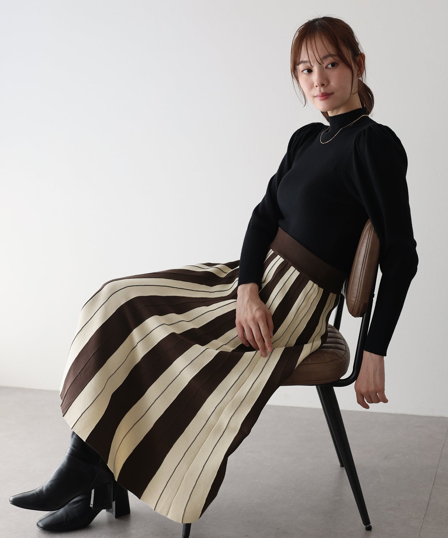 멀티 컬러의 스트라이프 무늬를 배색 한 세련된 보이는 니트 스커트.