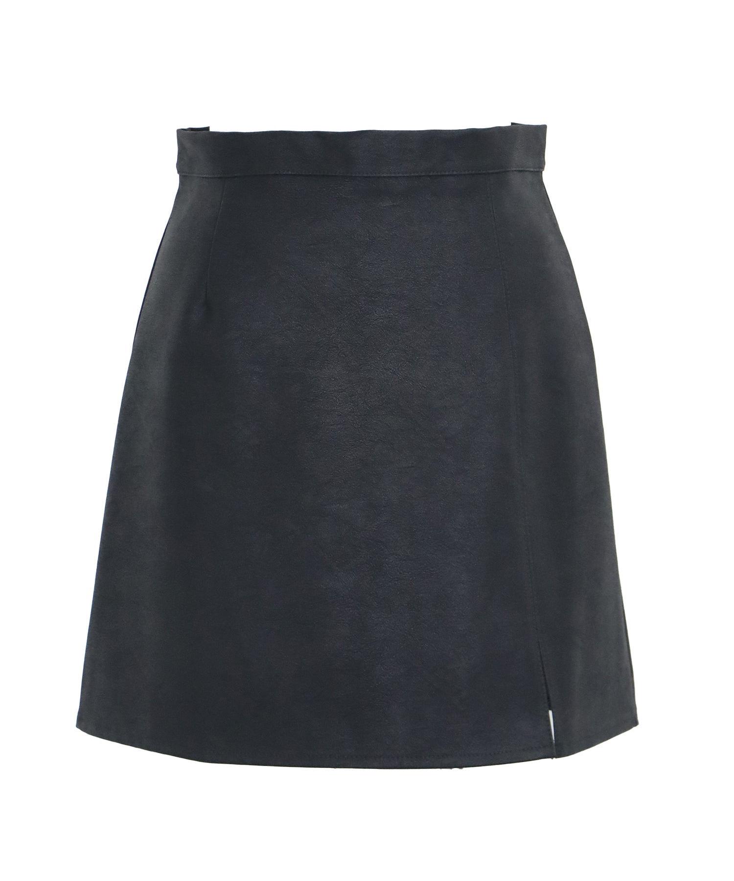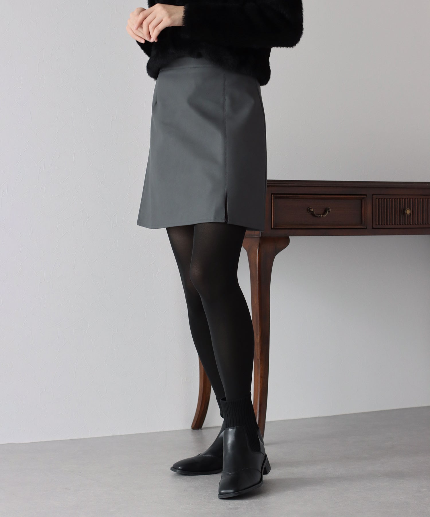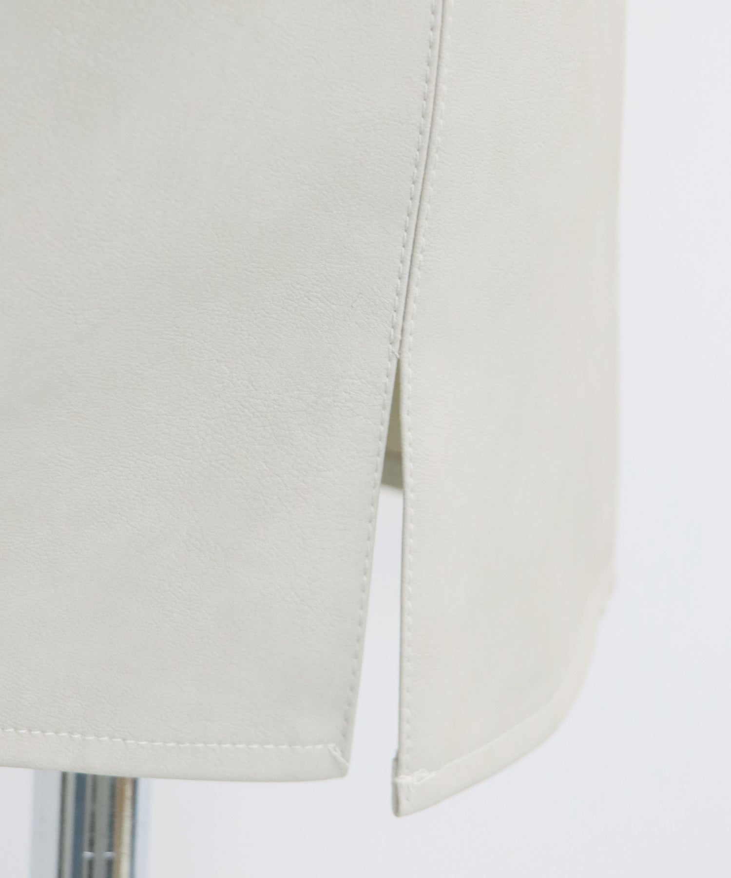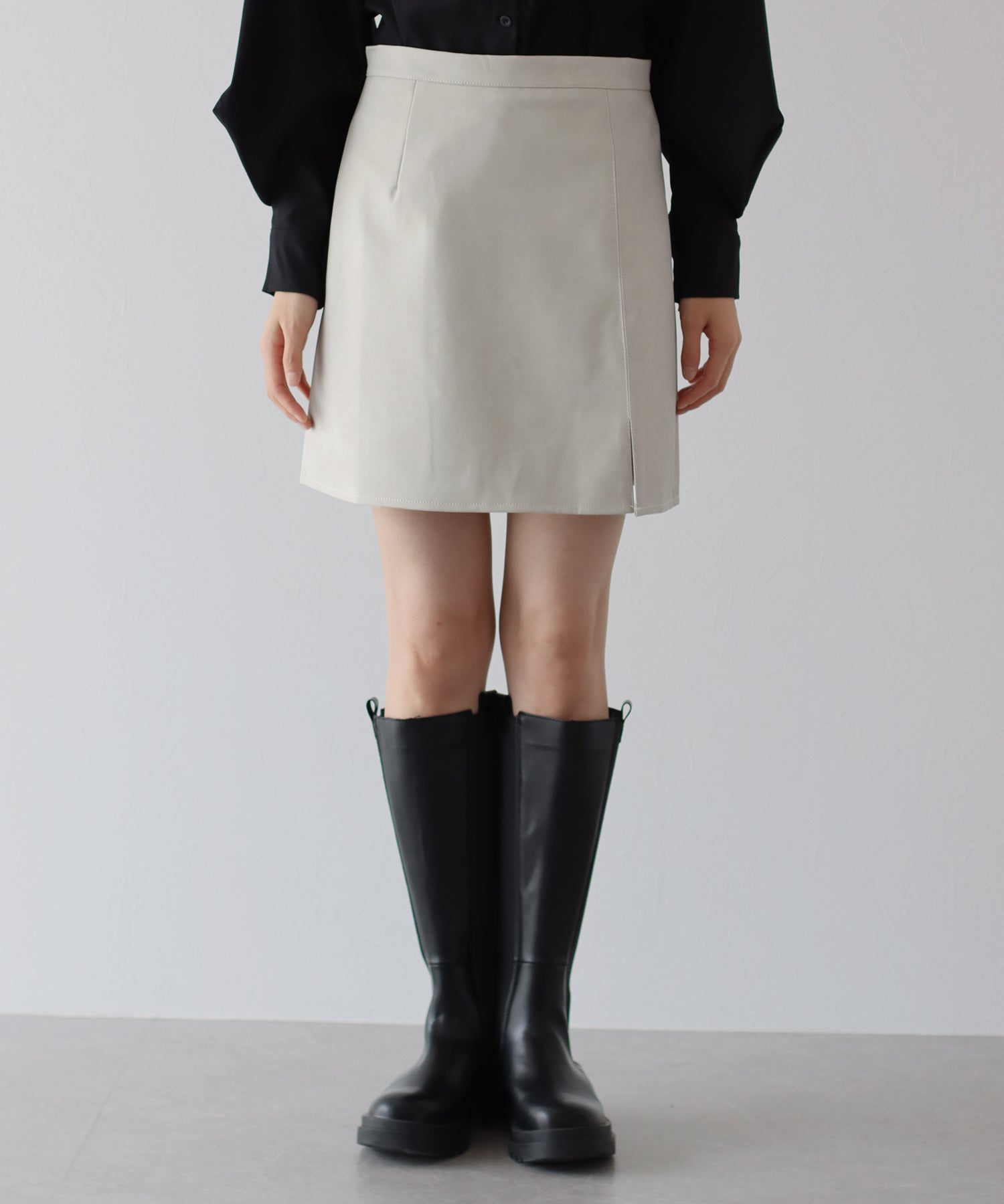 ミニ丈なのでレザーでも重たくならず、スリットがアクセントに。