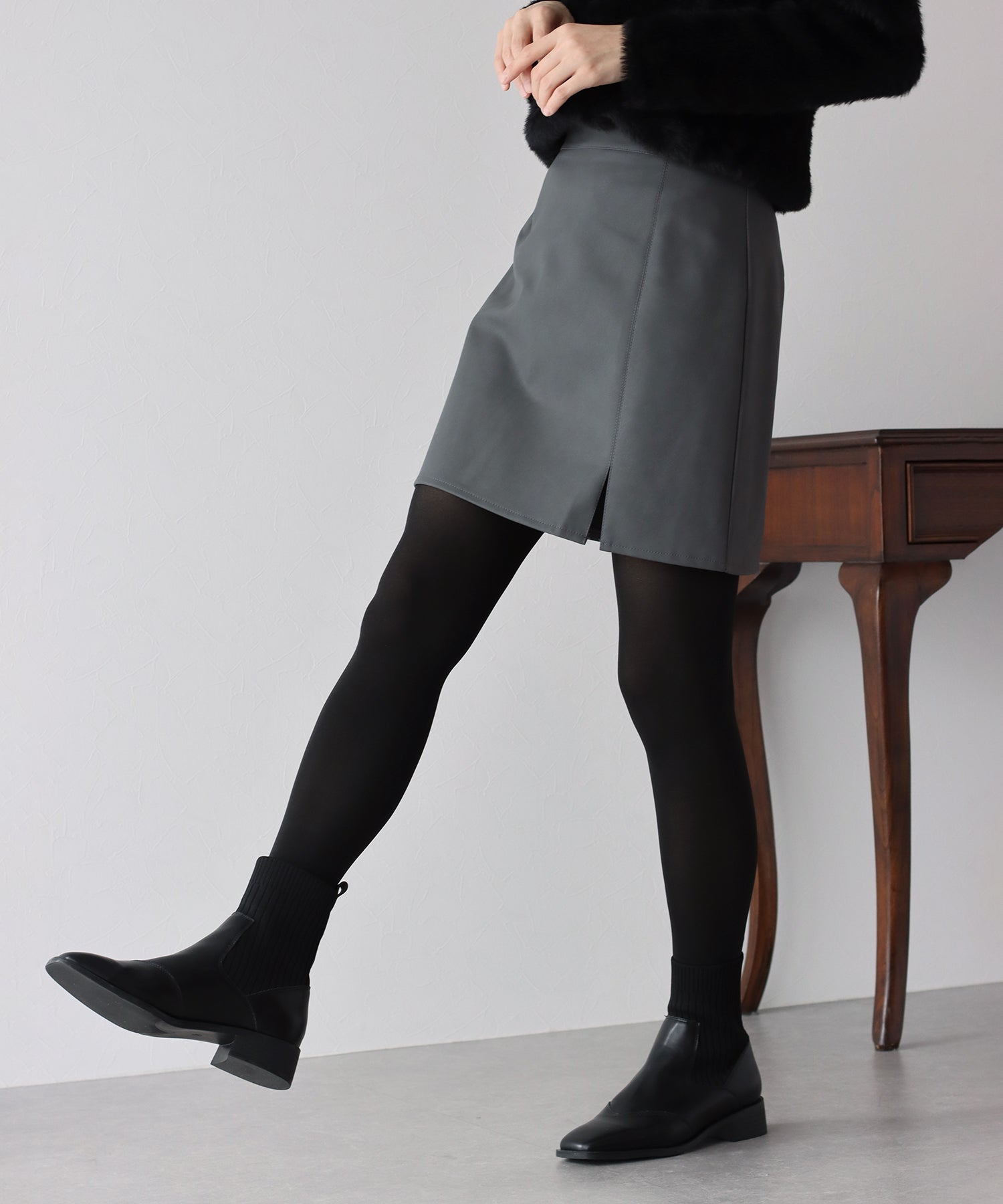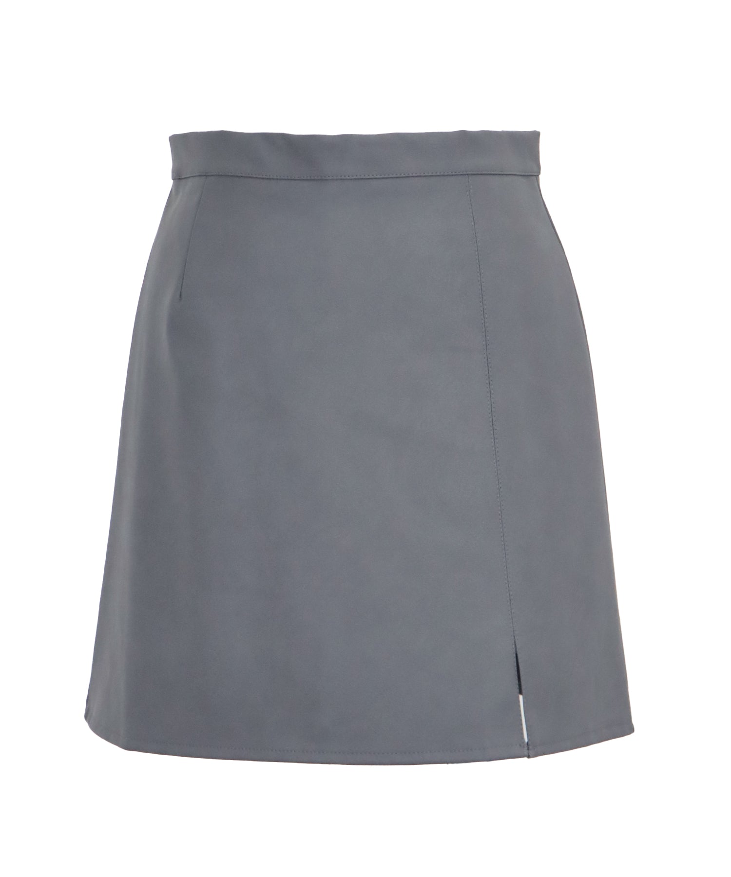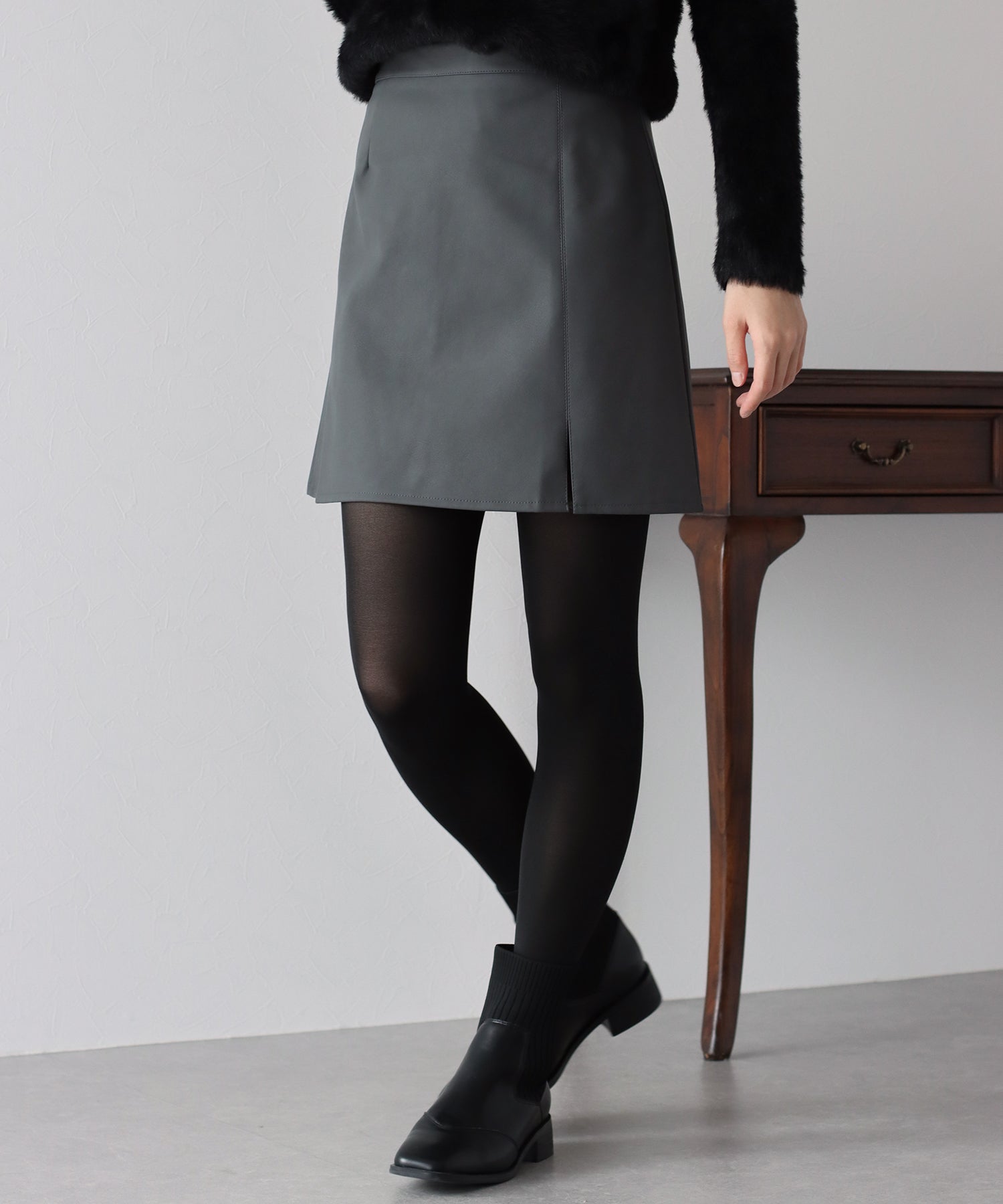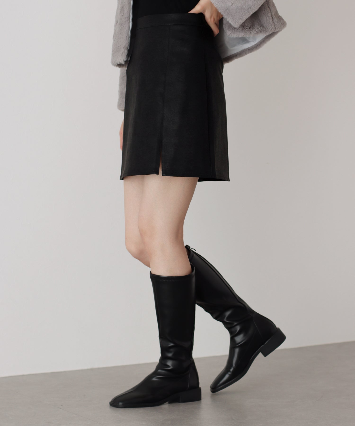 ミニ丈なのでレザーでも重たくならず、スリットがアクセントに。