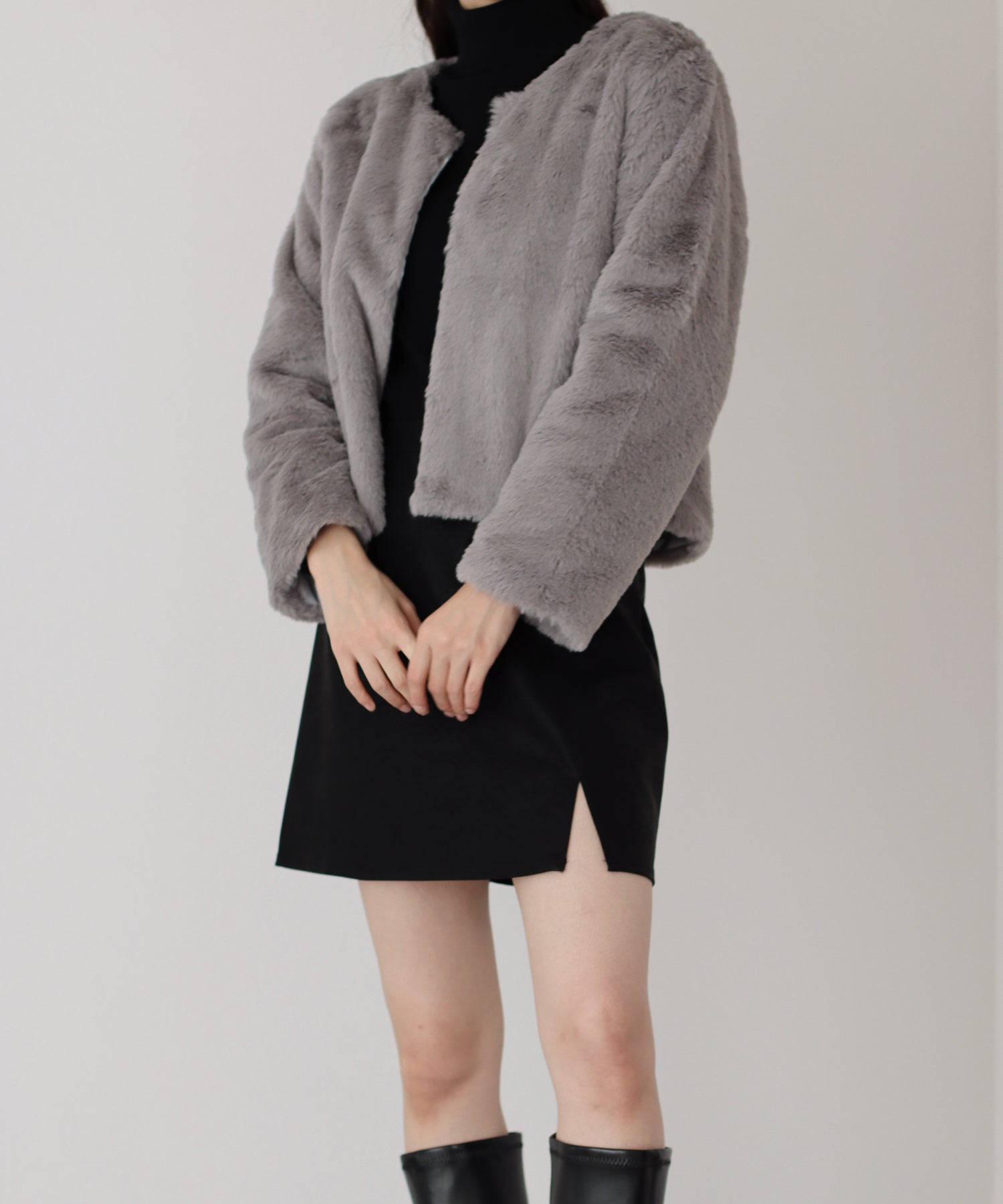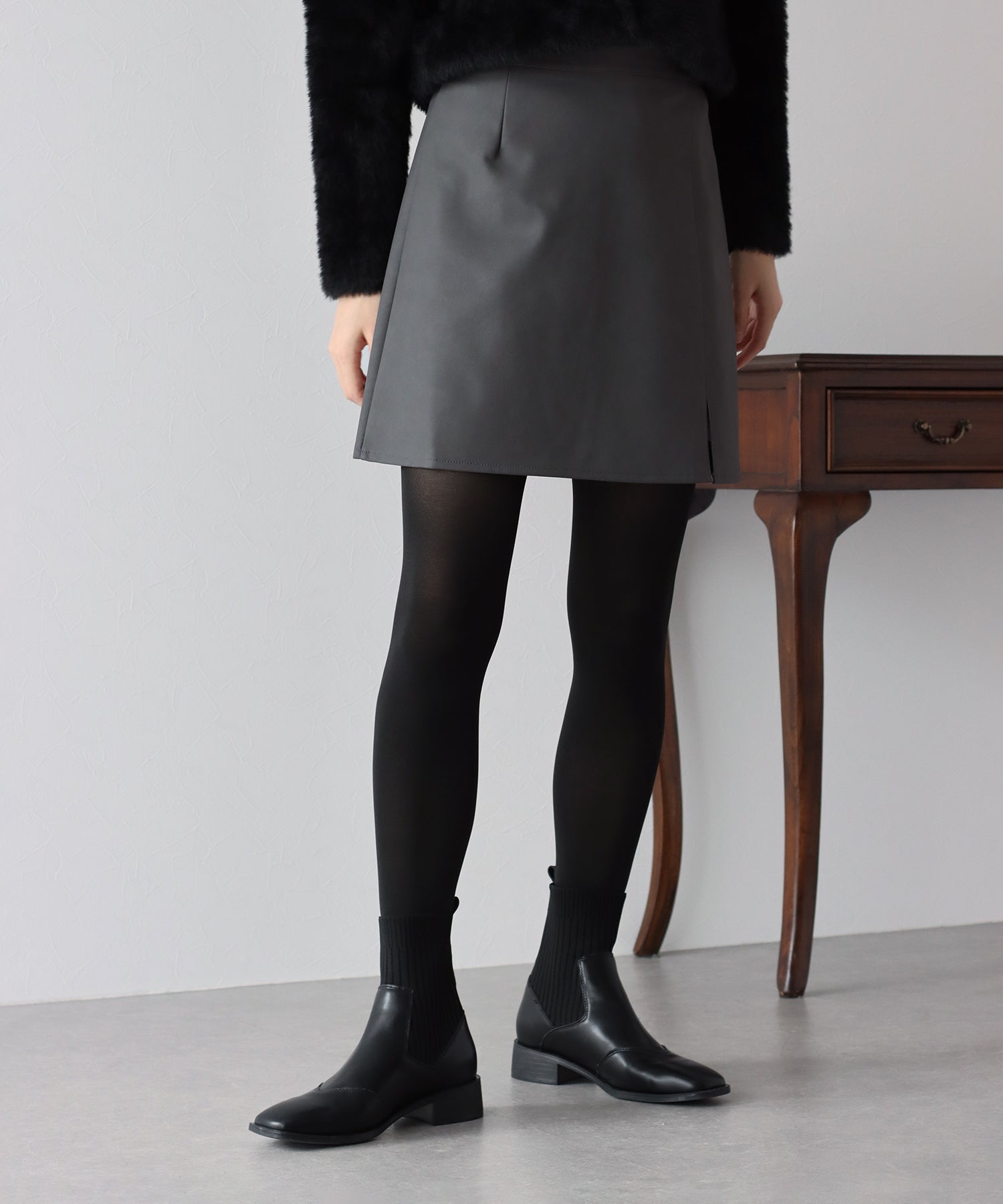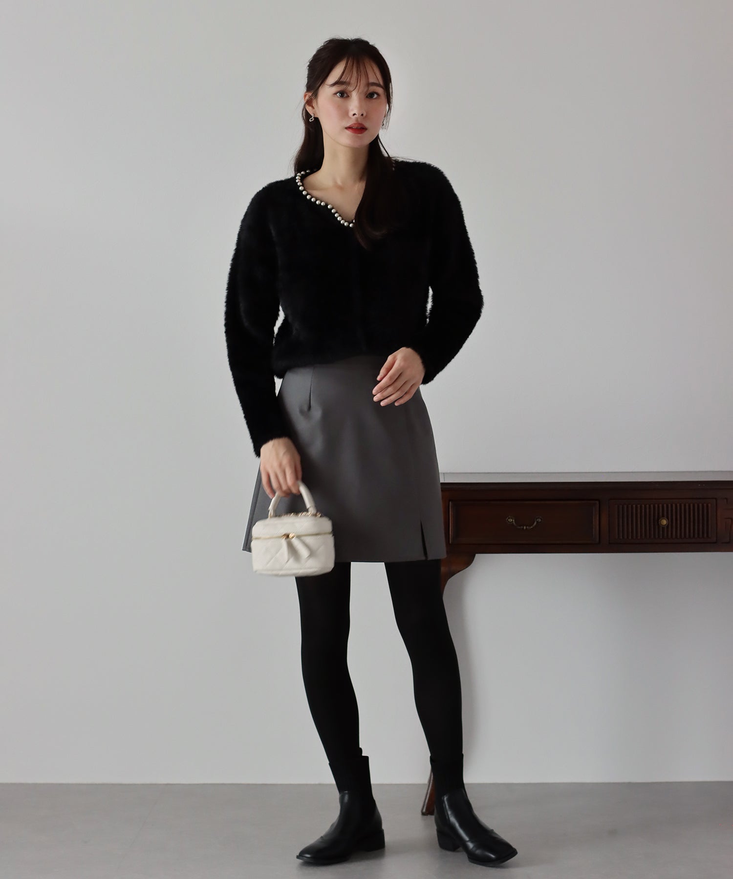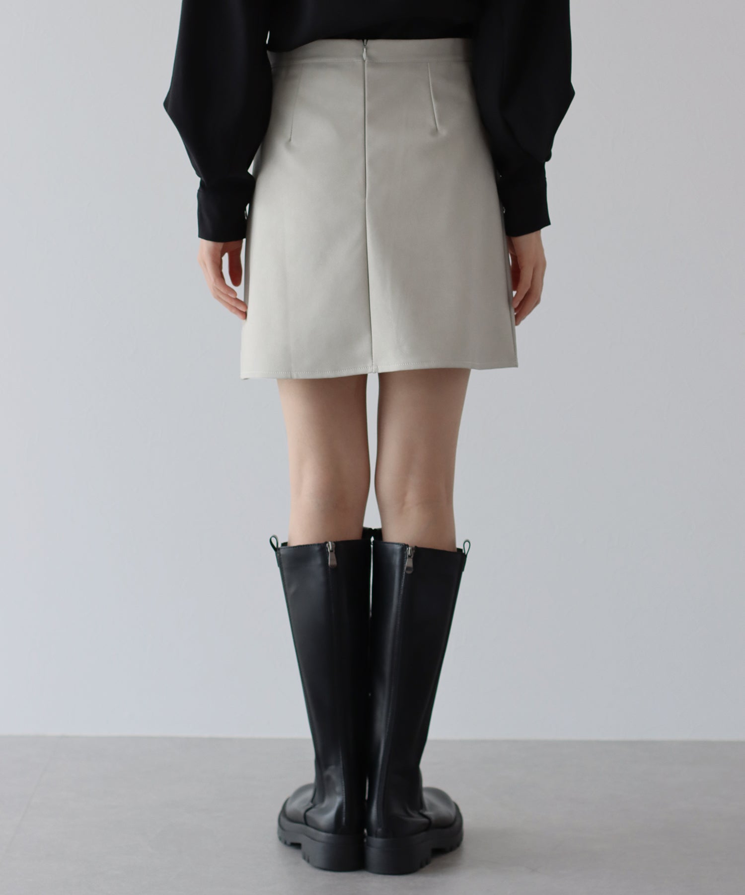 ミニ丈なのでレザーでも重たくならず、スリットがアクセントに。