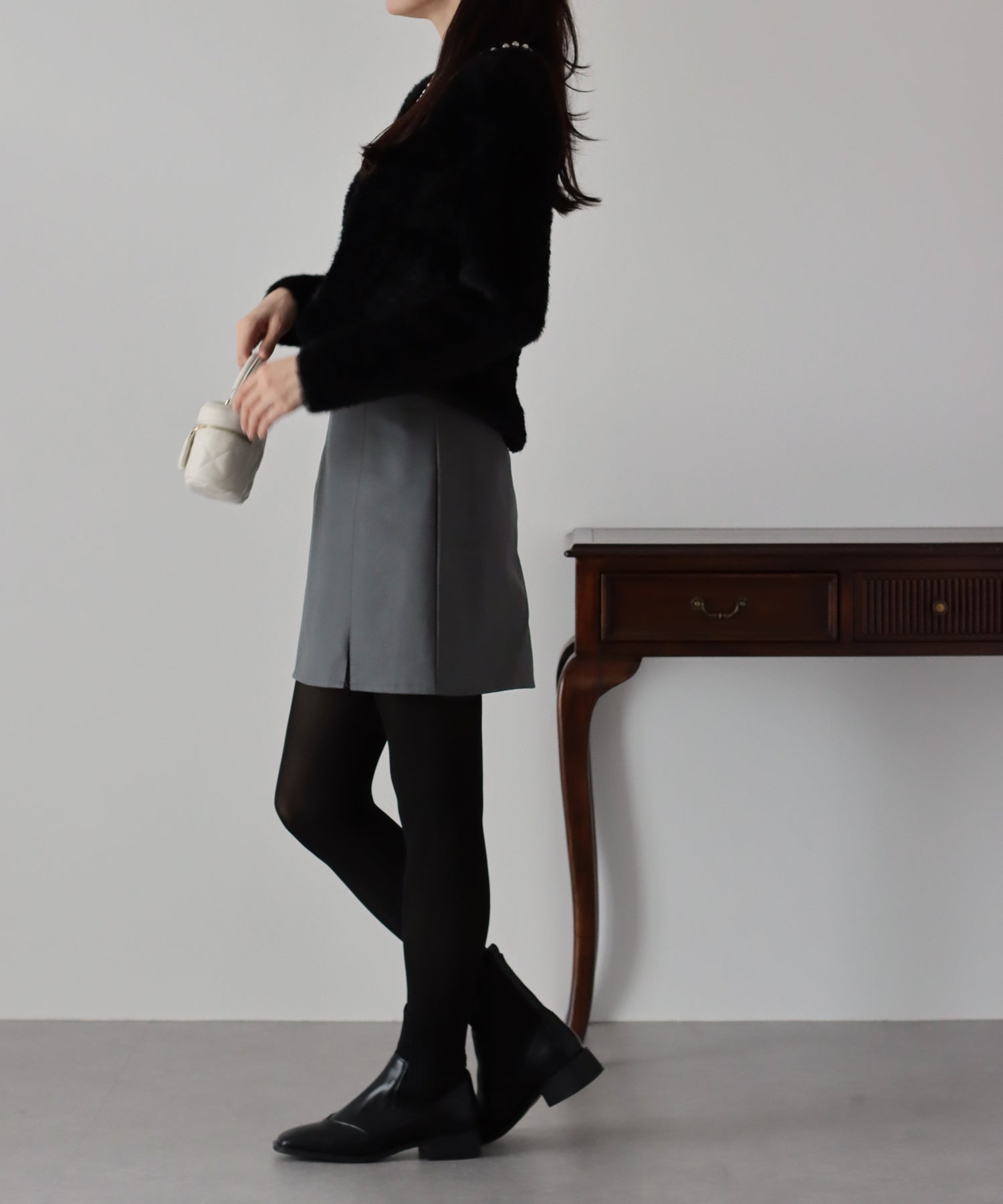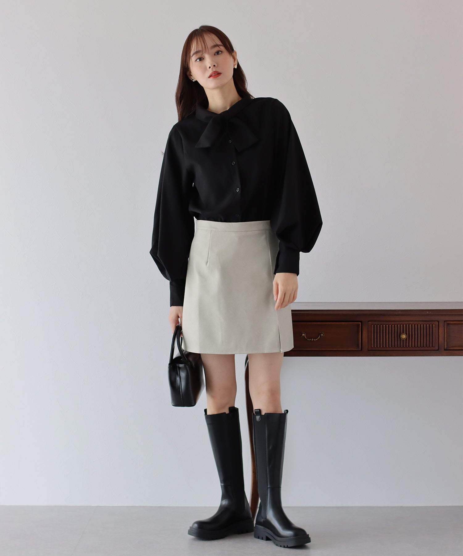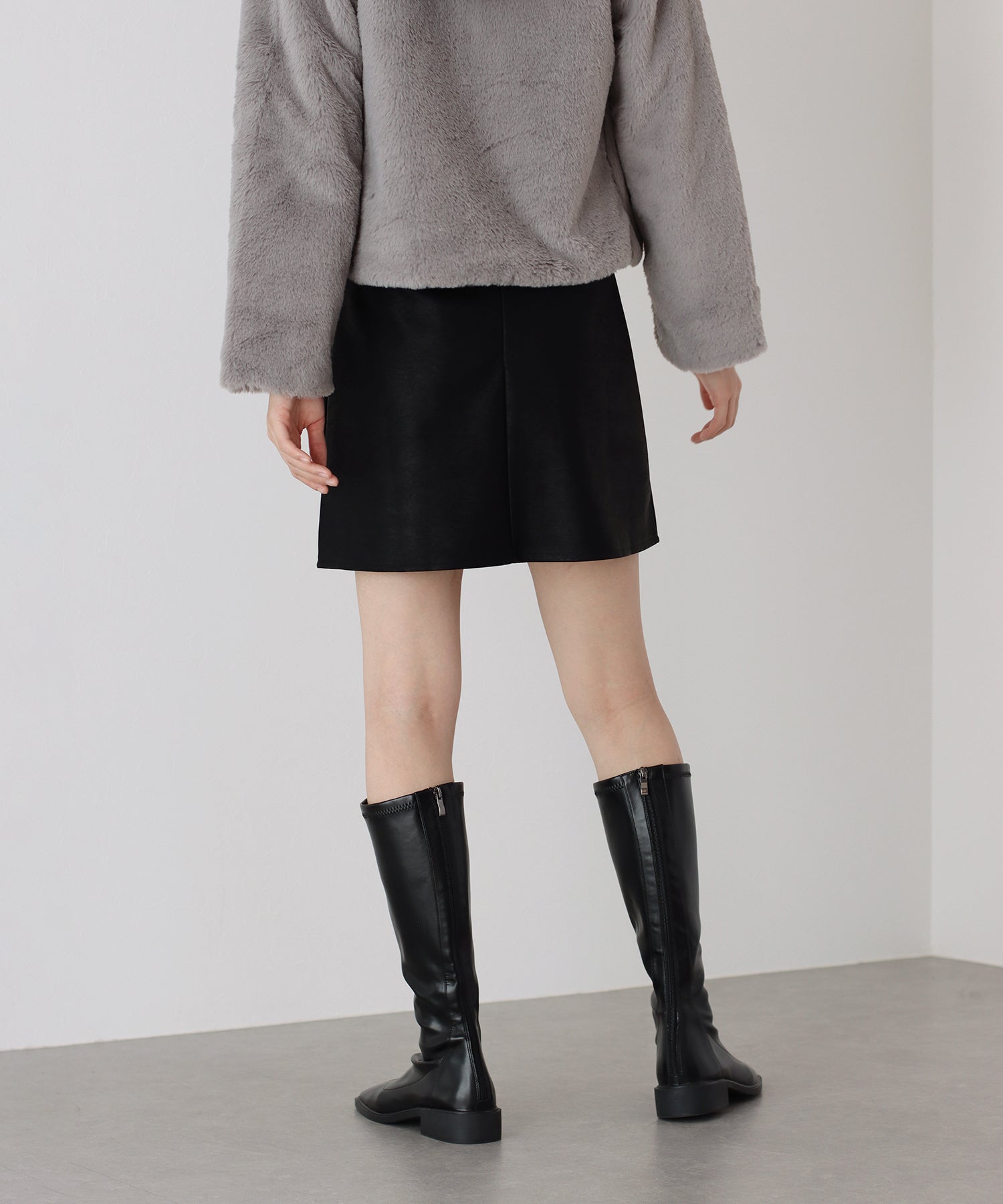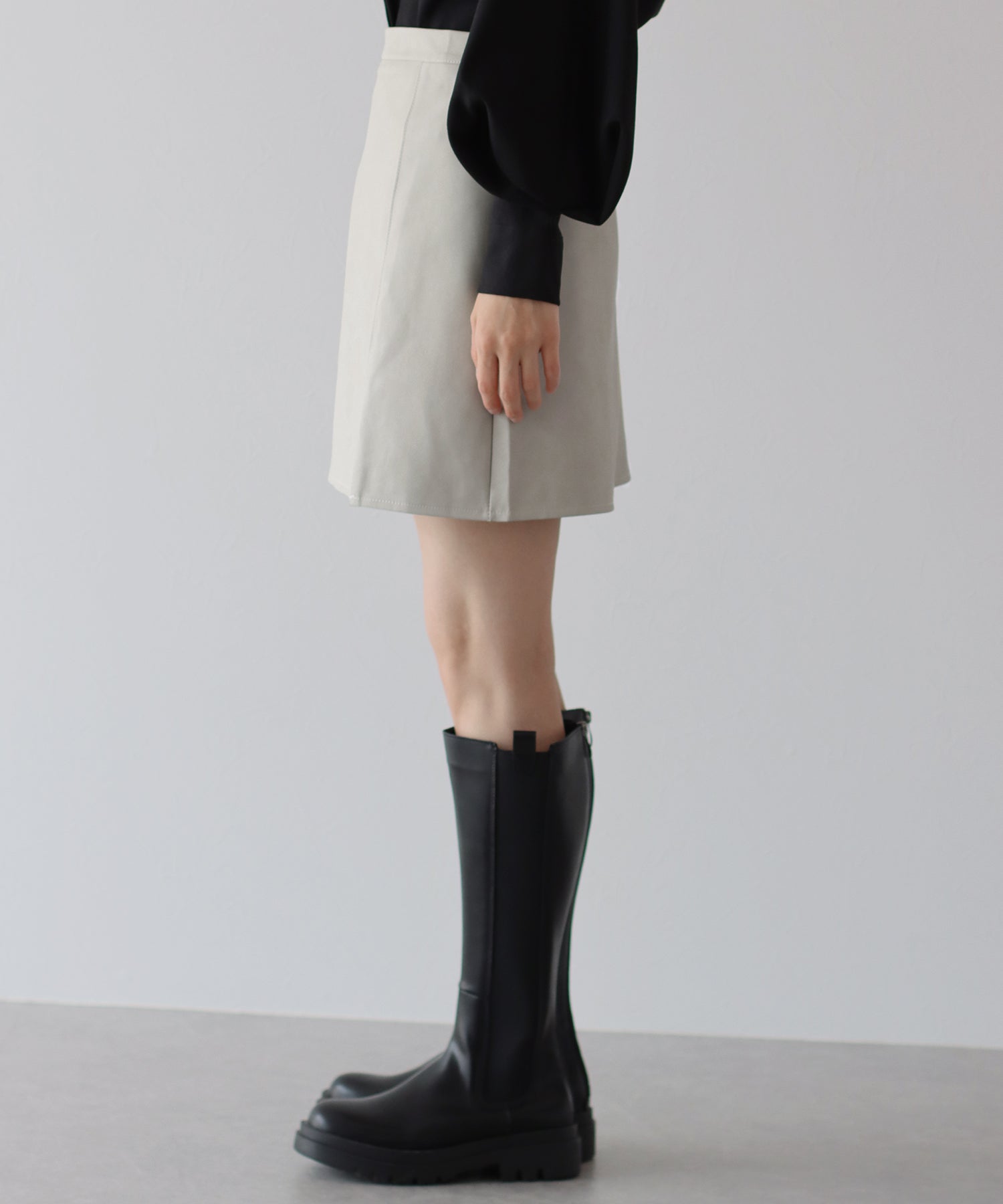 ミニ丈の台形シルエットスカートは脚長効果を期待できて、ロングブーツと合わせればトレンド感&美脚見え◎