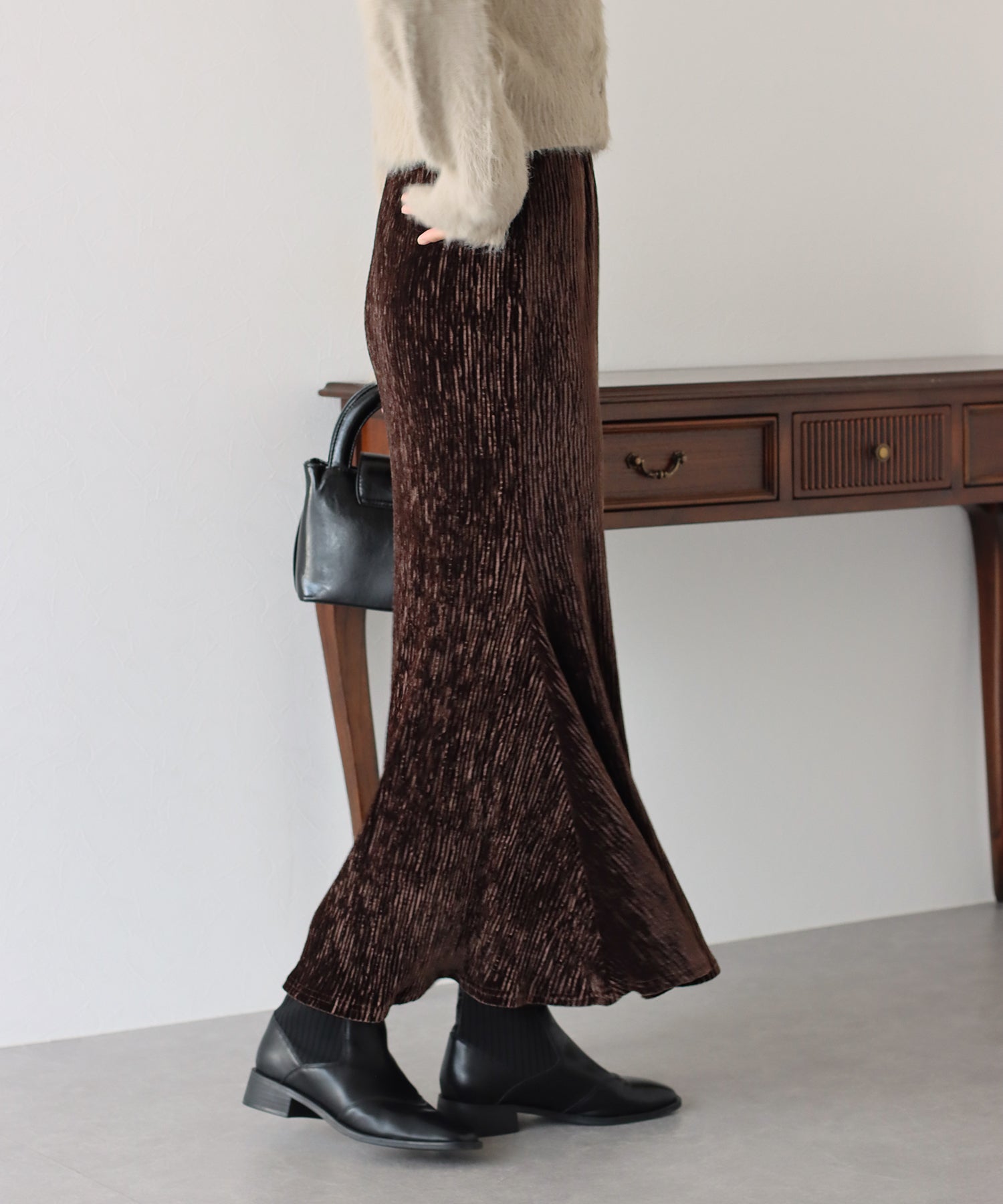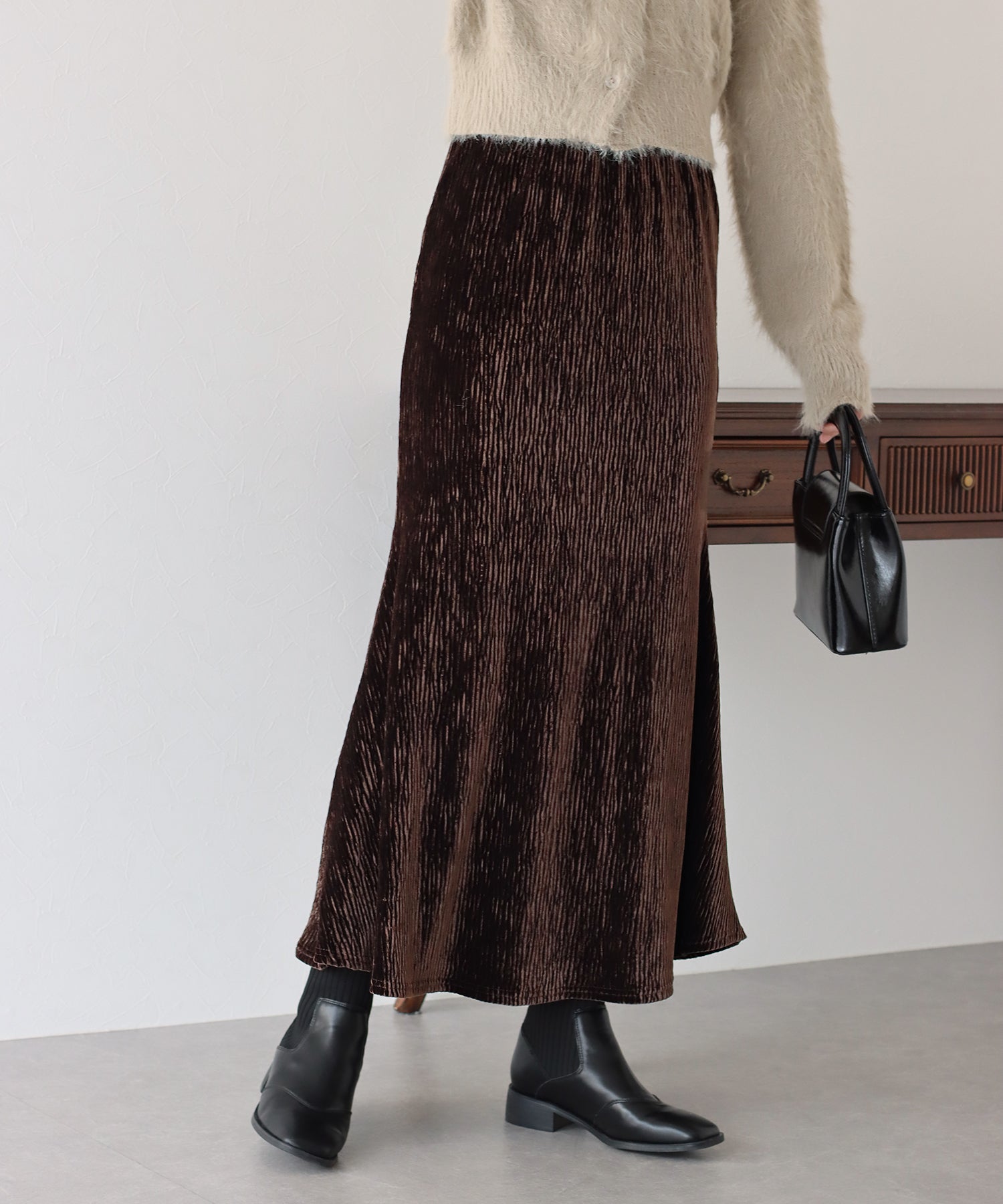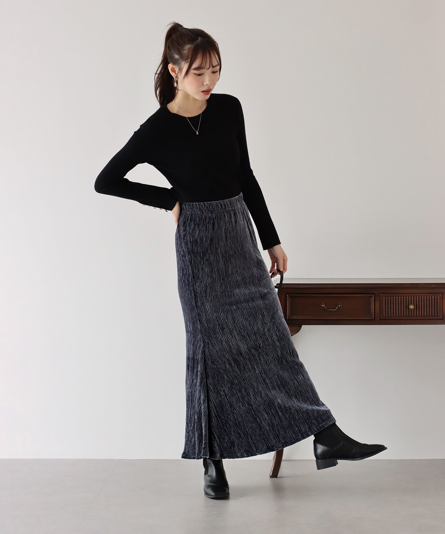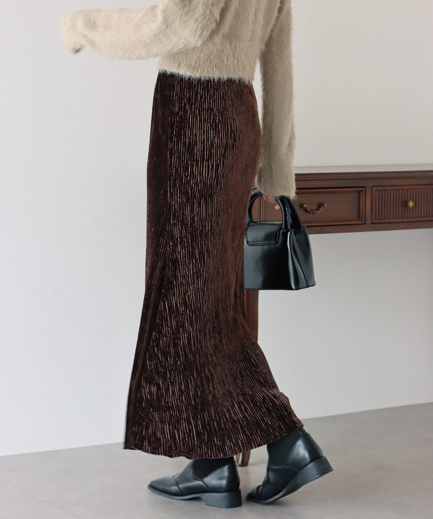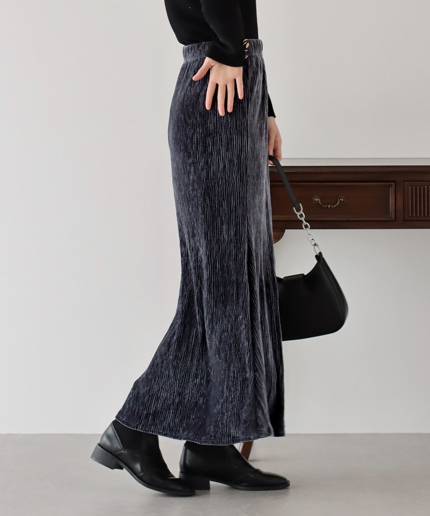 プリーツベロア素材のマーメイドスカート