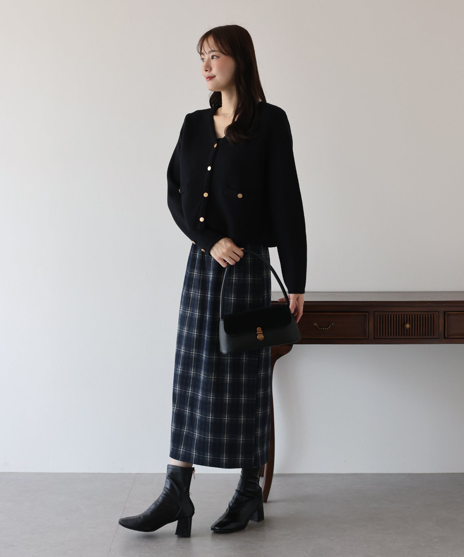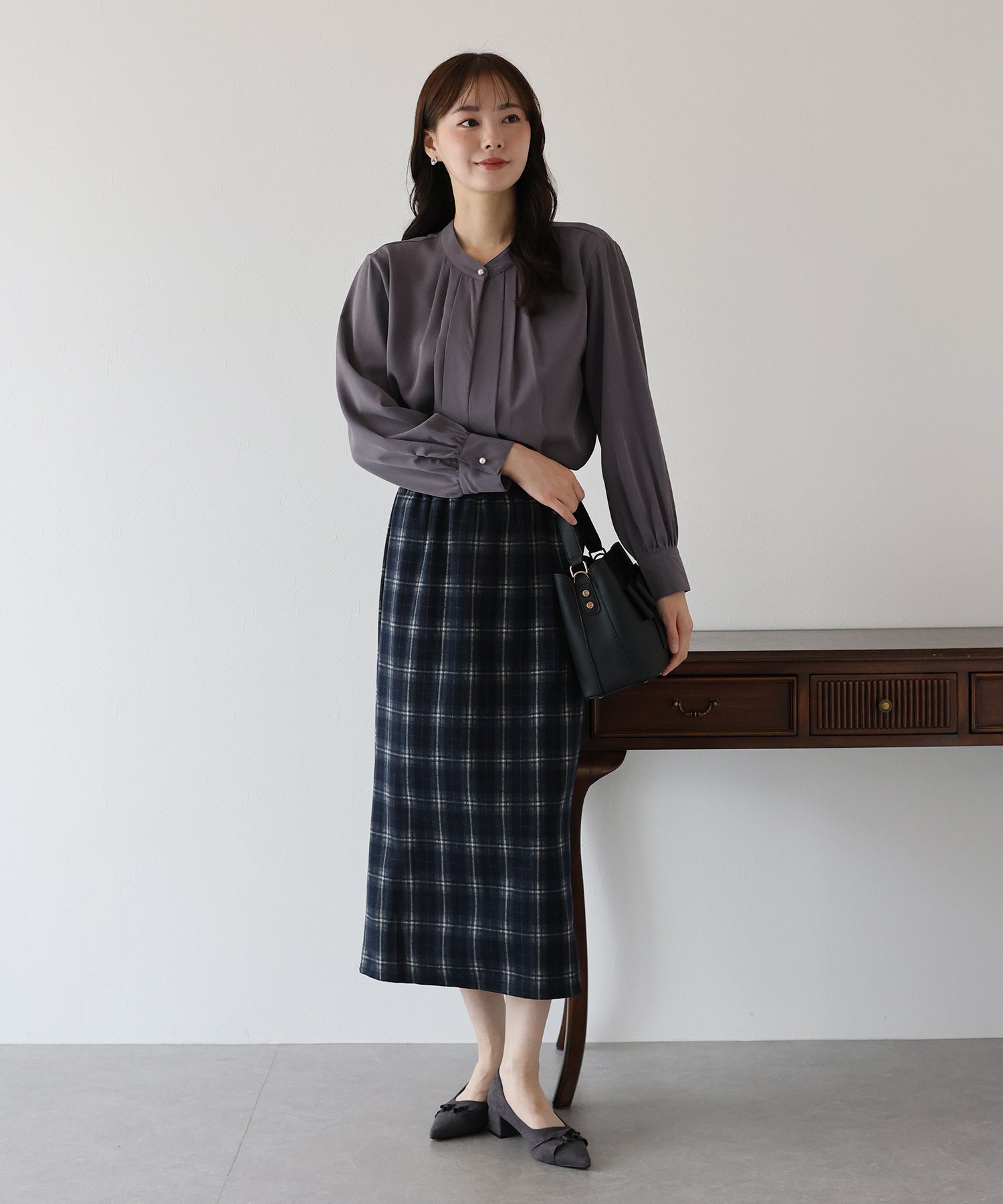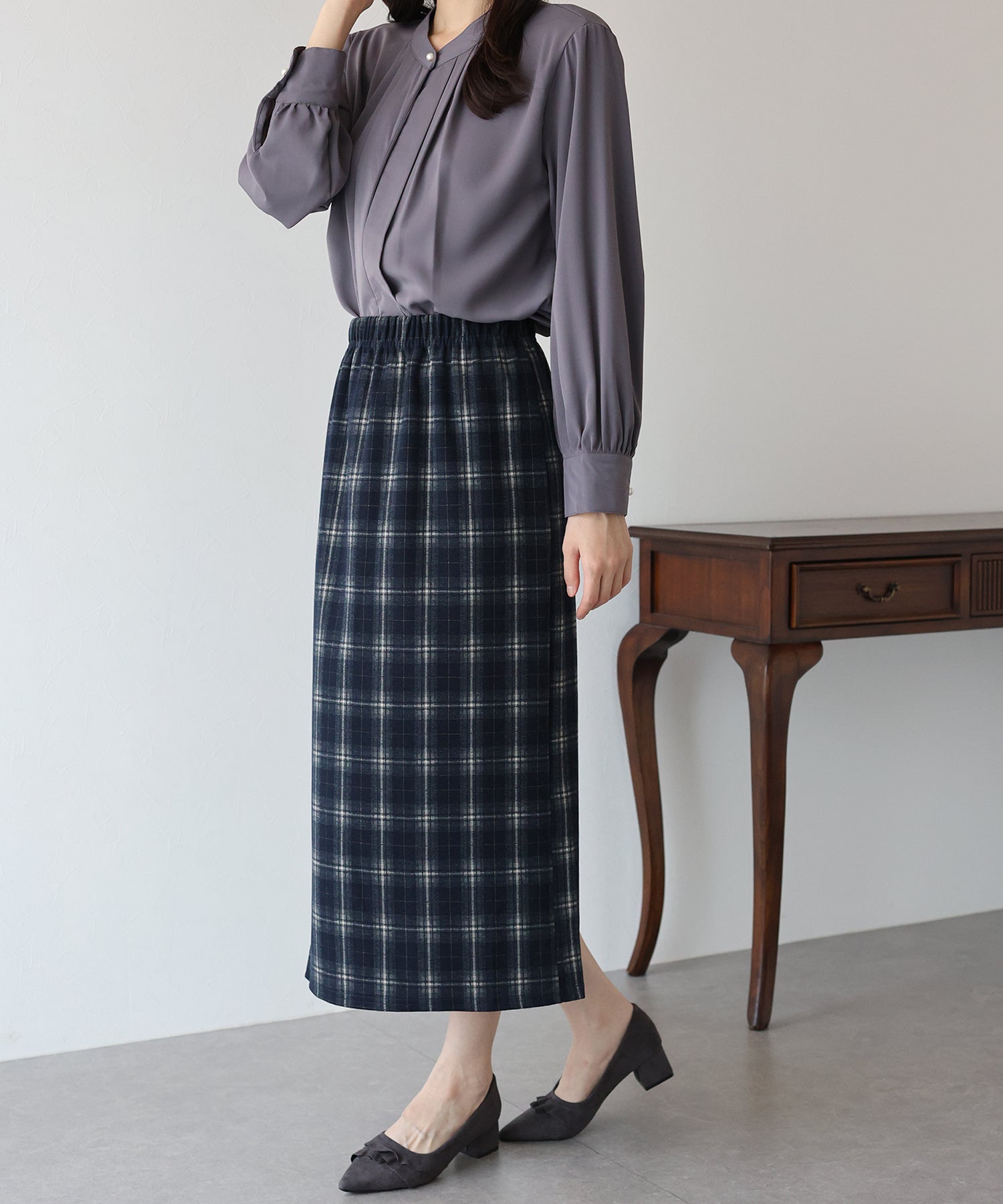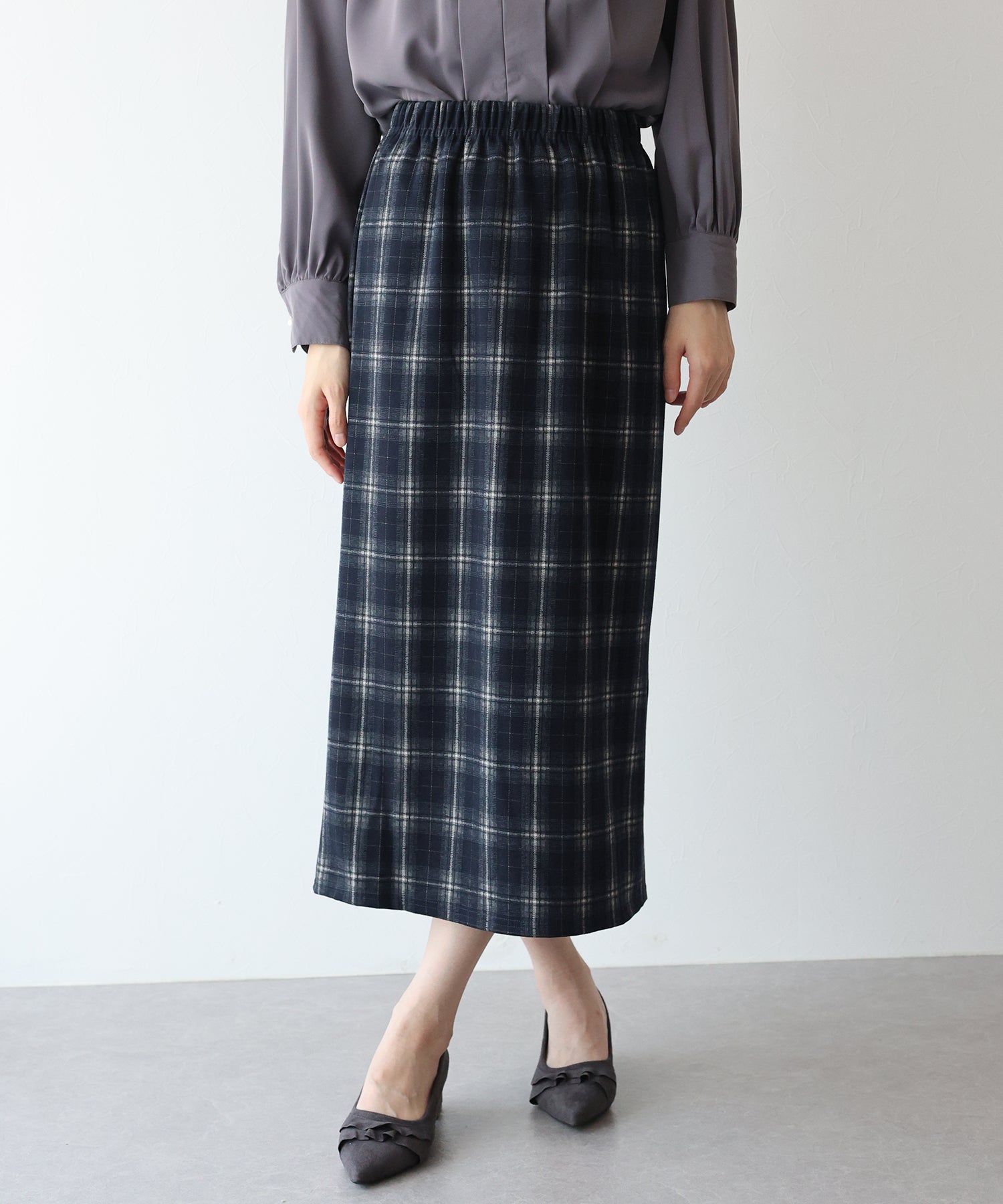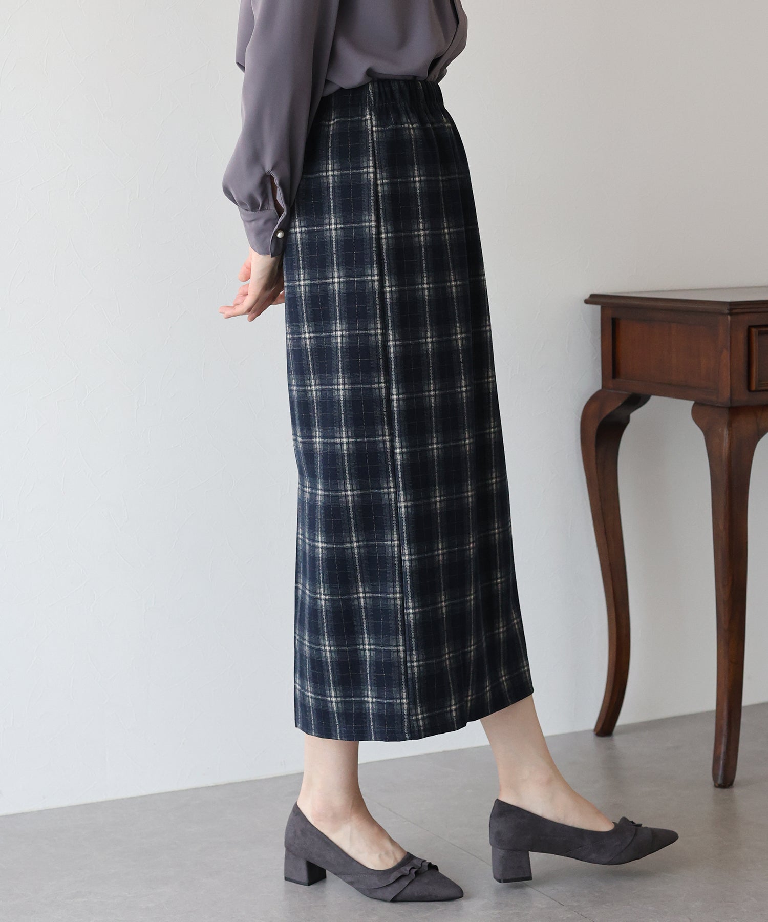 秋冬を先取りできるチェック柄が目を引くタイトスカート。