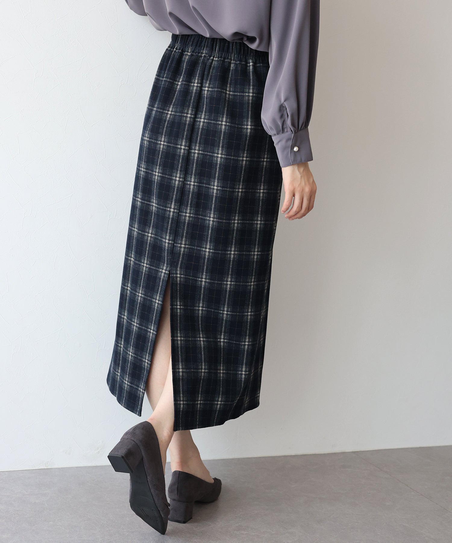 バックスリットで抜け感をプラスし、ゴムウエストで着心地も抜群です。