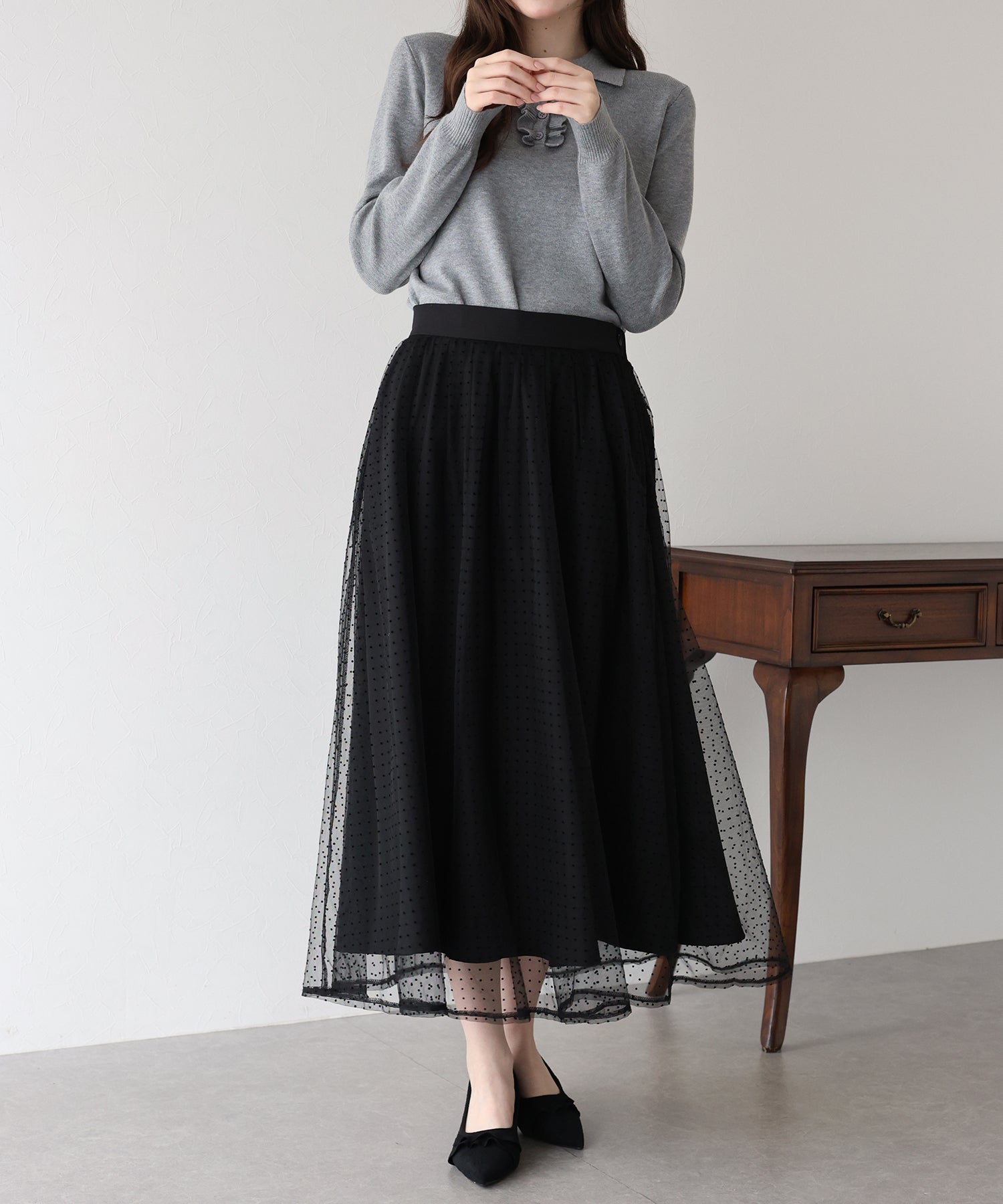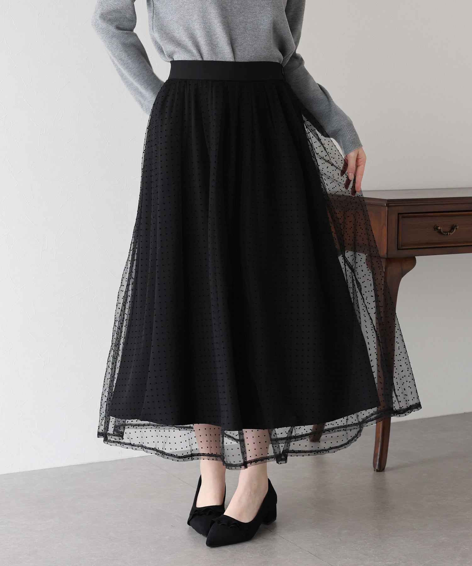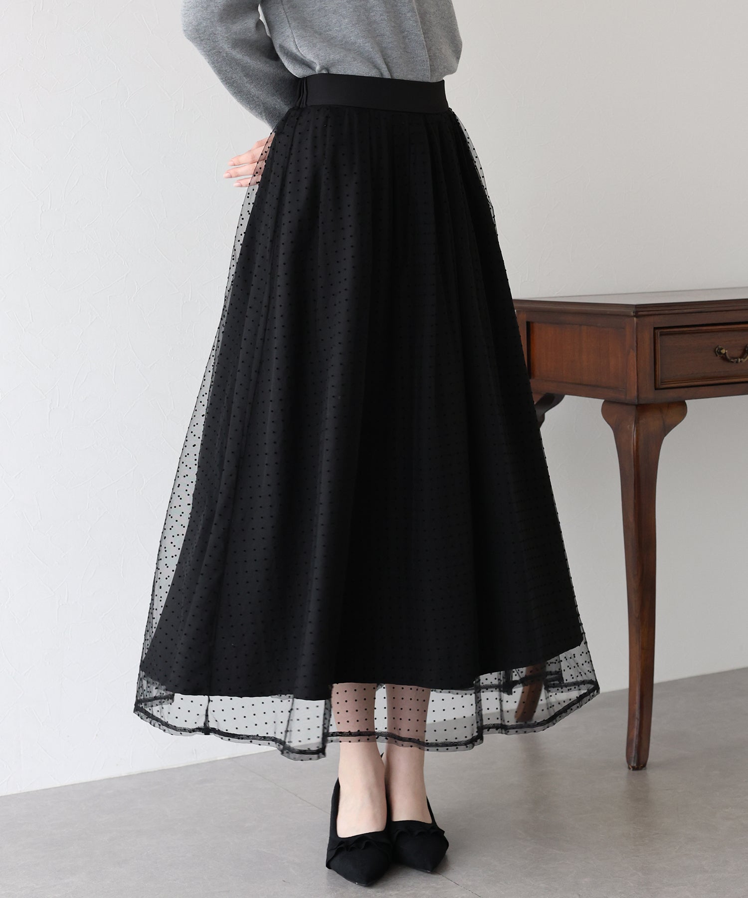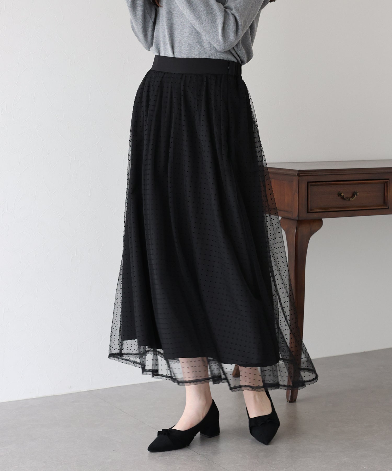 ふわっと軽いチュールスカートですが、フロッキープリントが施され秋冬らしい雰囲気にコーデをまとめてくれます。