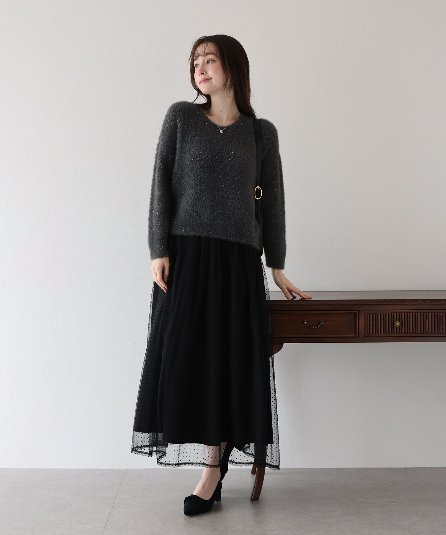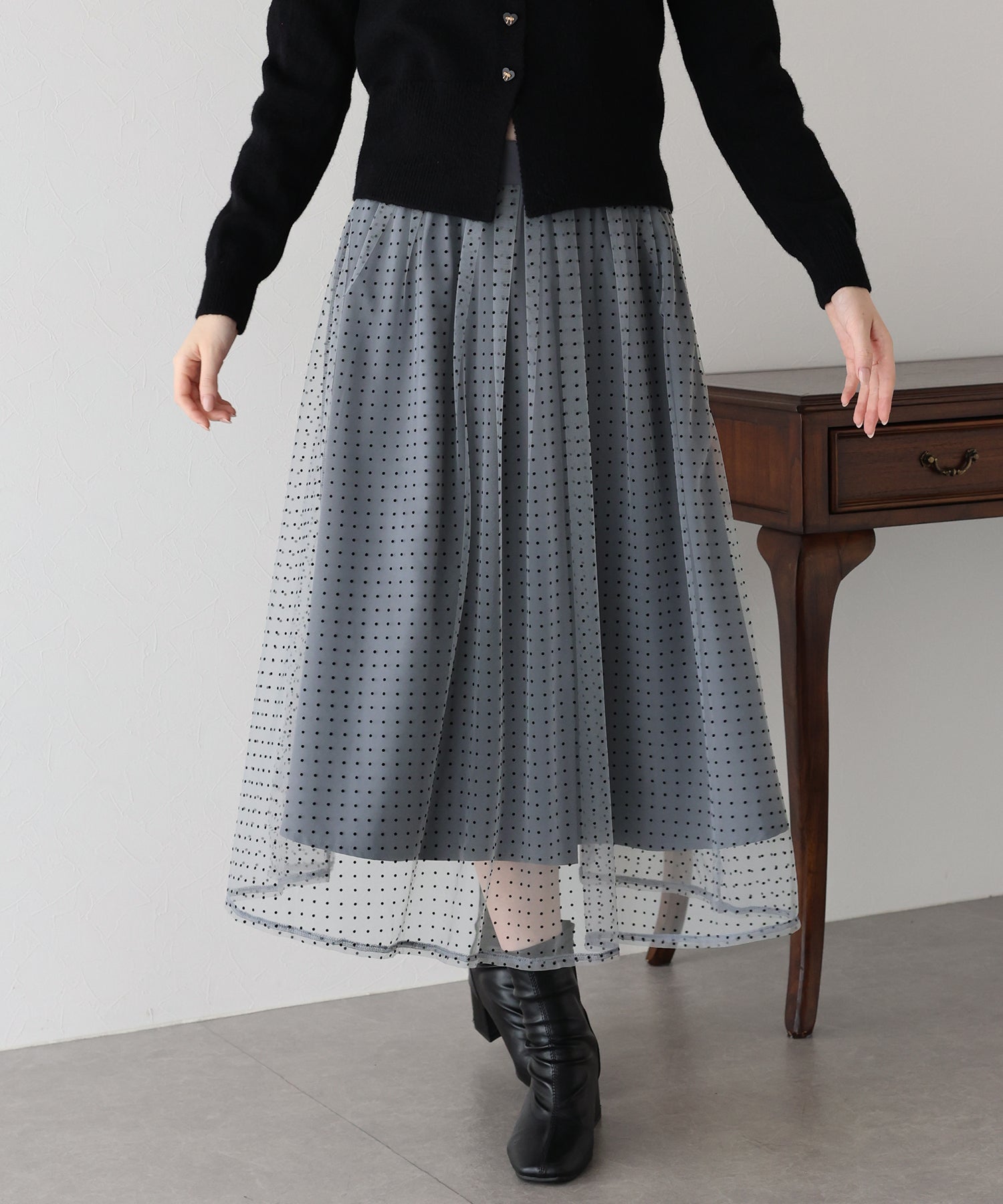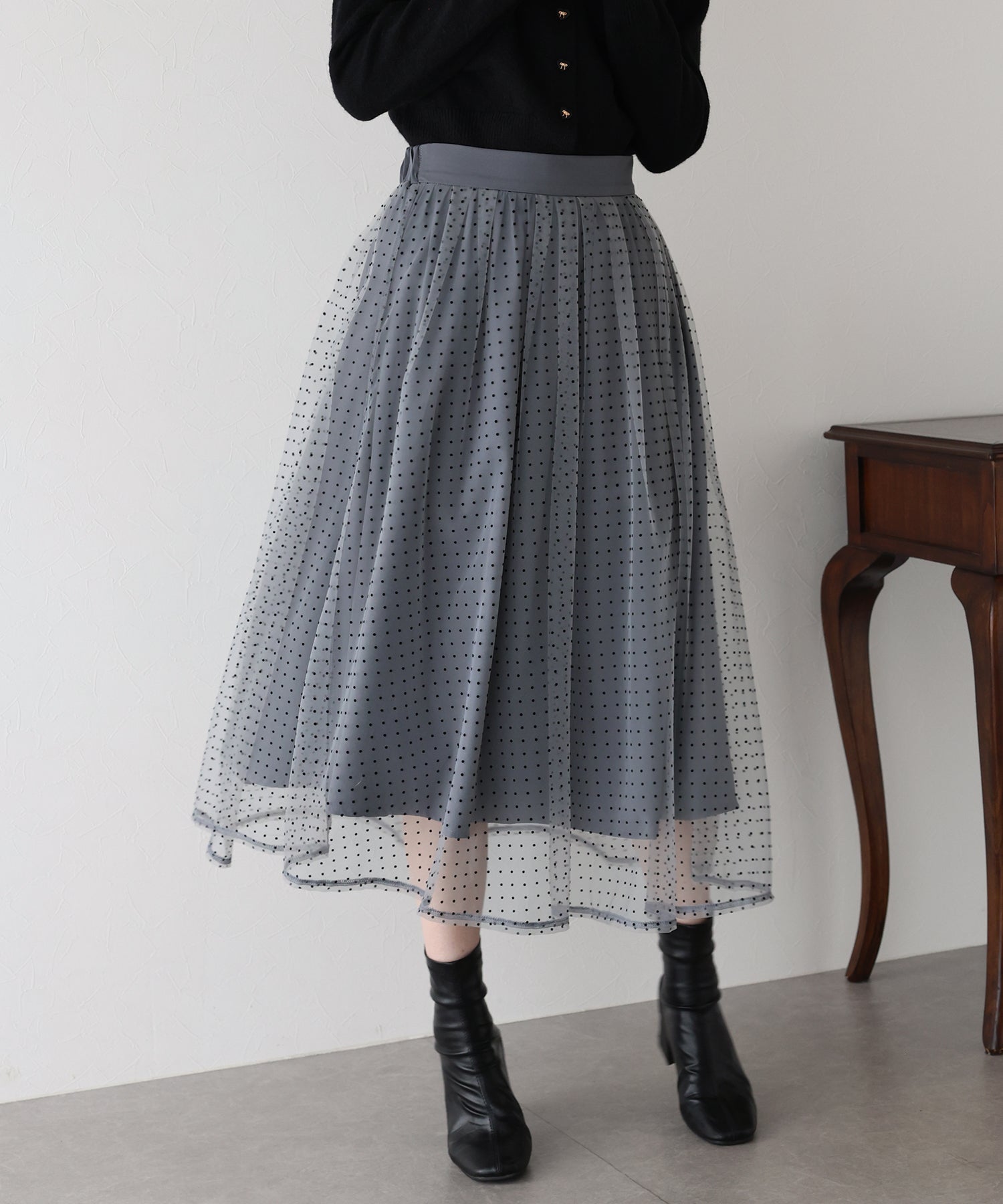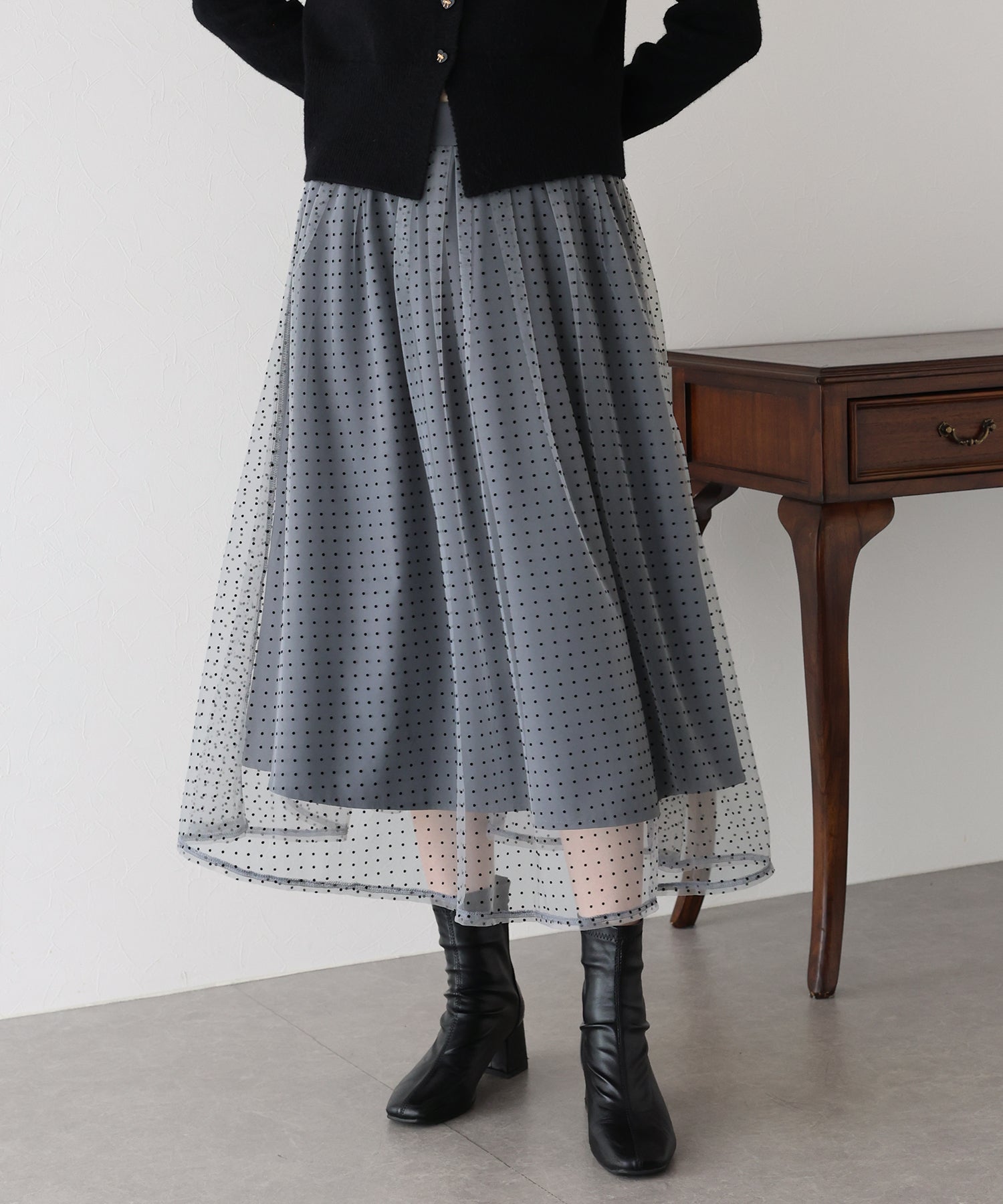 ふわっと軽いチュールスカートですが、フロッキープリントが施され秋冬らしい雰囲気にコーデをまとめてくれます。