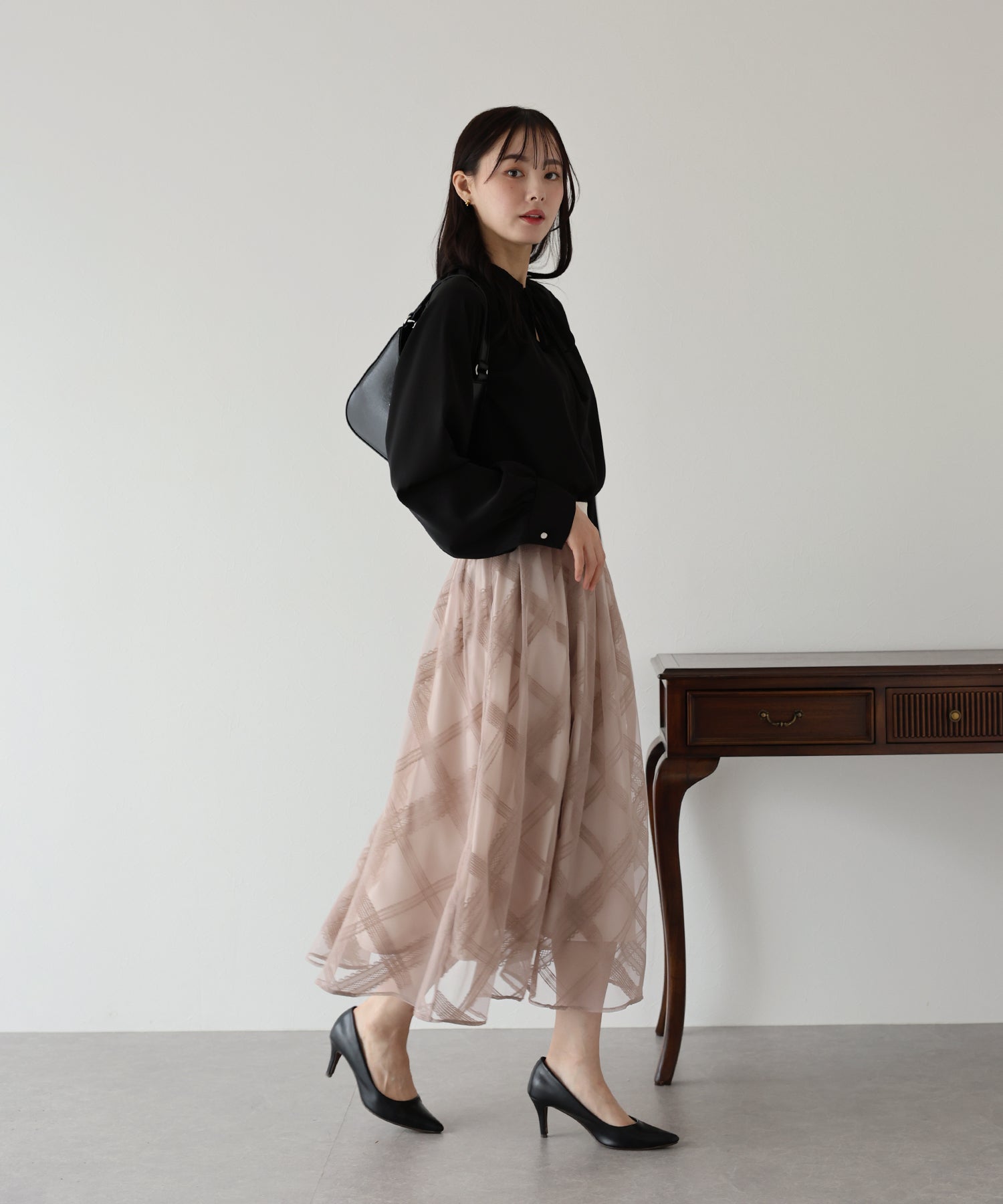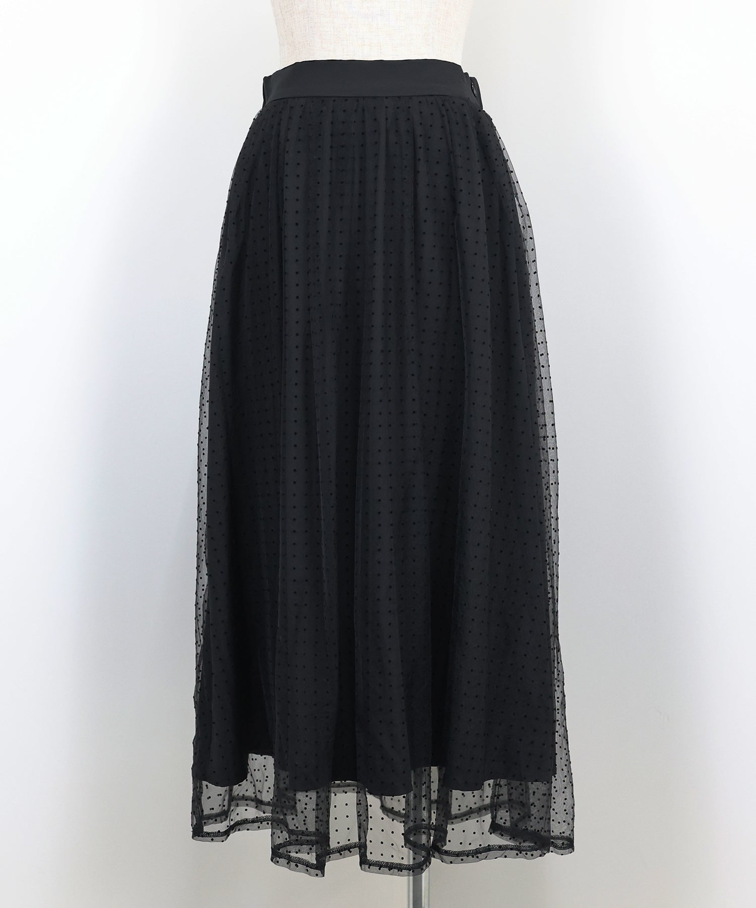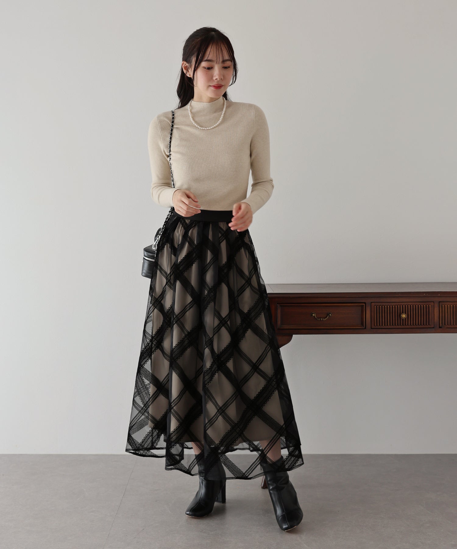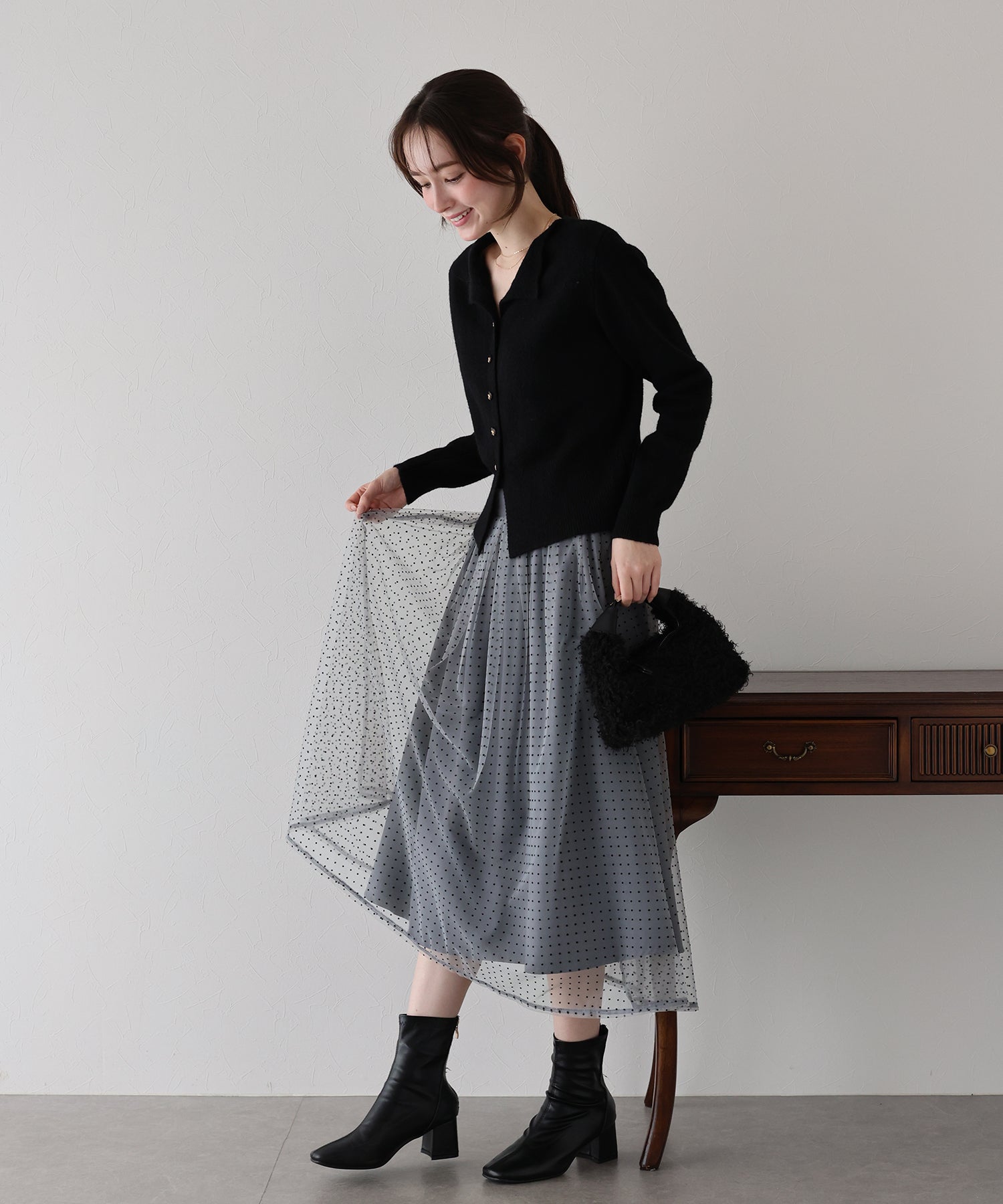 ふわっと軽いチュールスカートですが、フロッキープリントが施され秋冬らしい雰囲気にコーデをまとめてくれます。