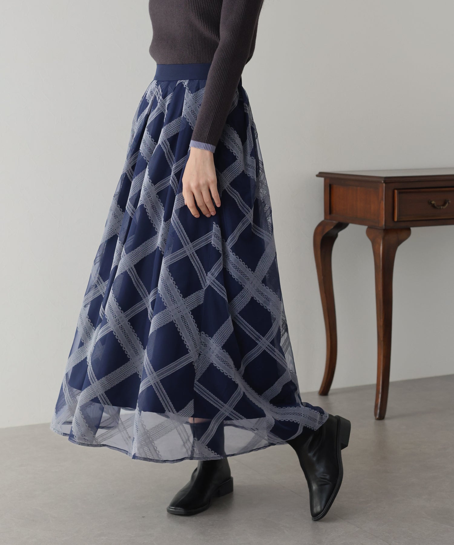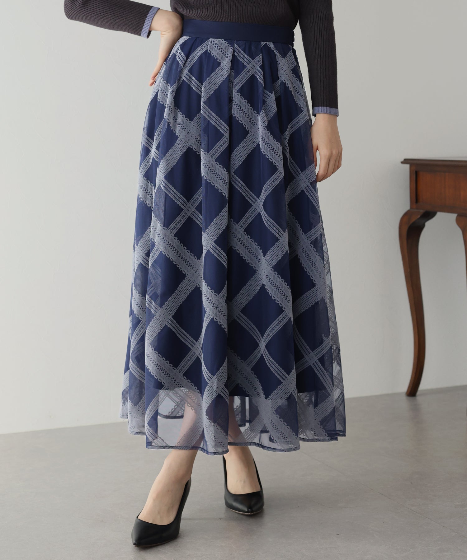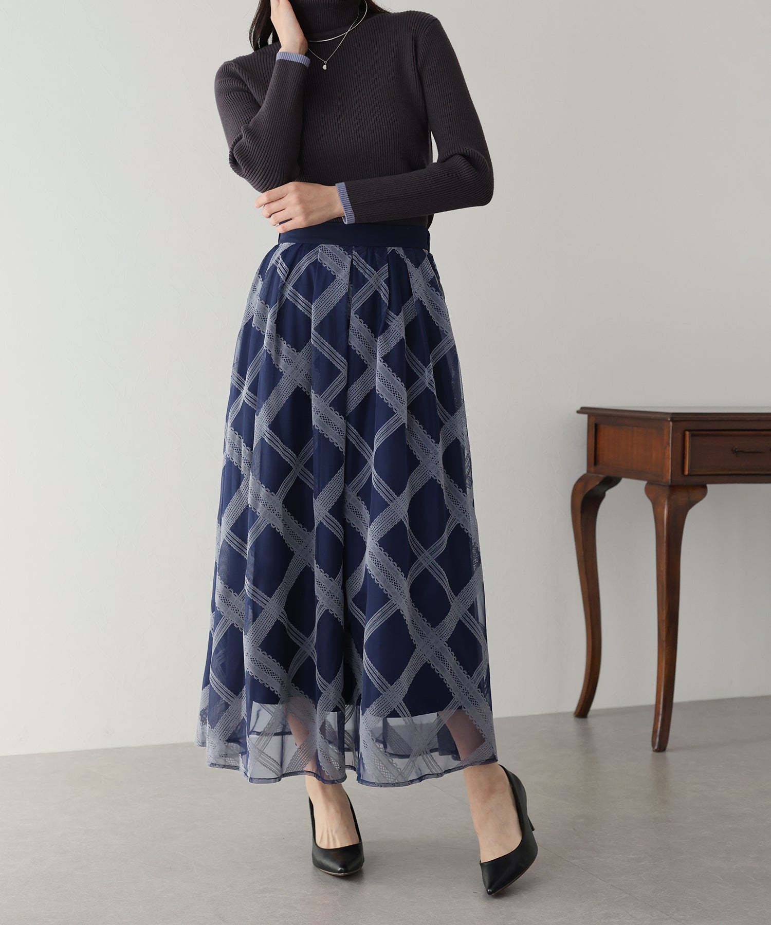 レースのようなチェック柄がクラシカルで大人ガーリーな印象に。