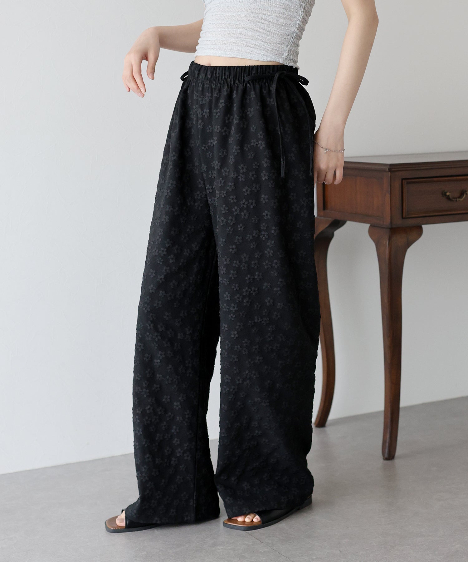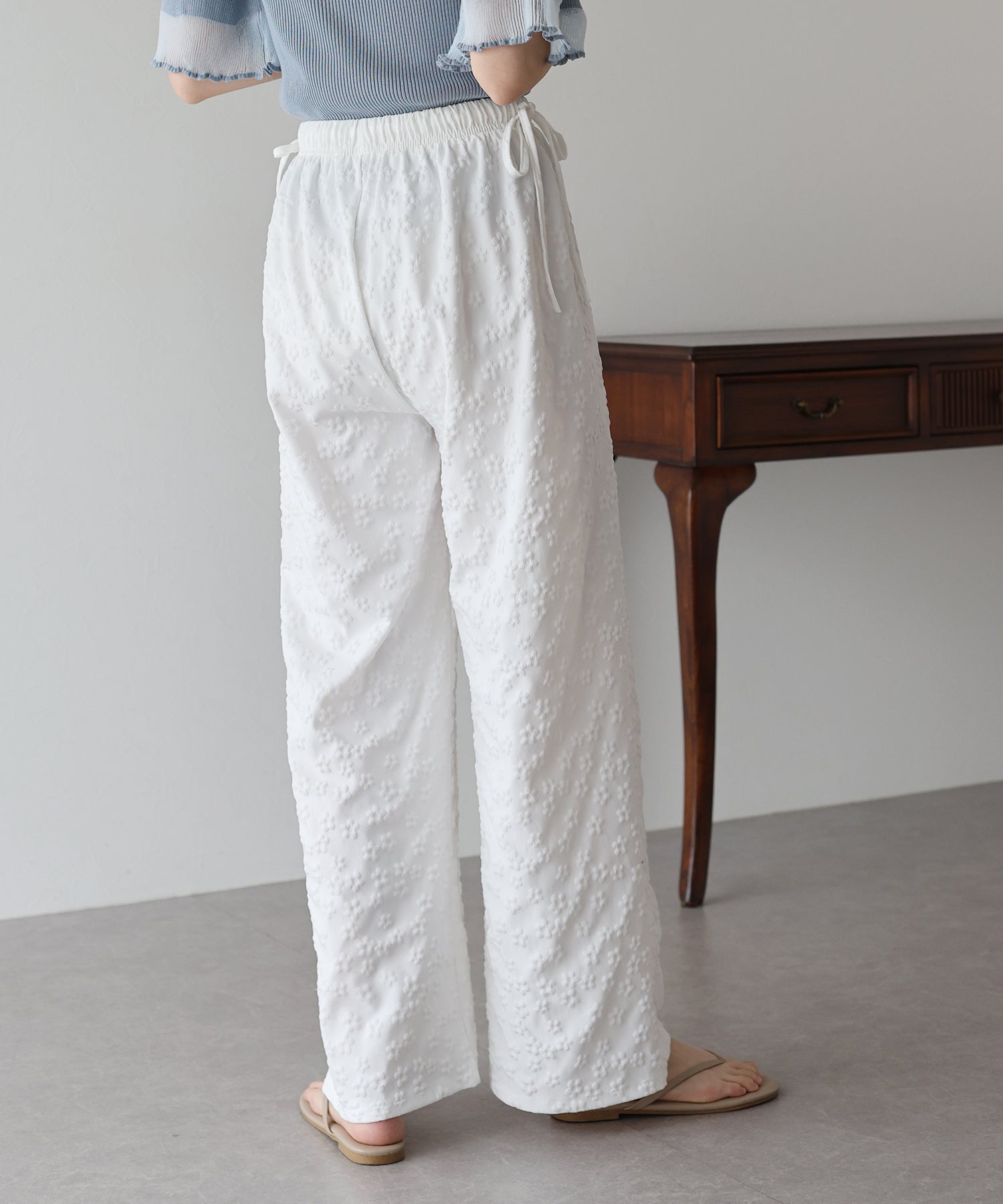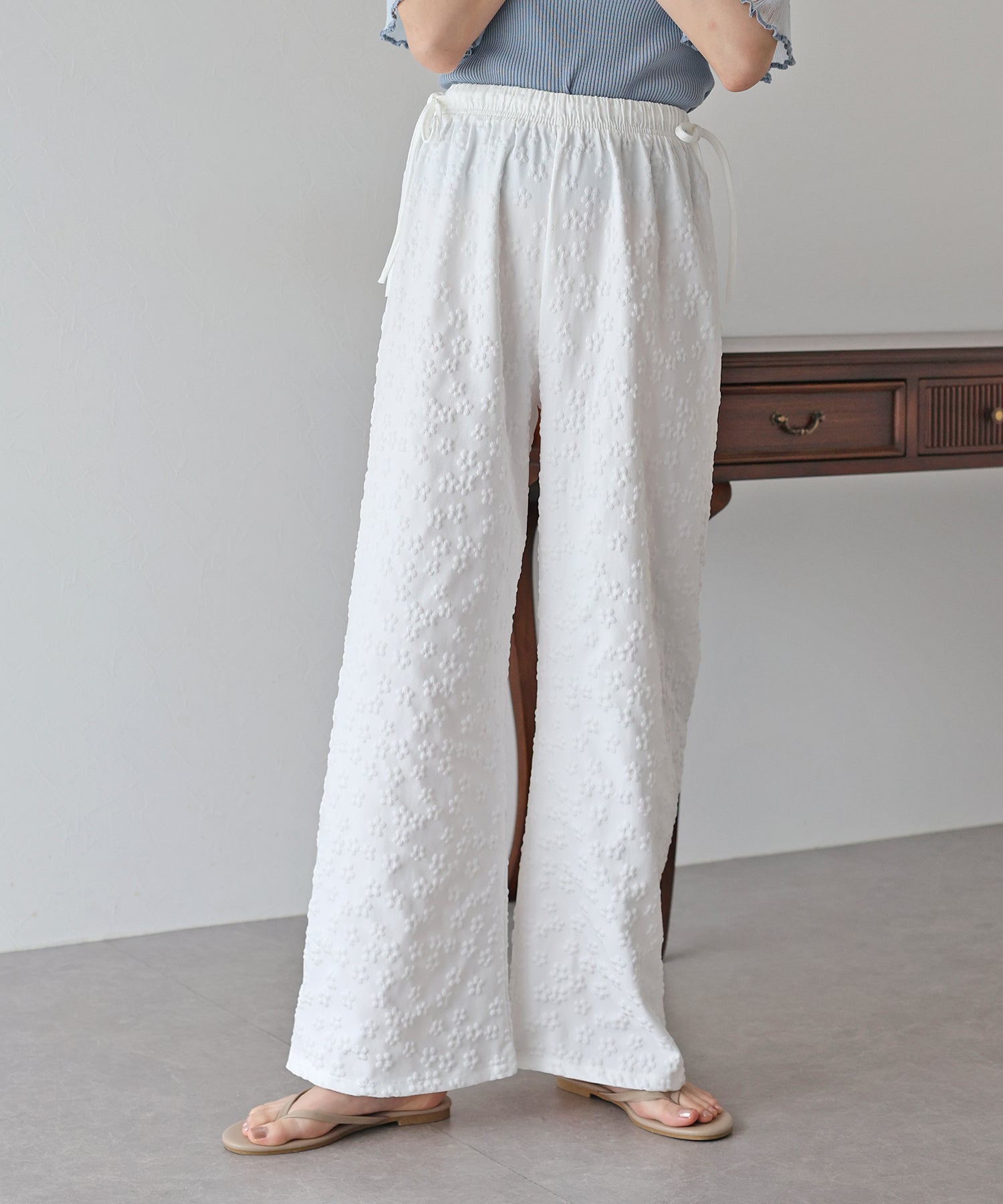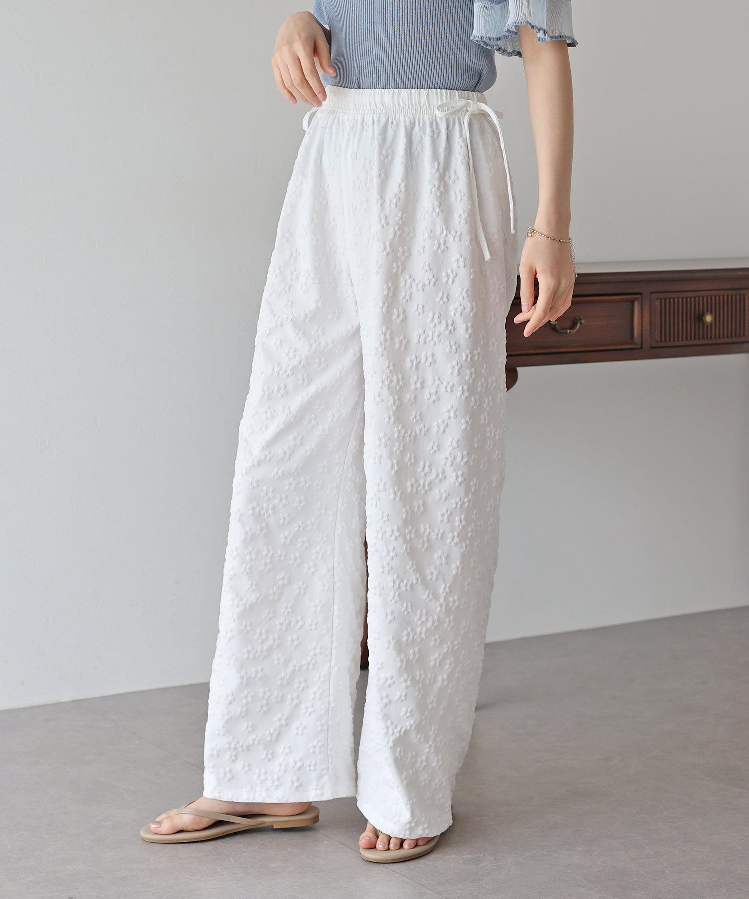 凹凸感のあるフラワー柄がキュートなワイドパンツ